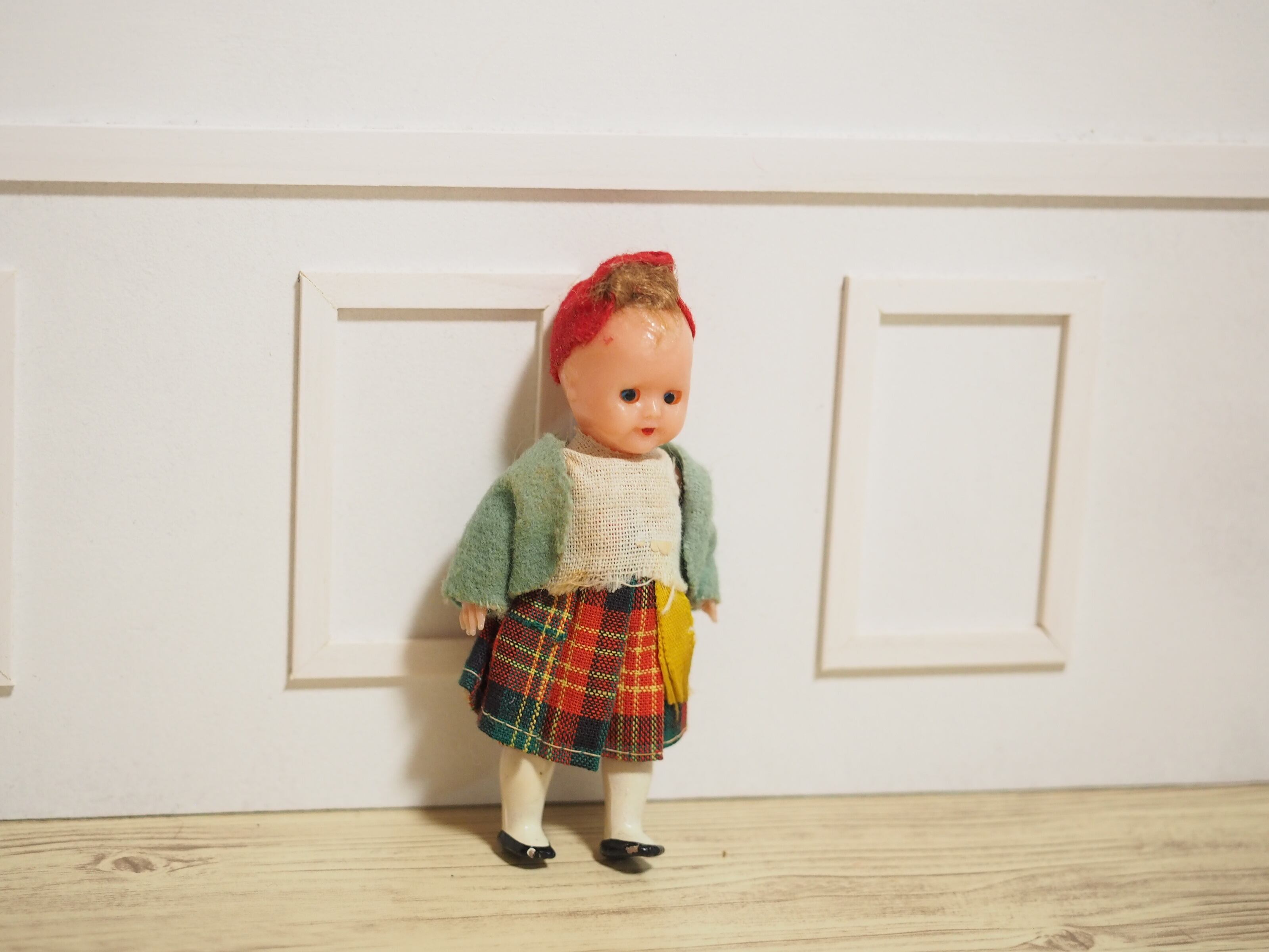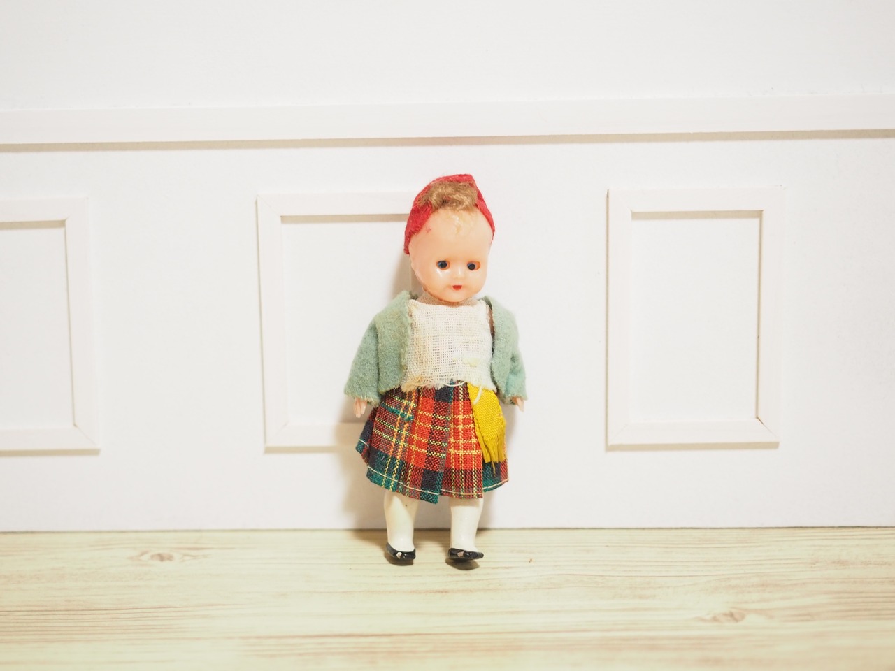 つぶらな瞳のスリープアイ、おしゃれなチェックスカートとジャケットのお人形