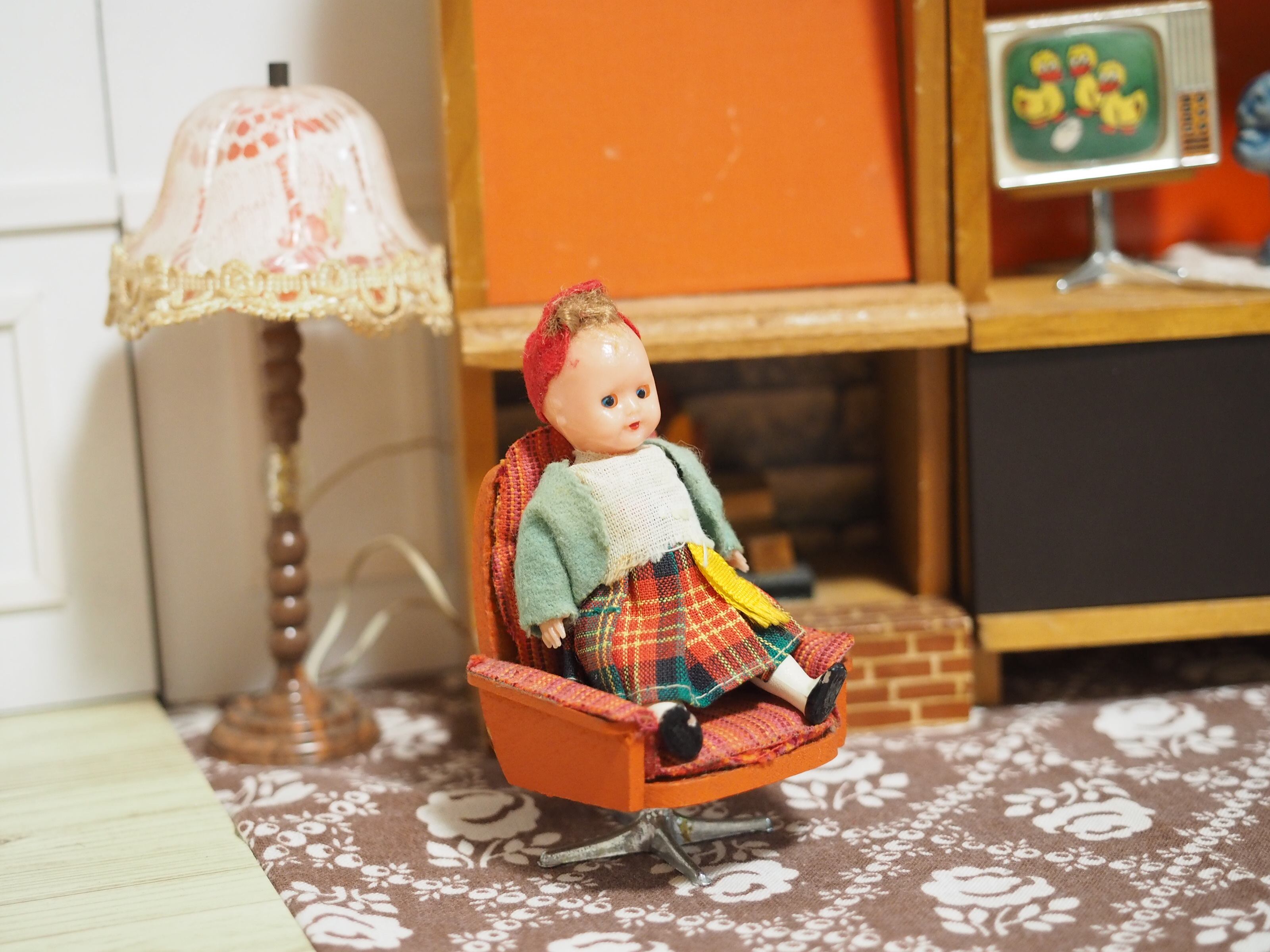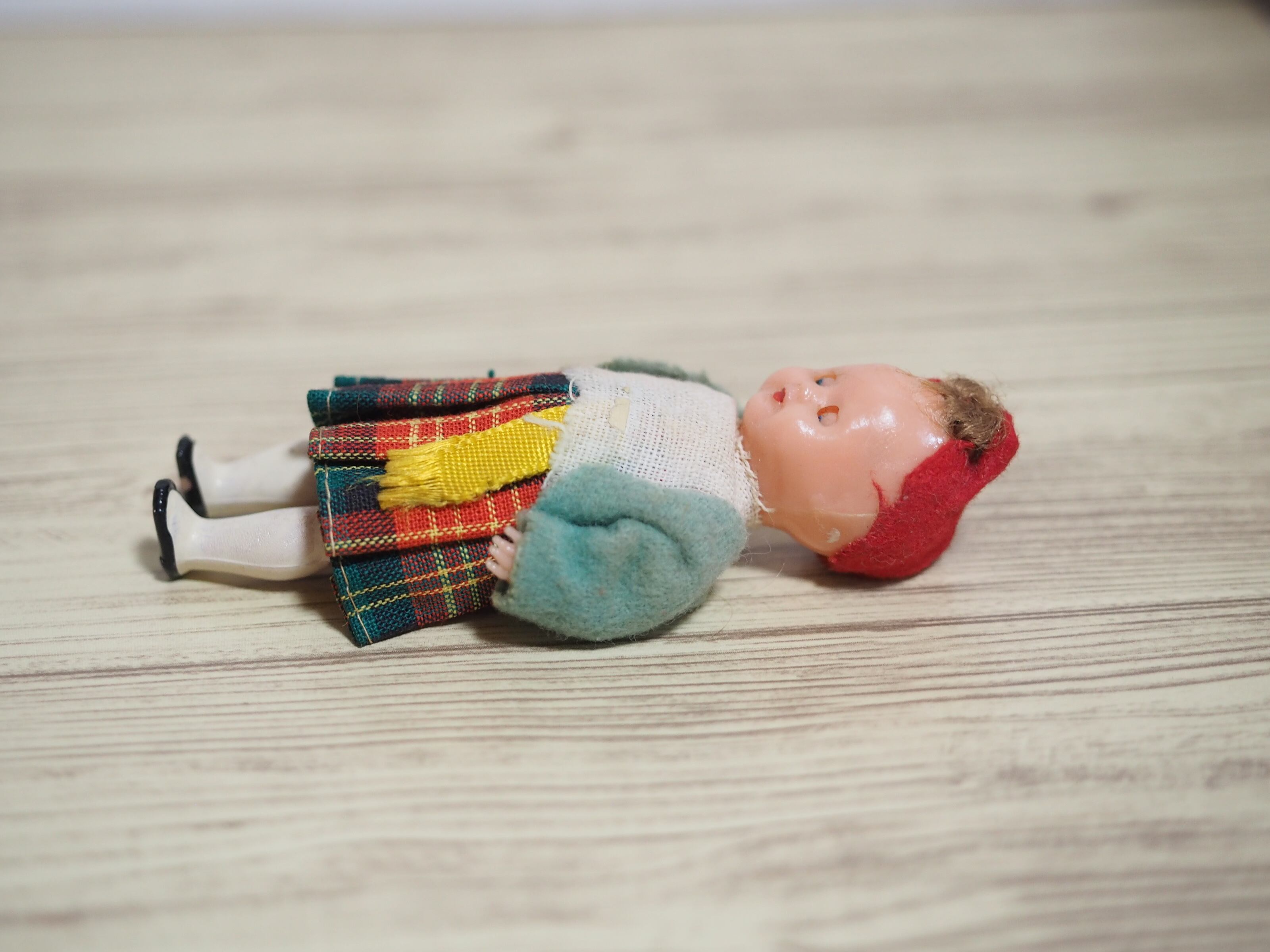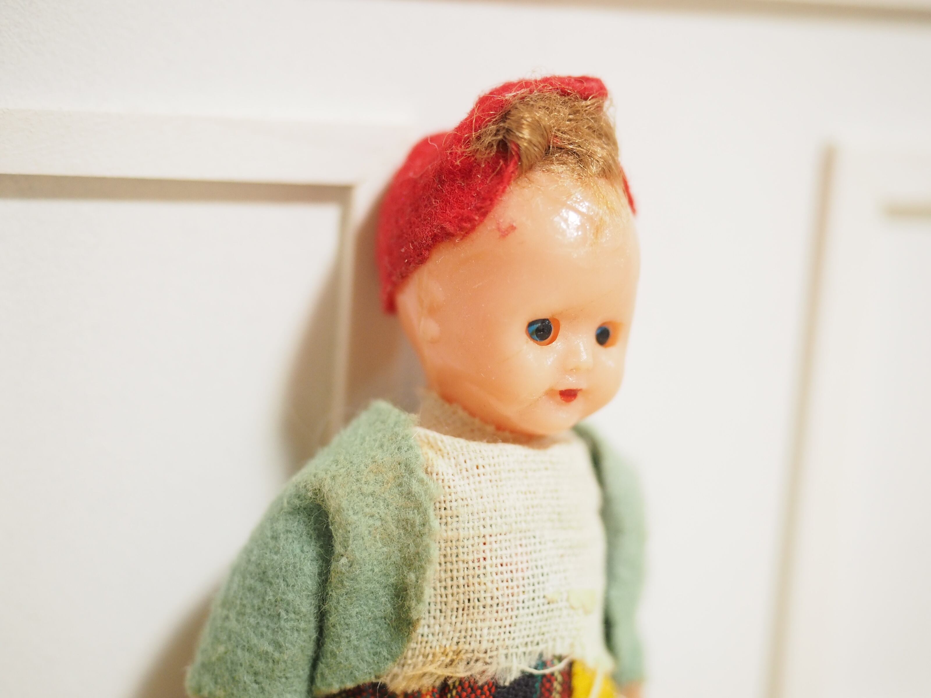 小さなお店で働いている小人のようなかわいらしさ、手に乗せて眺めたくなるお人形です。