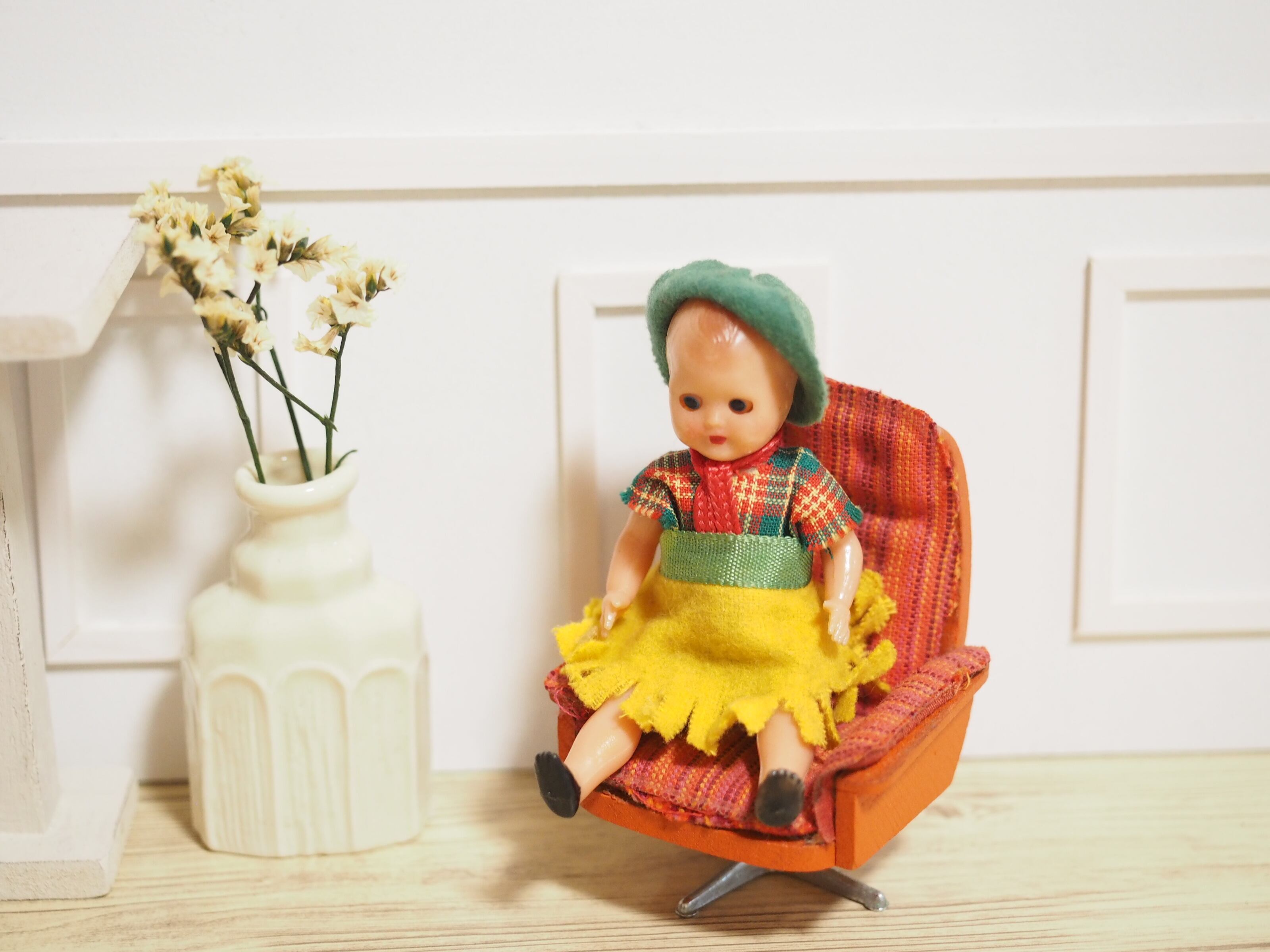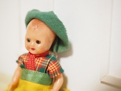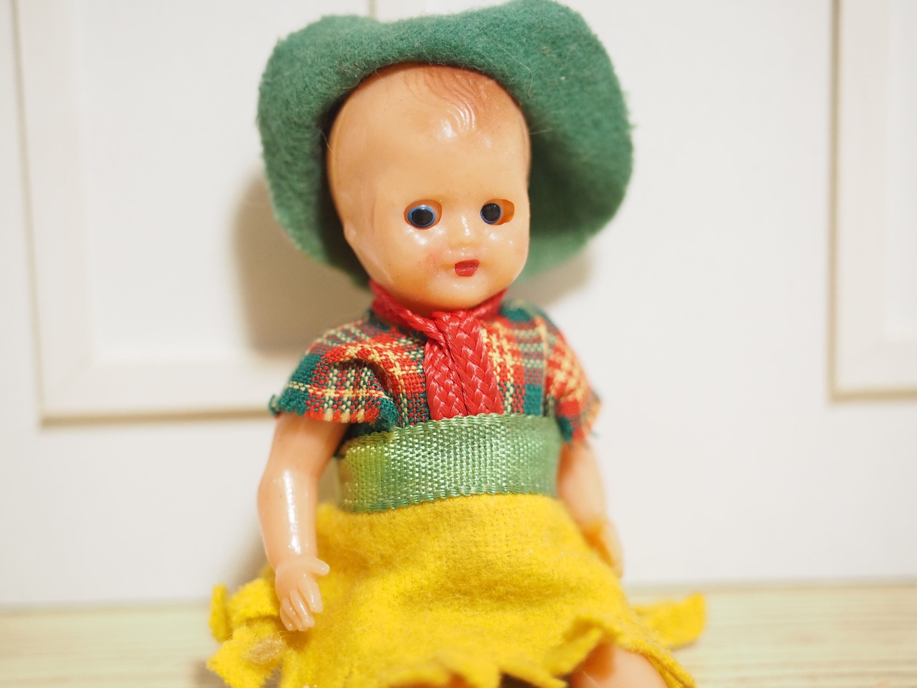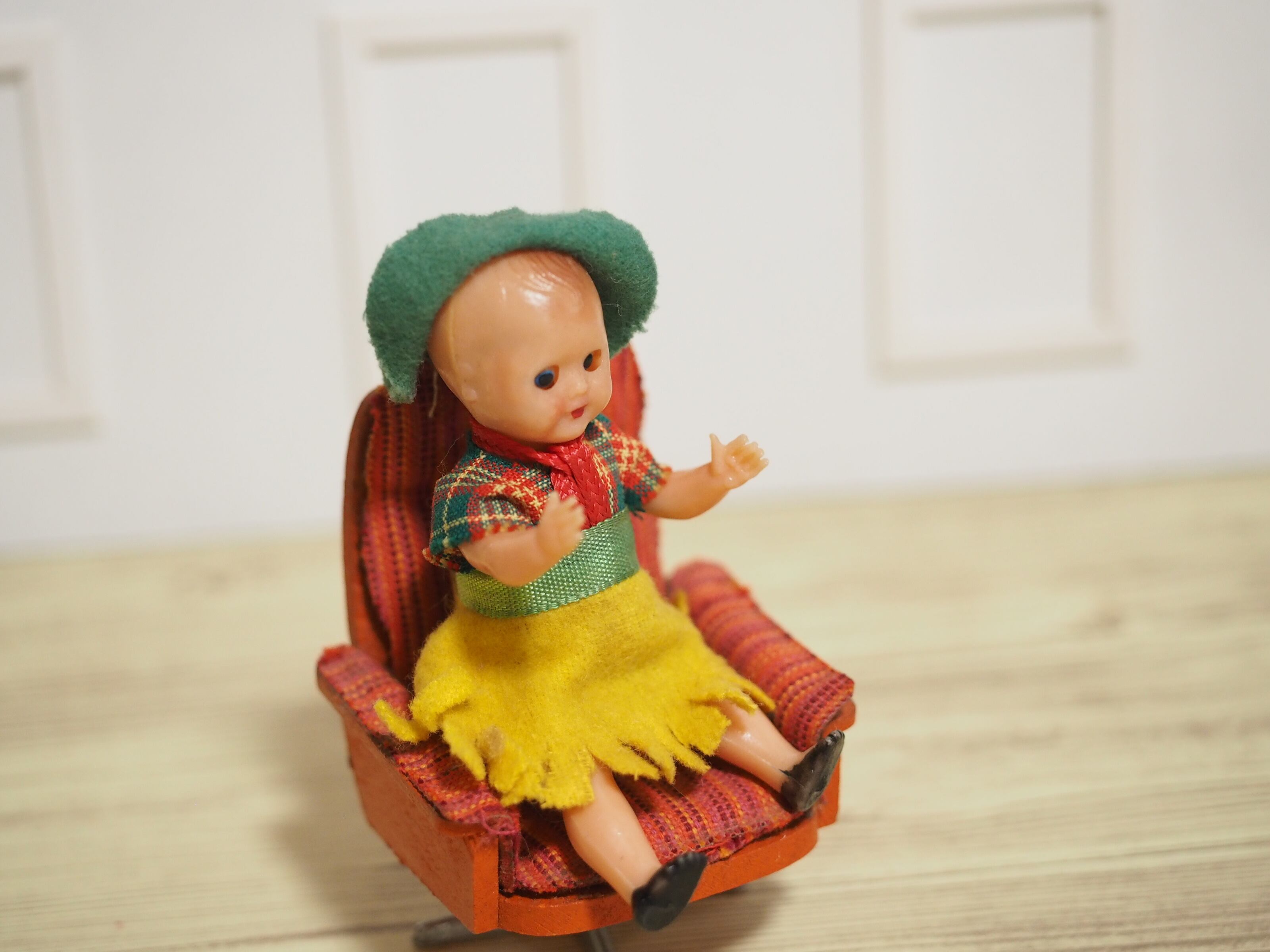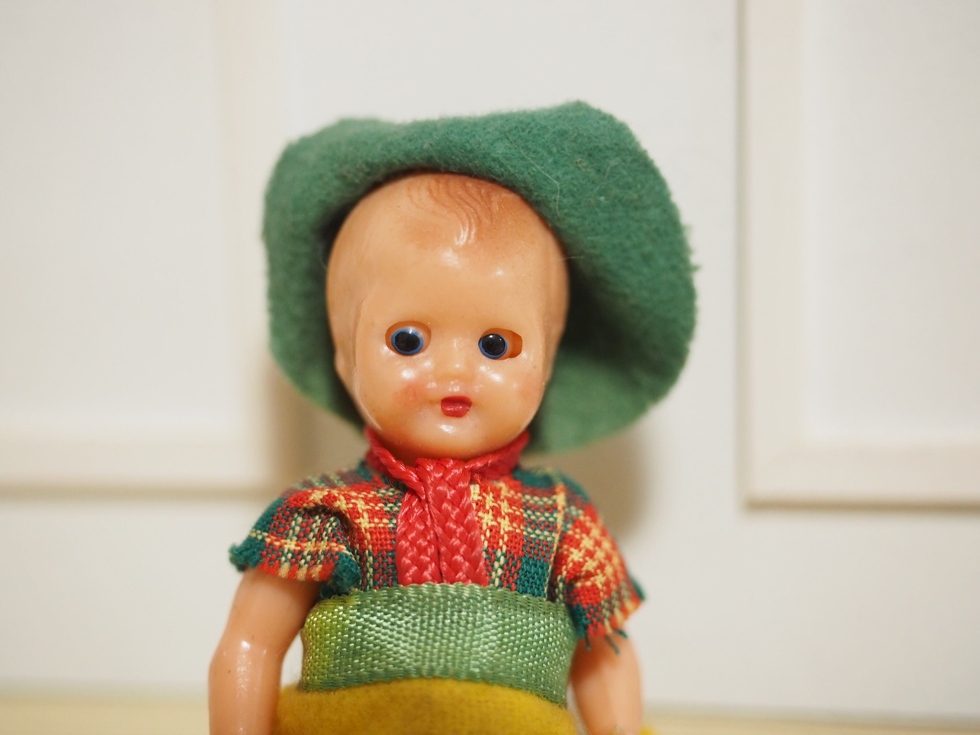 小さなお店で働いている小人のようなかわいらしさ、手に乗せて眺めたくなるお人形です。