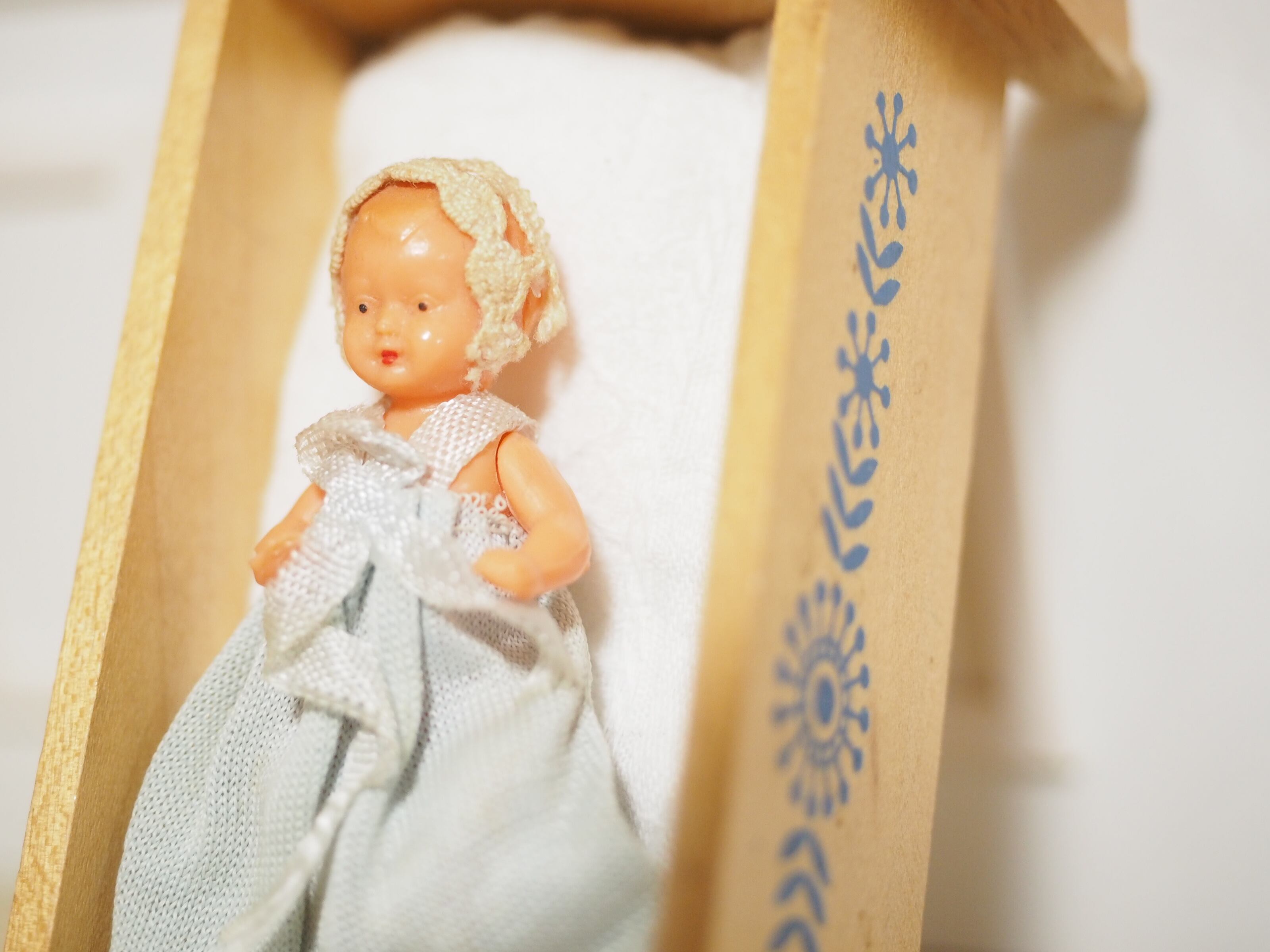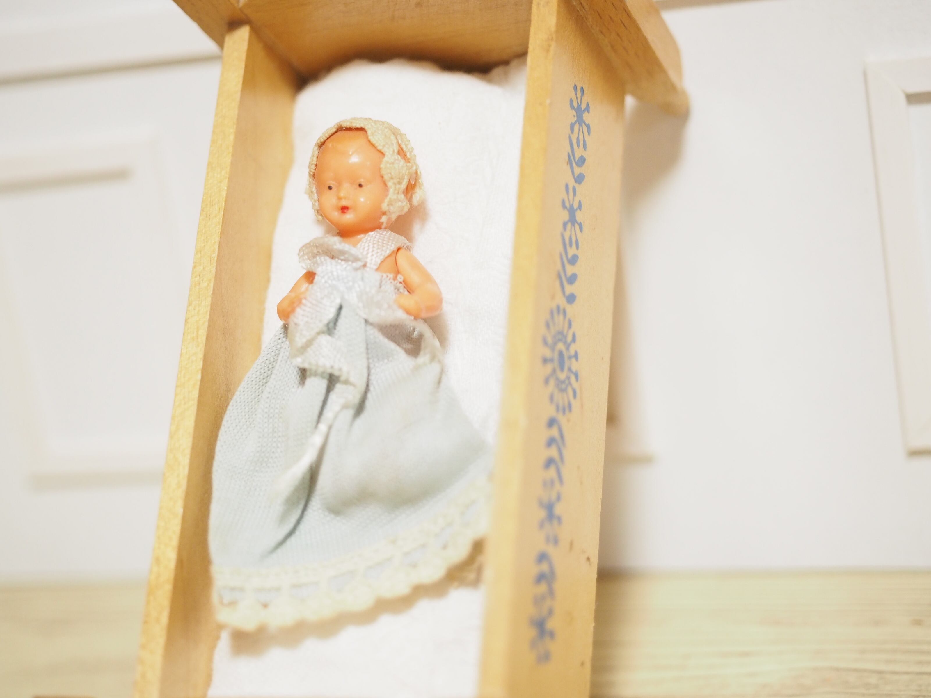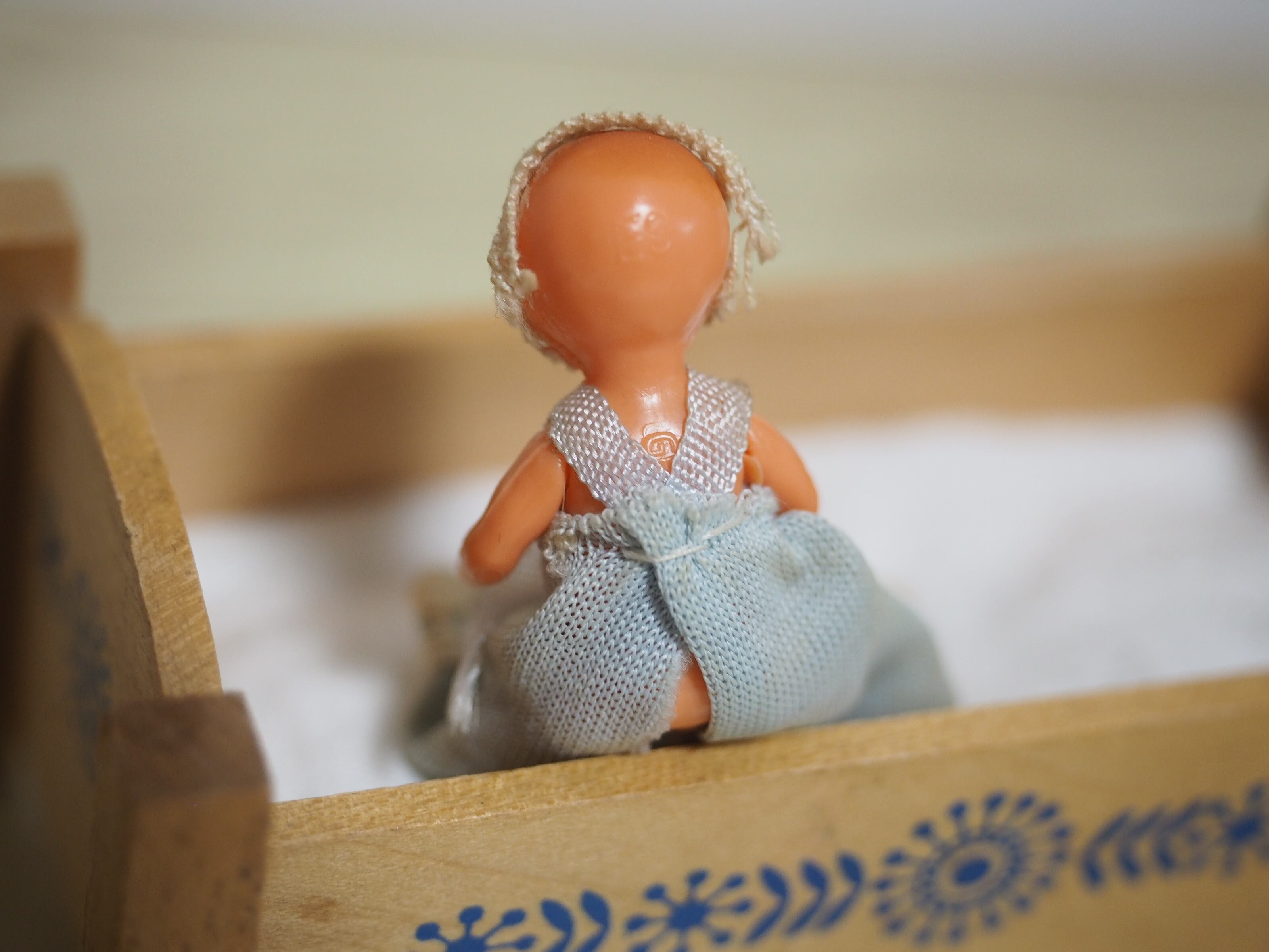 体長5.5㎝の小さなベビーと木製ベッドのセットです。