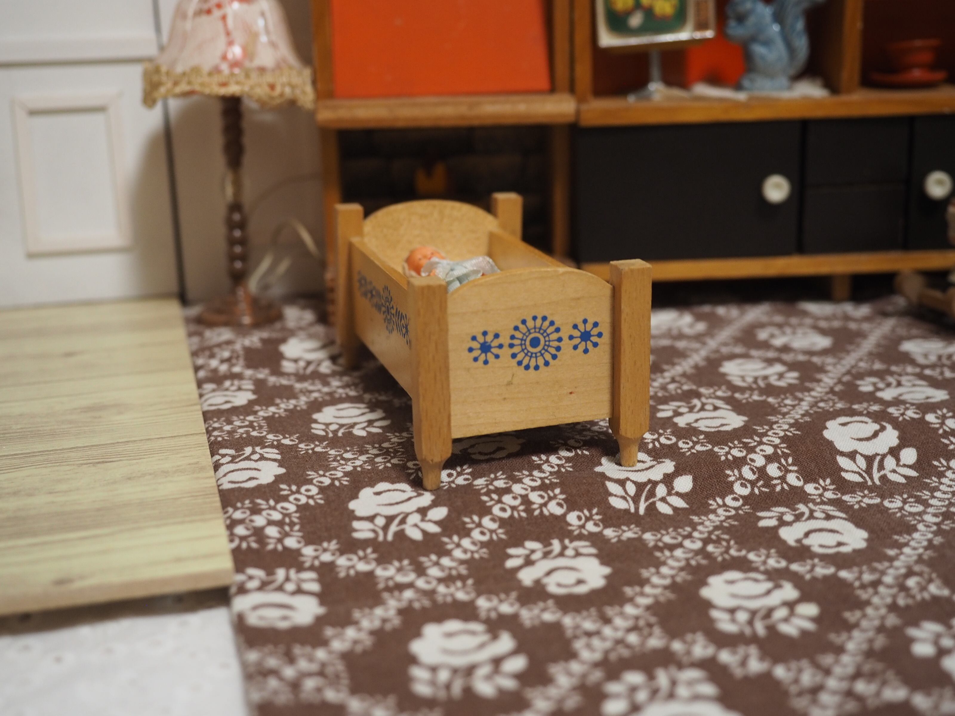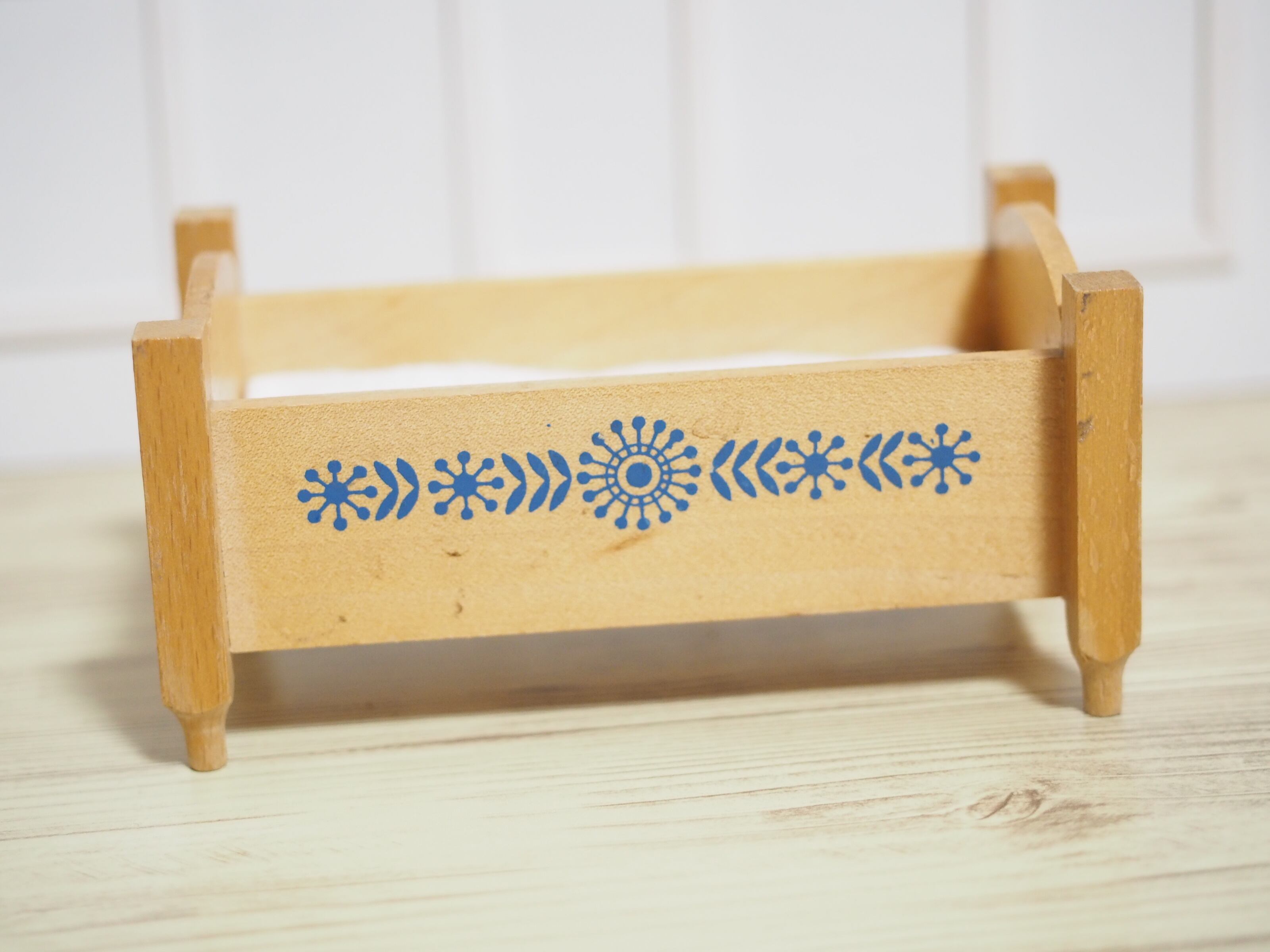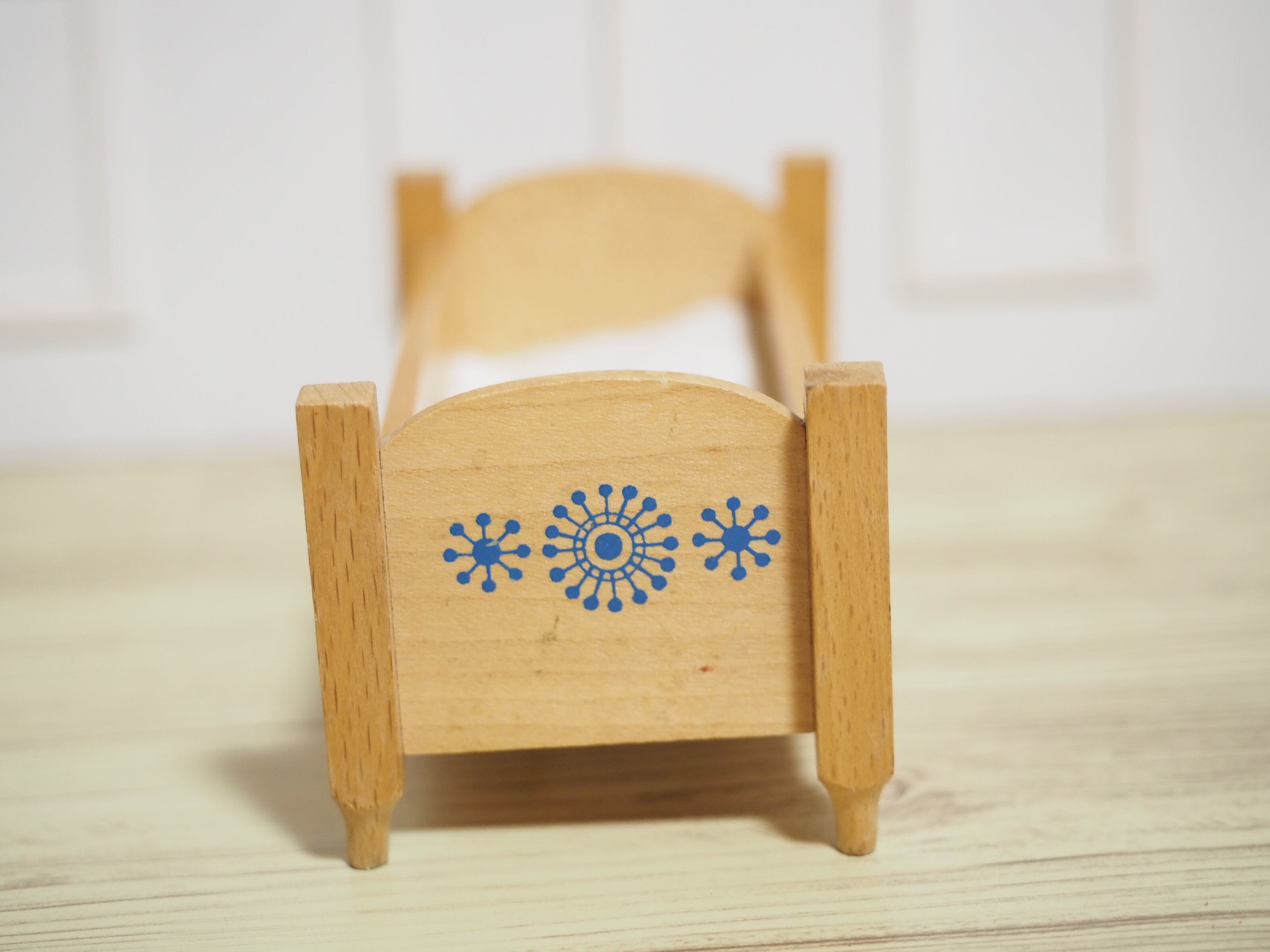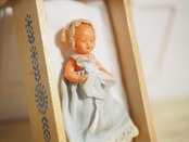 体長5.5㎝の小さなベビーと木製ベッドのセットです。