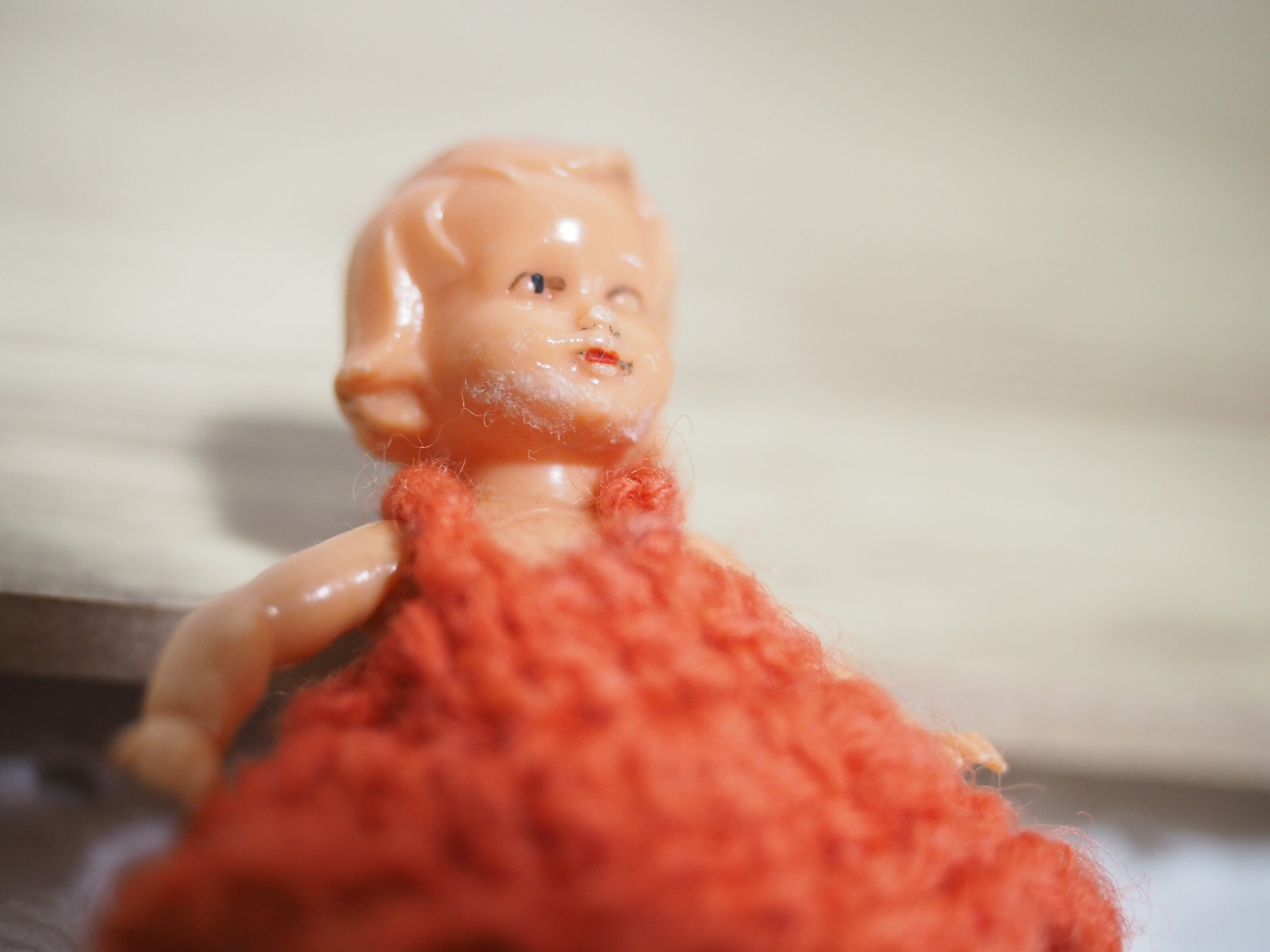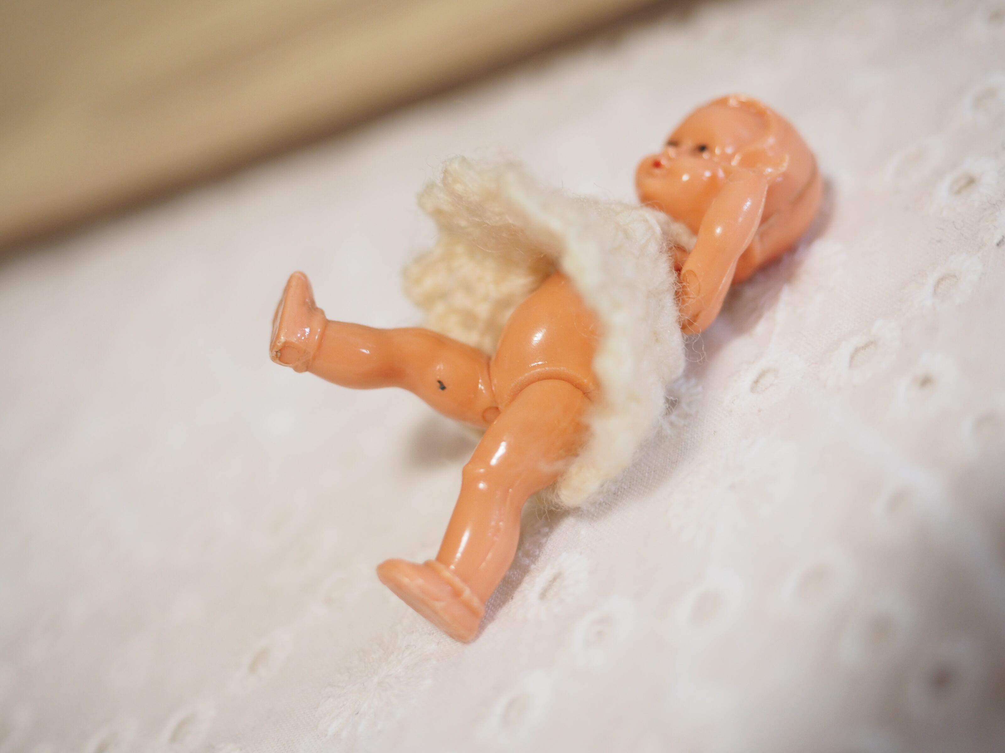 小さな体ですが腕脚はゴムジョイントで動きます。ゴム緩めですが万歳、お座り出来ます。