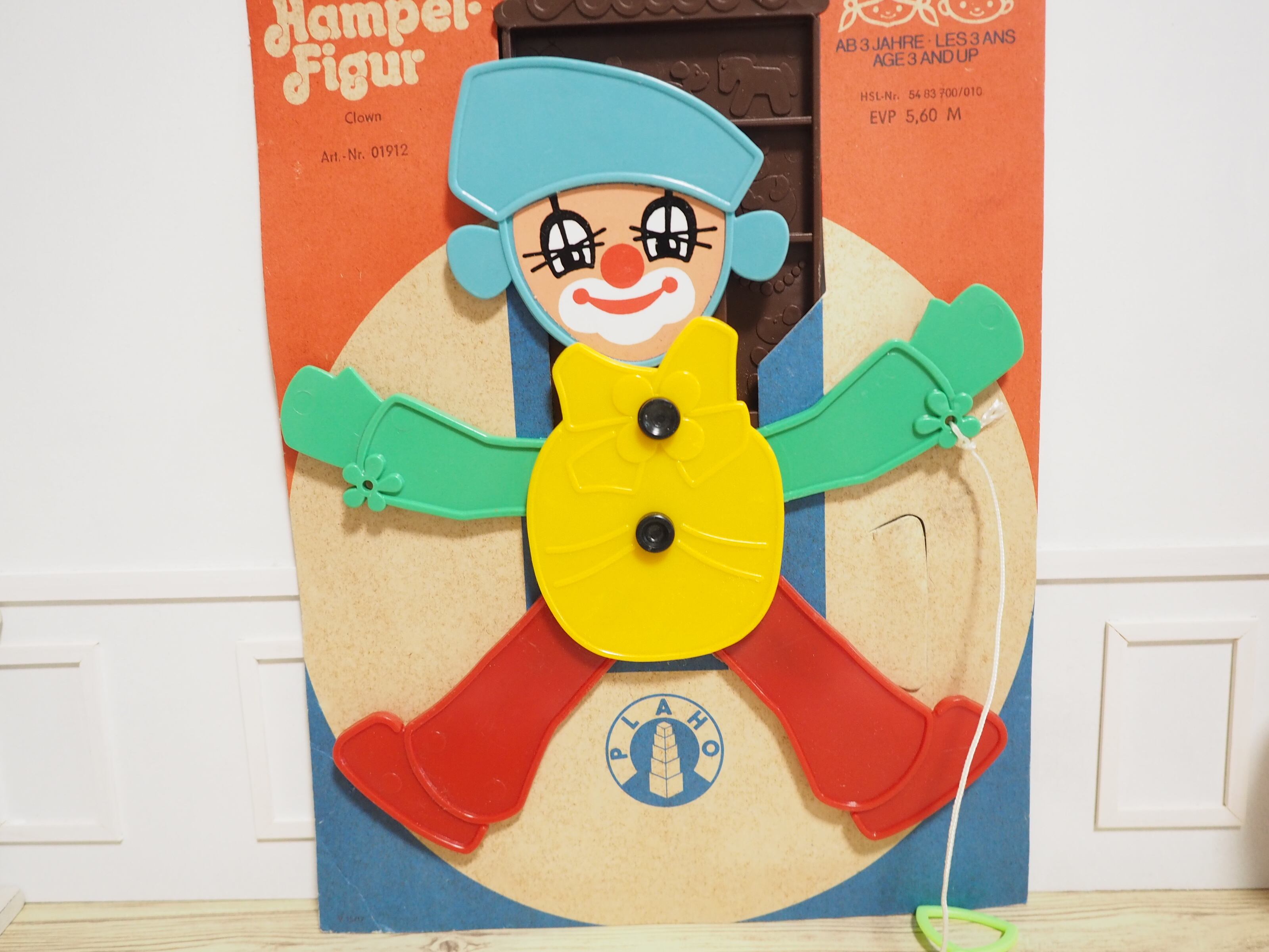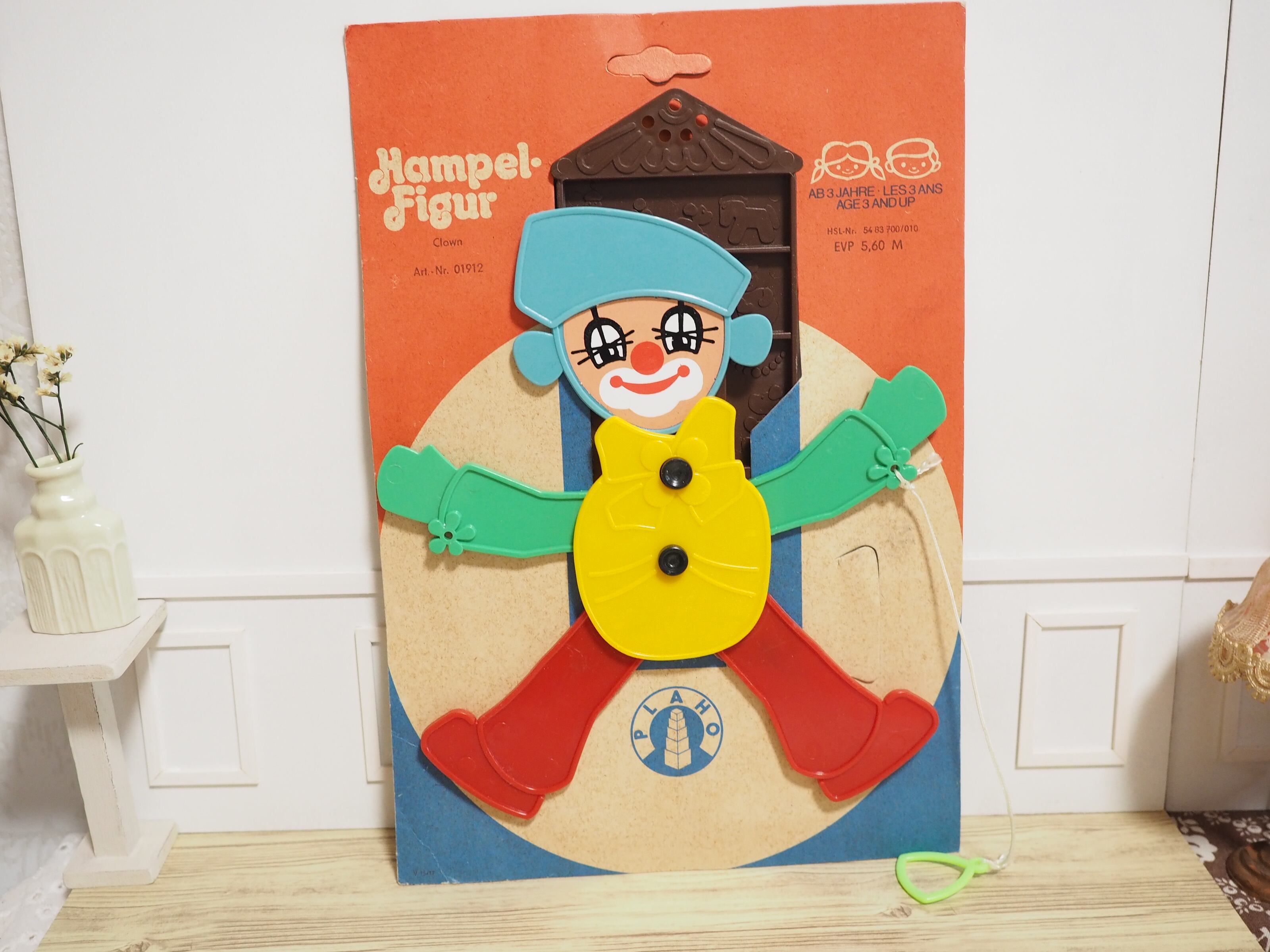 紐を引っ張ると手と足を動かせるおもちゃ Hampel Figur Clown Plaho DDR Spielzeug