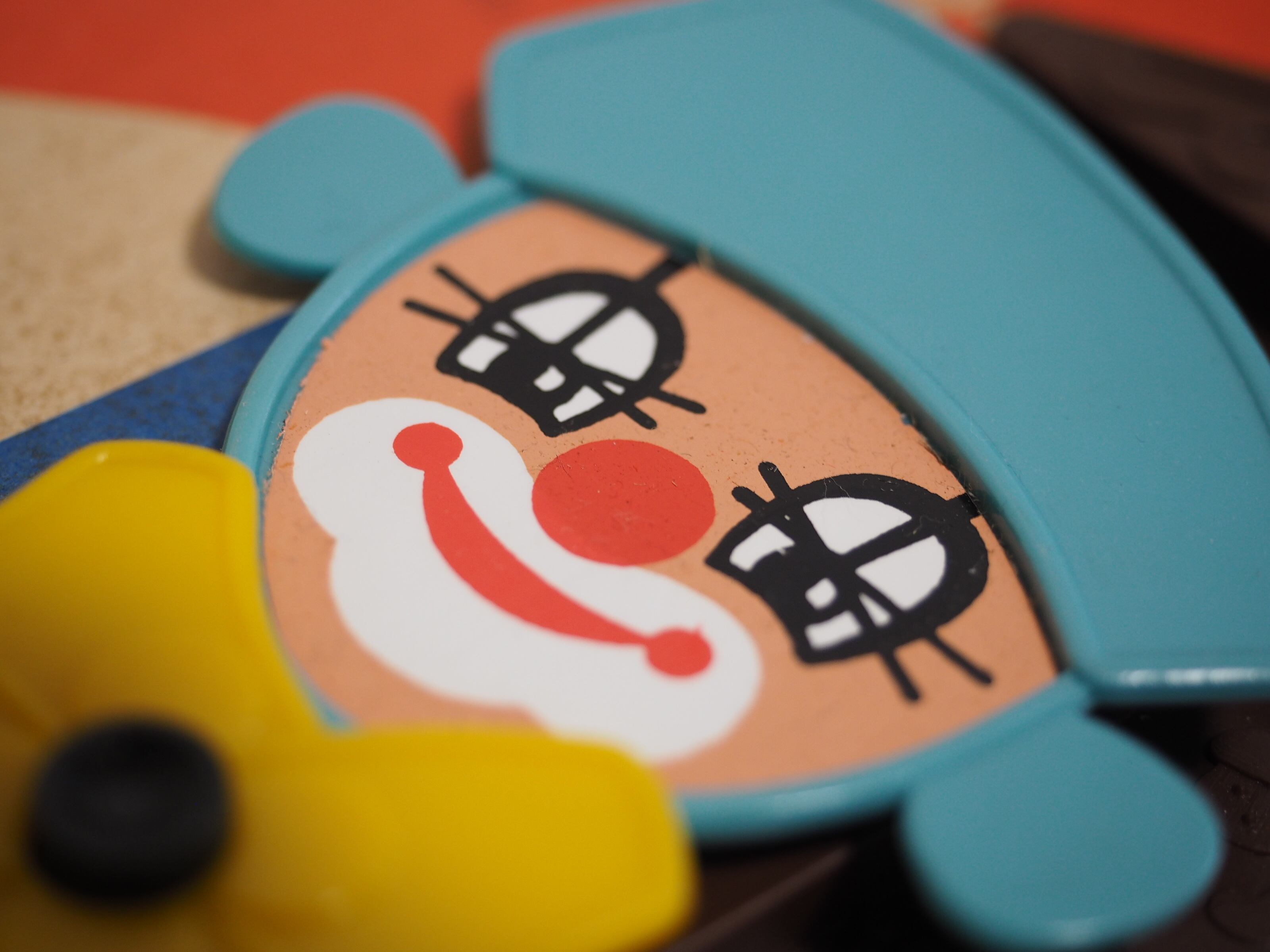 またピエロの顔部分は薄く接着剤が付着したようなざらつき、繊維付着あり。