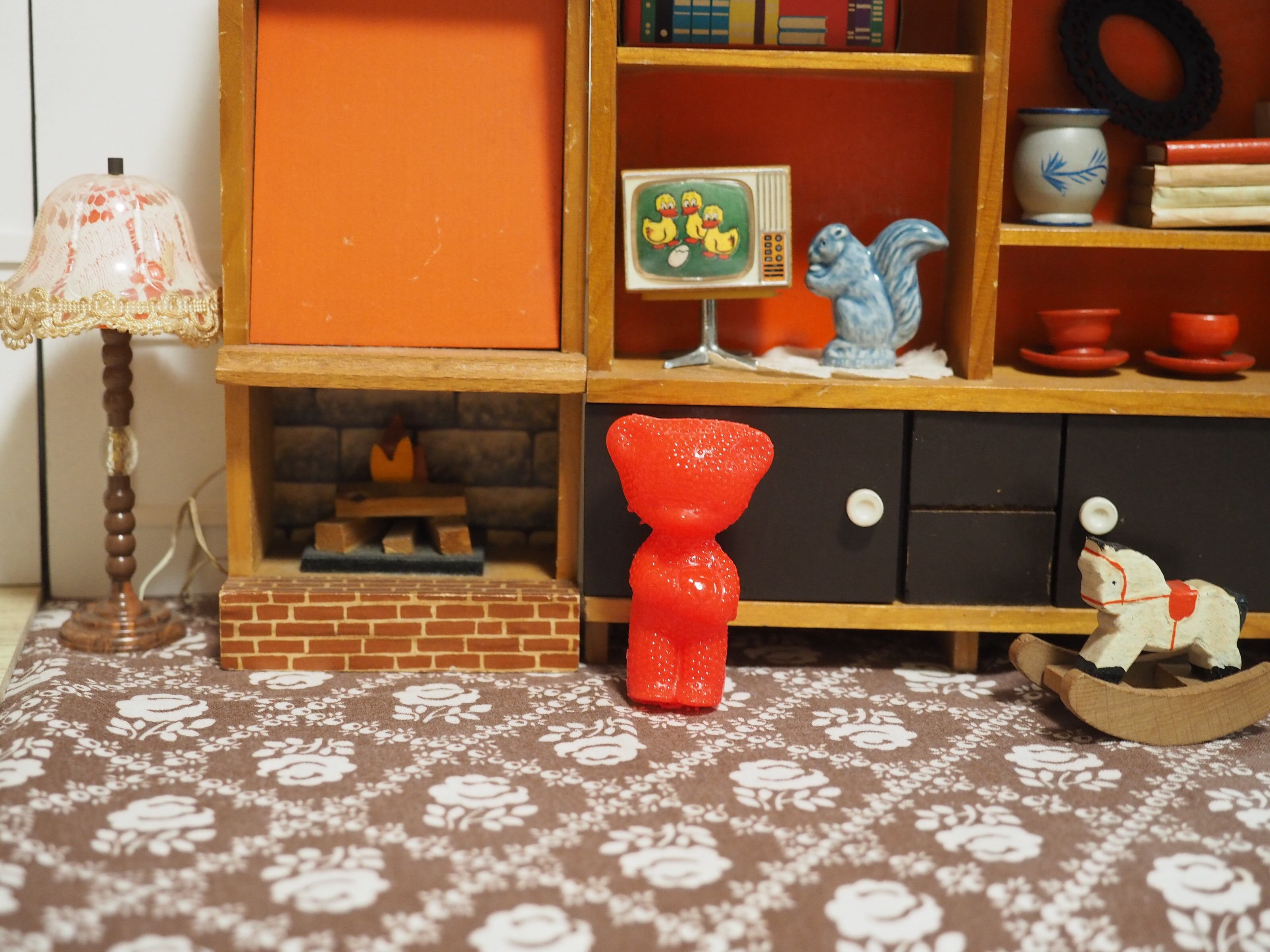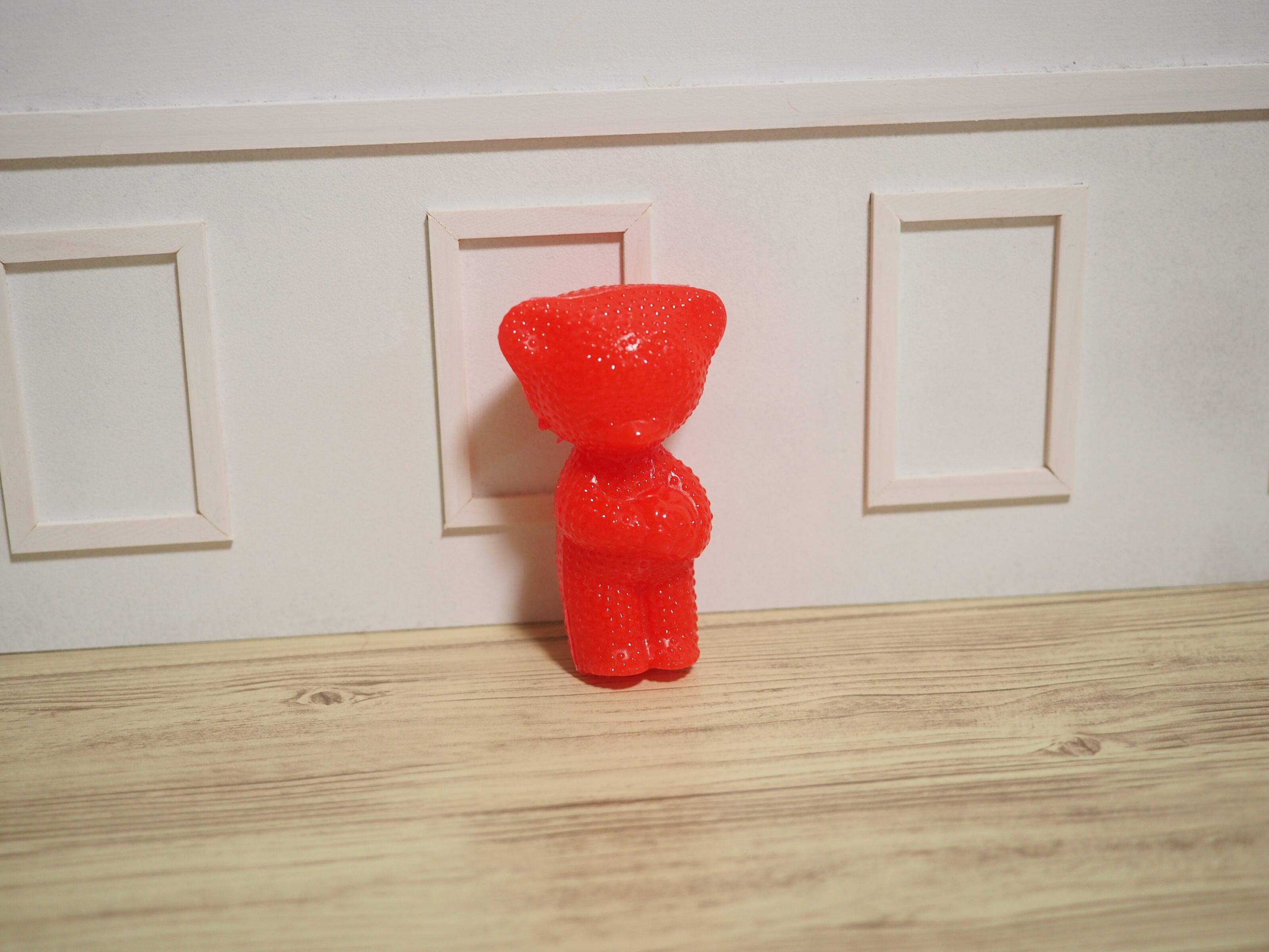キッチュな赤色とお顔の表情もかわいらしいプラスチック製テディベアです。