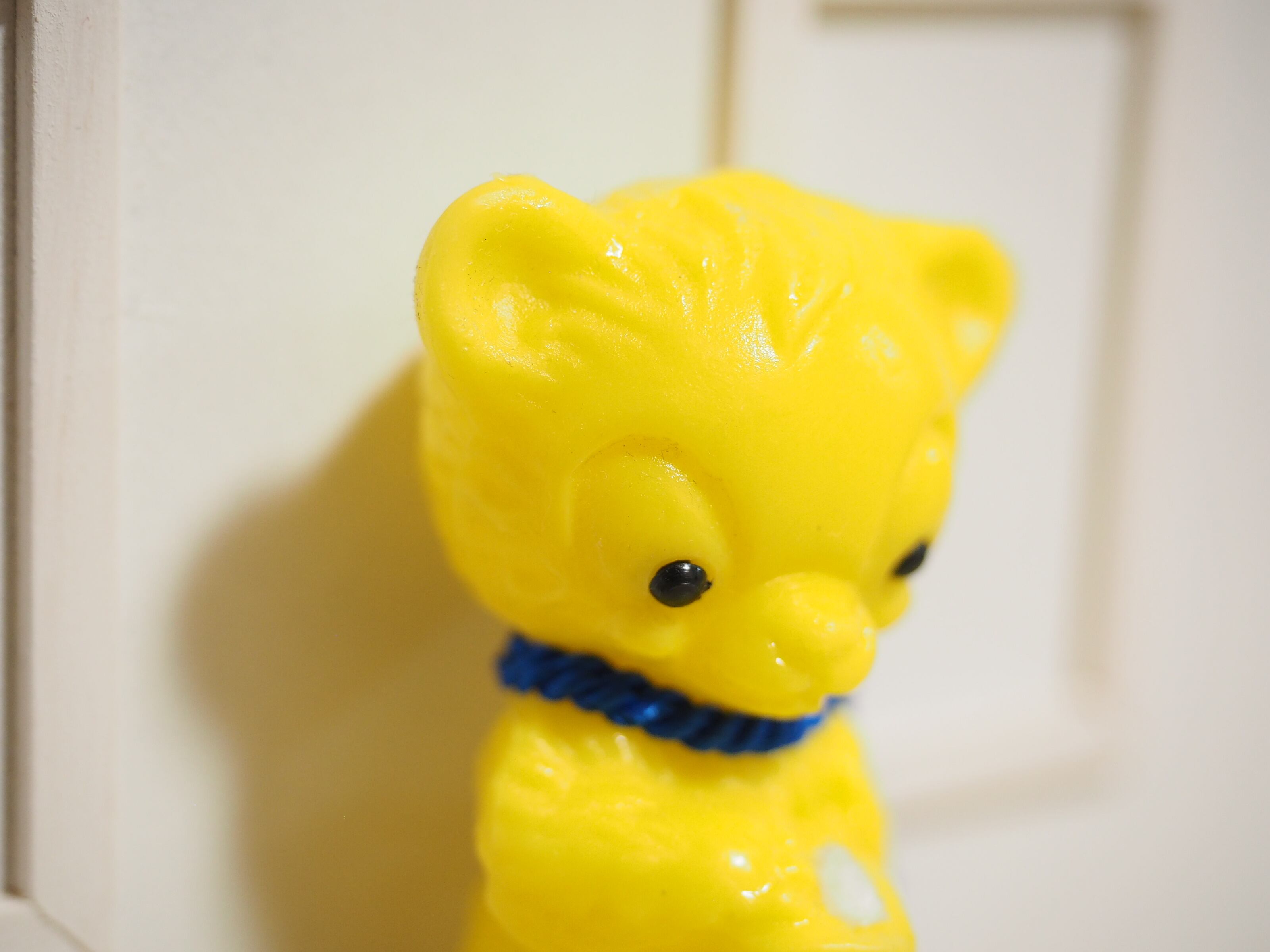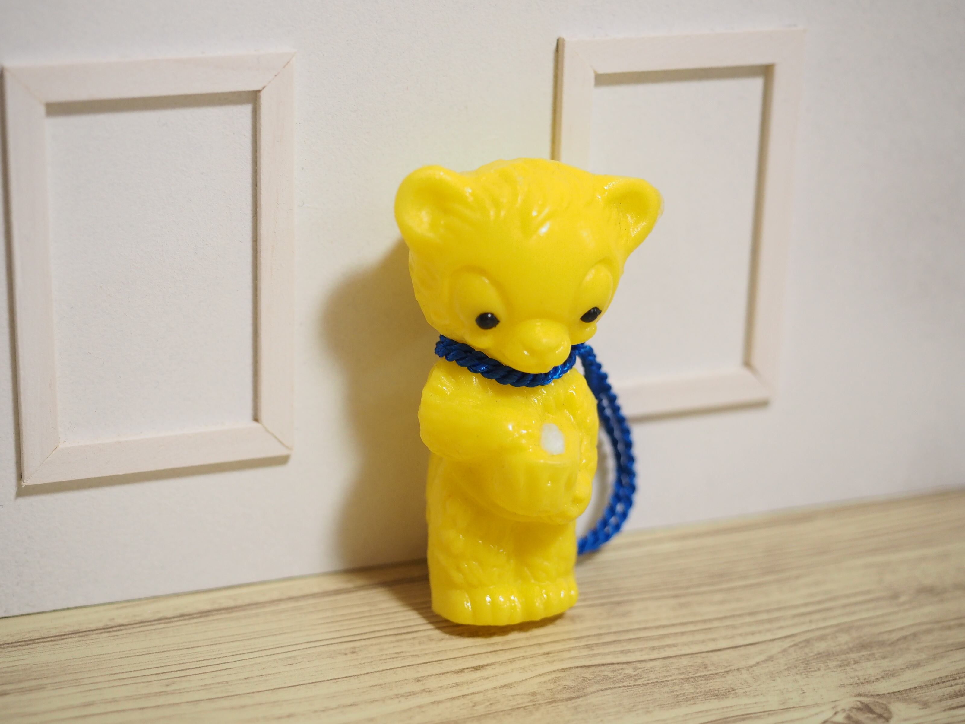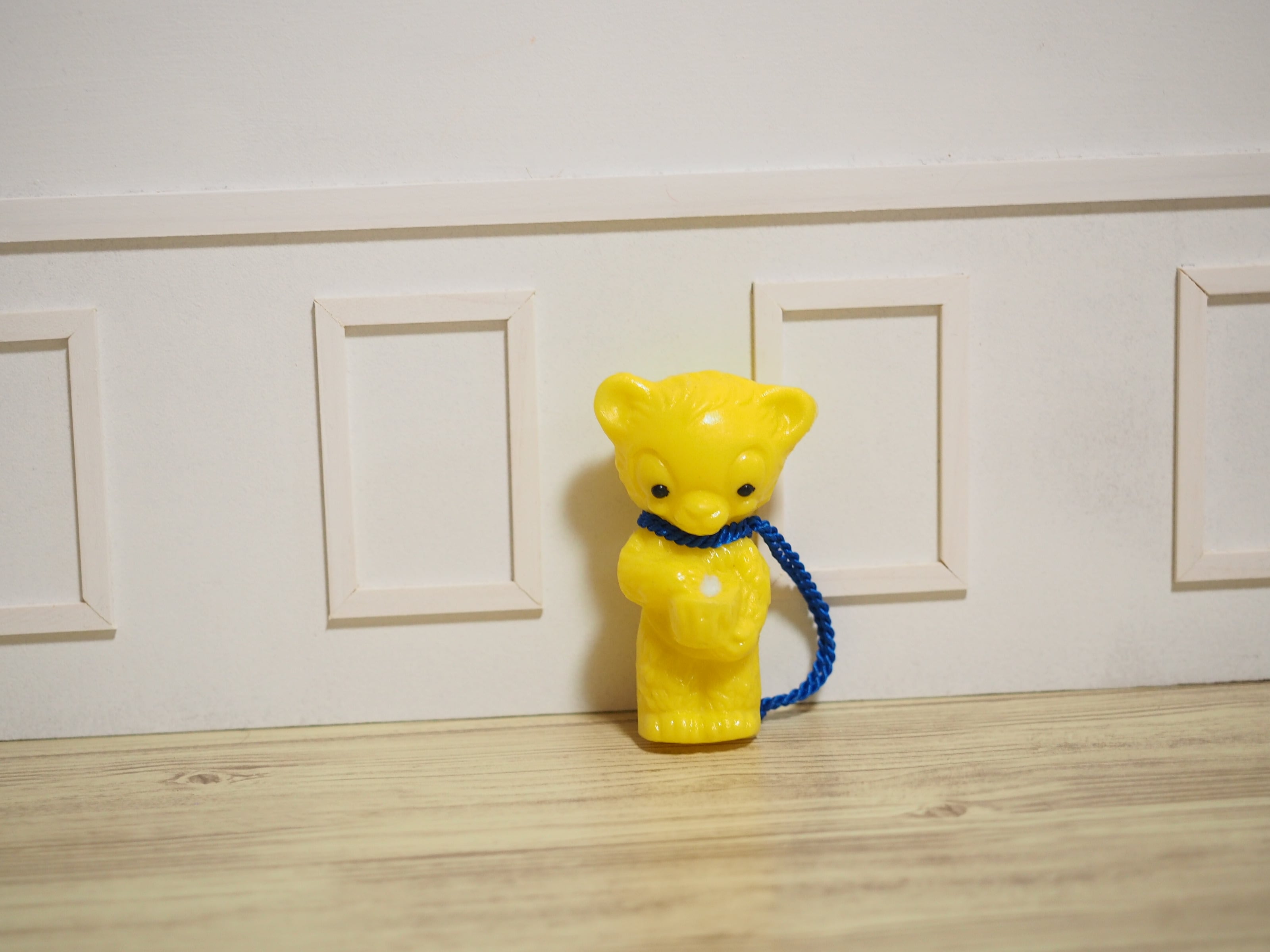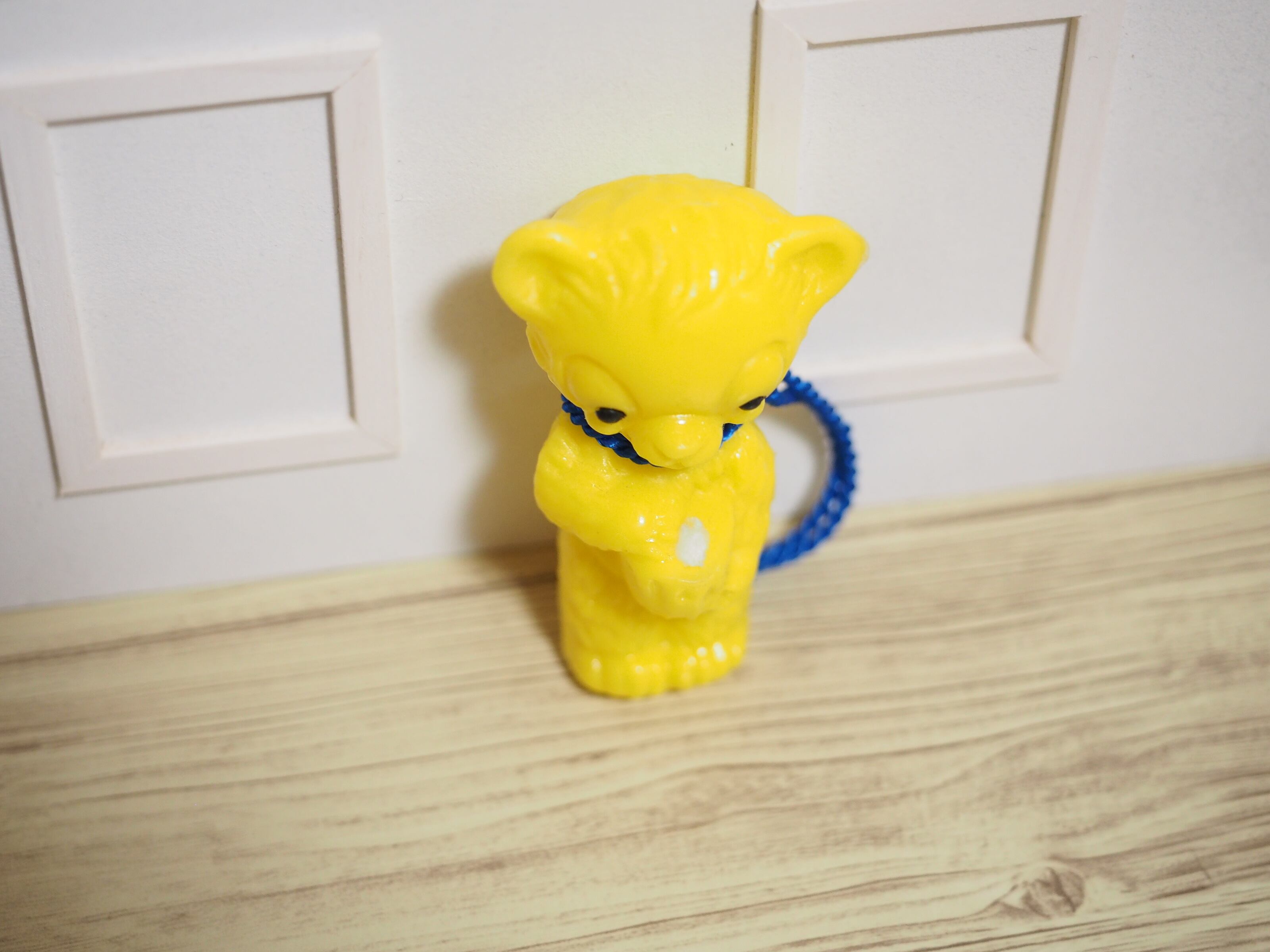 ビンテージな質感のプラスチック製、こちらは明るいイエローと立体感のある黒い瞳がかわいらしいテディベアです。