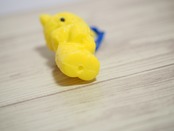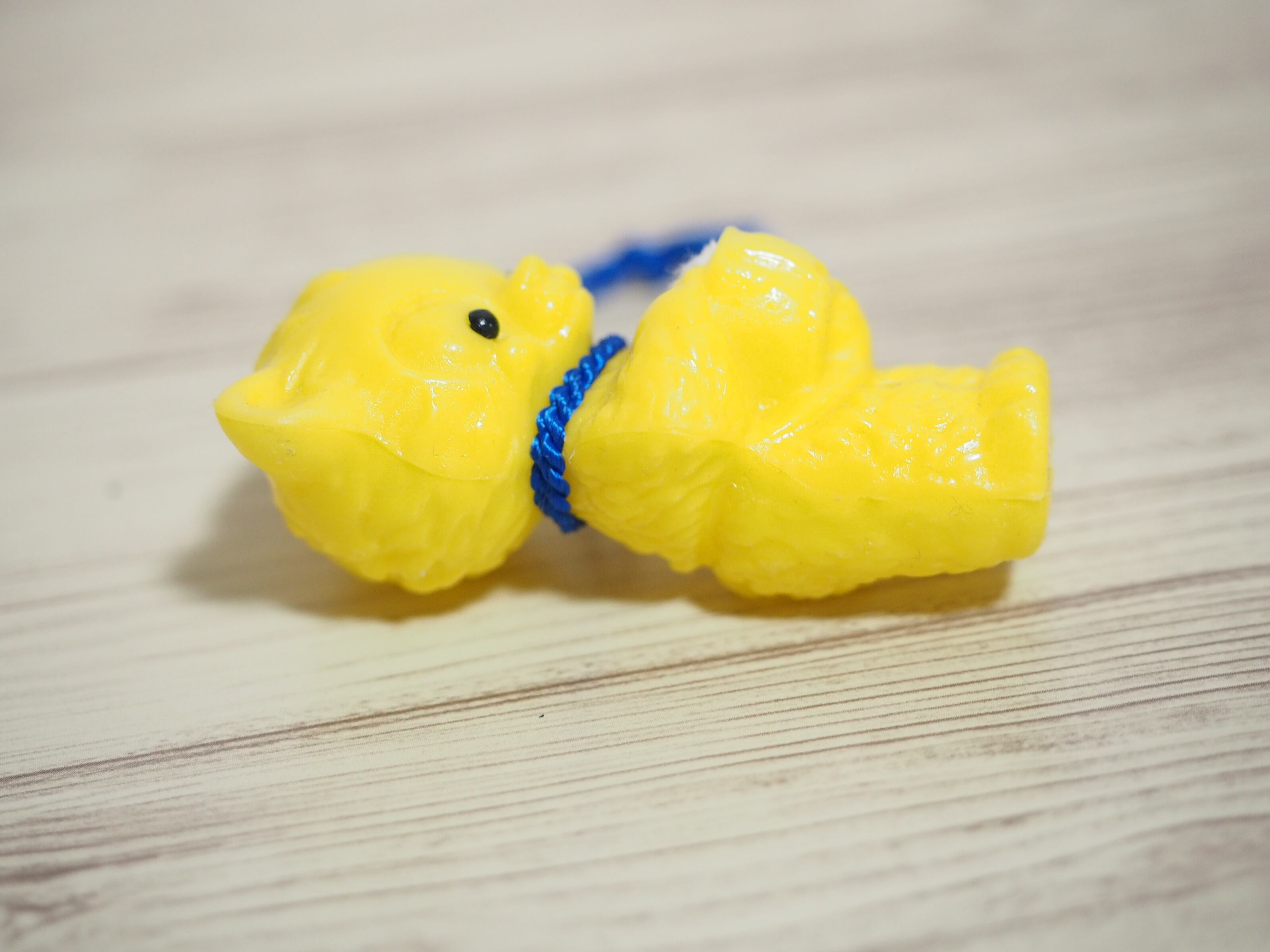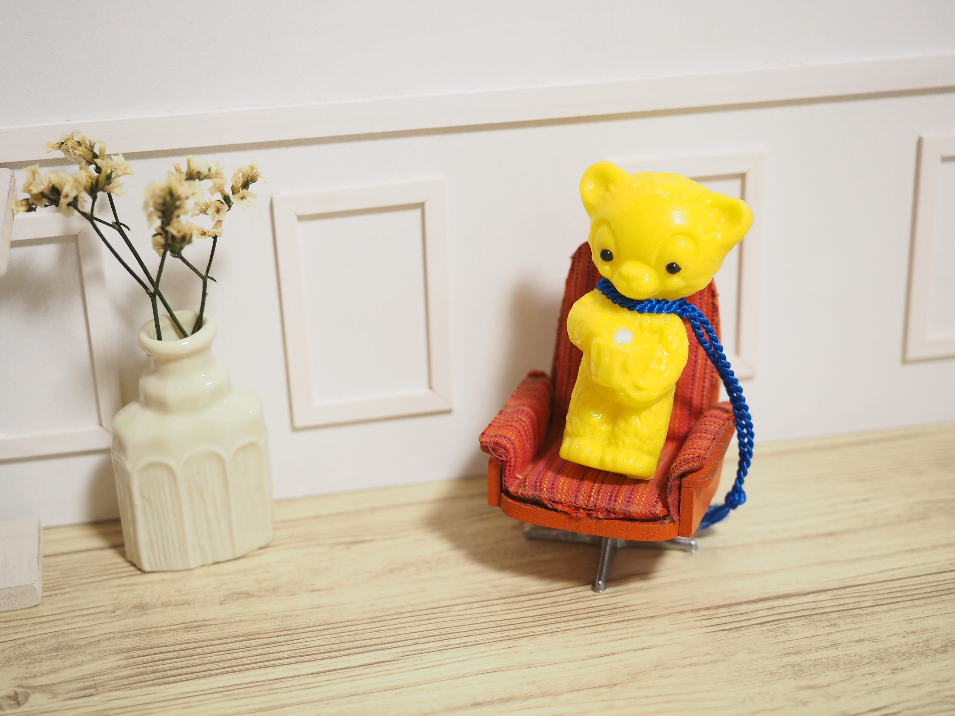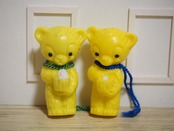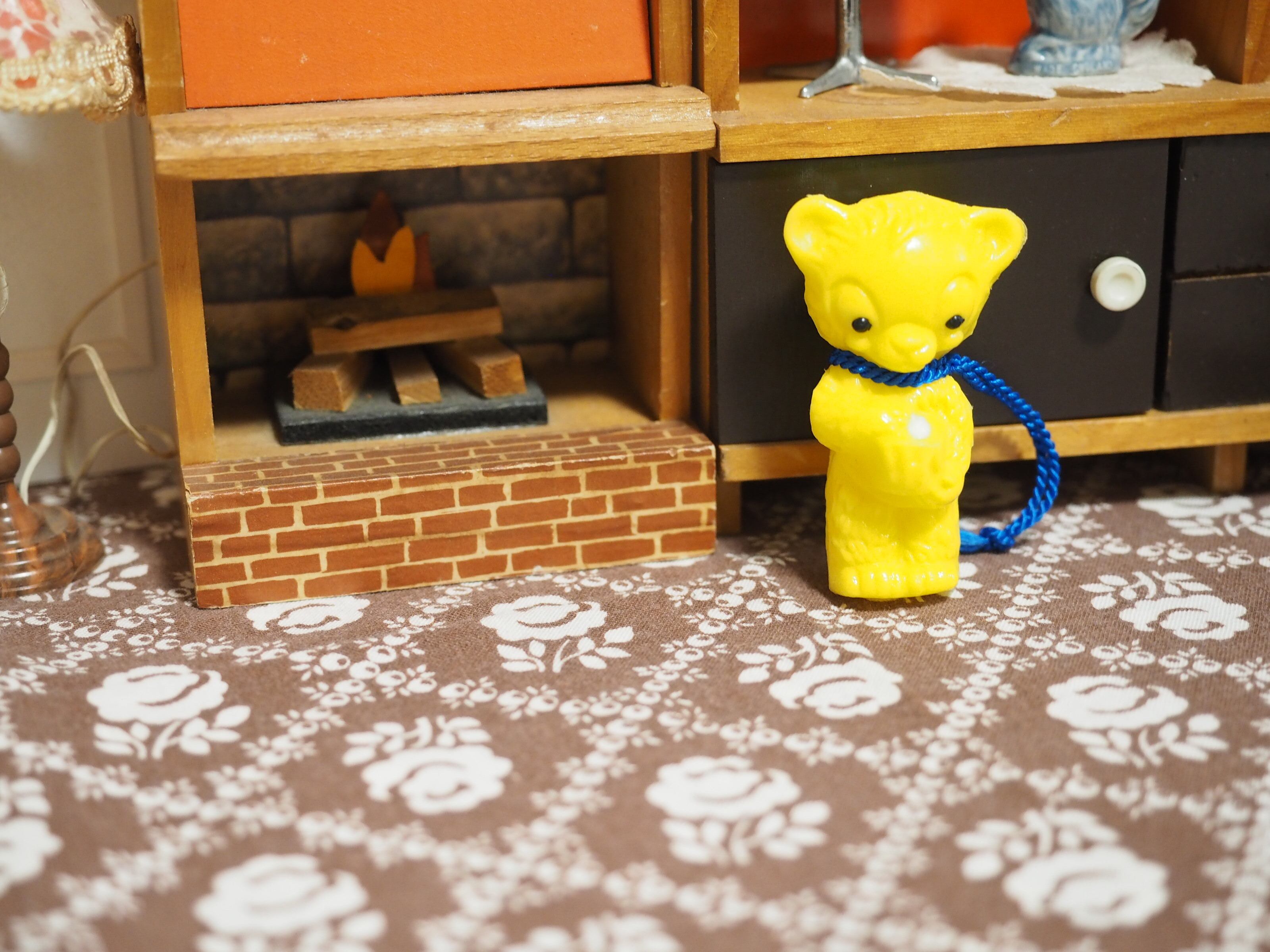 ビンテージな質感のプラスチック製、こちらは明るいイエローと立体感のある黒い瞳がかわいらしいテディベアです。