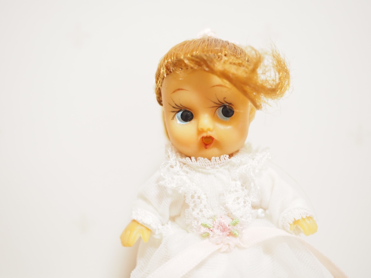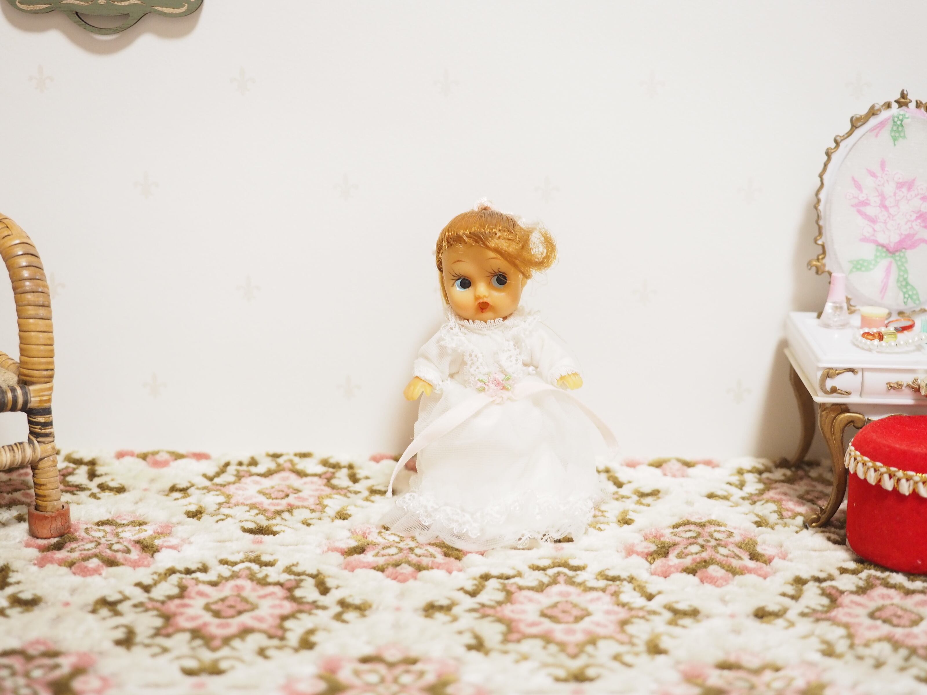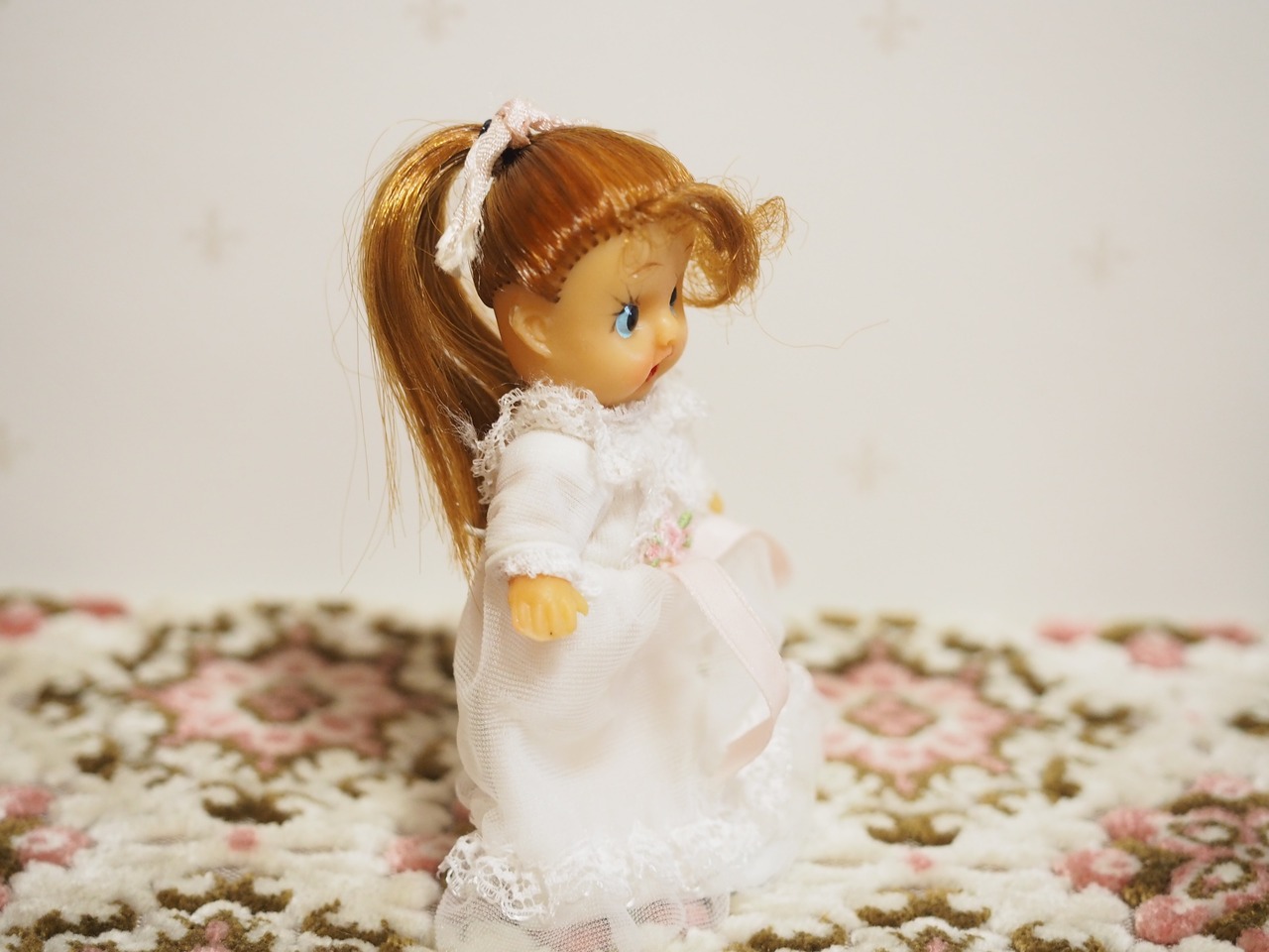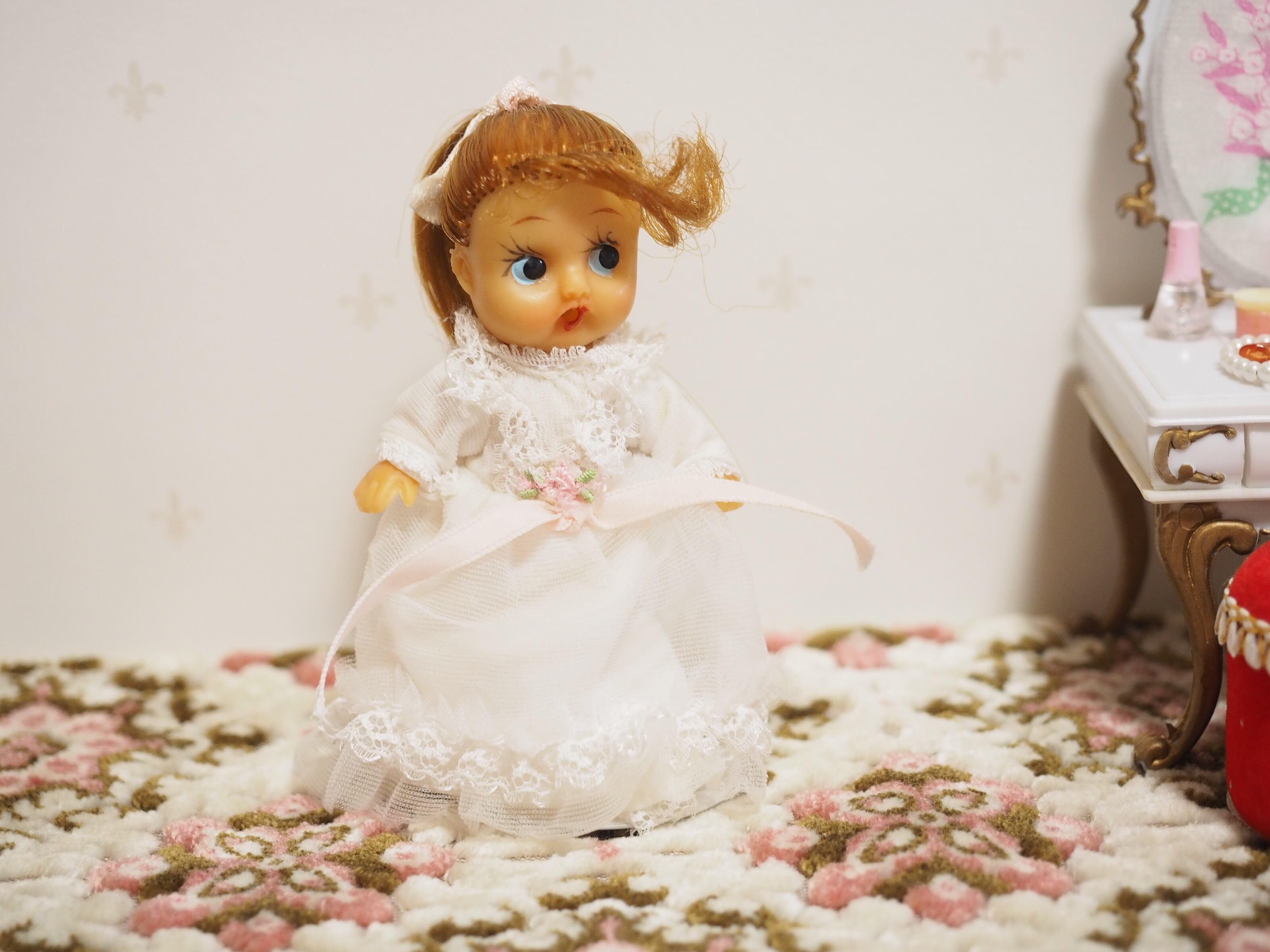 ちょっぴり丈長めの白いドレス付きです。うっすら経年変色がありますがふんわり仕立てとレース、ピンクのリボンとお花がかわいいです。