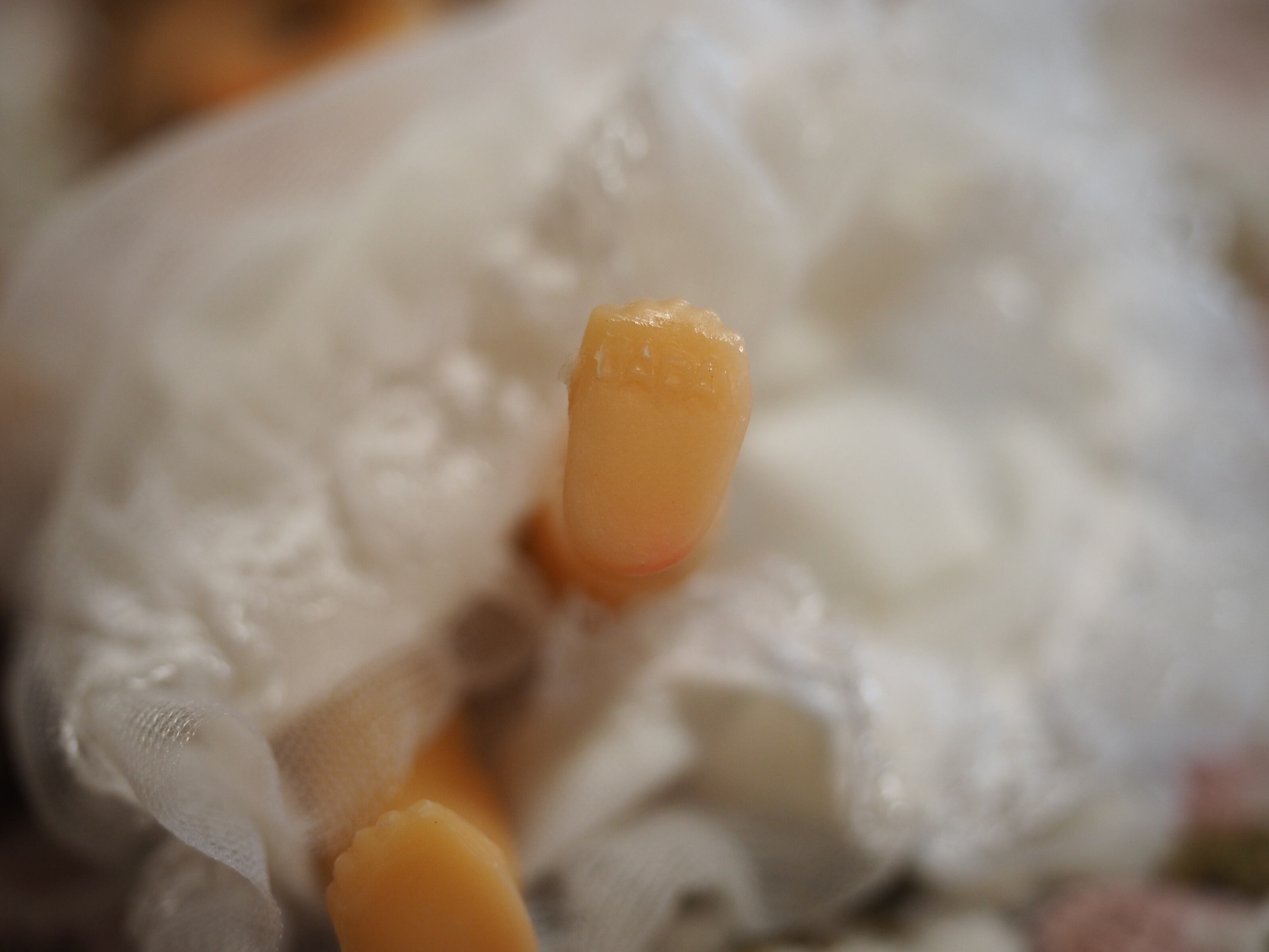 右足の甲と踵、足の爪に製造上の気泡のような穴へこみあり。また踵にピンクの色移りがございます。