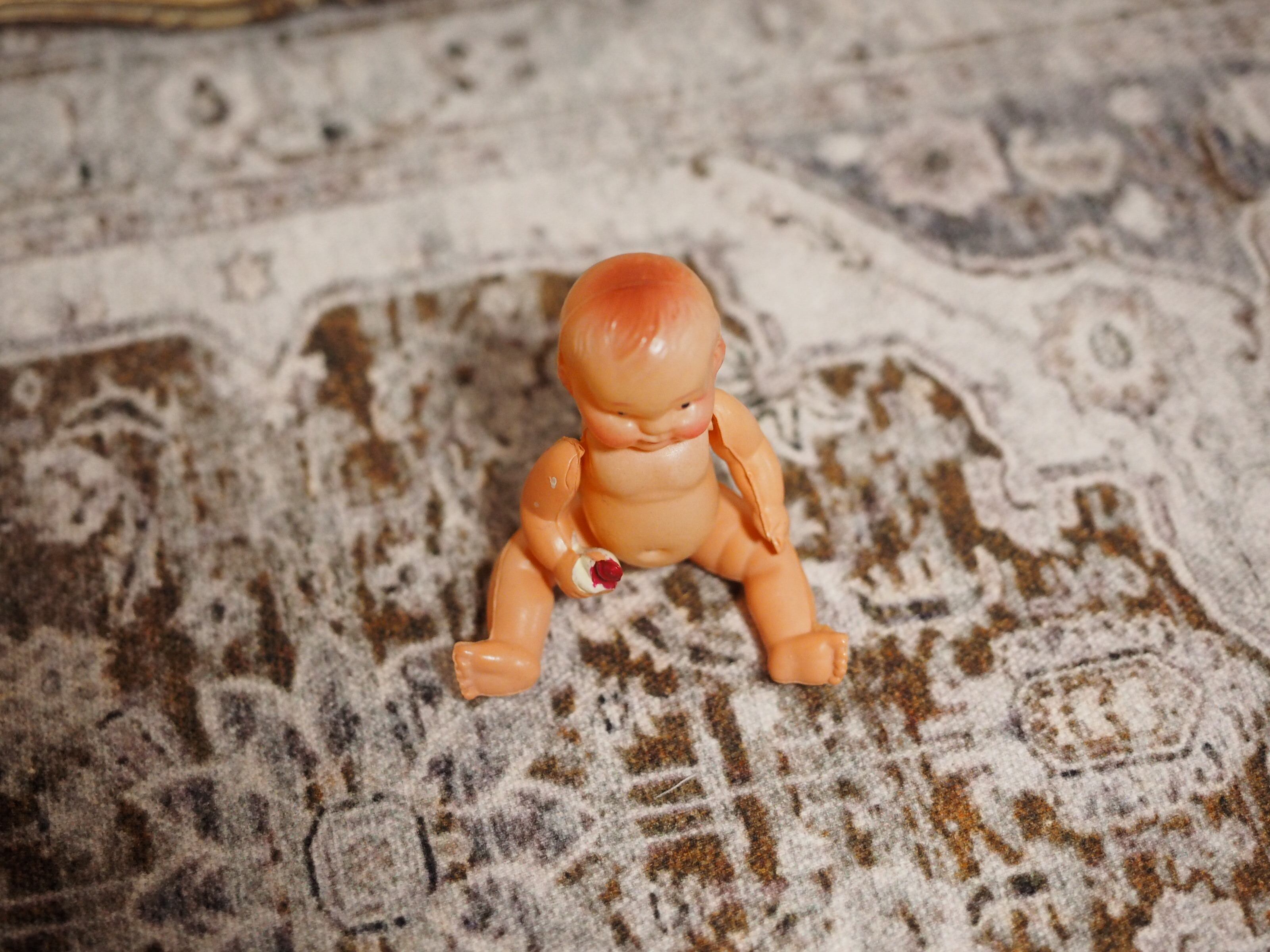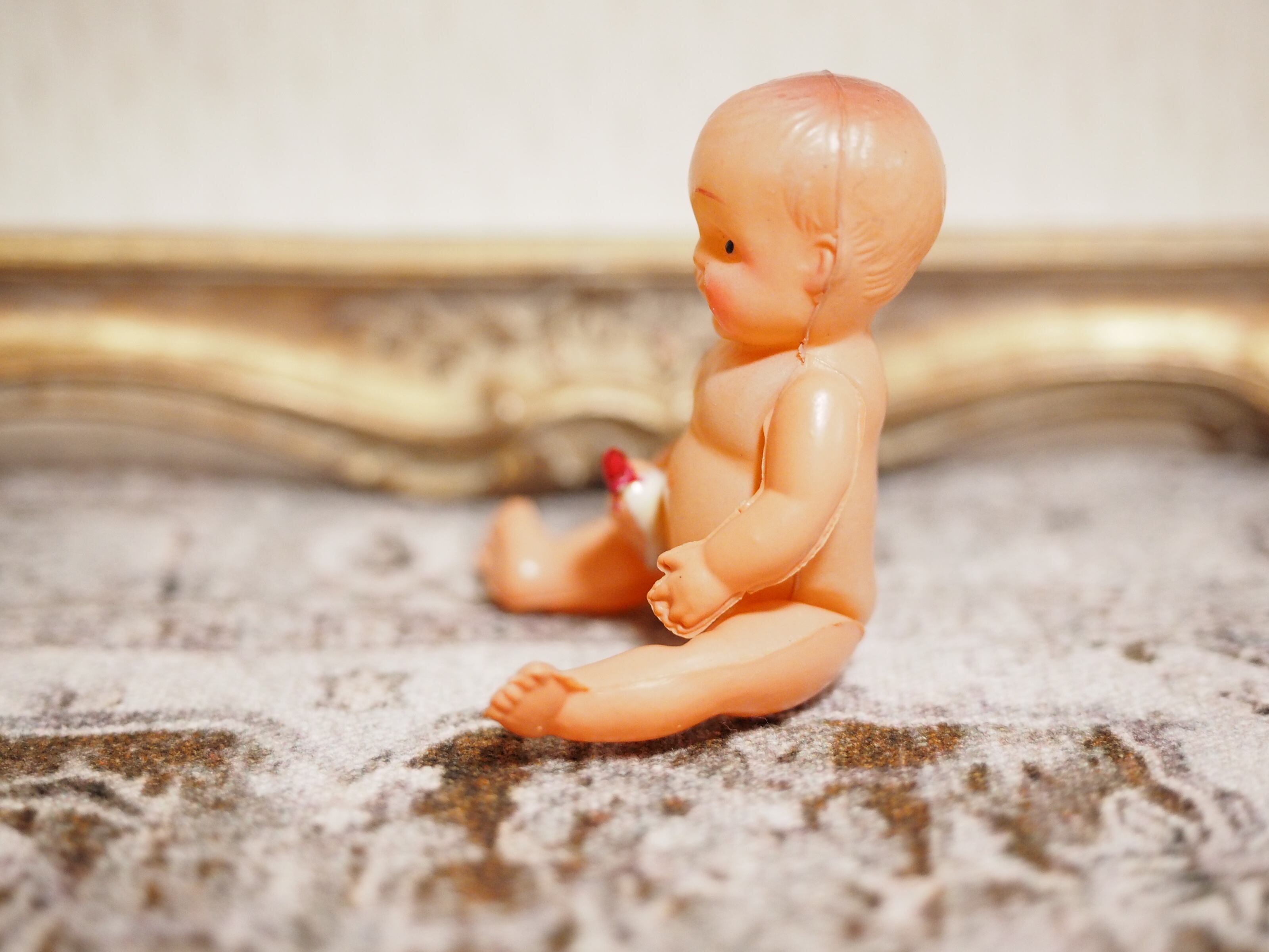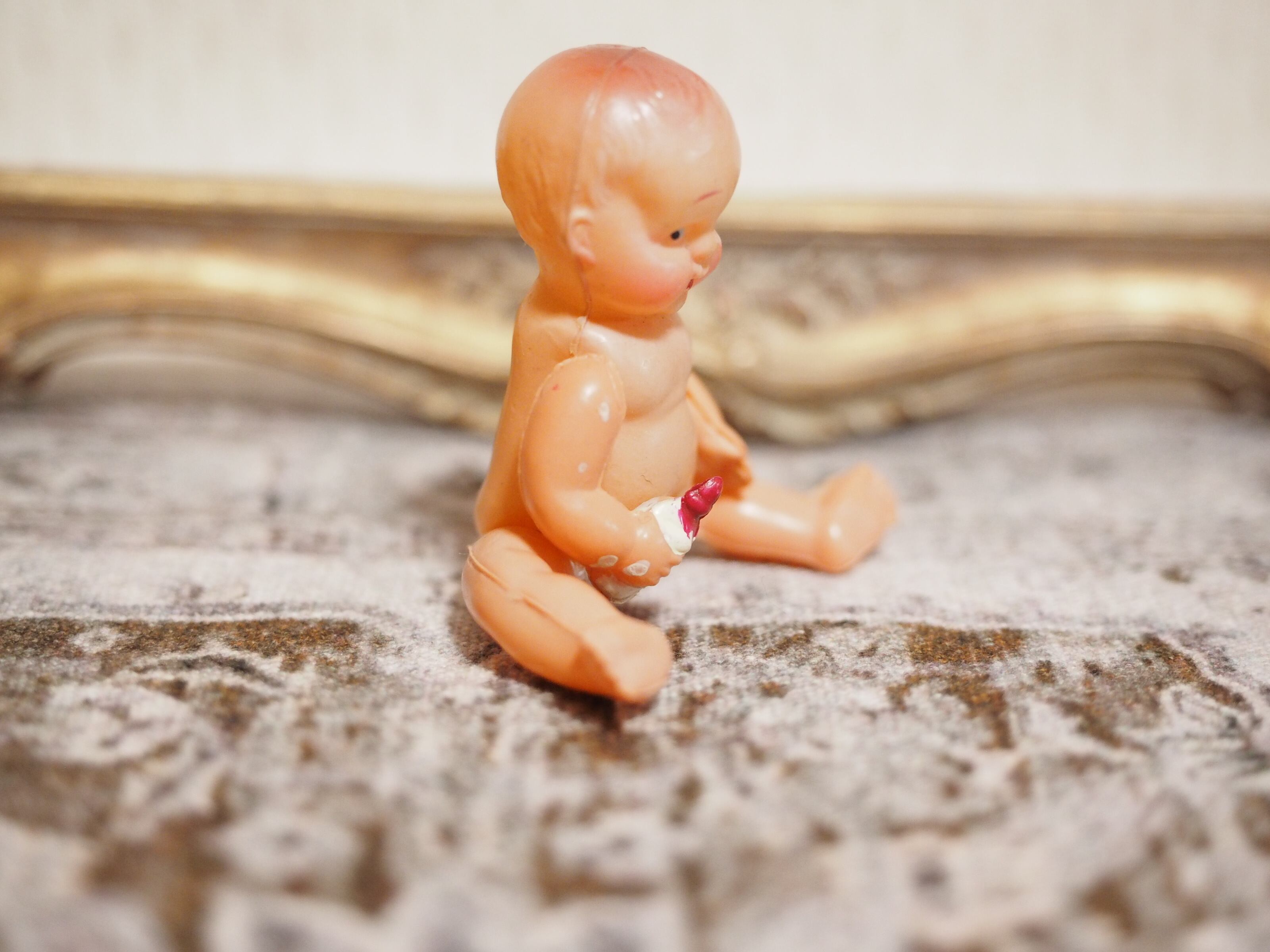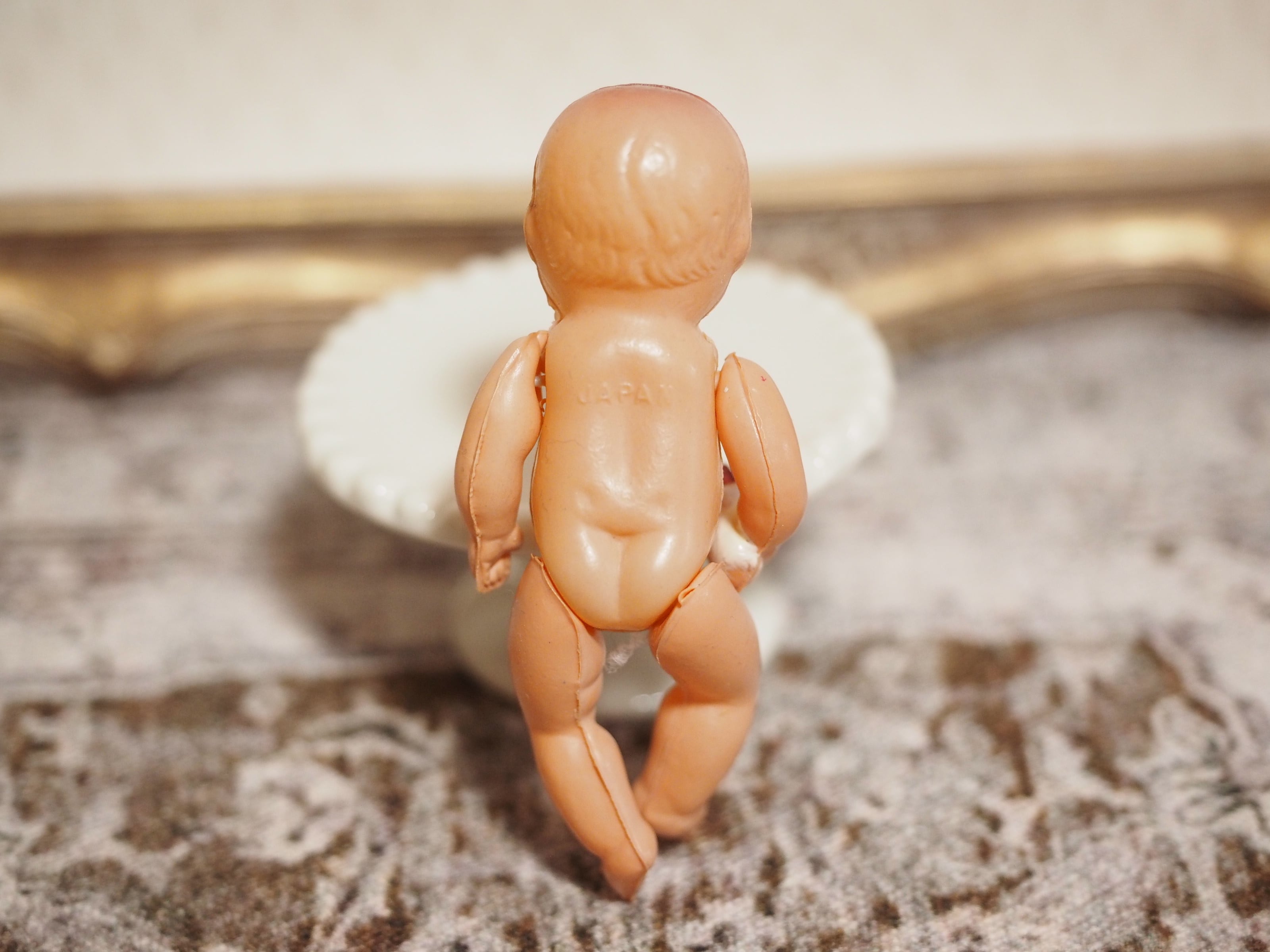 お座り姿で約5㎝ですが、腕脚ゴムジョイントで右手に哺乳瓶を持っています。
