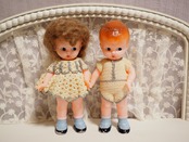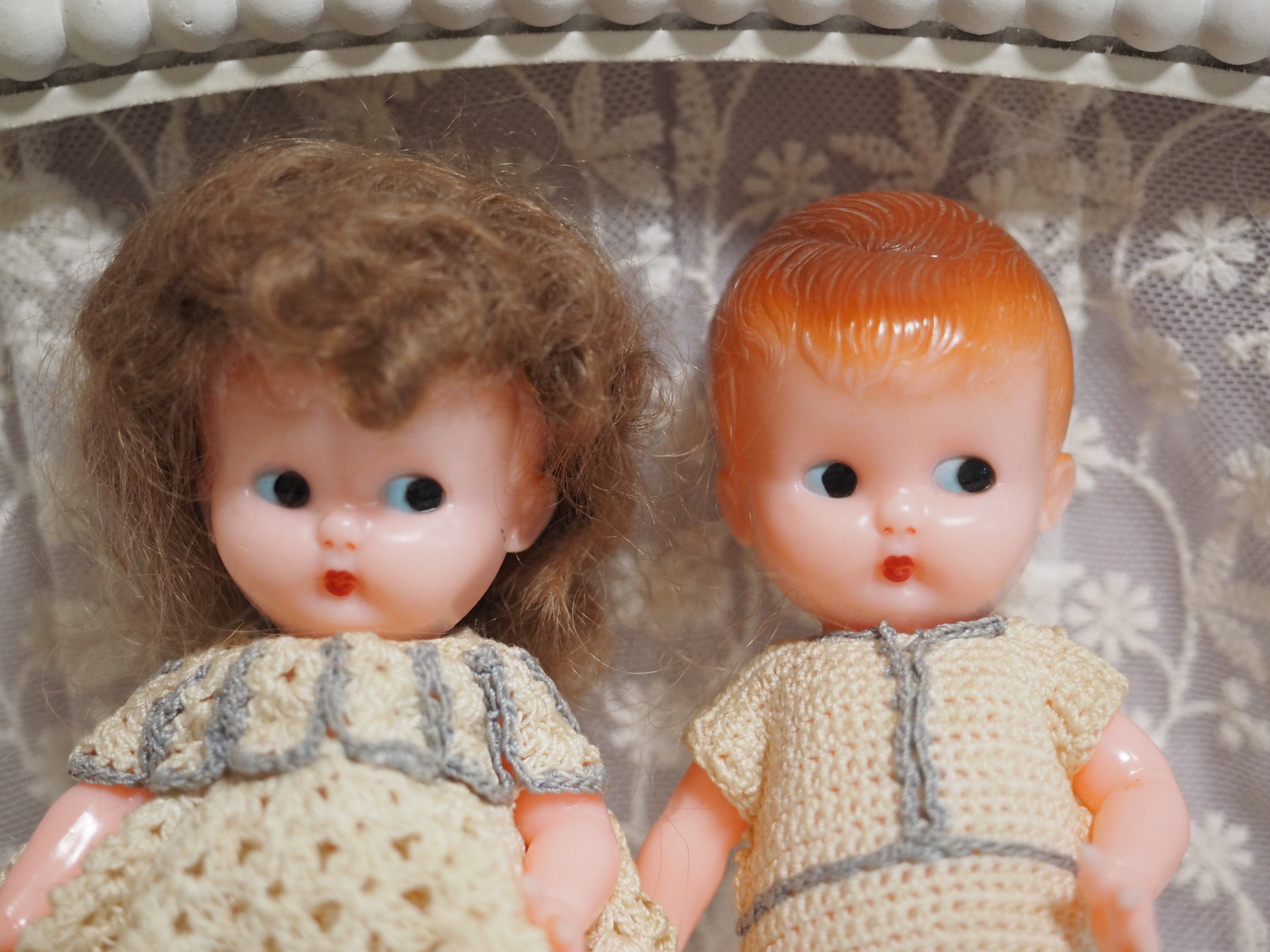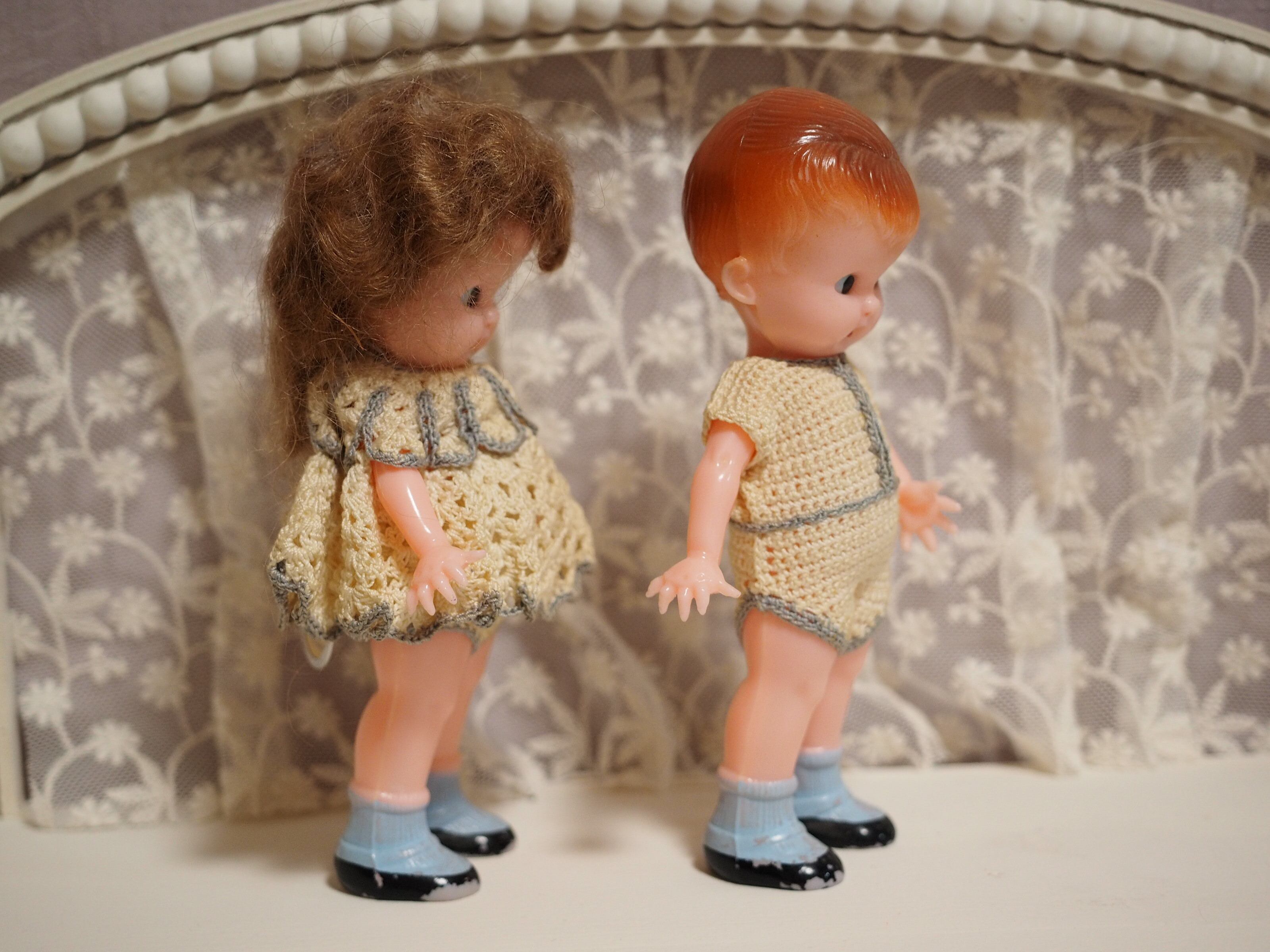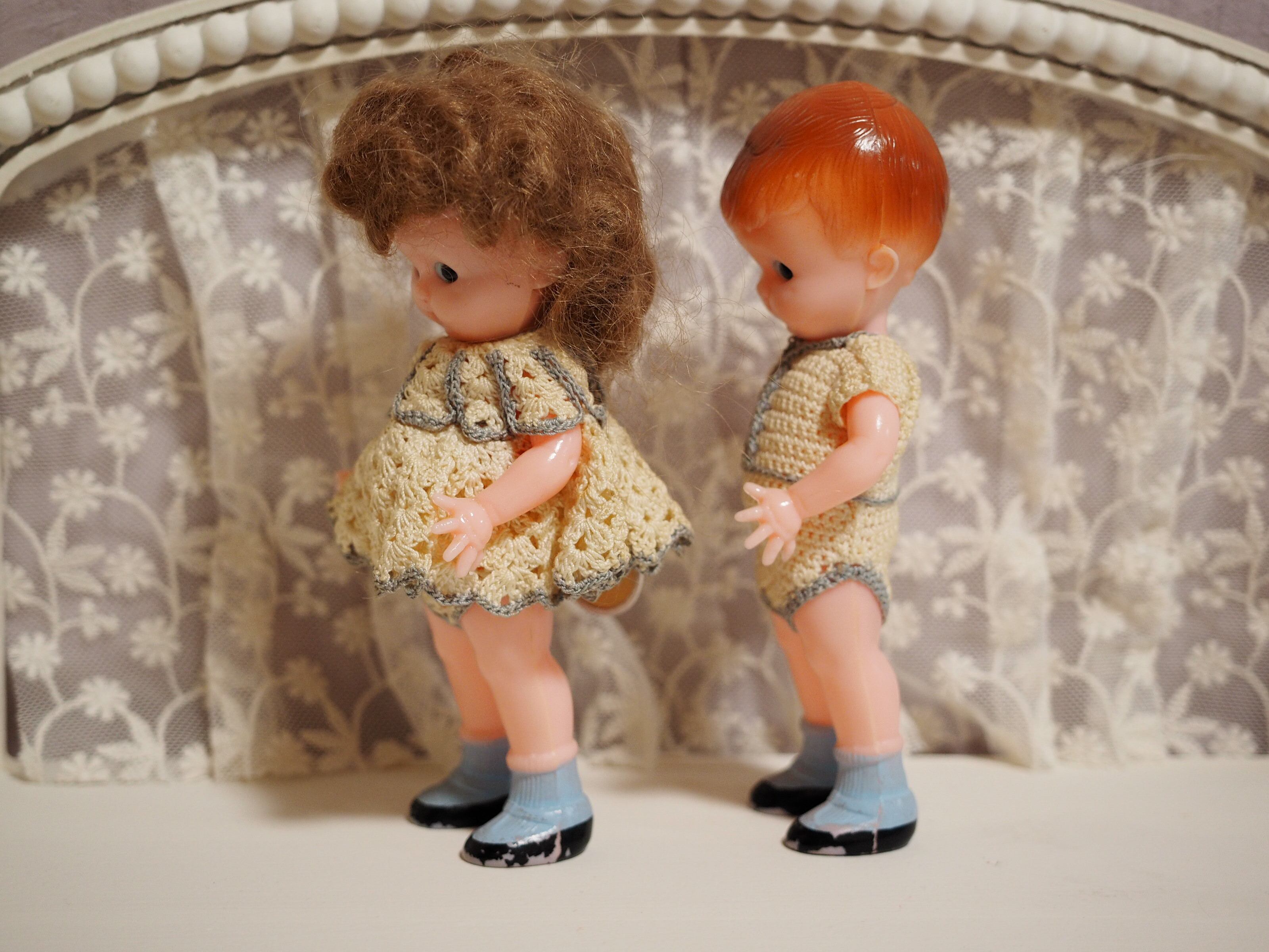 少し向かい合うようにすると、仲良くひそひそ話をしているような様子がかわいい、ペアドールです。