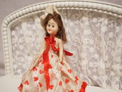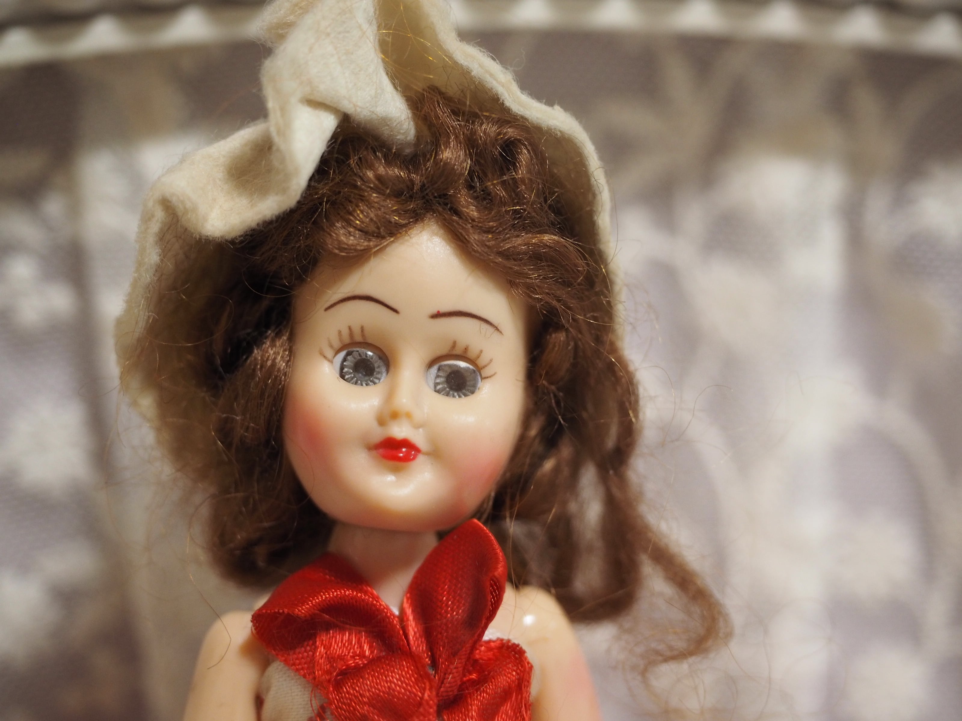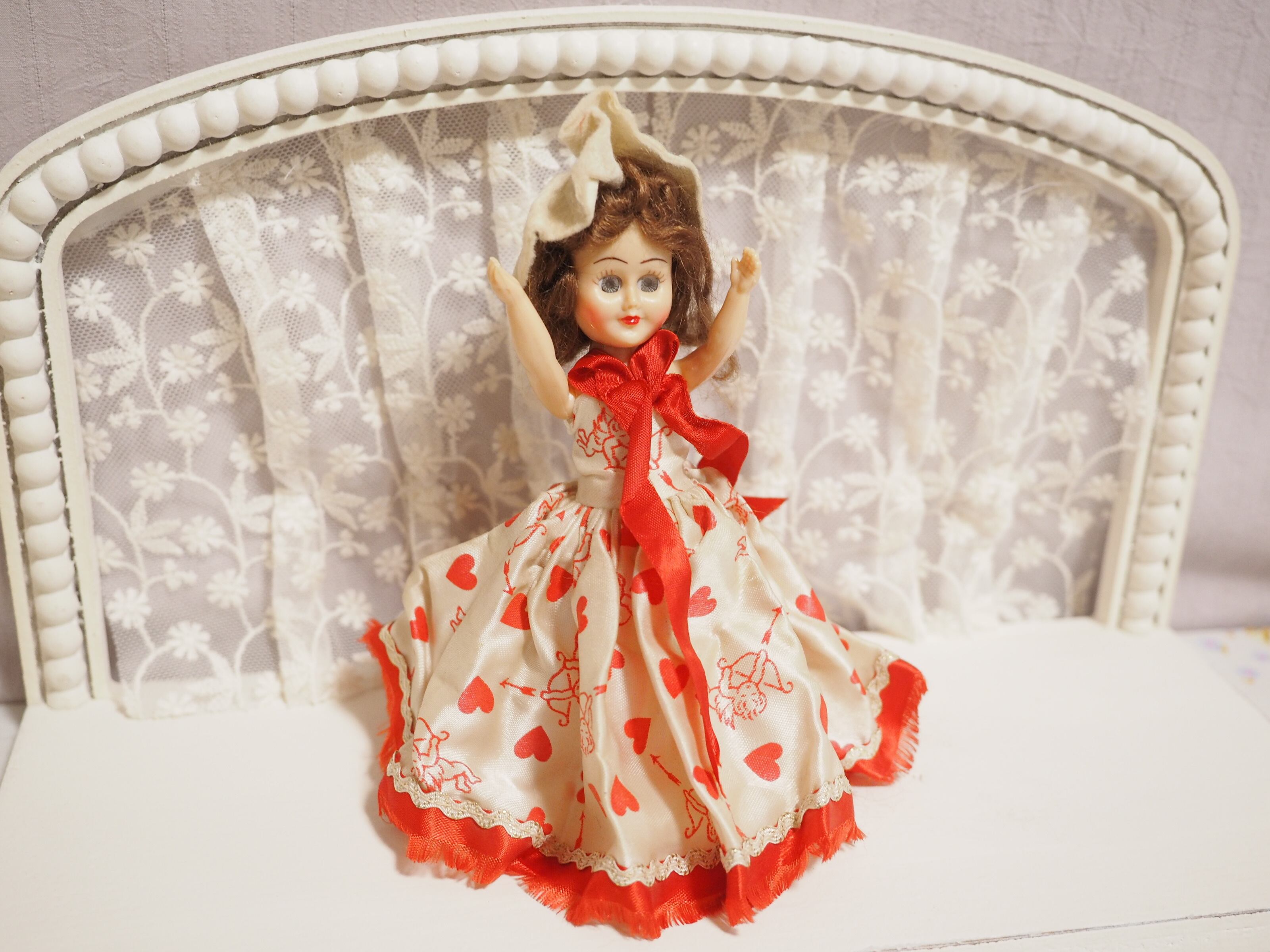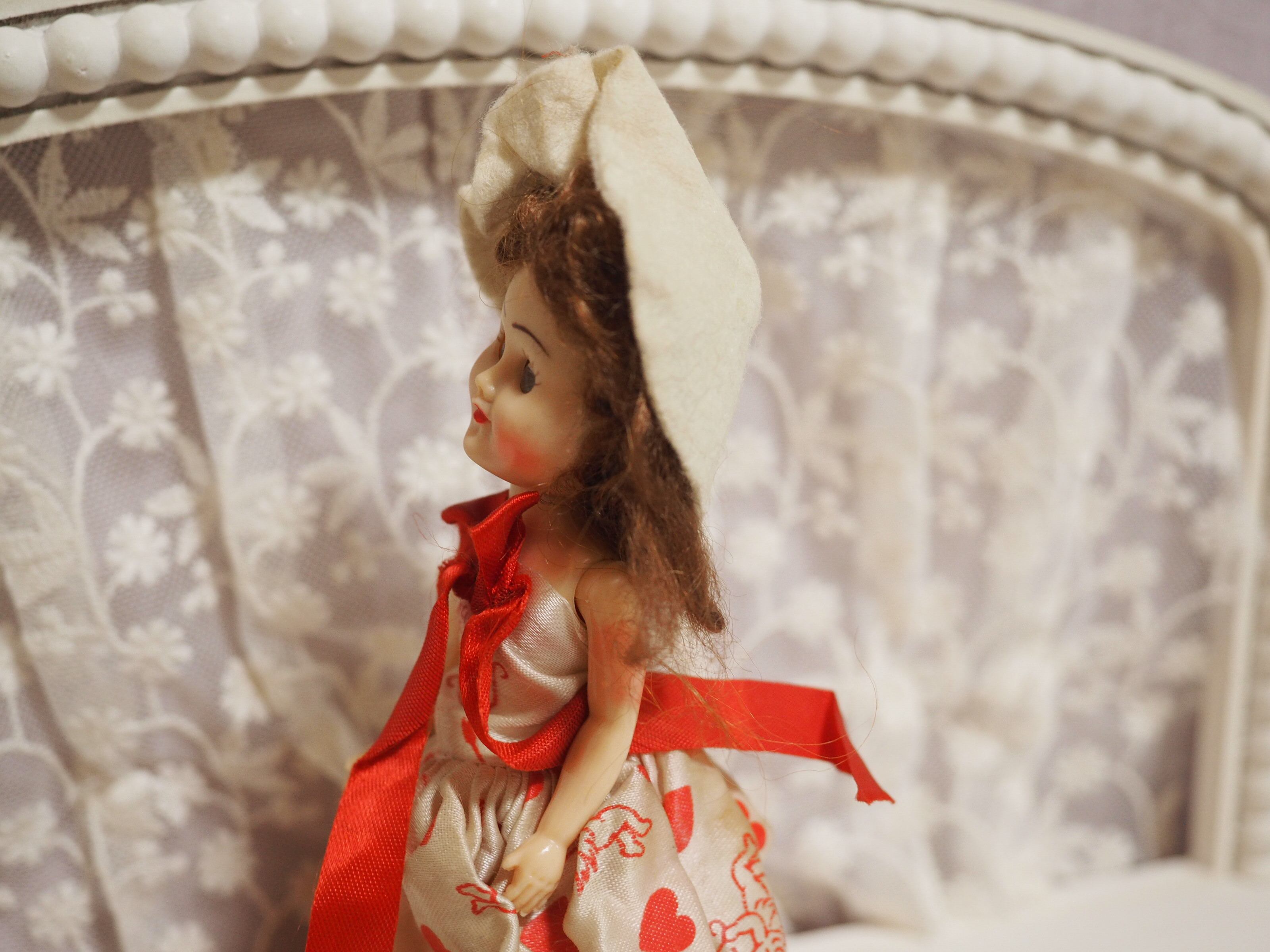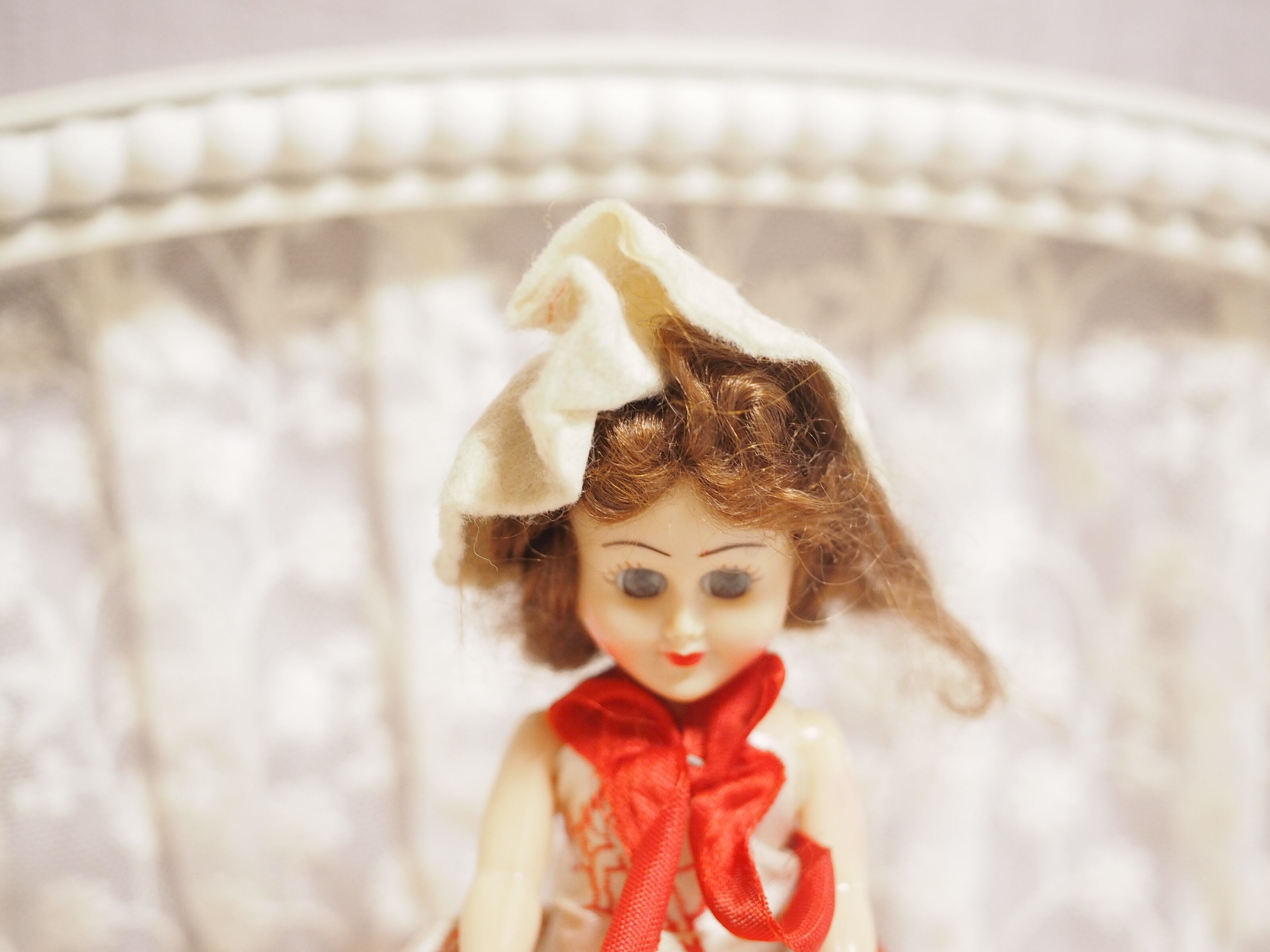 dress me dollタイプのプラスチックドールで、素敵なドレスを着てフェルトのボネをかぶっています。