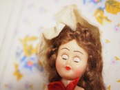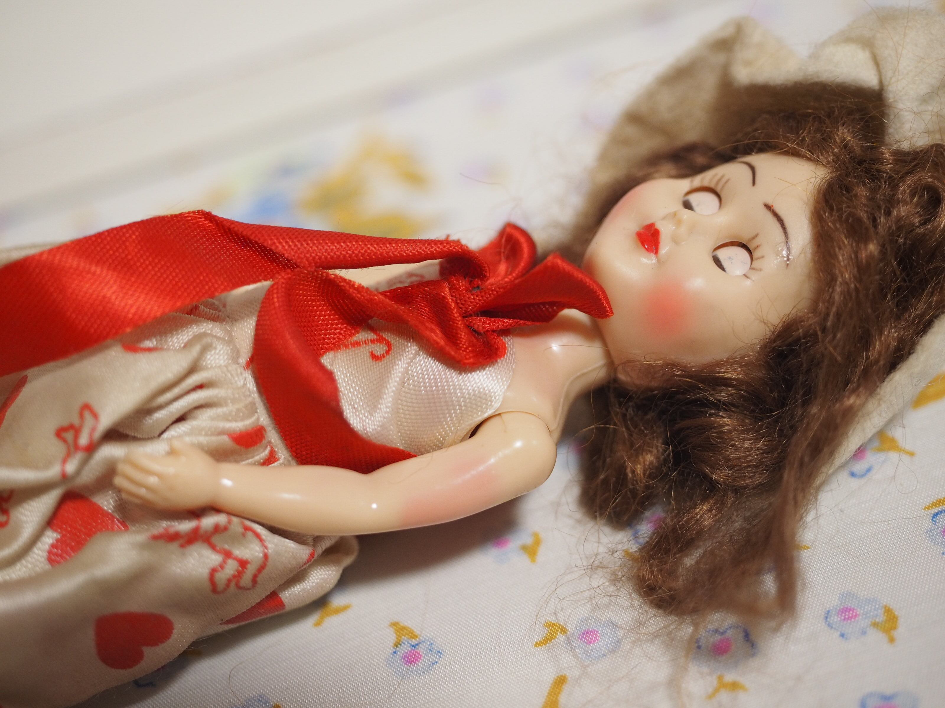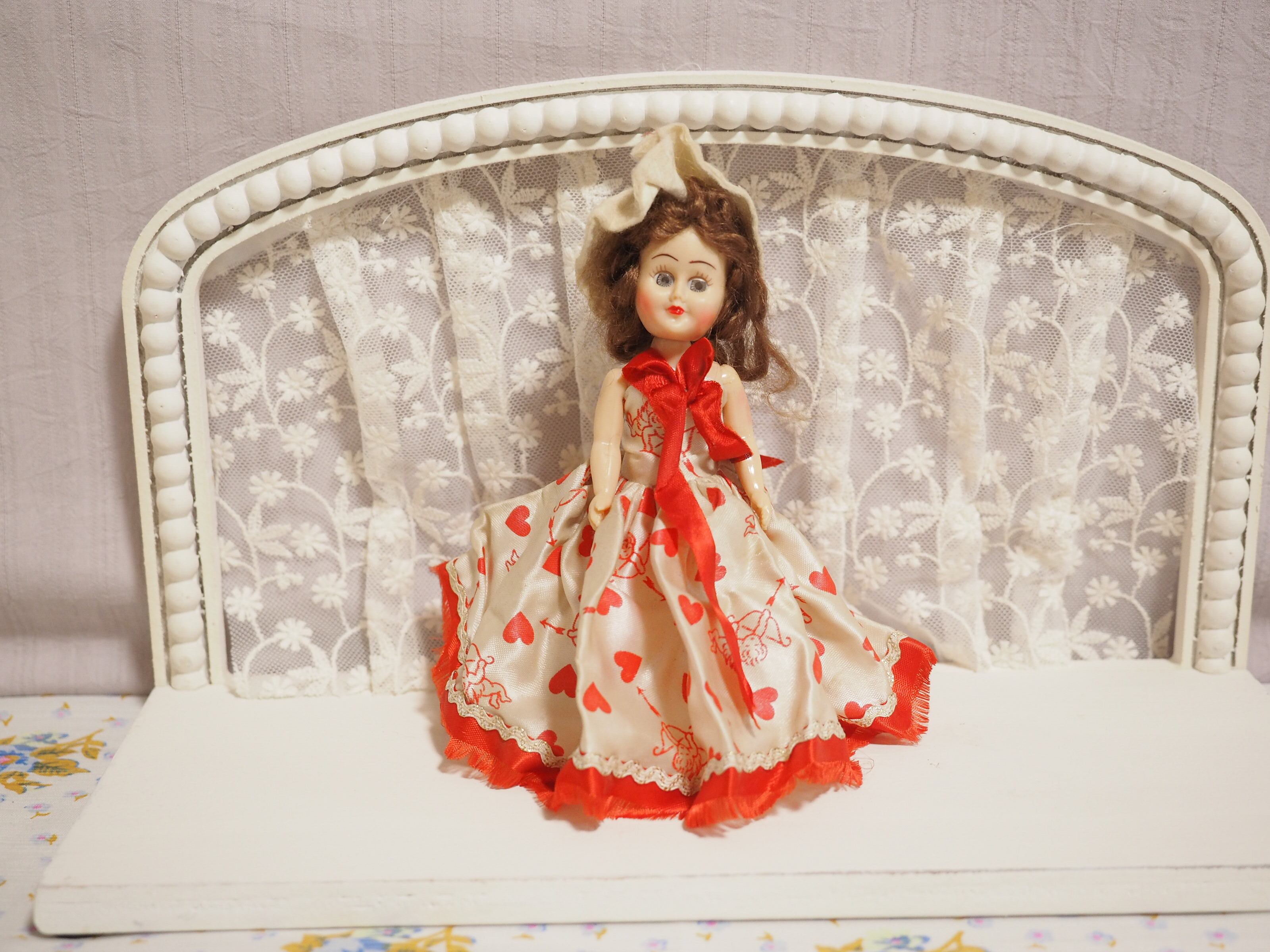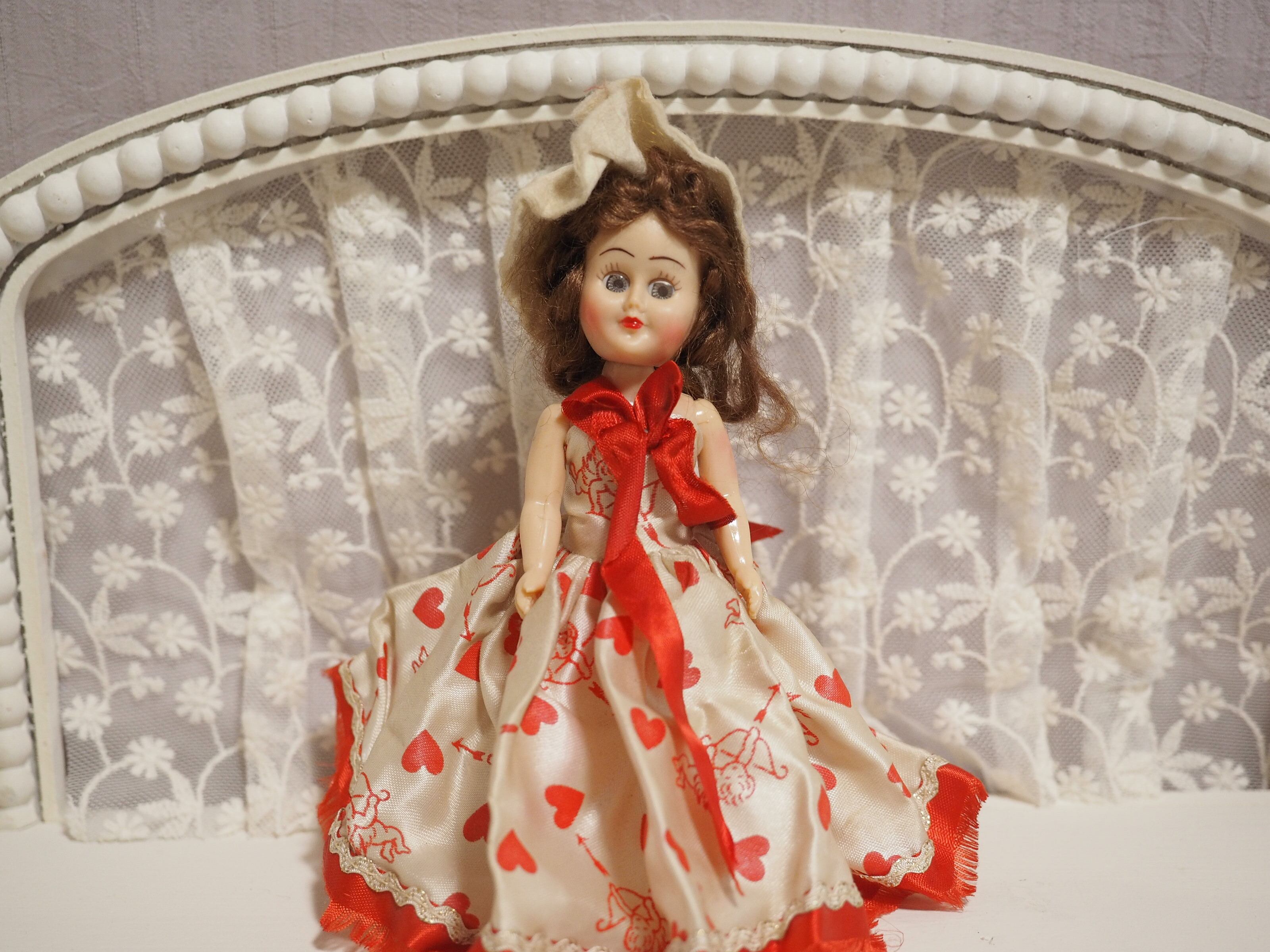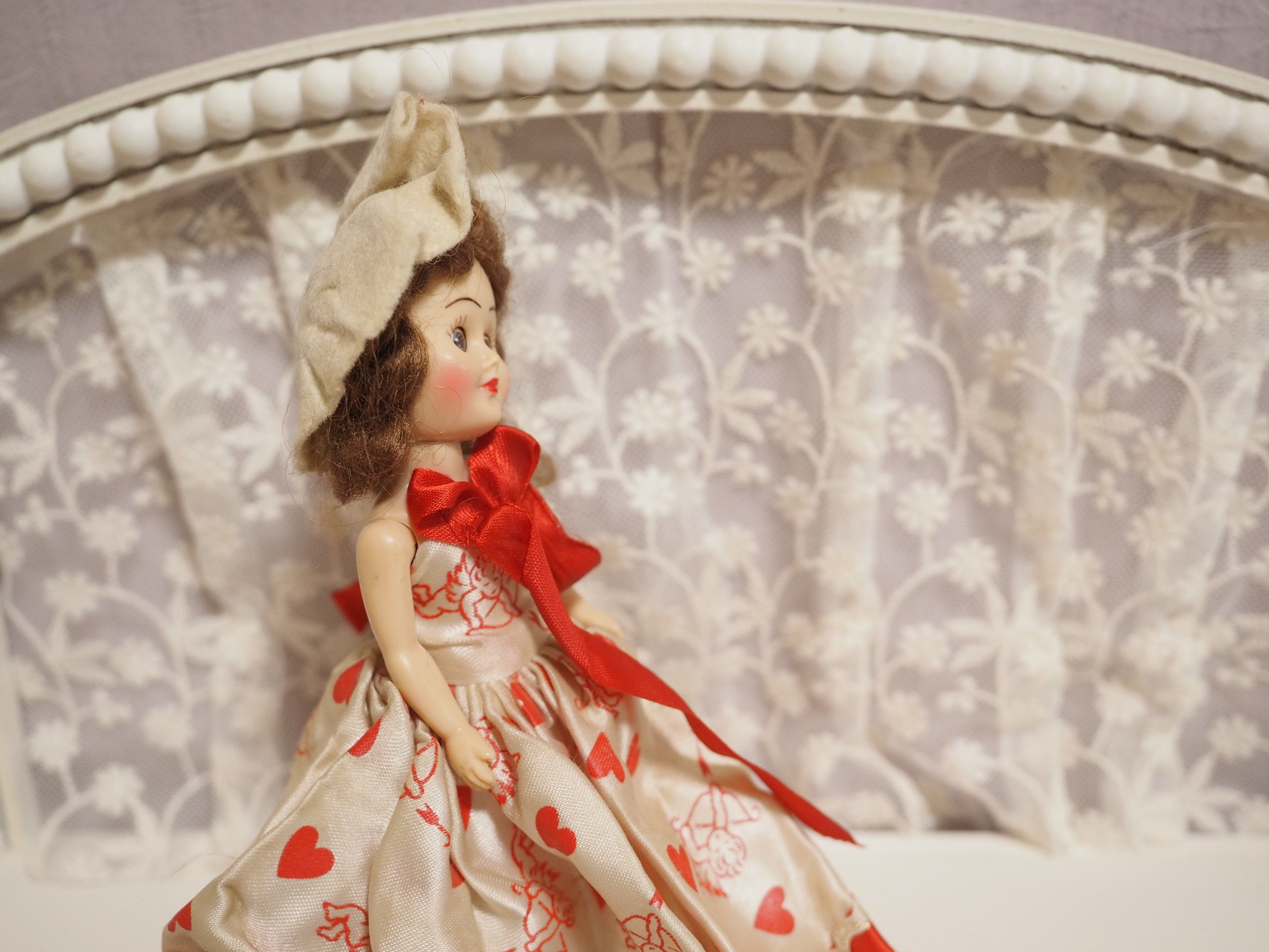 dress me dollタイプのプラスチックドールで、素敵なドレスを着てフェルトのボネをかぶっています。