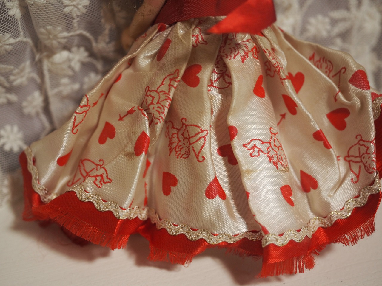 光沢生地のドレスはキューピッドが矢を射る姿に赤いハートがキュートです。生地に薄く赤い色移りや茶色く変色シミがございます。