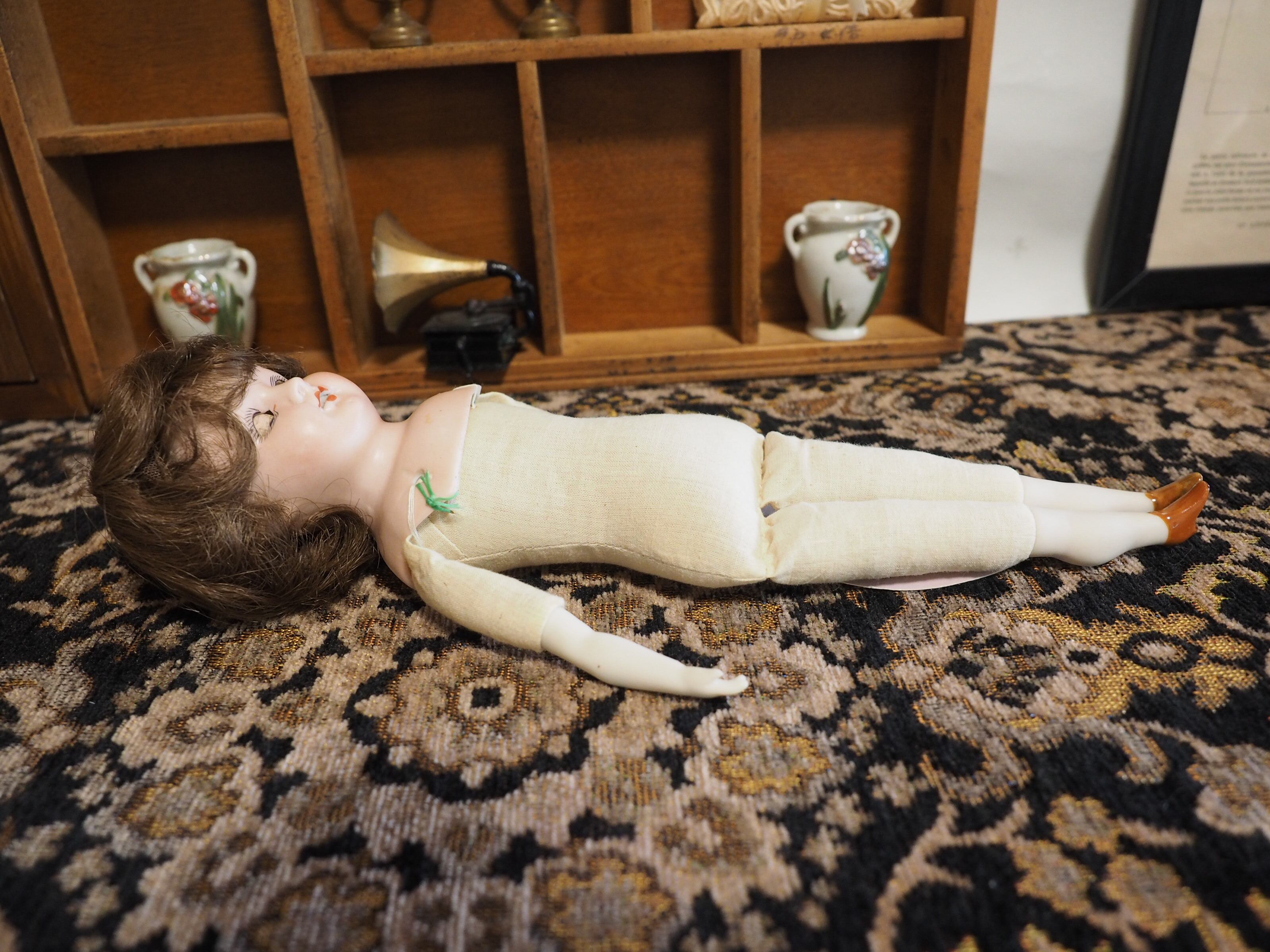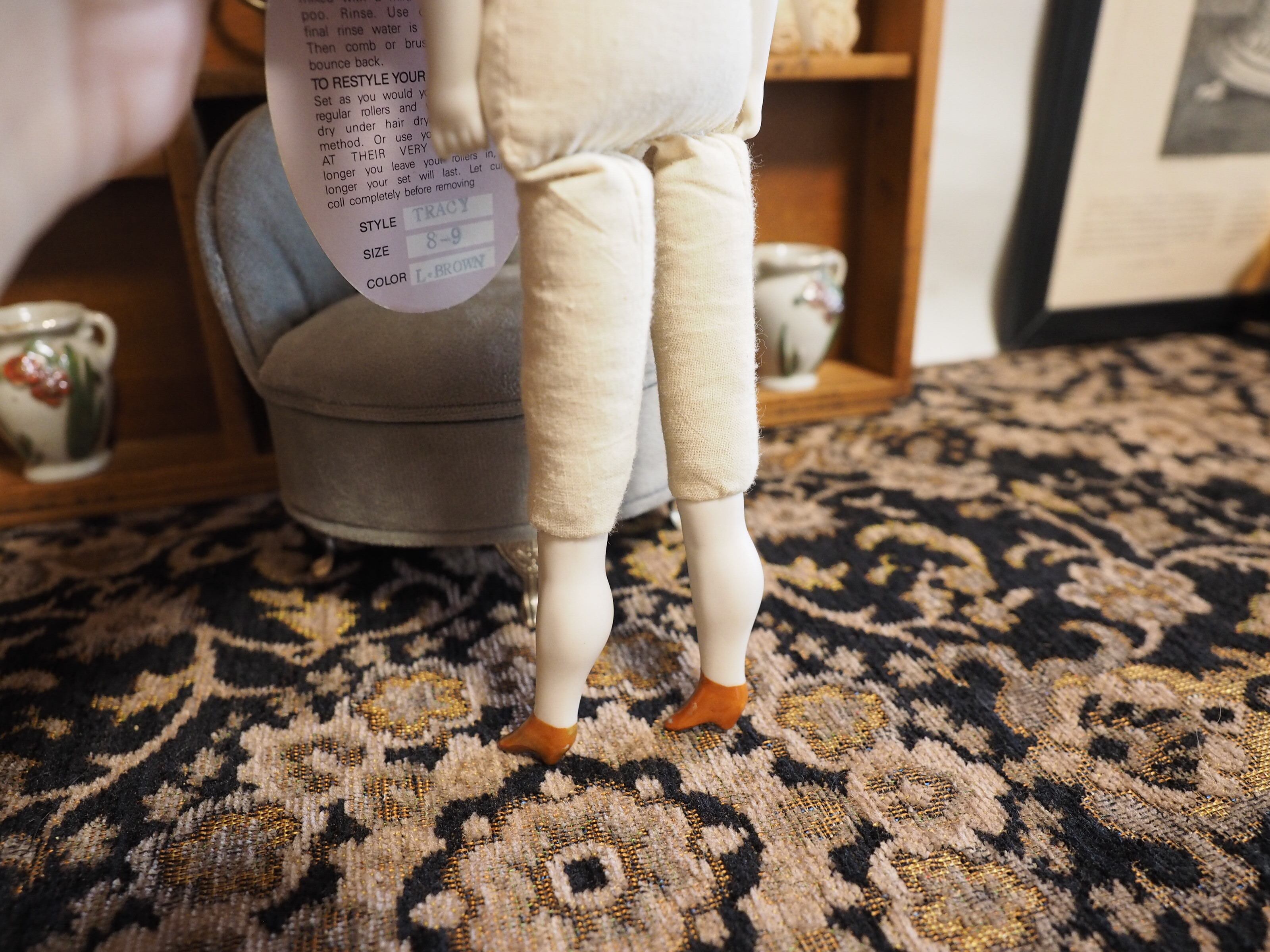 チャイナヘッドドールのように、釉薬をかけられたような艶のある小さなブラウンシューズがおしゃれ。美しいふくらはぎと、膝の成形もぜひご覧いただきたいです。