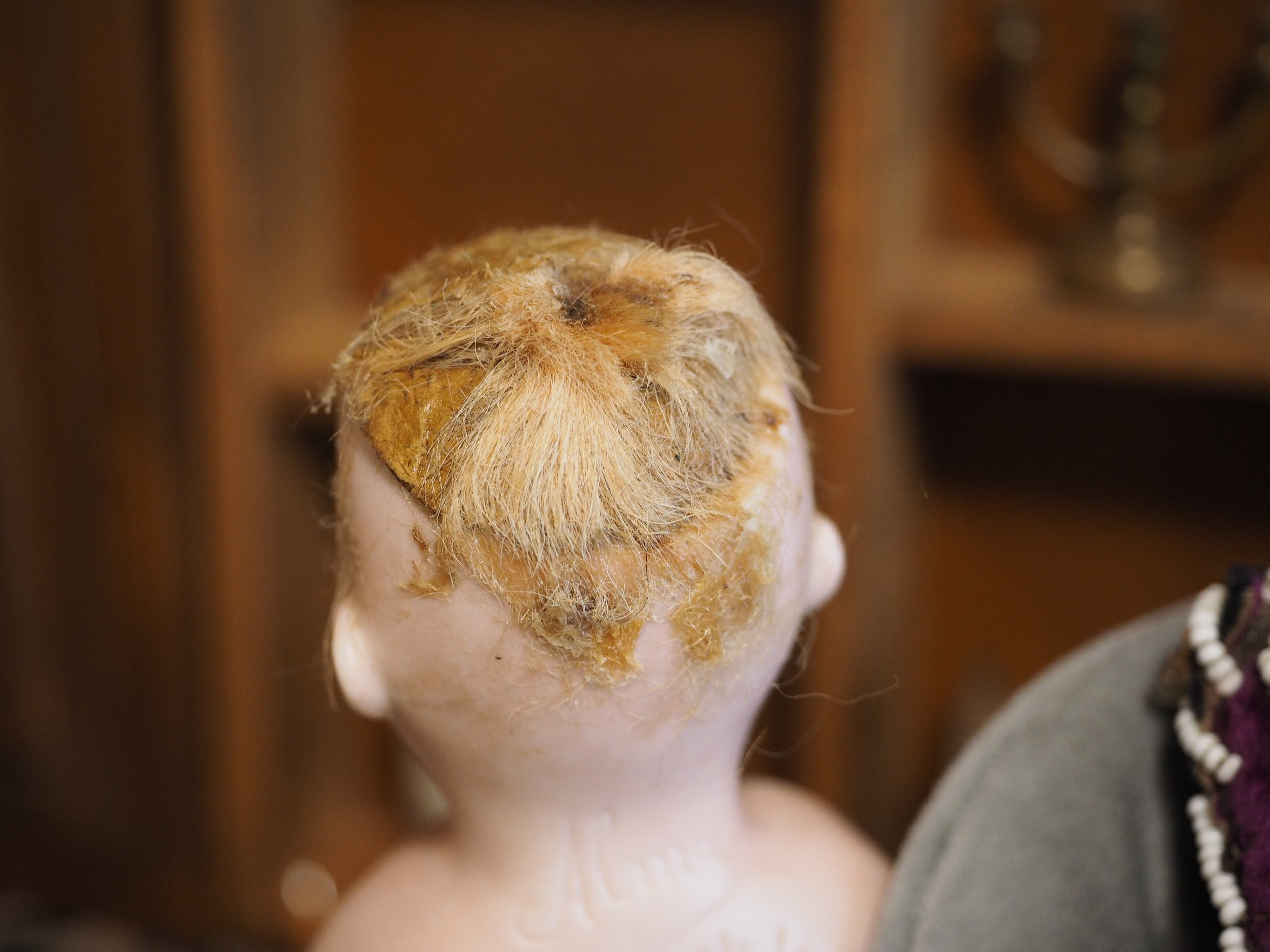 ヘッドにペイトが接着されたまま、ヘアはざんぎりにカットされていました。耳上にも接着剤とヘア残りあり。
