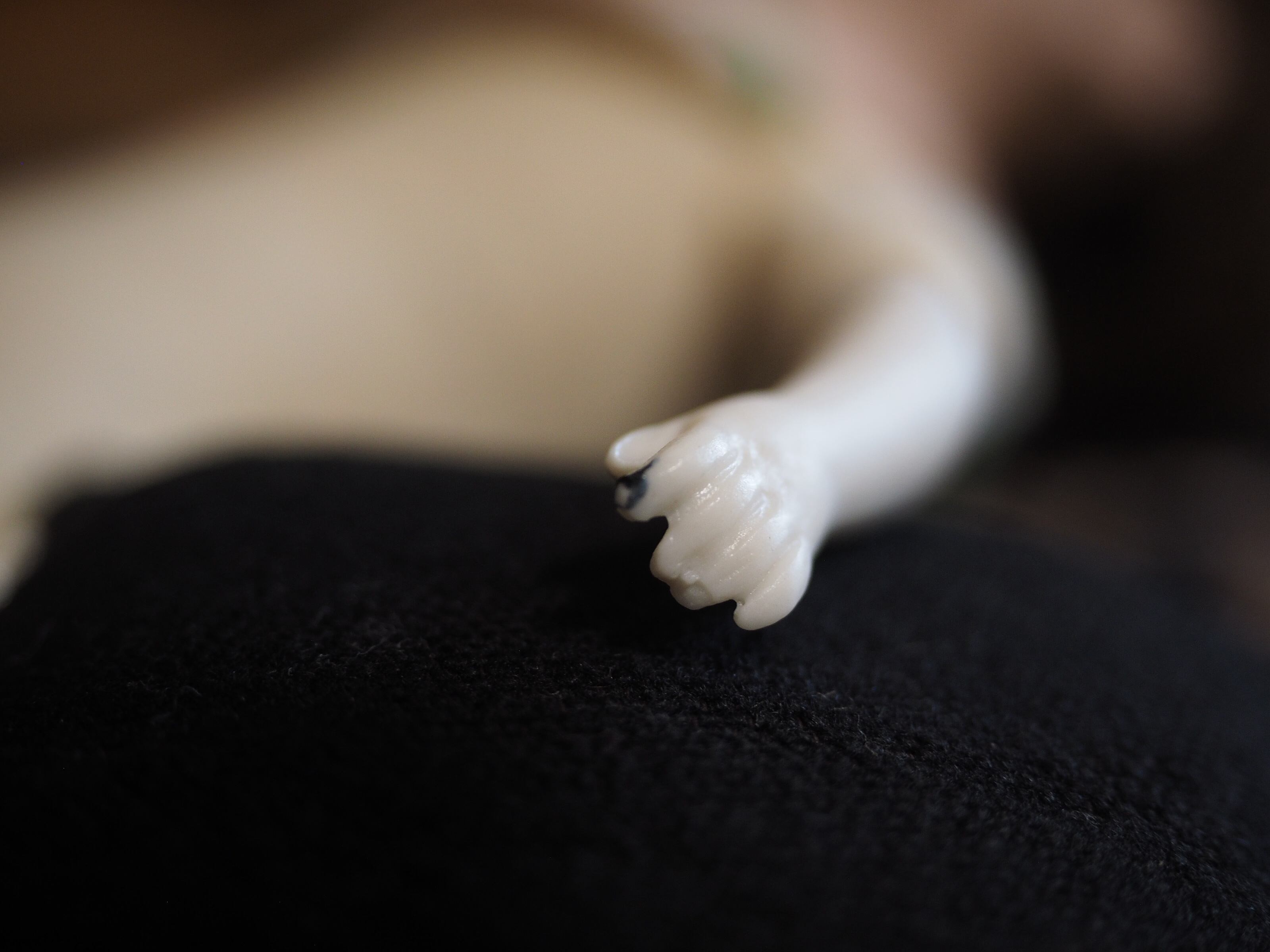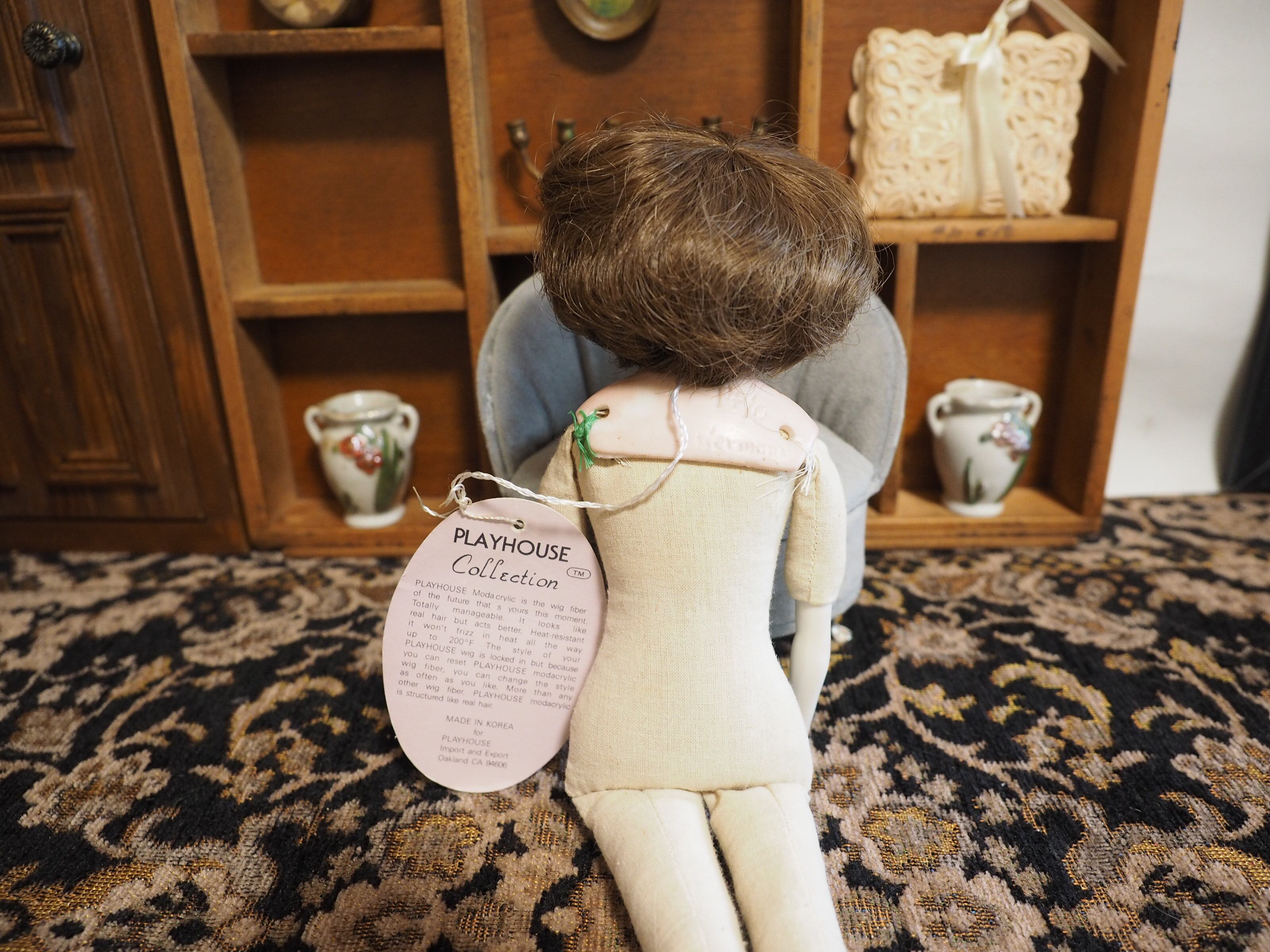ボディはリネンのような素材、腕と足先はビスクではなく、すべすべとしていてポーセリン素材かもしれません。