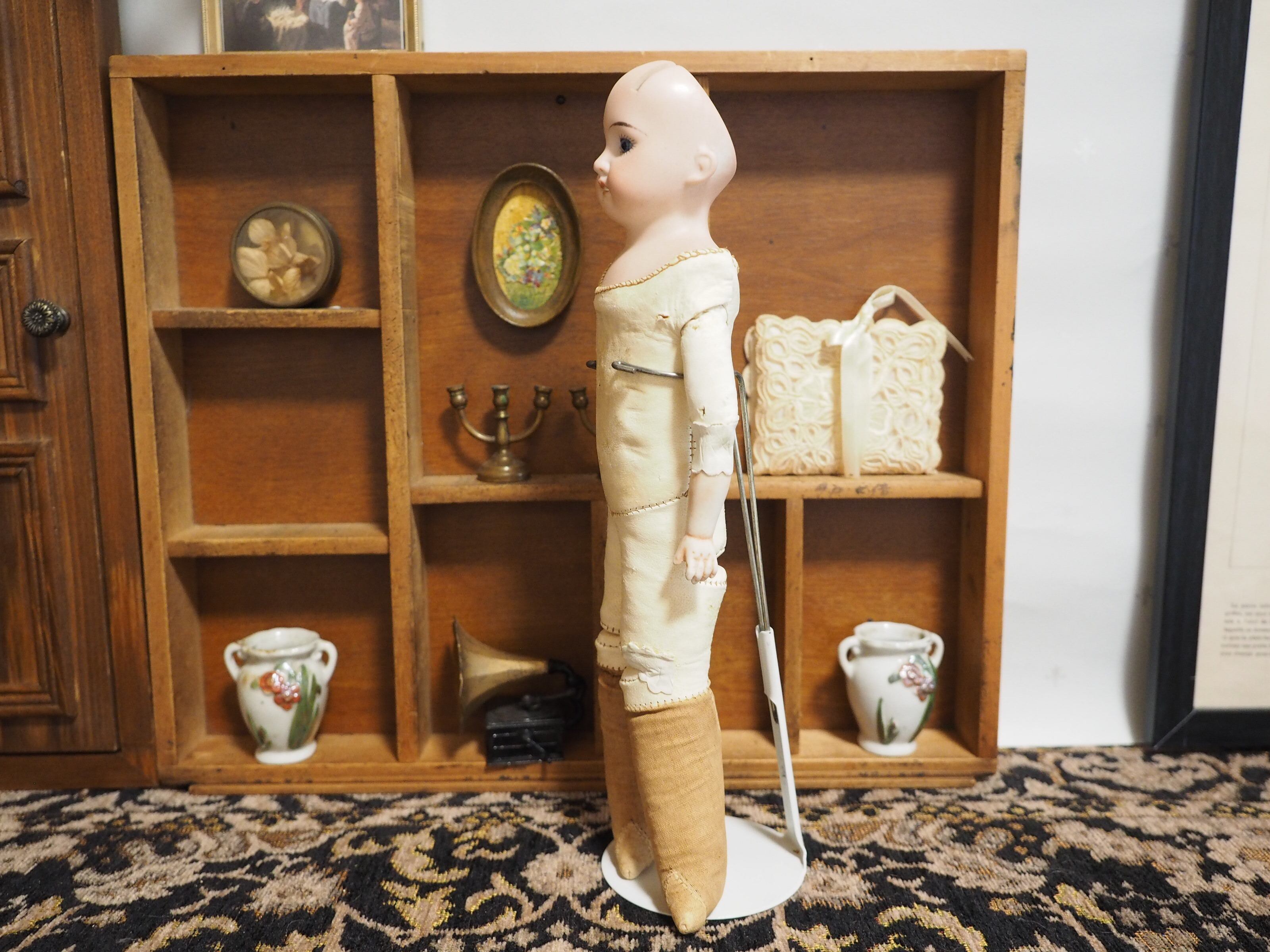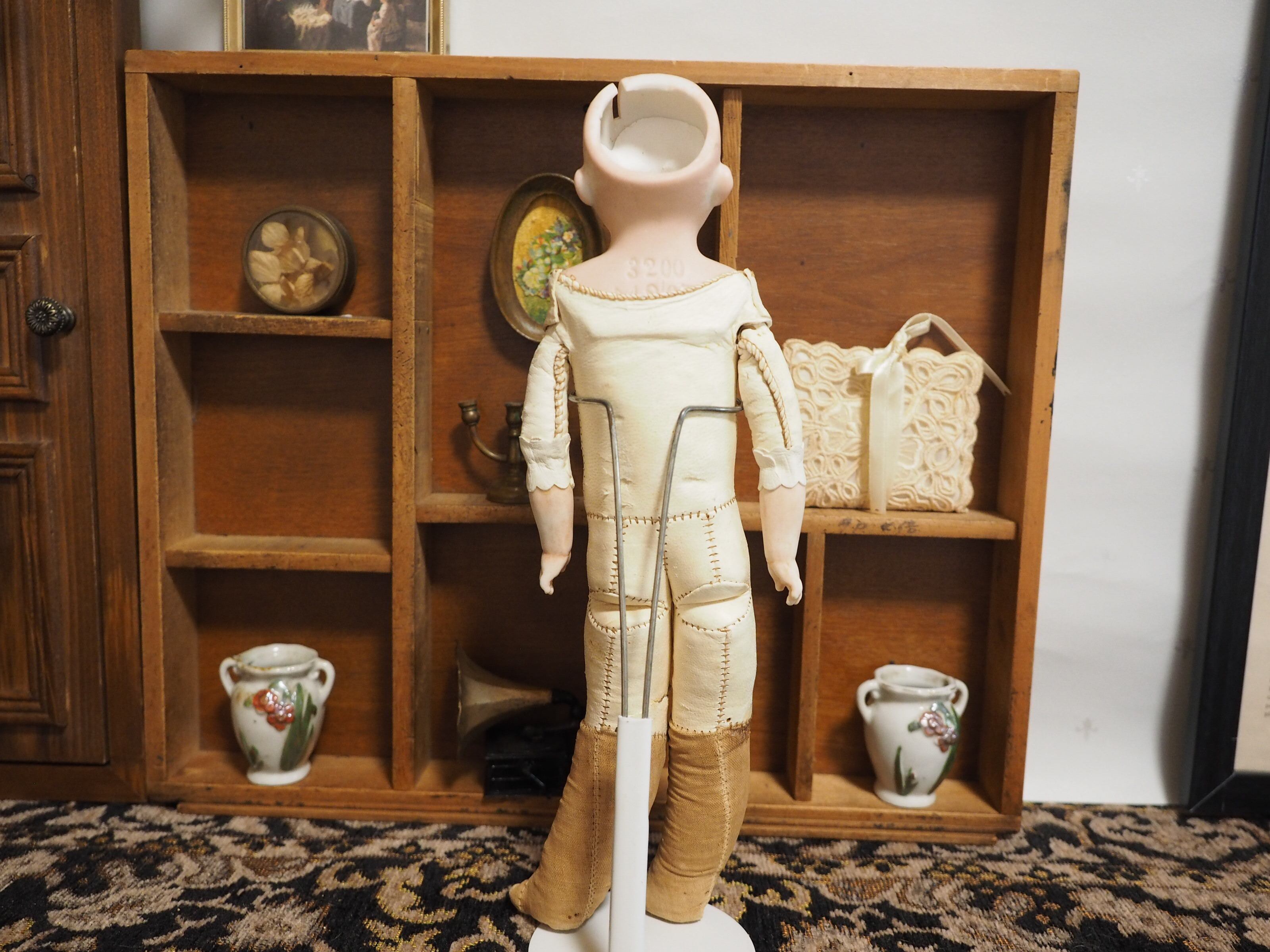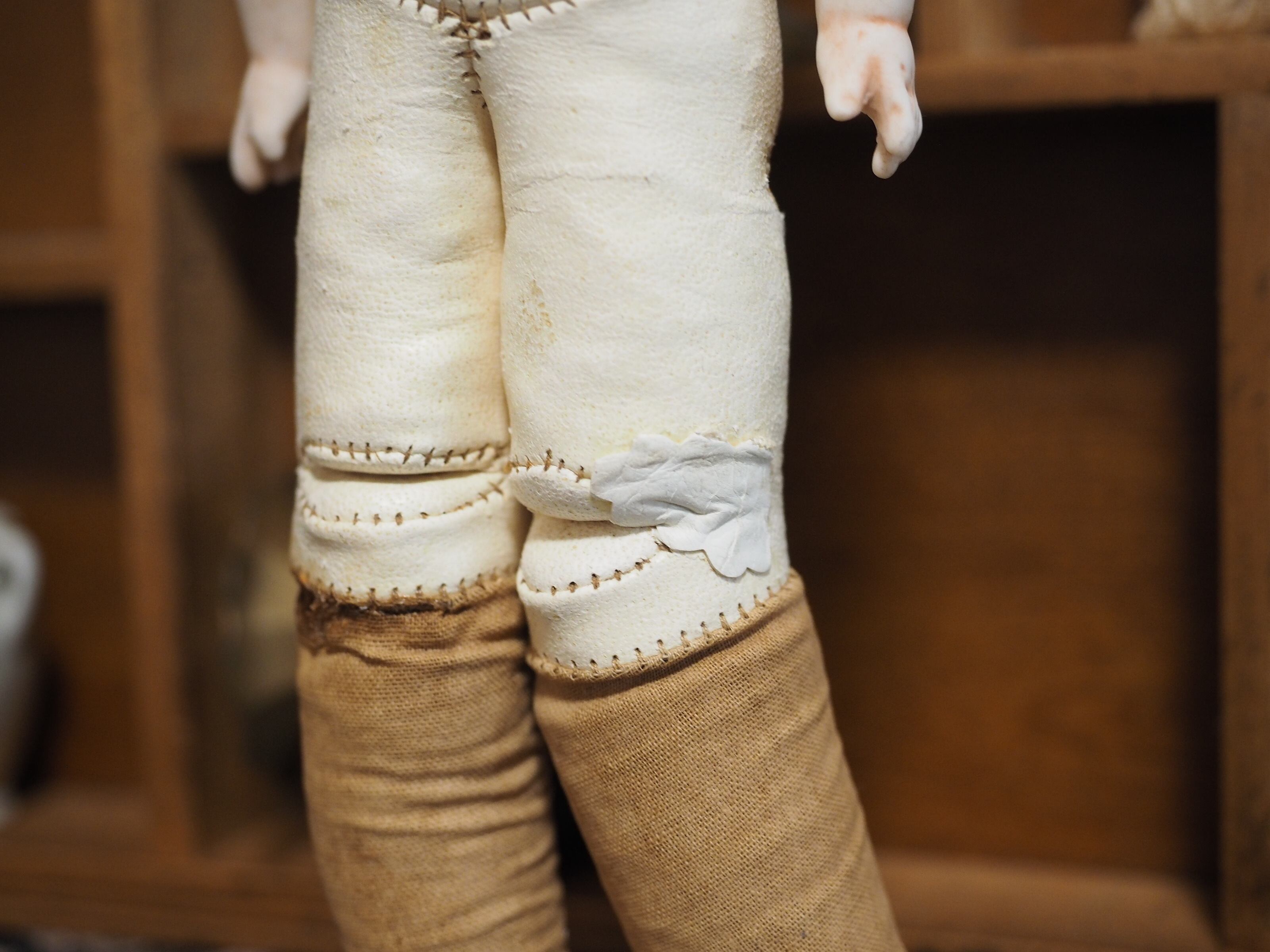 腕先はピンク色の赤みのあるビスク、膝下は布の組み合わせでつま先は少し尖った形状。