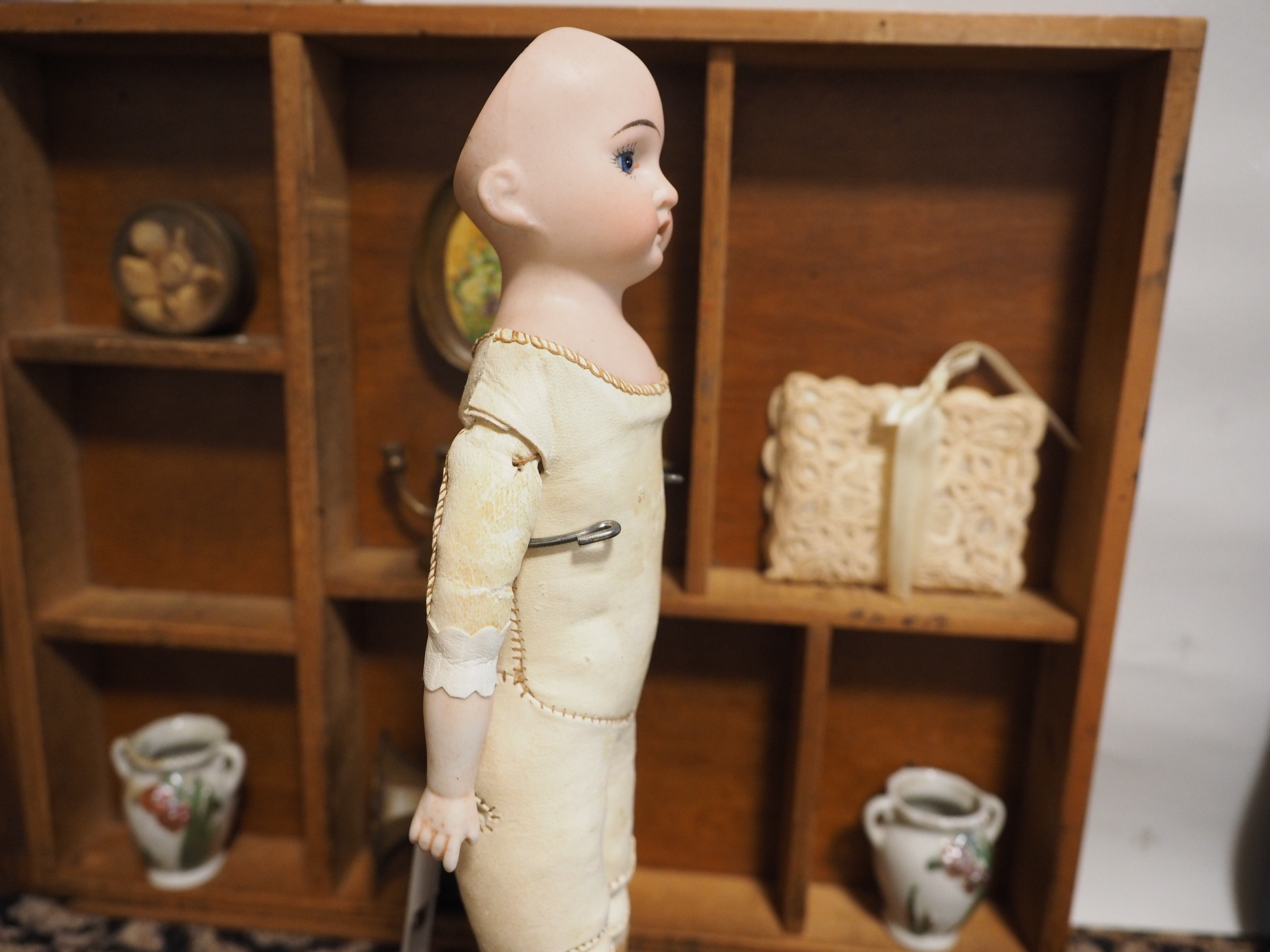 丸く広いおでことぷうっと膨らんだような頬がかわいらしい顔立ち。淡いチーク、ビスク素材もきれいです。