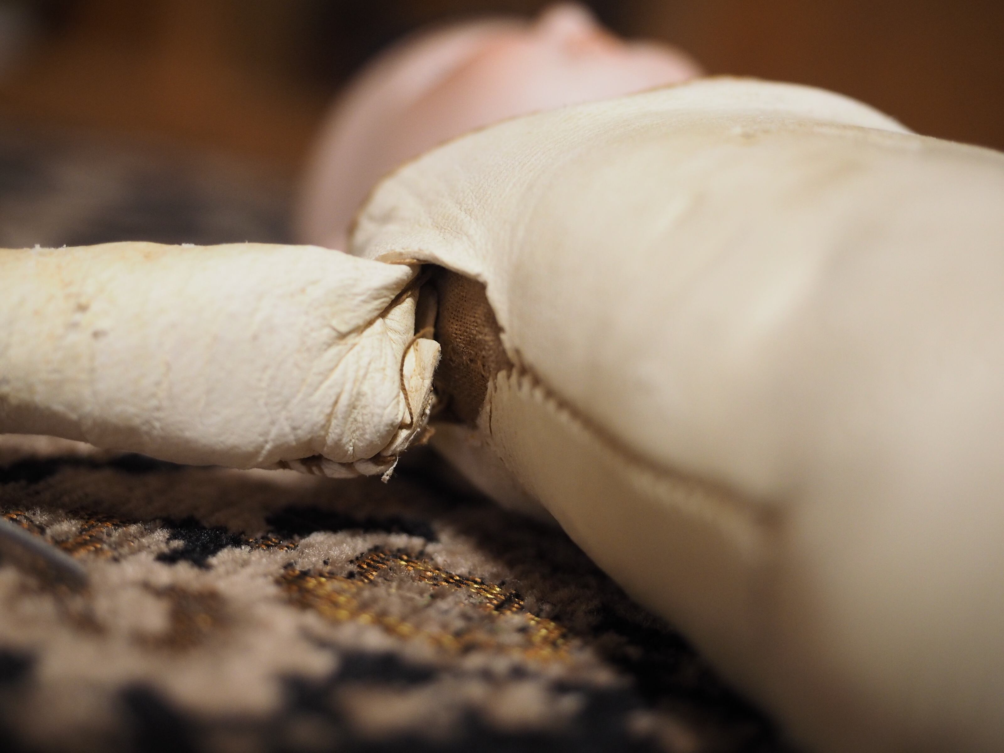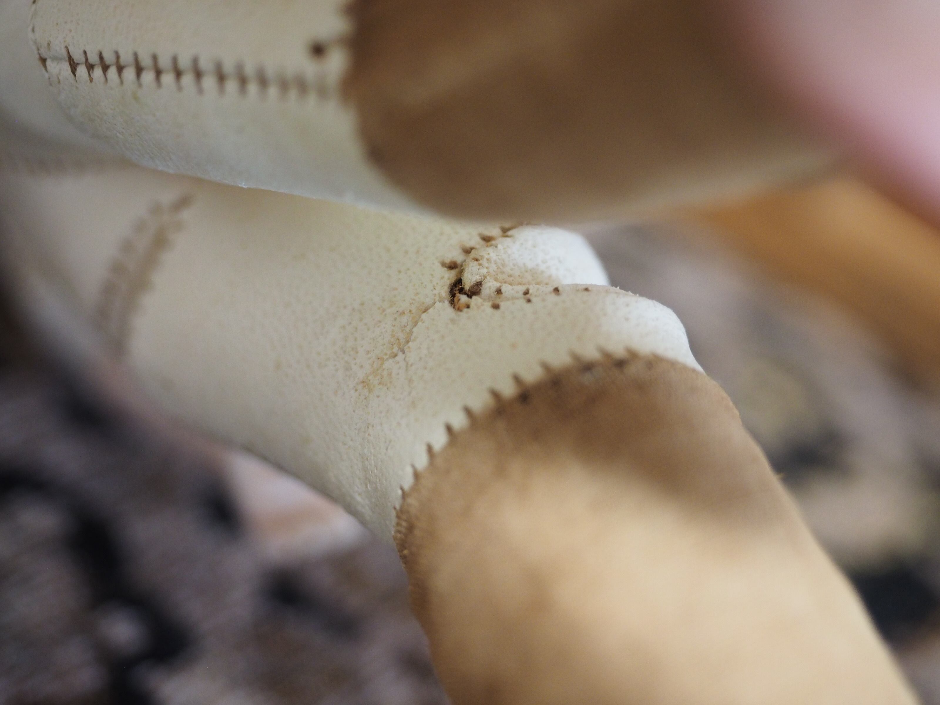 *右脚のレザーと布の縫い目が半周以上ほどけており、たくさんおがくずが漏れてしまうためボンド留めしています。