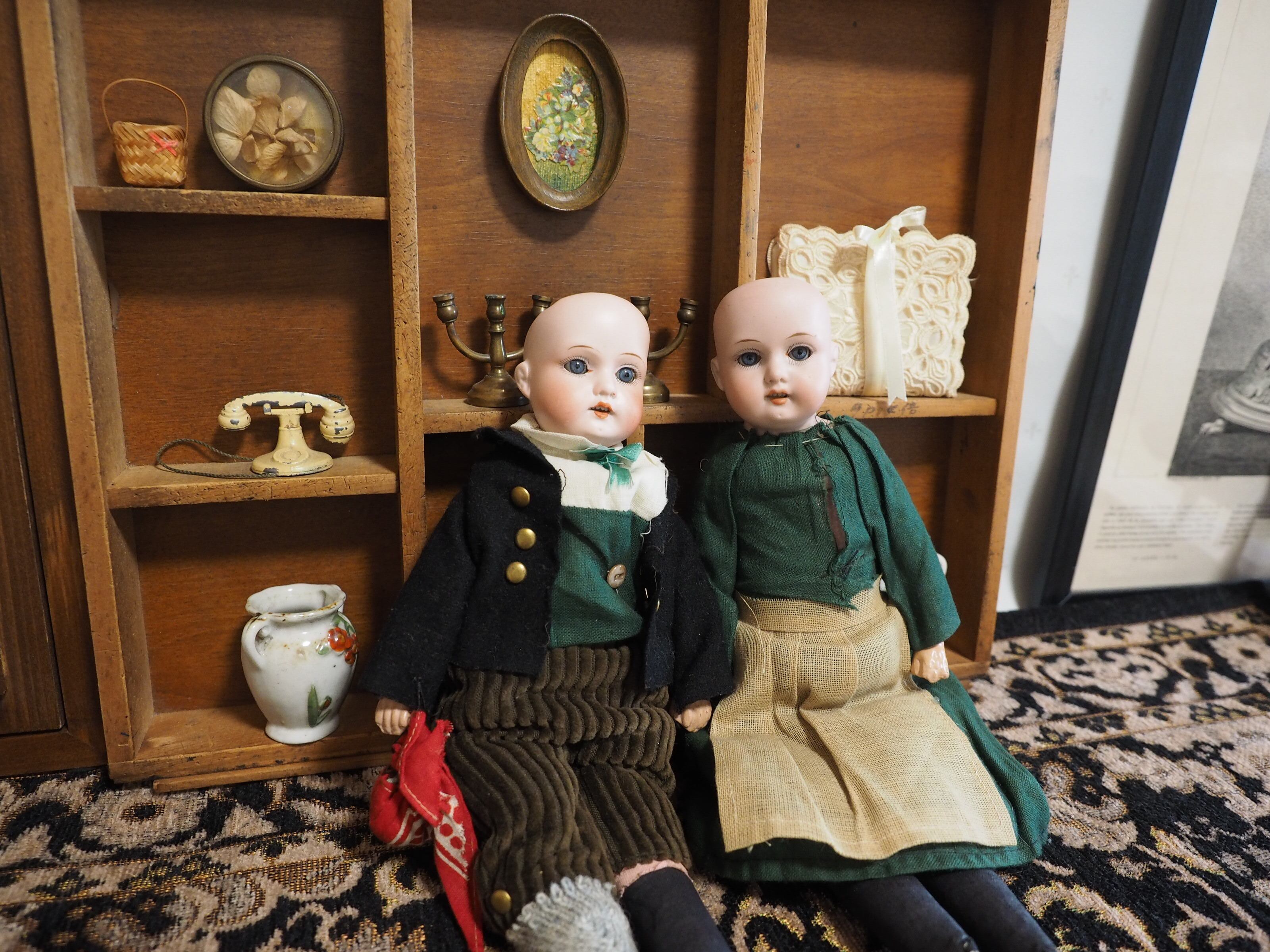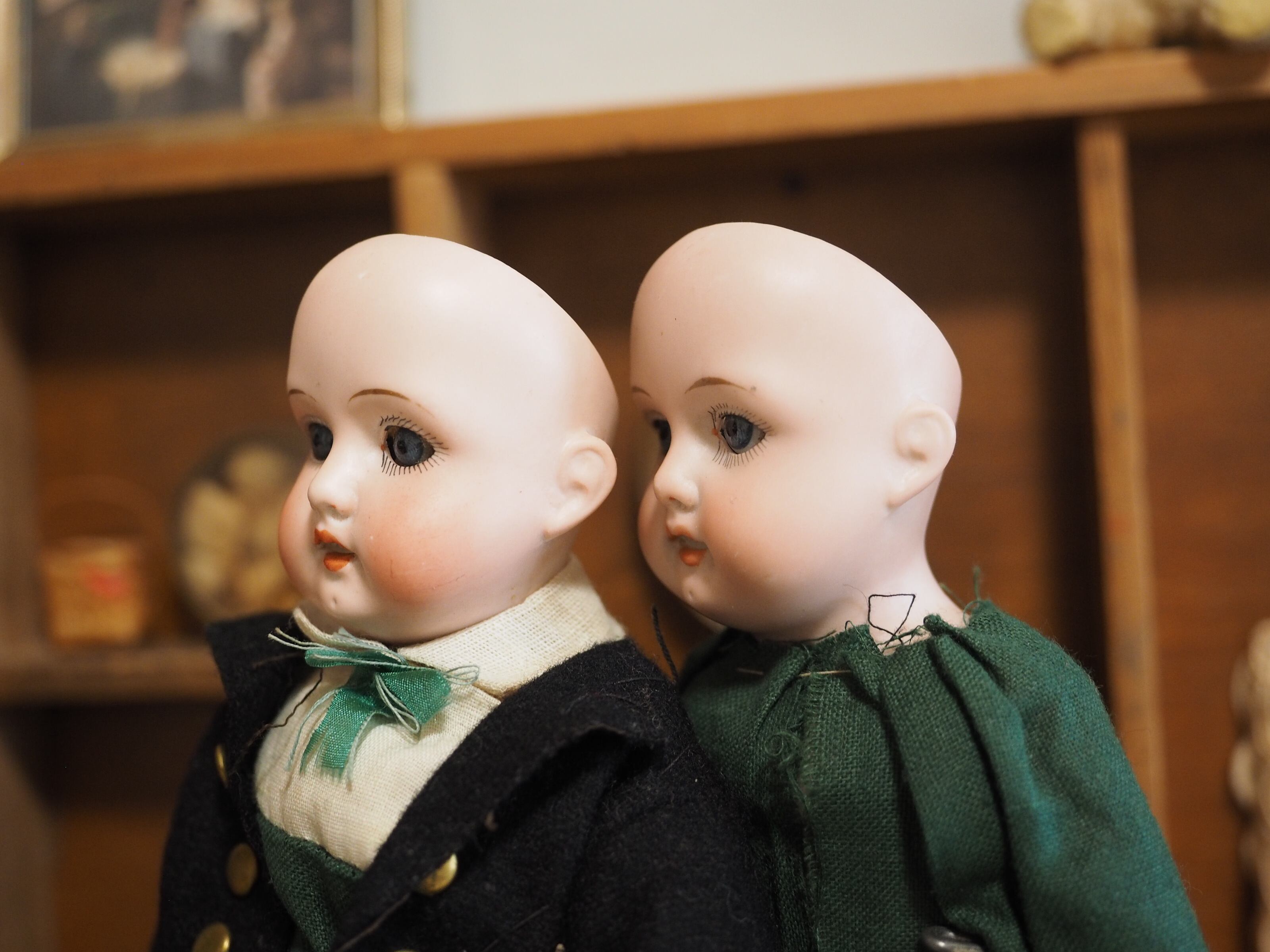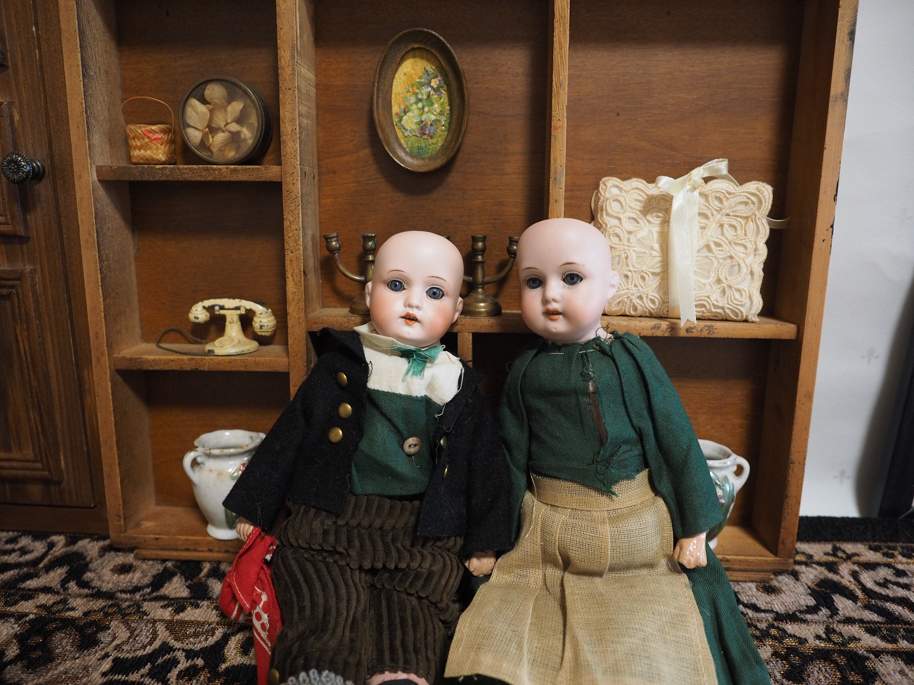 ビスクとグラスアイの美しさ、親しみある装いがなんともかわいらしいペアドールです。
