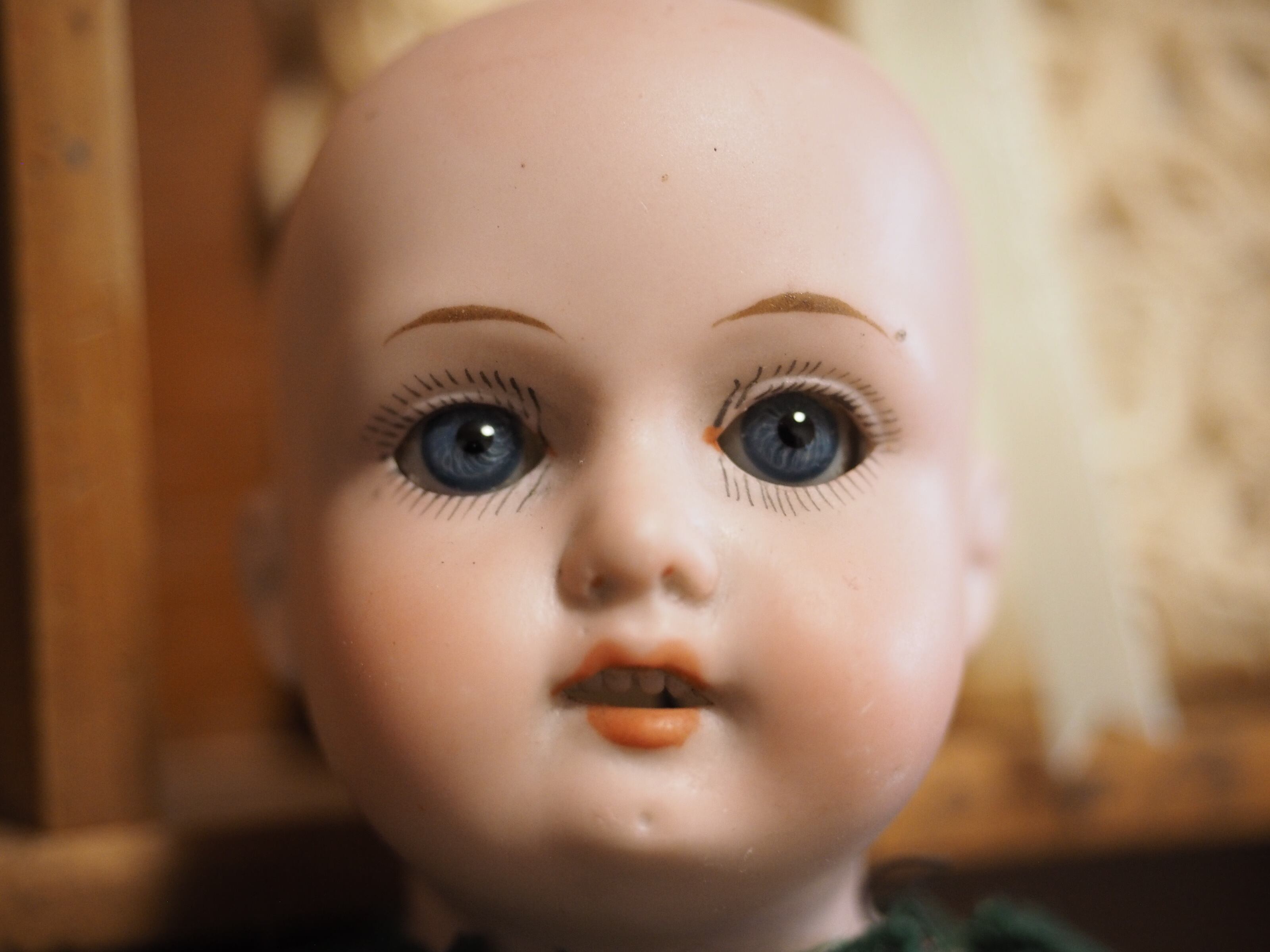 美しい青い瞳、上品な顔立ちのビスクショルダーヘッドに、腕はコンポジション、クロスボディのお人形です。