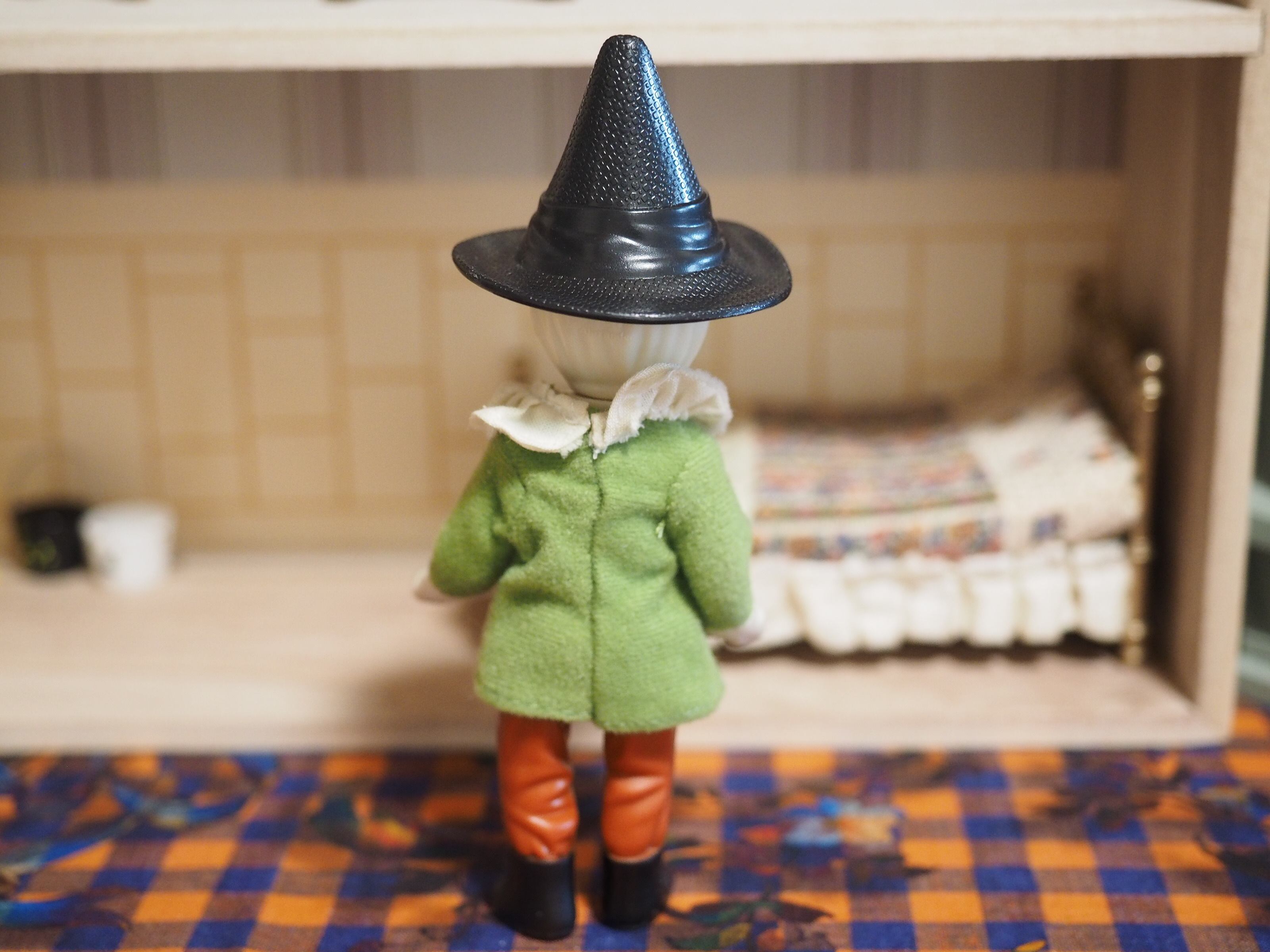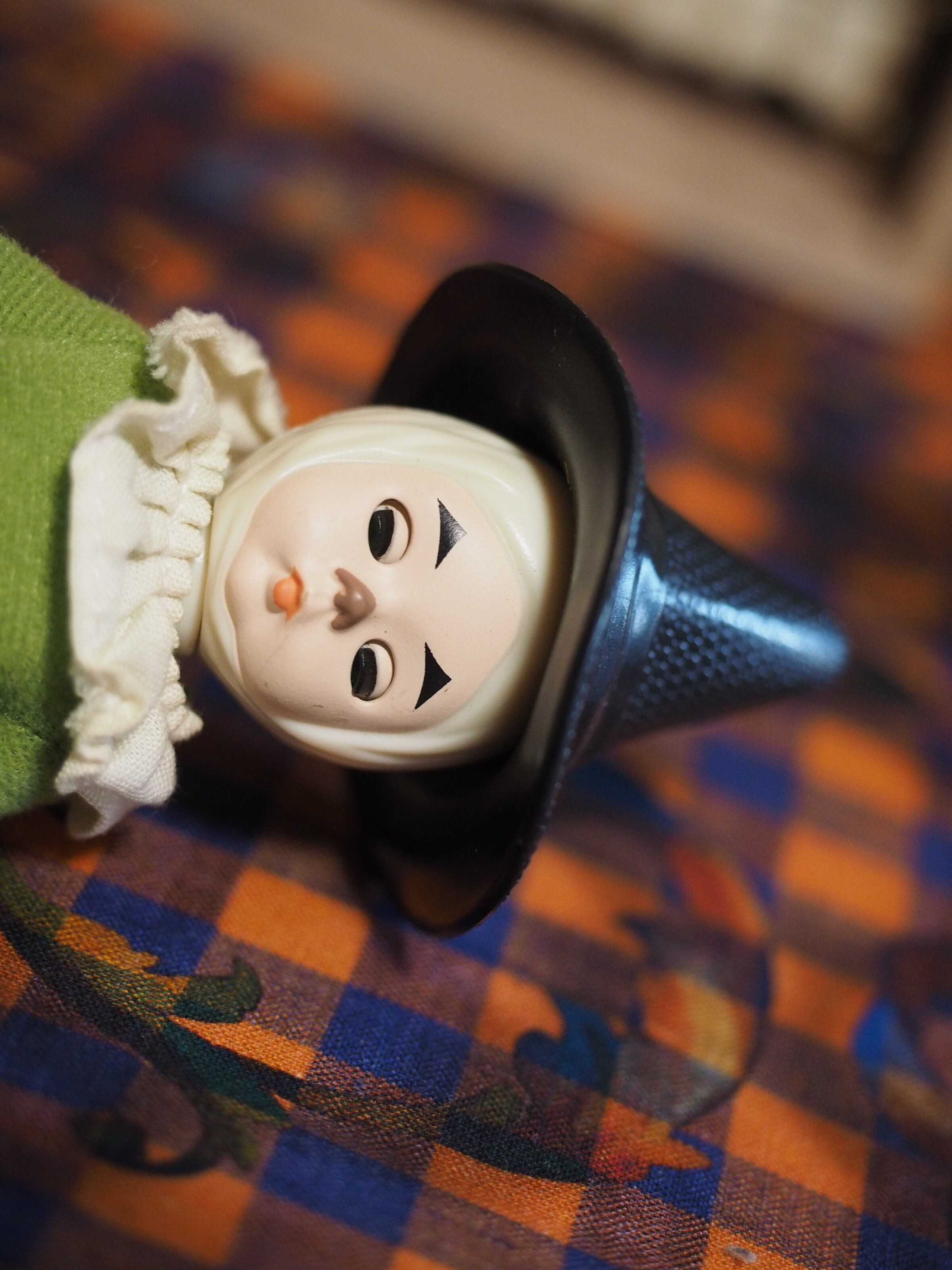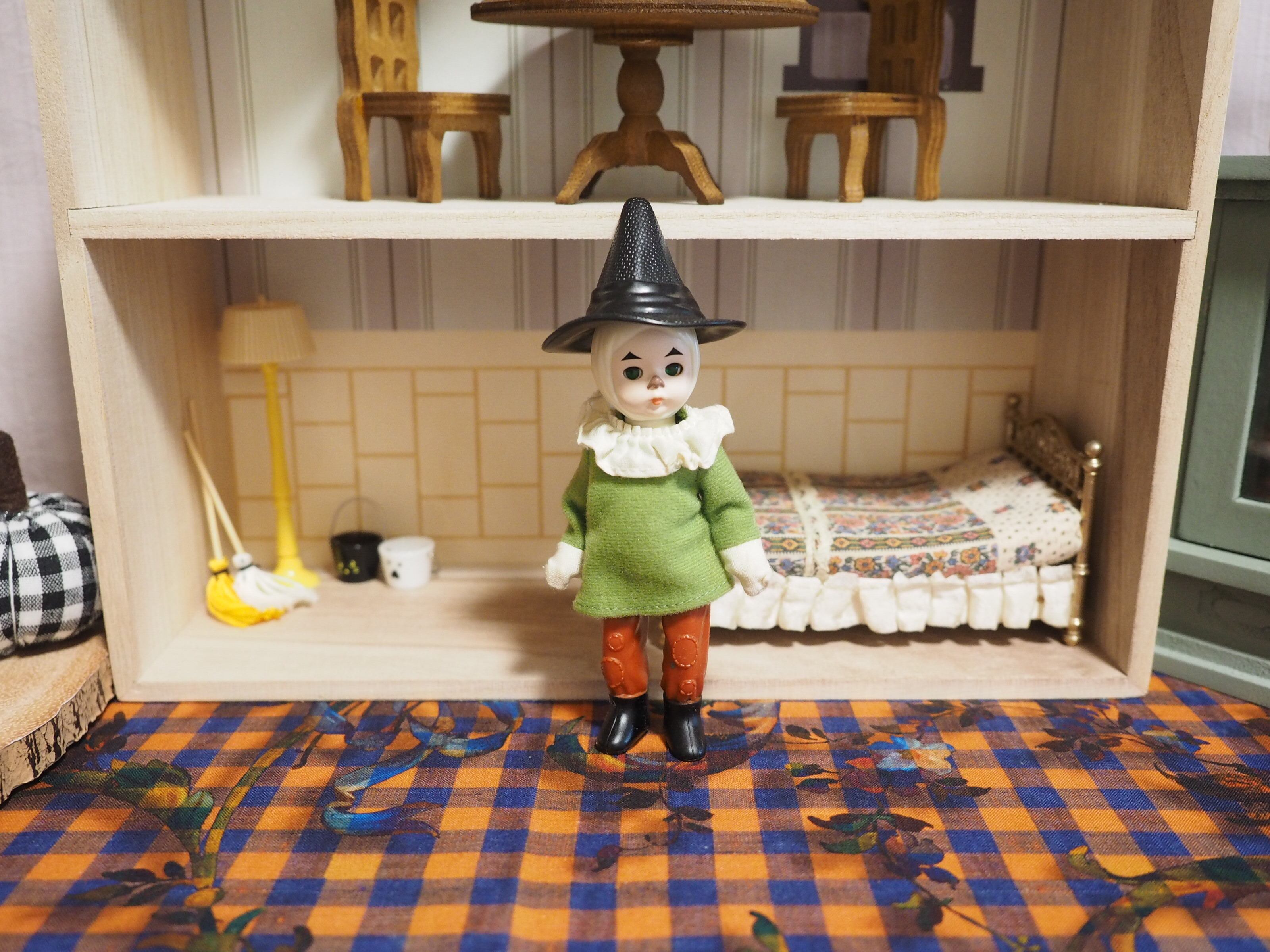 黒のとんがり帽子にギャザーの入った襟付きのお洋服、手の先が布袋のようになっているところもチャーミング。