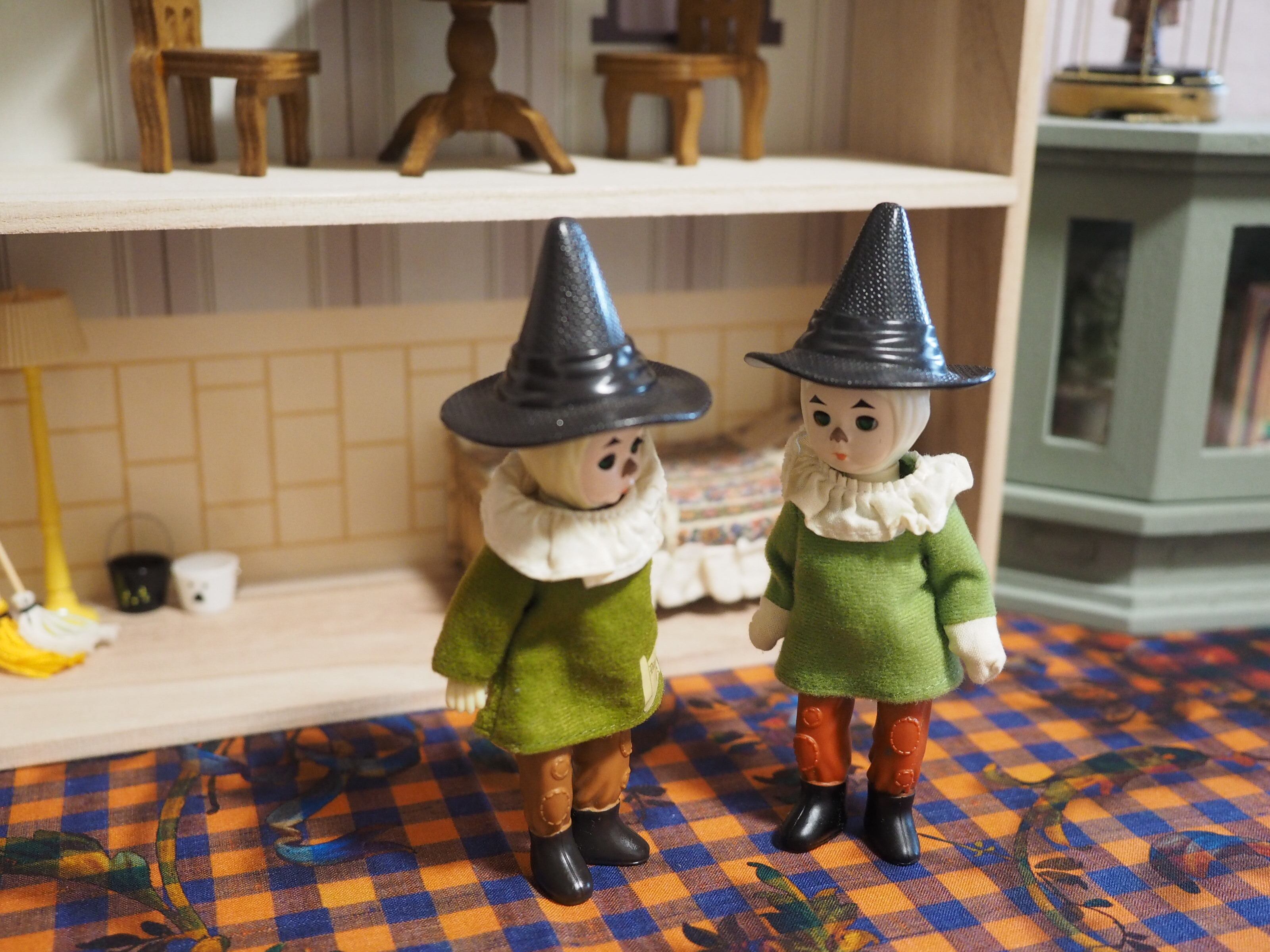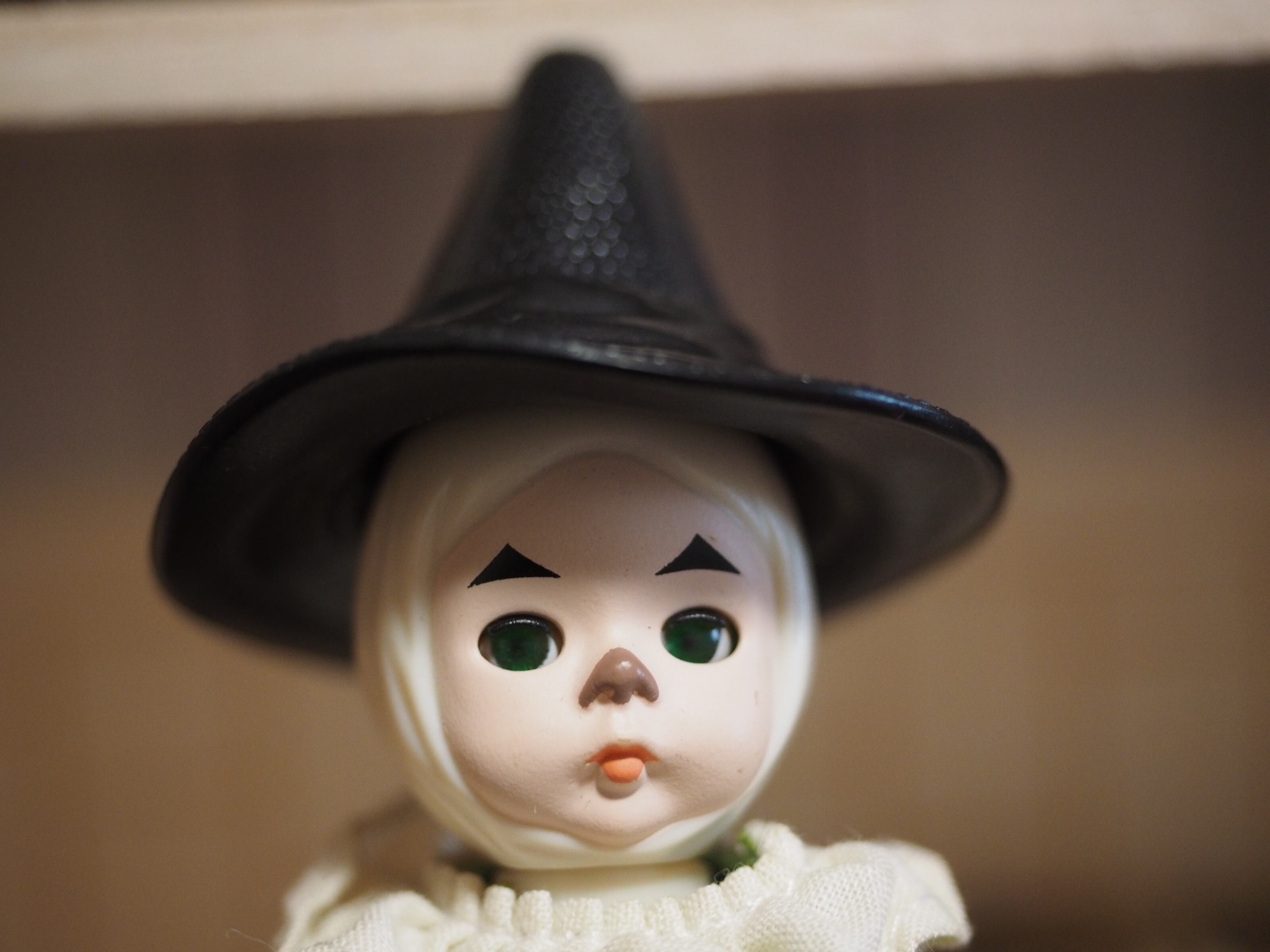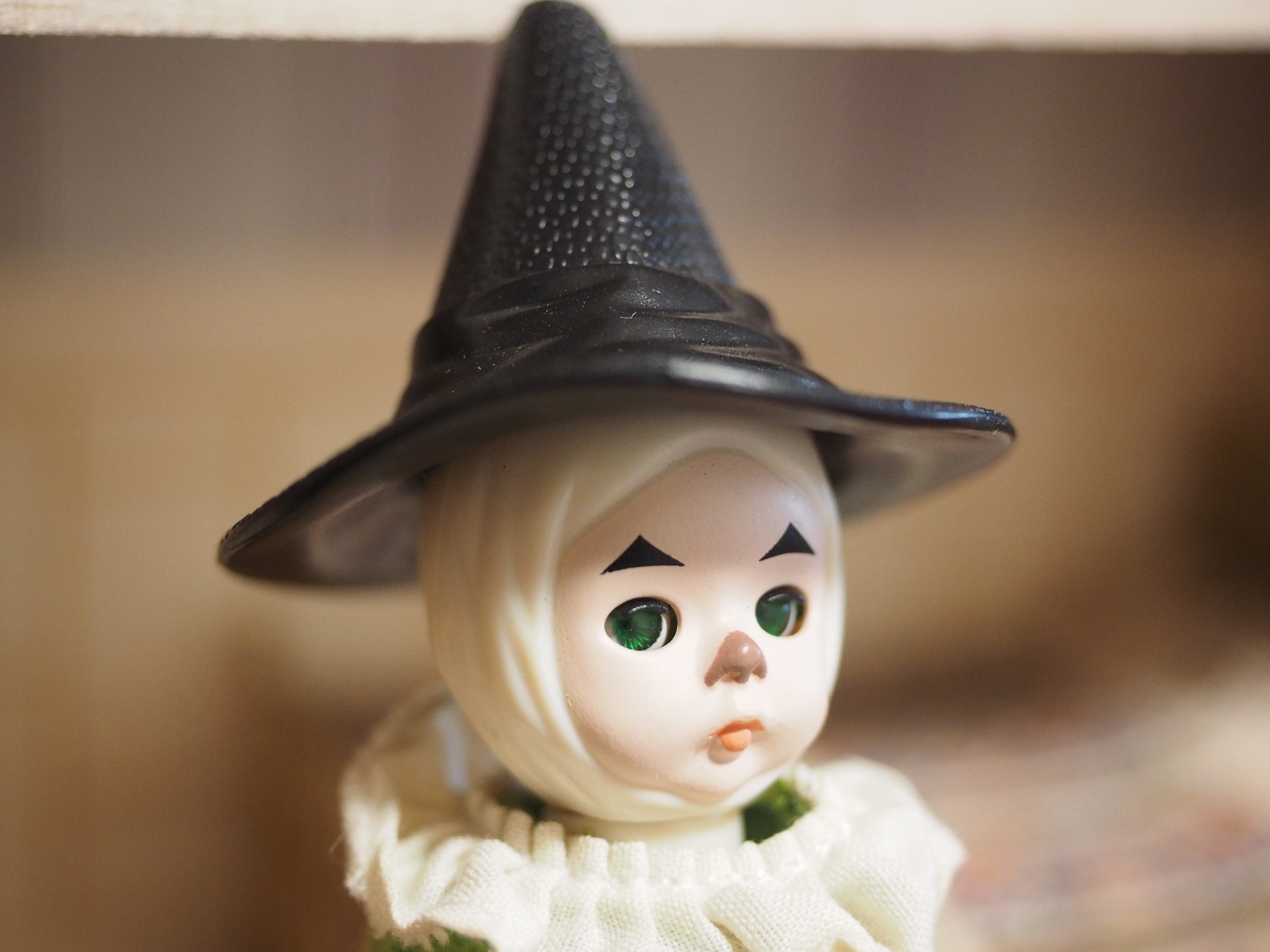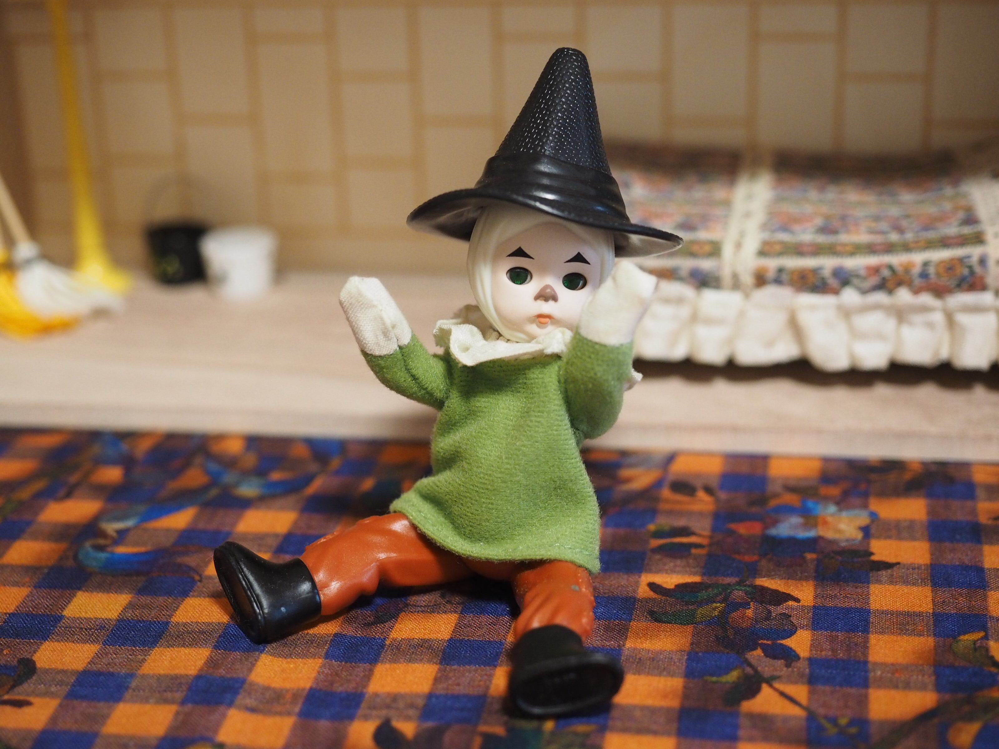 黒のとんがり帽子にギャザーの入った襟付きのお洋服、手の先が布袋のようになっているところもチャーミング。
