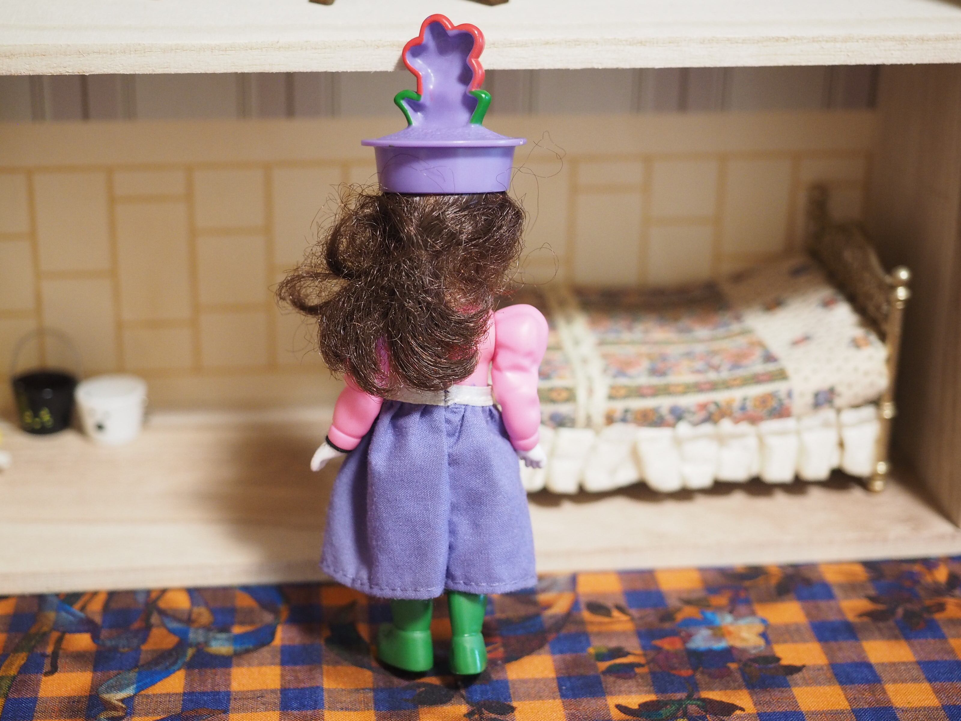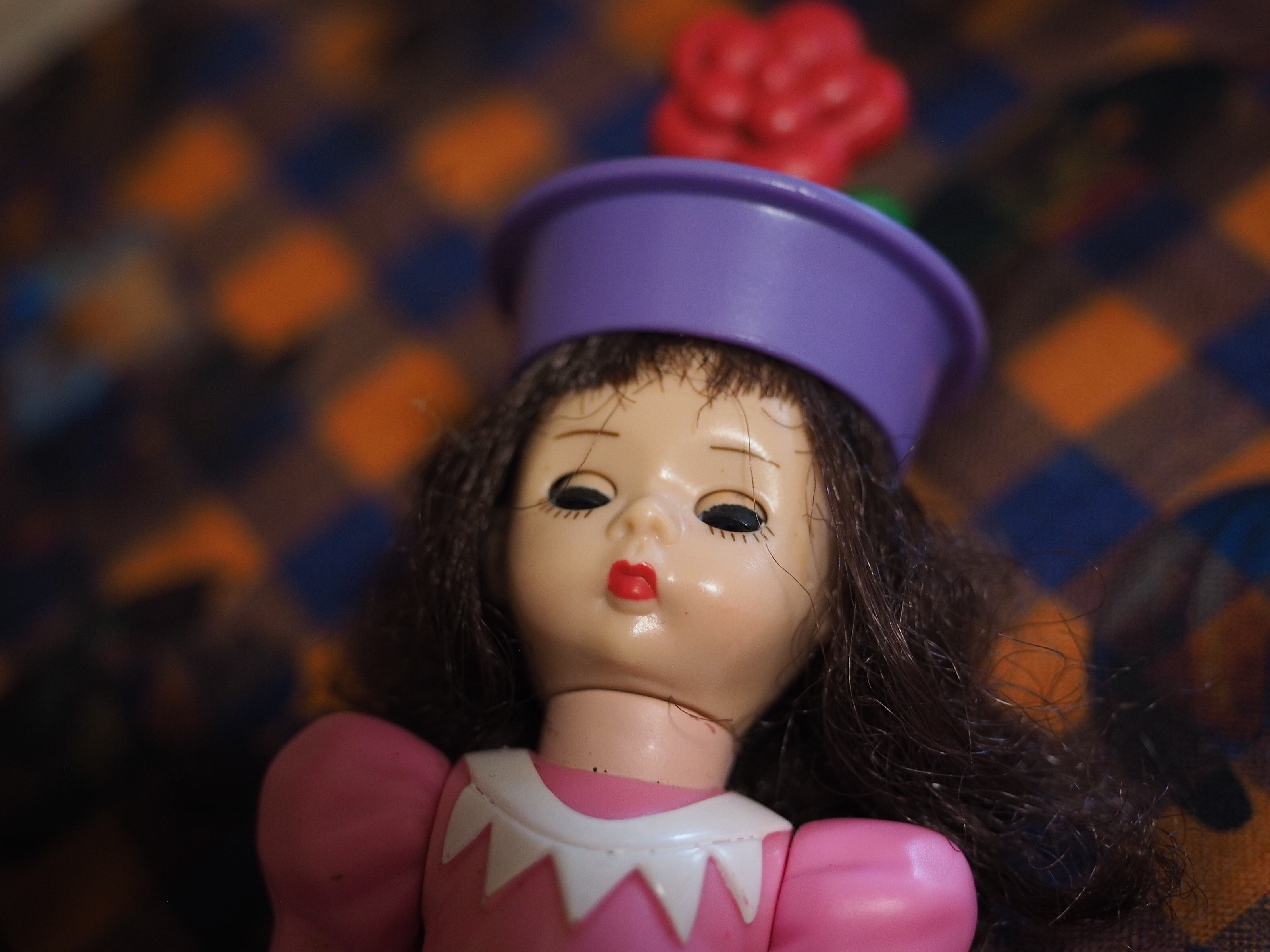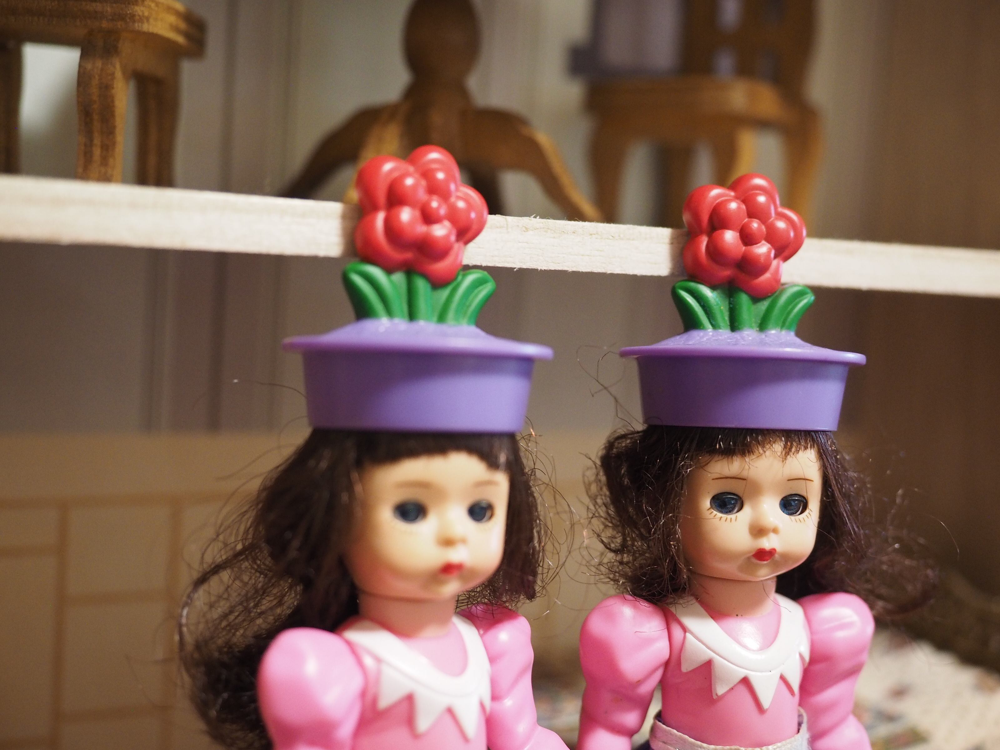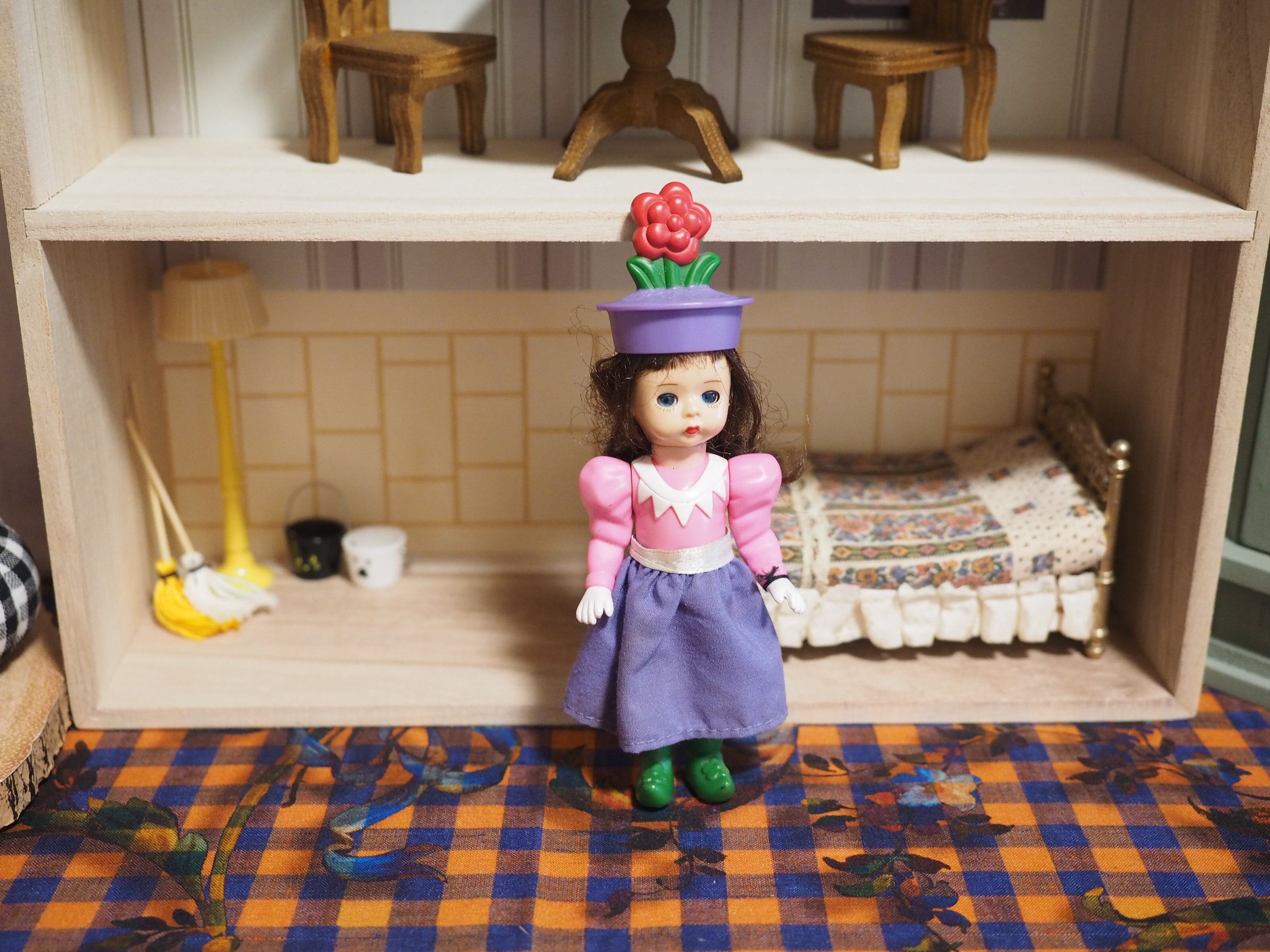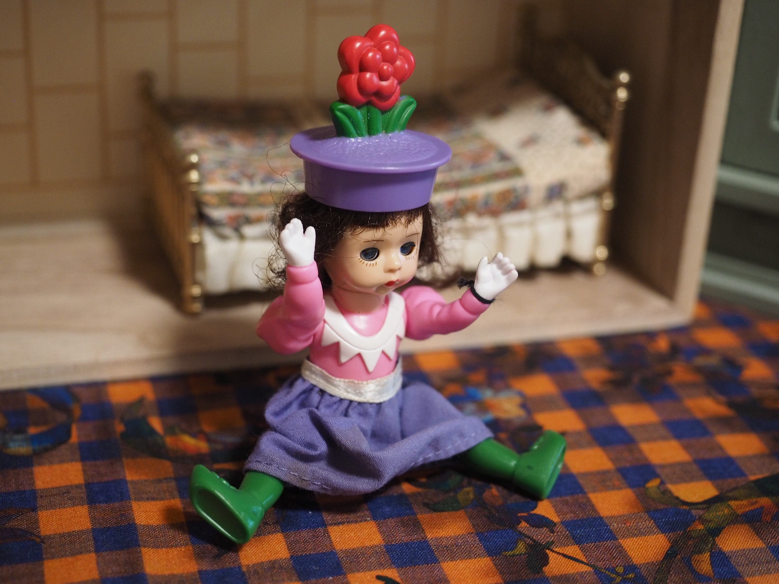 お花のついた帽子、ぱつんとした前髪がかわいい。お花の頭頂部にペイント剥がれがございます。