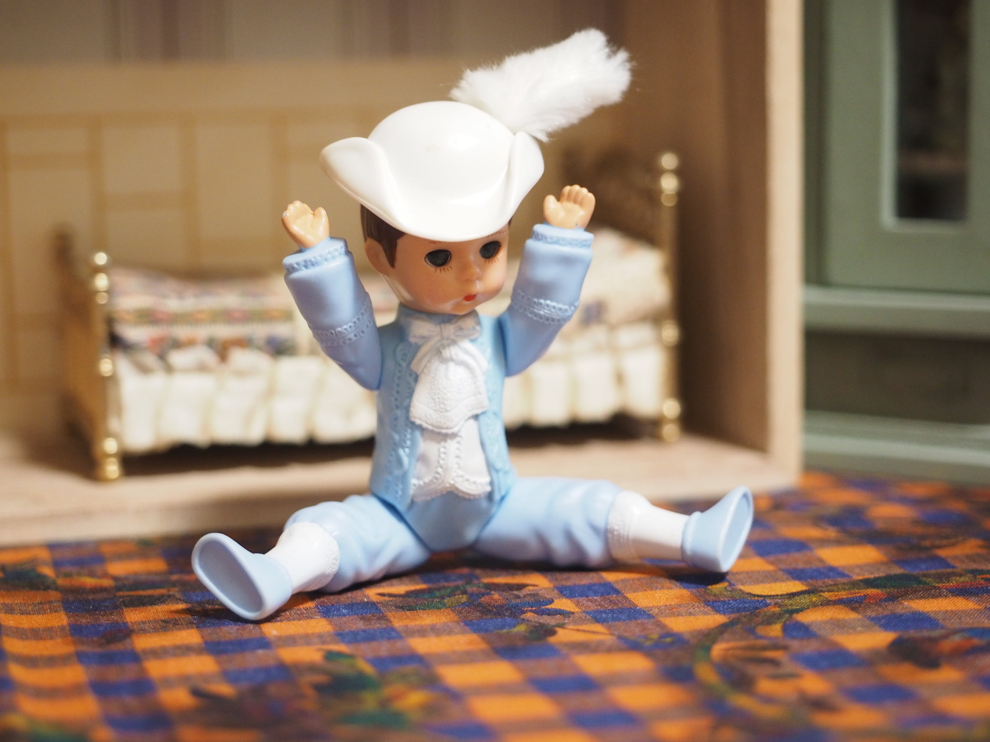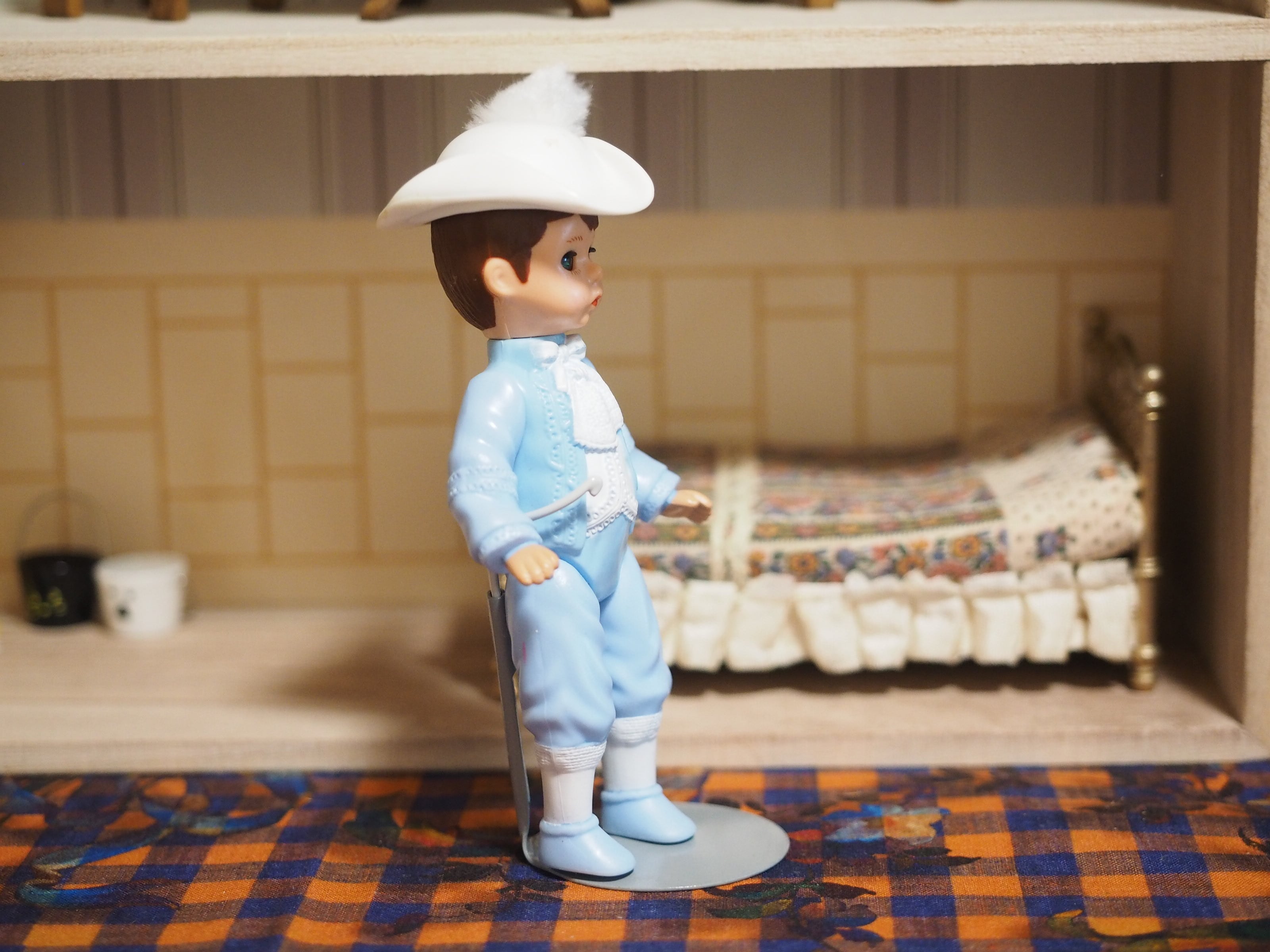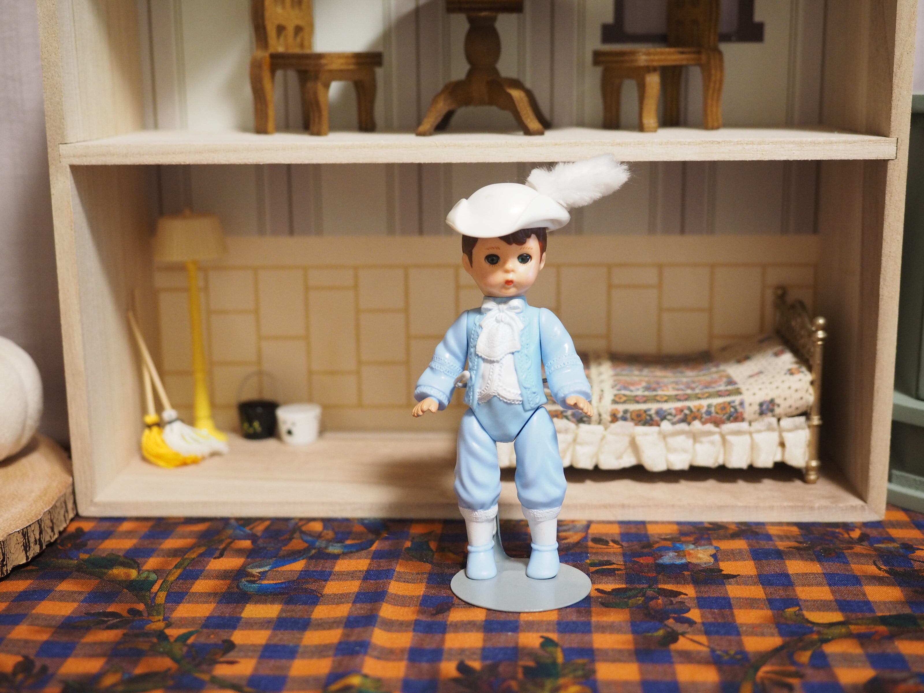爽やかなライトブルーにレースがあしらわれた王子服、白い帽子に羽飾りがポイント。袖の模様やズボンのシワも細やか!