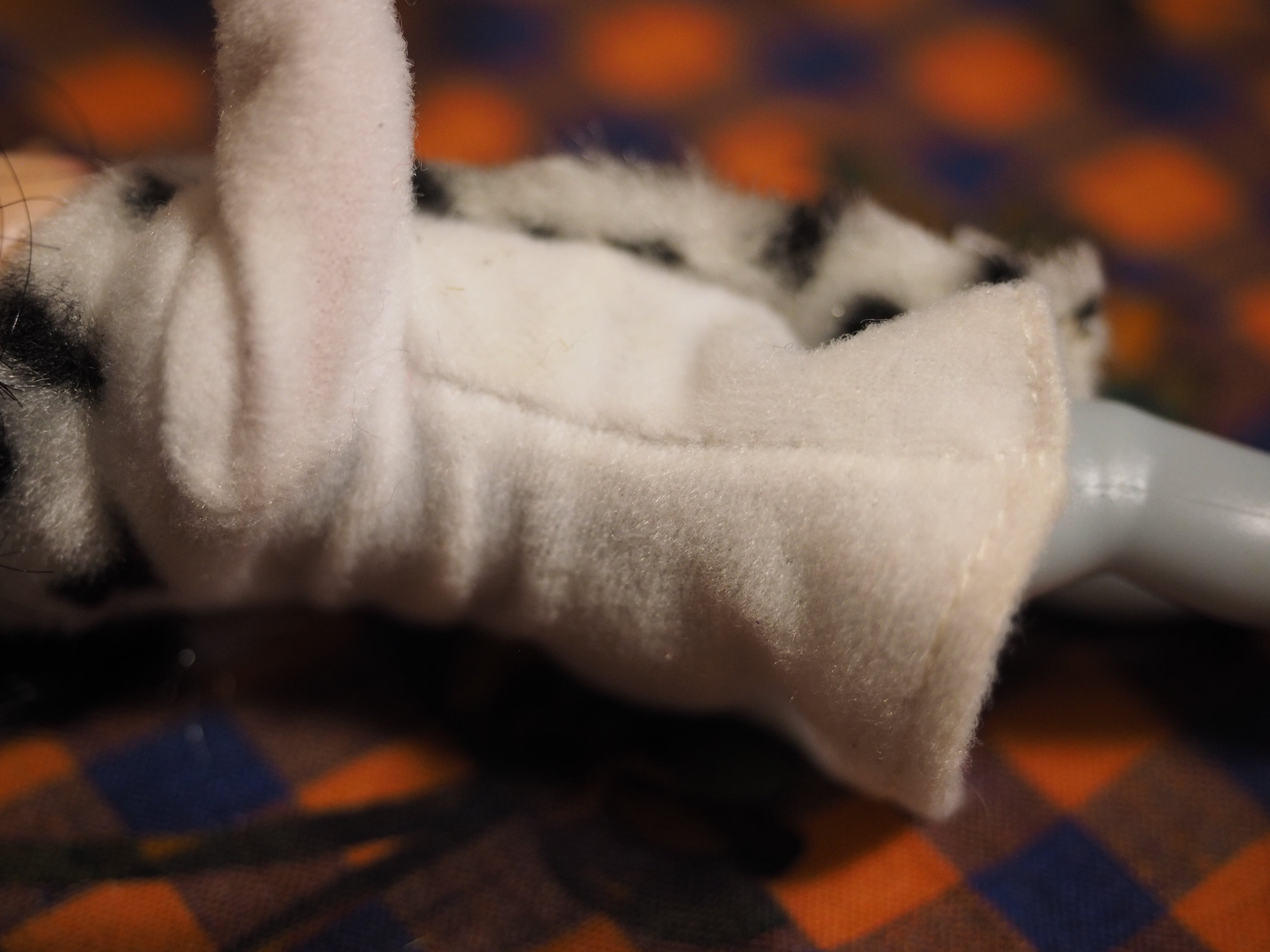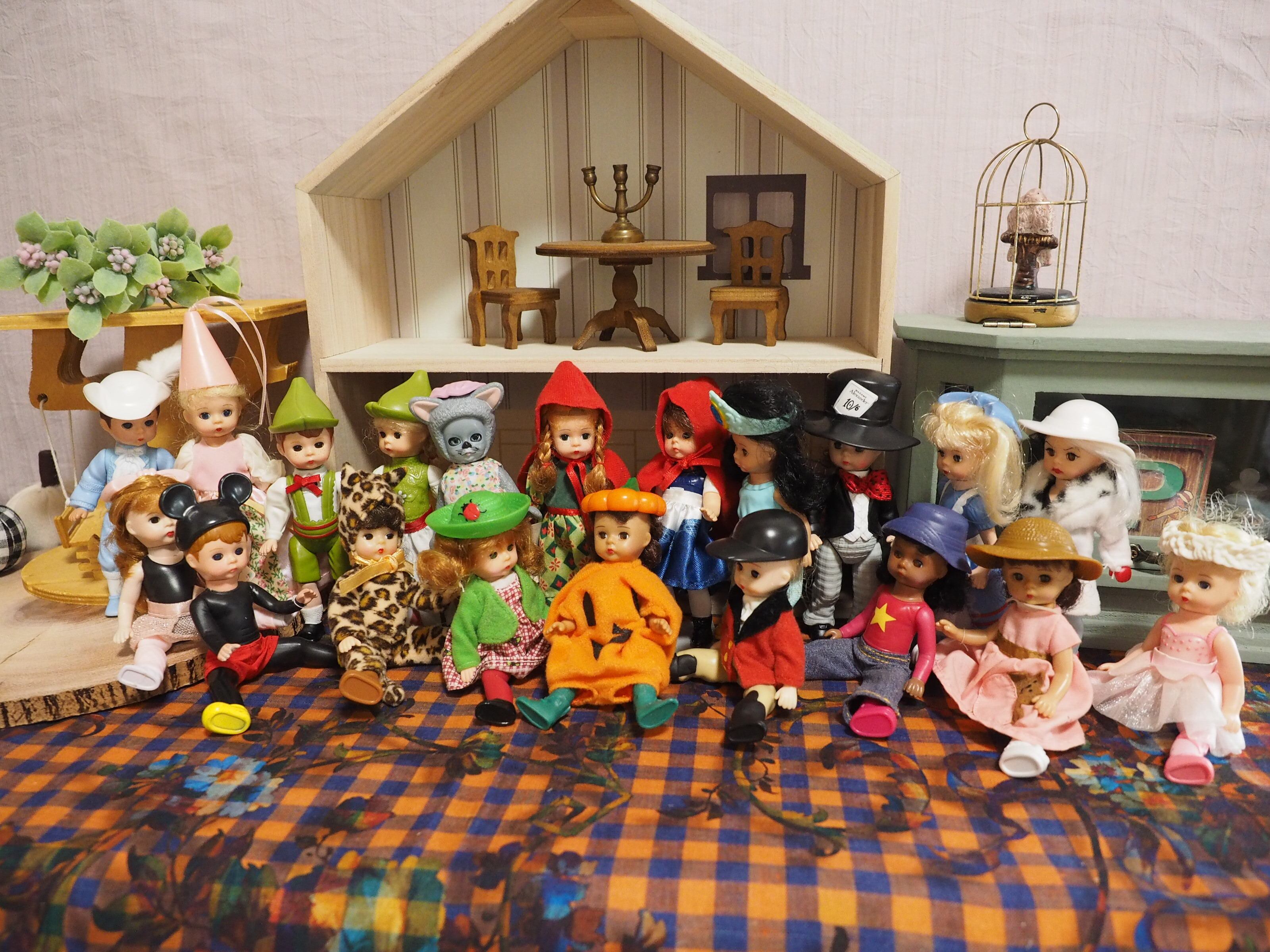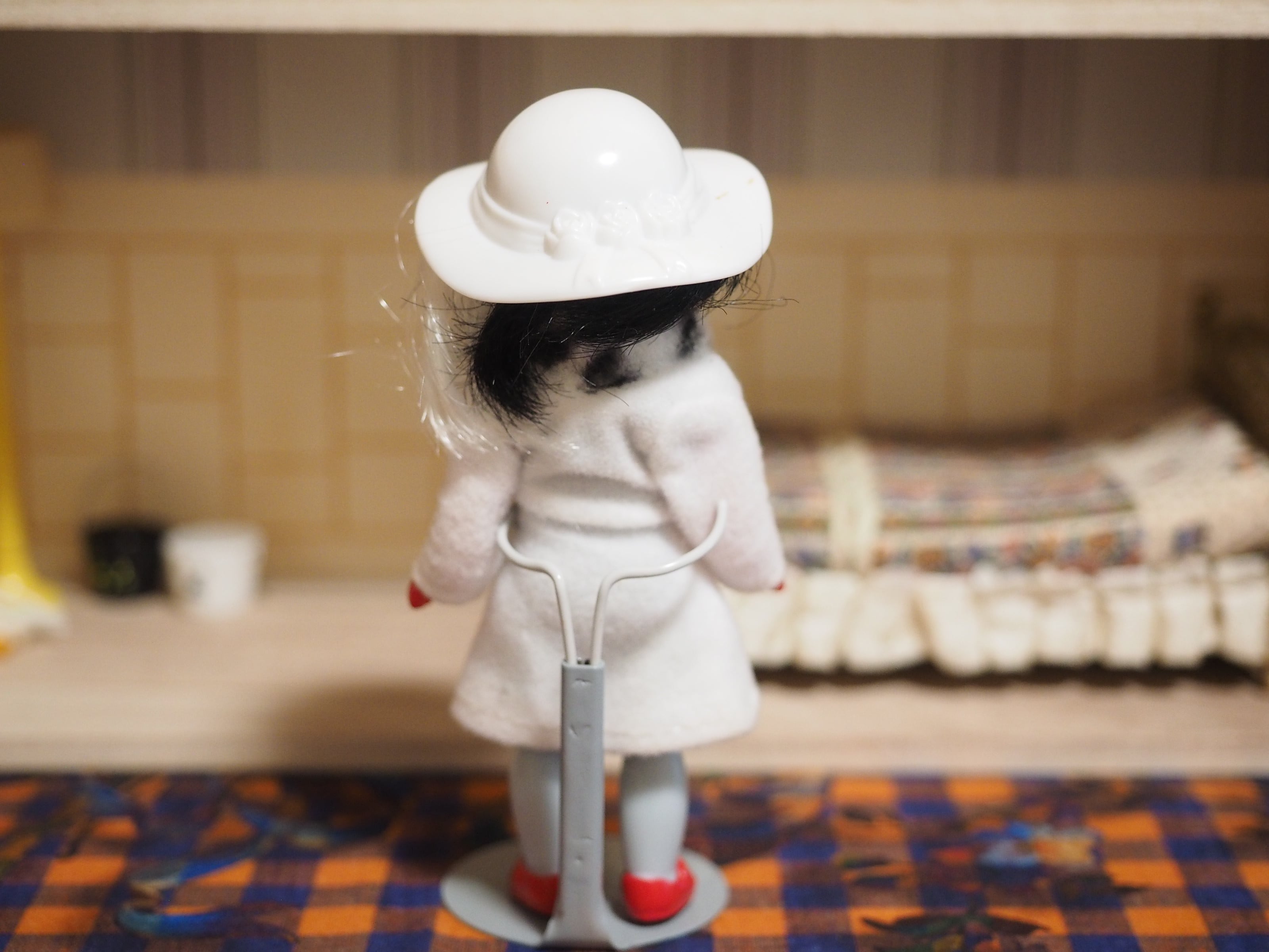 約13㎝の小さなサイズですが、ぽちっと小さな瞳が寝かせると閉じるスリープアイ仕様、首、腕付け根、脚付け根も可動します。座らせることも出来ます。(お洋服や帽子の付属品は取り外せません。)