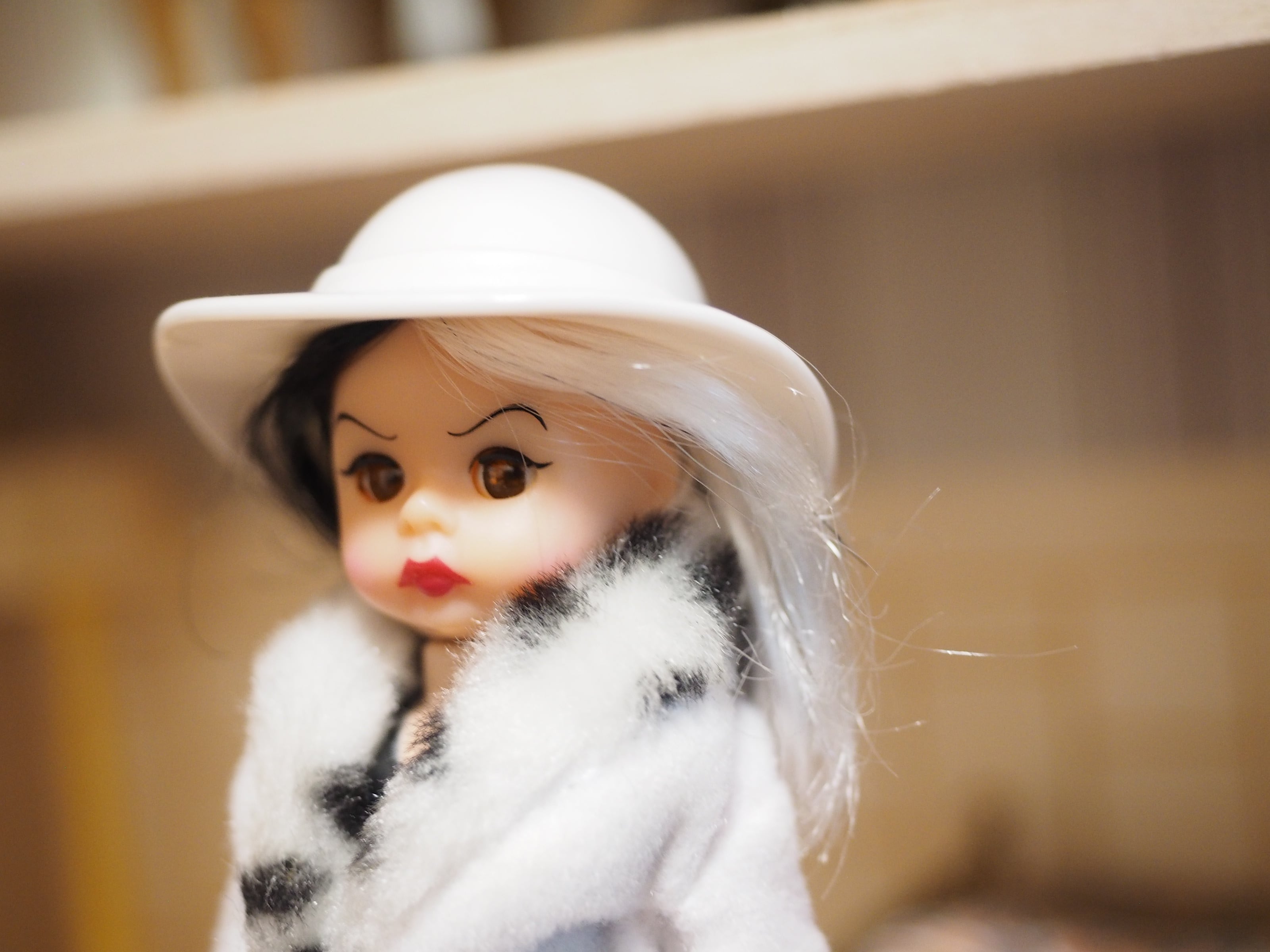 キュッと吊り上がった眉にアイライン、明るいブラウンアイが素直な表情で対比がかわいらしいクルエラです。