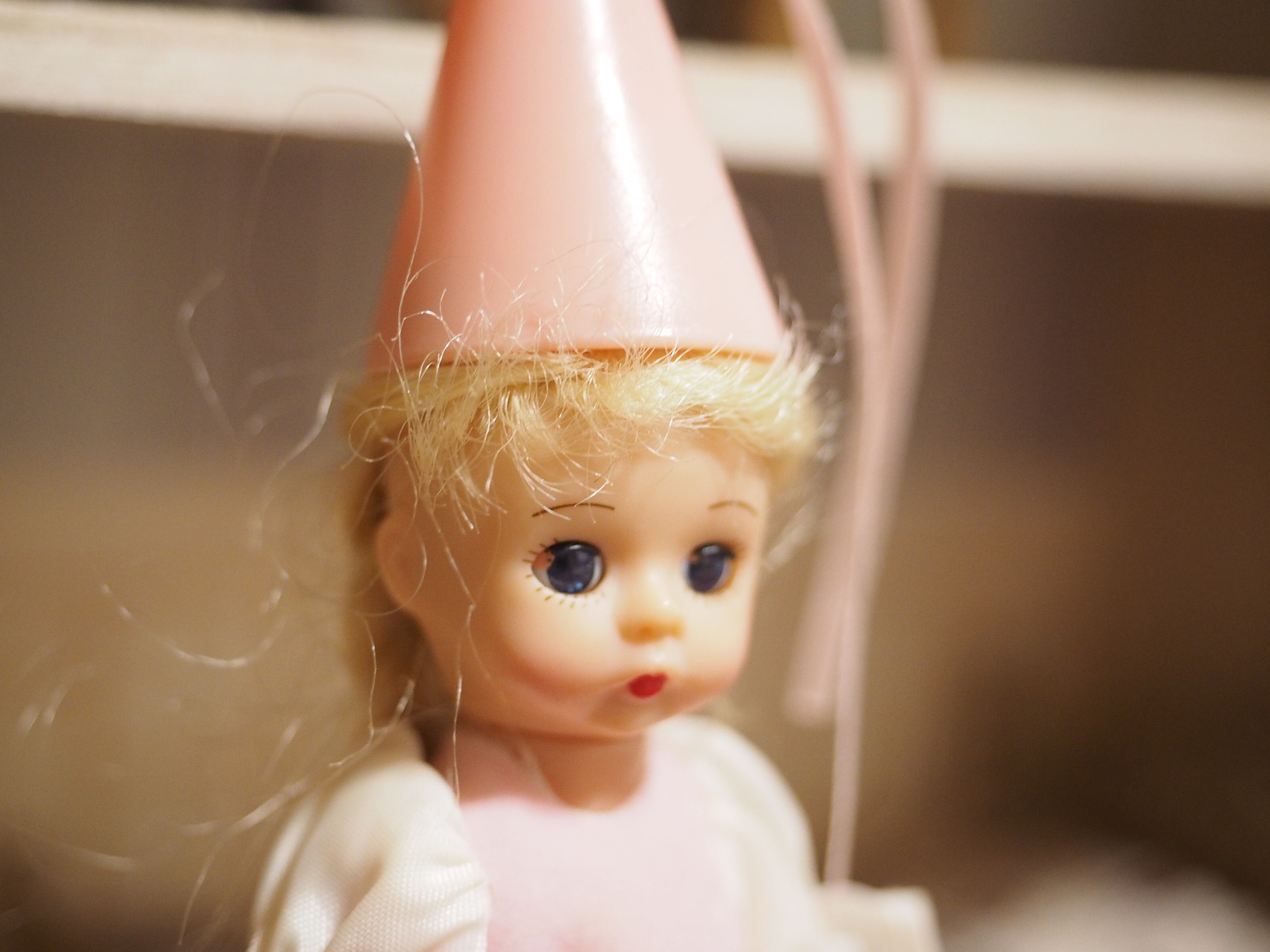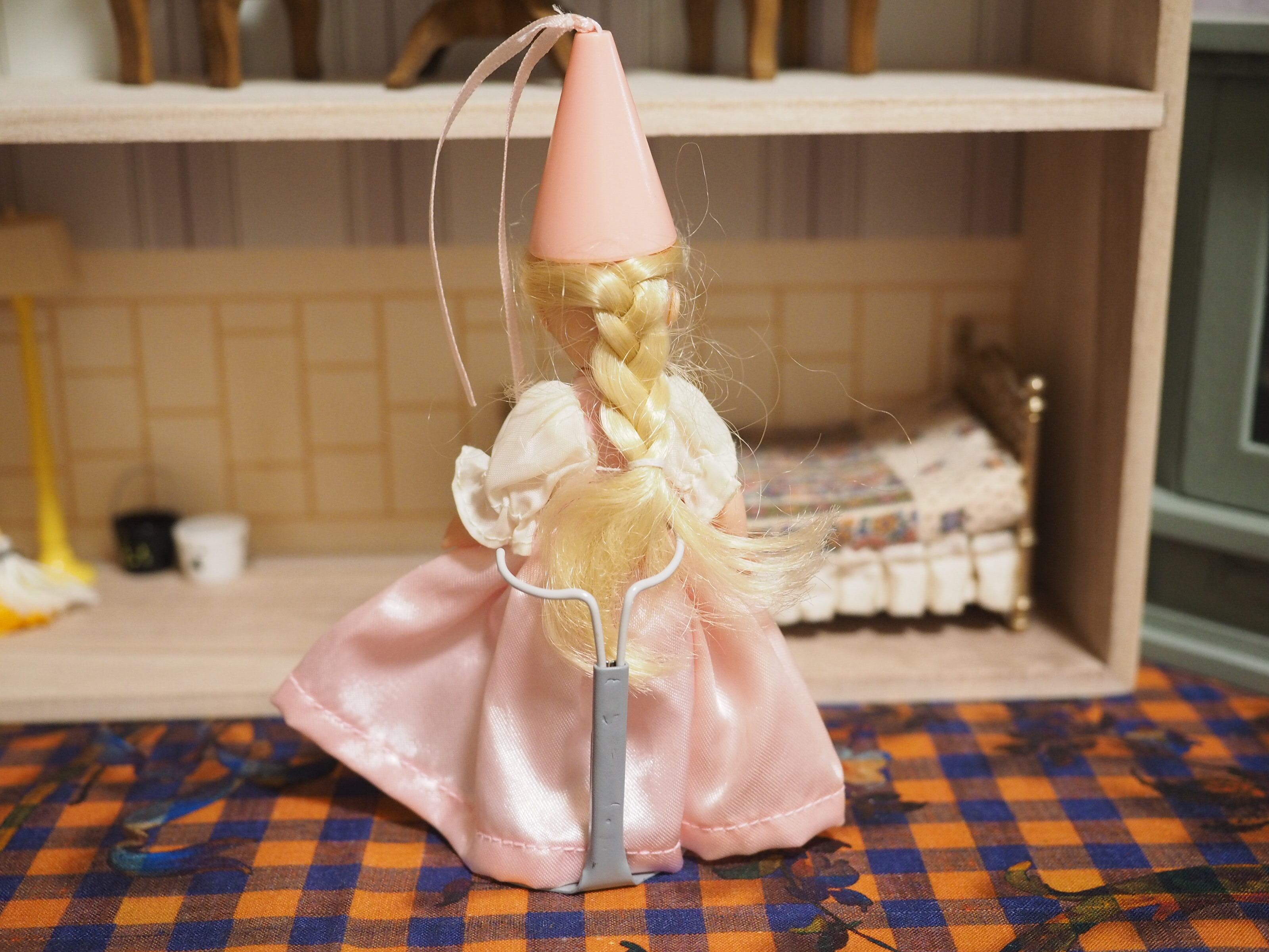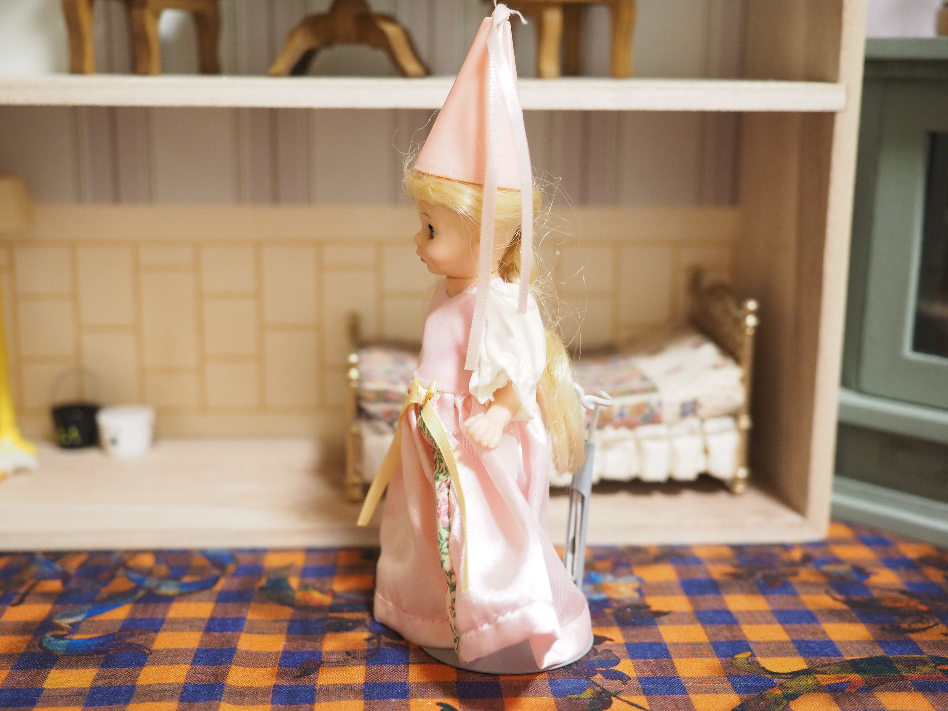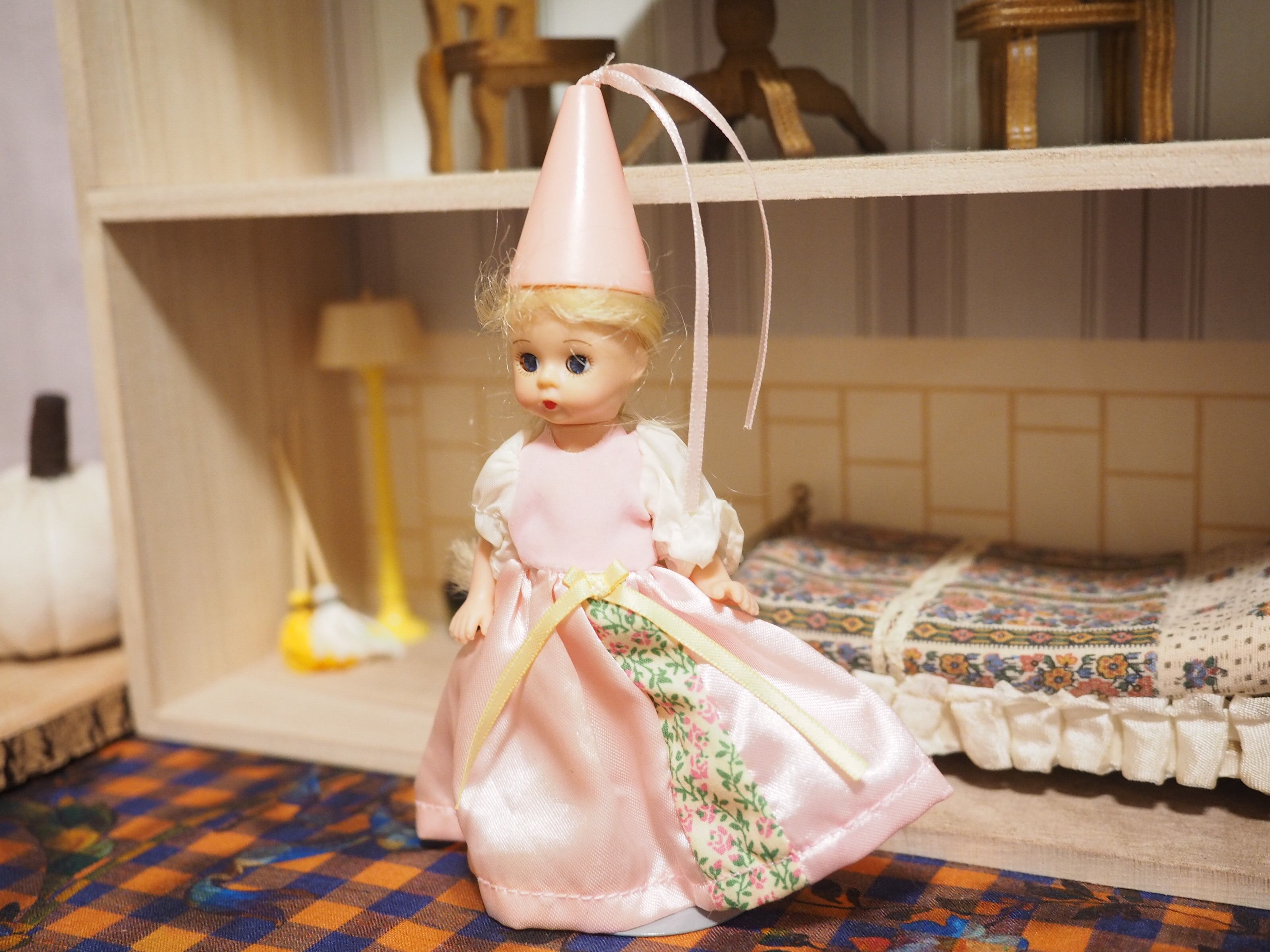 後ろに編んだ長い三つ編み、ピンクのとんがり帽子と長いリボンがかわいい。