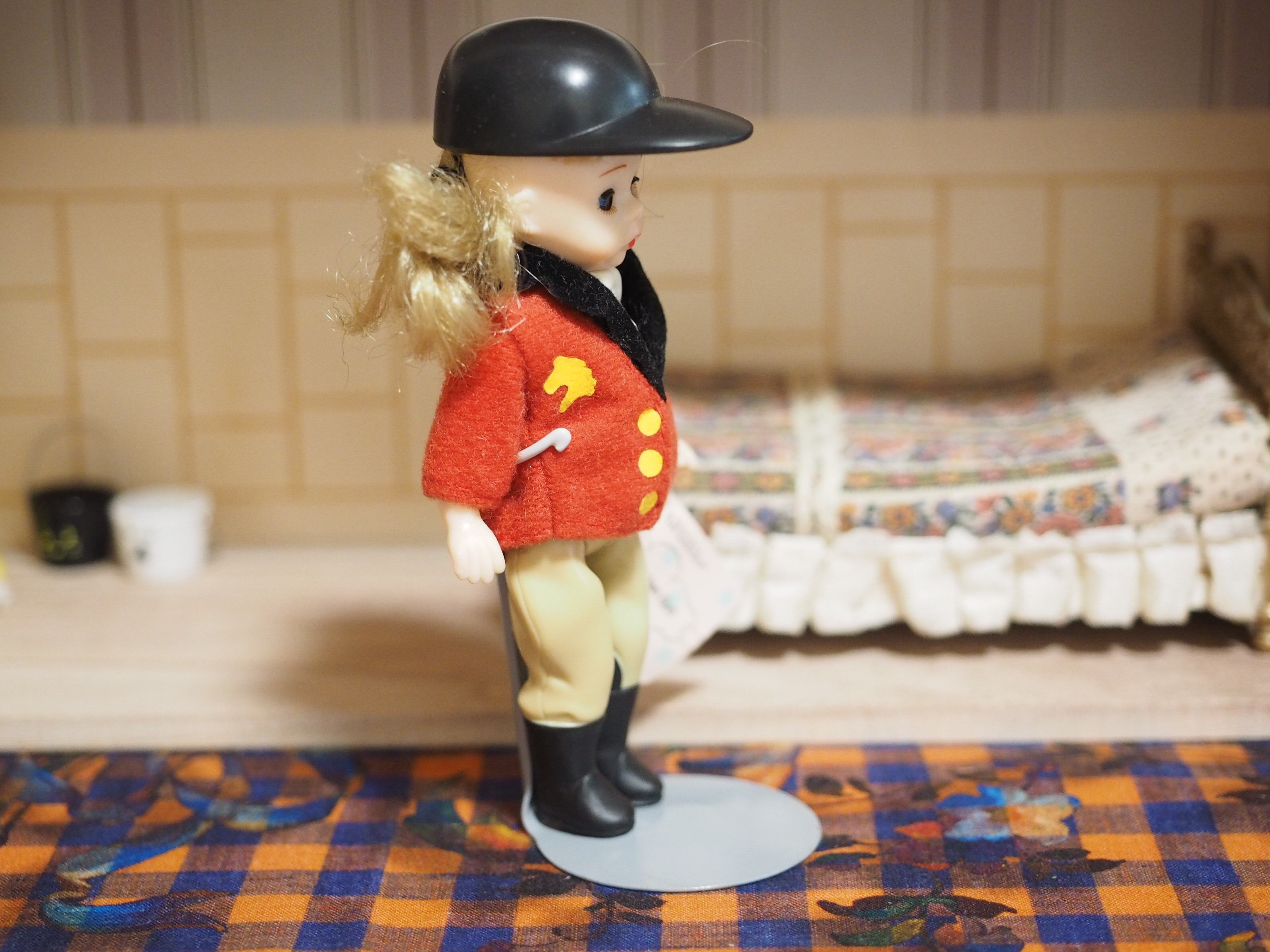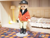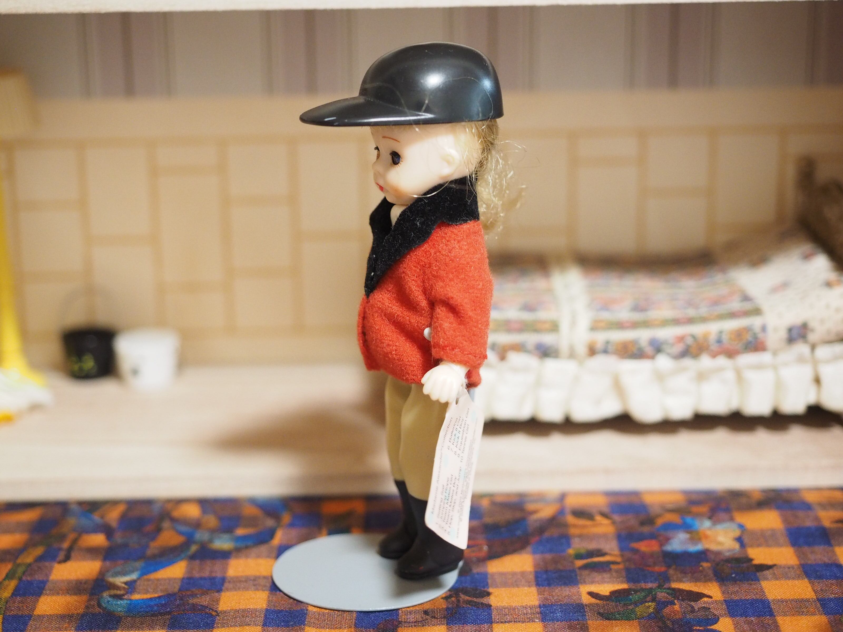 ふっくらした乗馬ズボン、乗馬帽にジョッキーブーツがおしゃれ。ブーツに小さな赤い色移り、帽子に薄く擦れ、白い線の色移りがございます。
