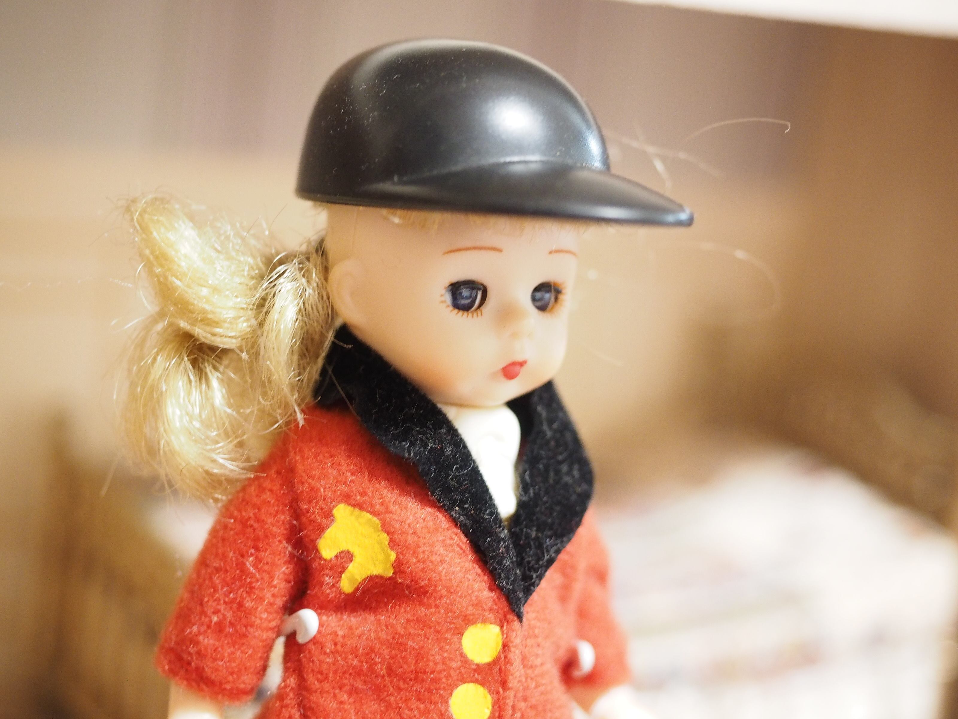 馬のマーク付きの乗馬服はベロアのような黒い襟が引き締めポイント、首元はふんわりブラウスが成型されています。