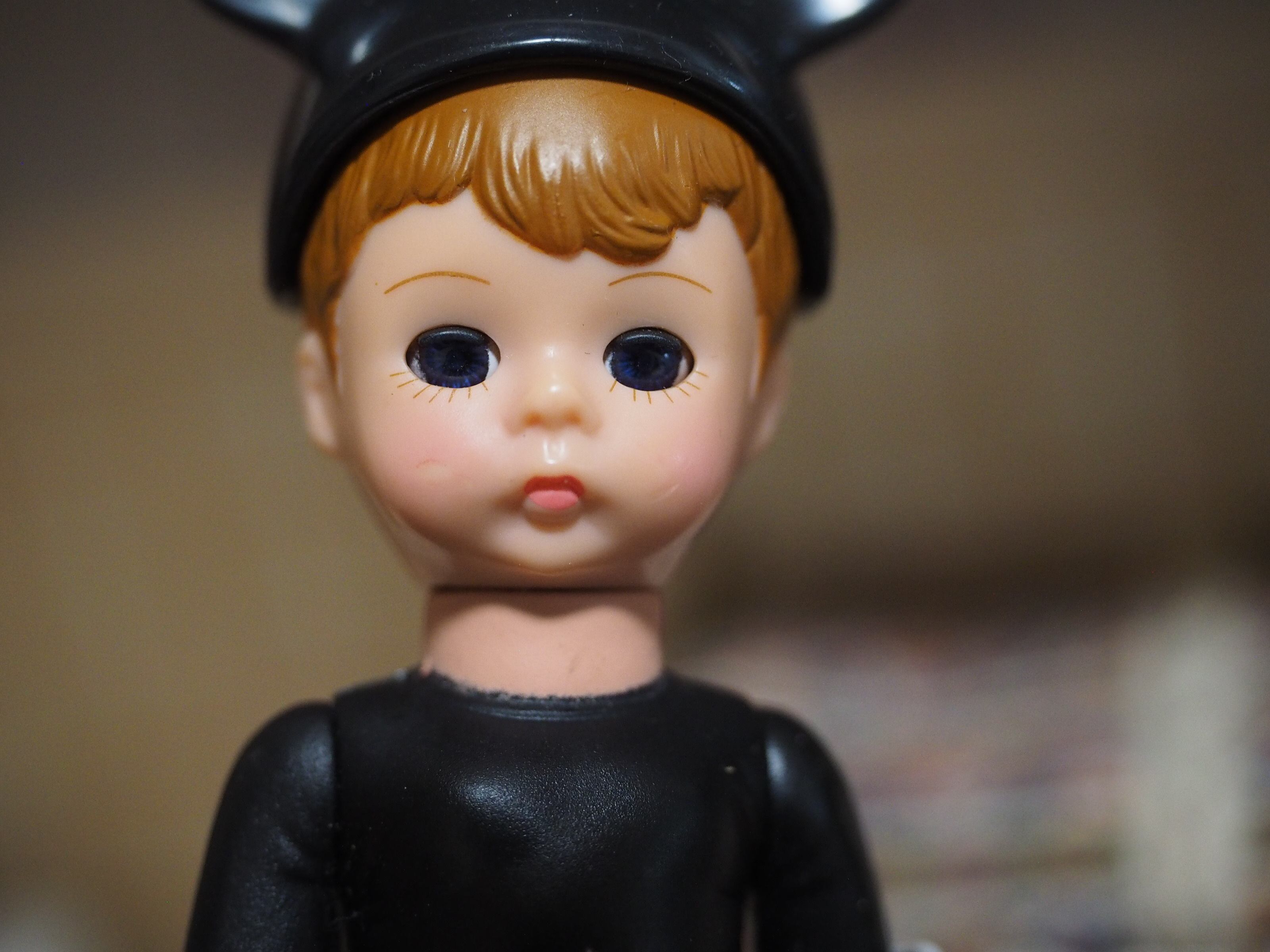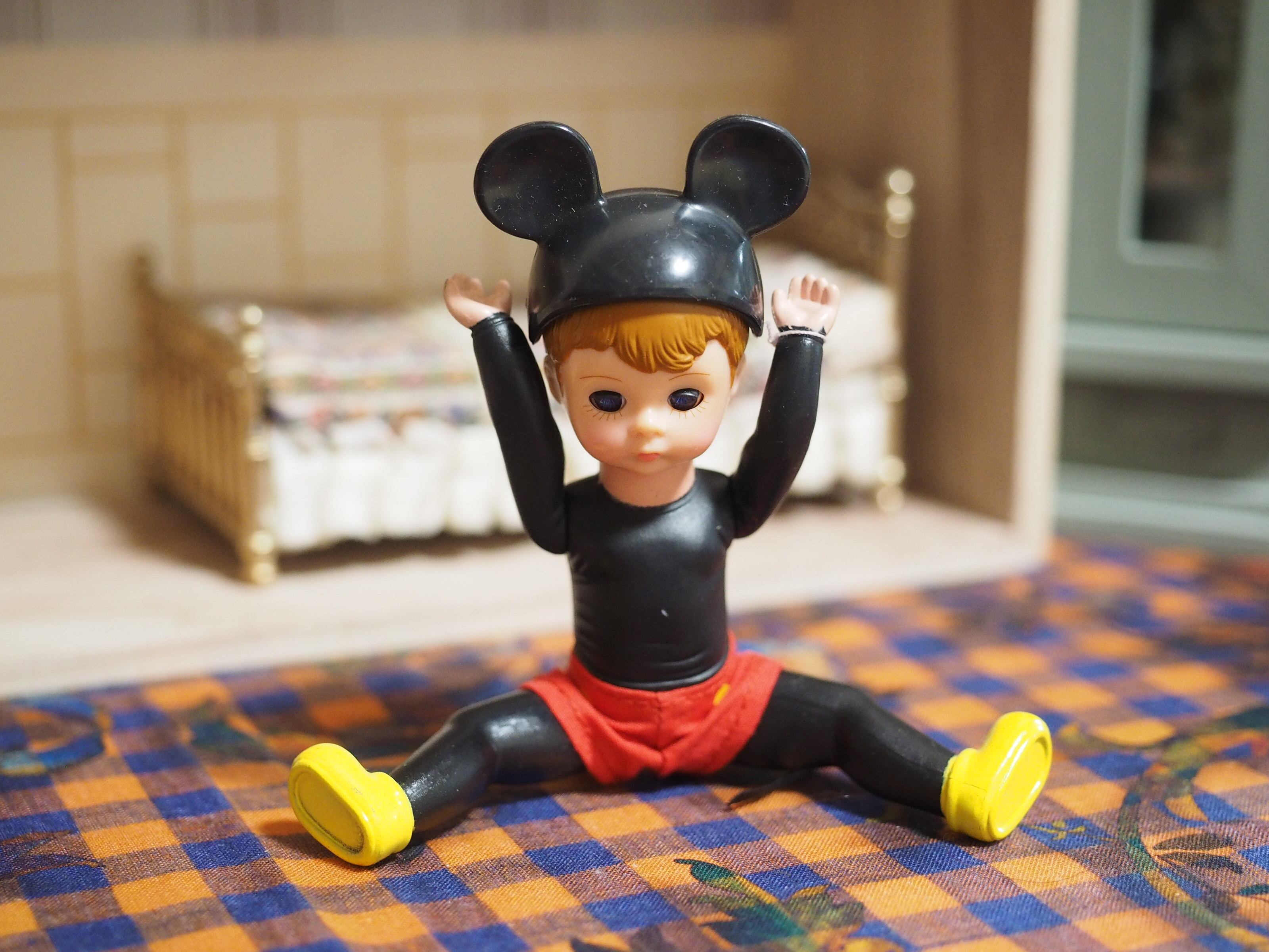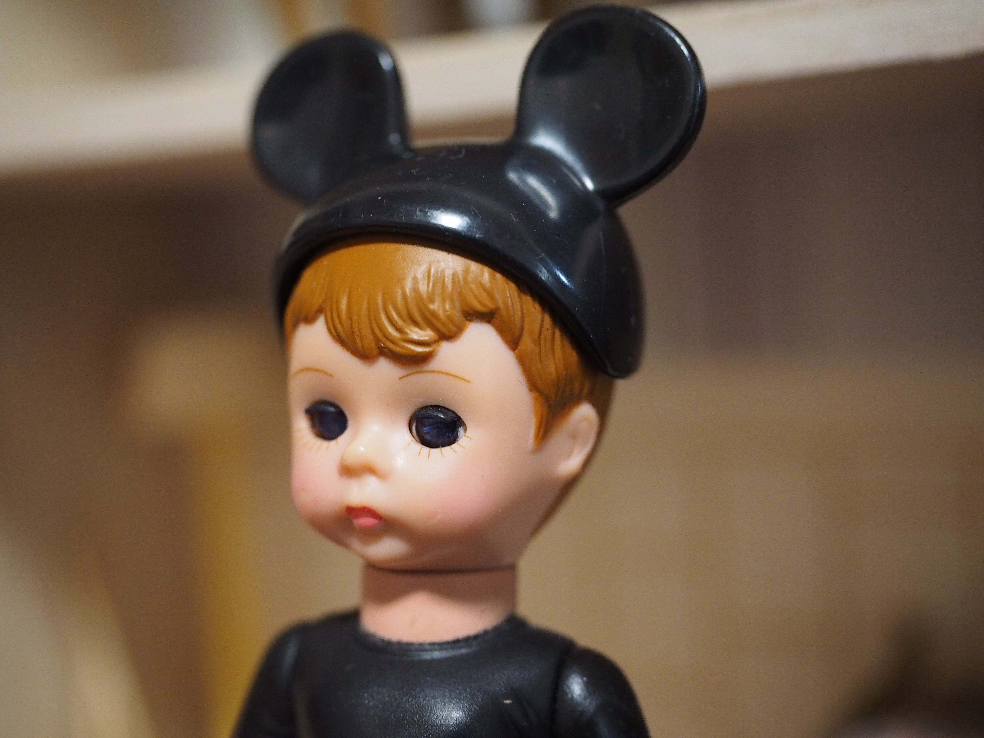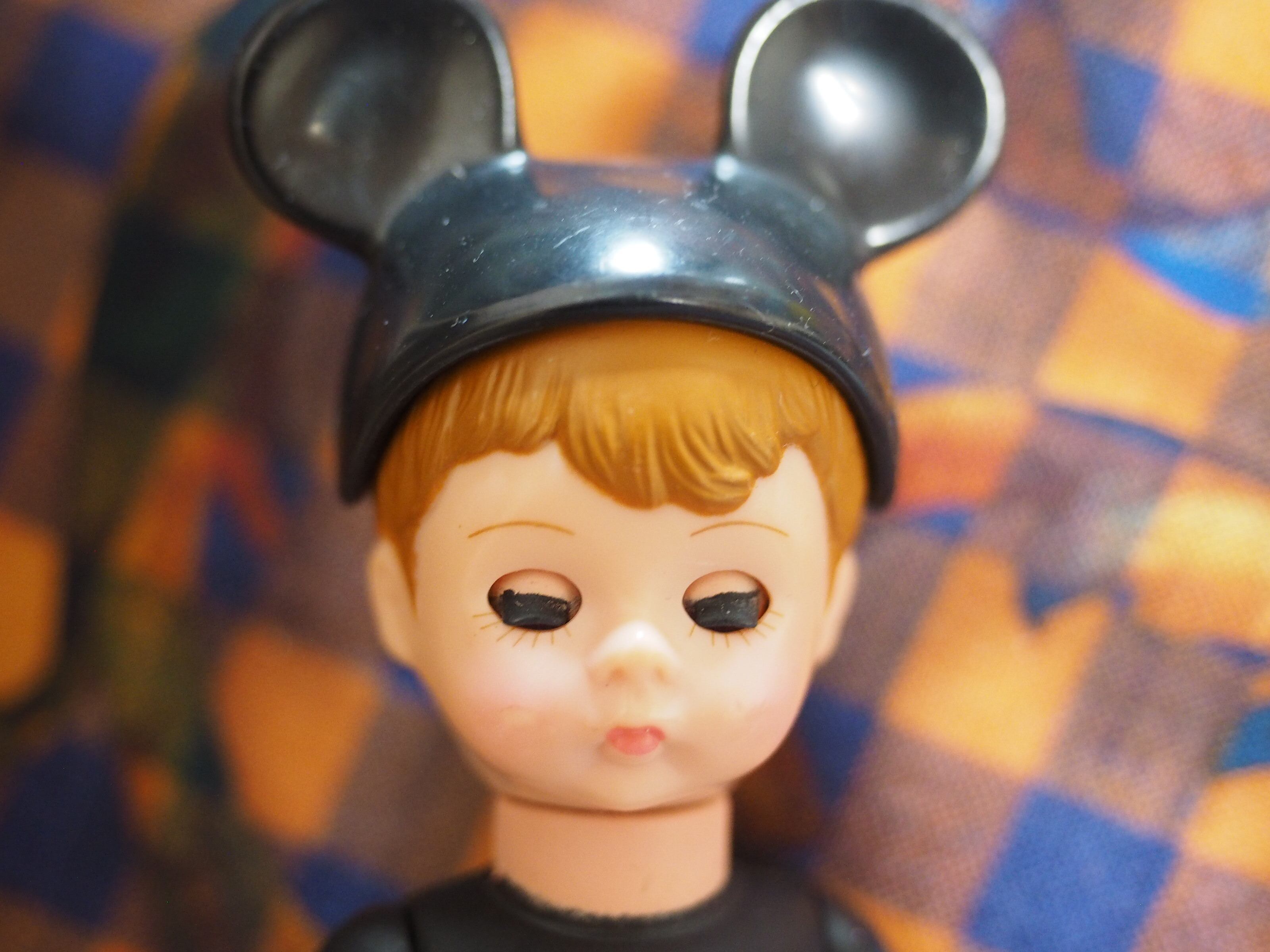 ミッキーの耳付き帽子にお馴染みの赤いパンツと黒いしっぽ、ぽってり黄色いシューズの人気ドールです。