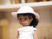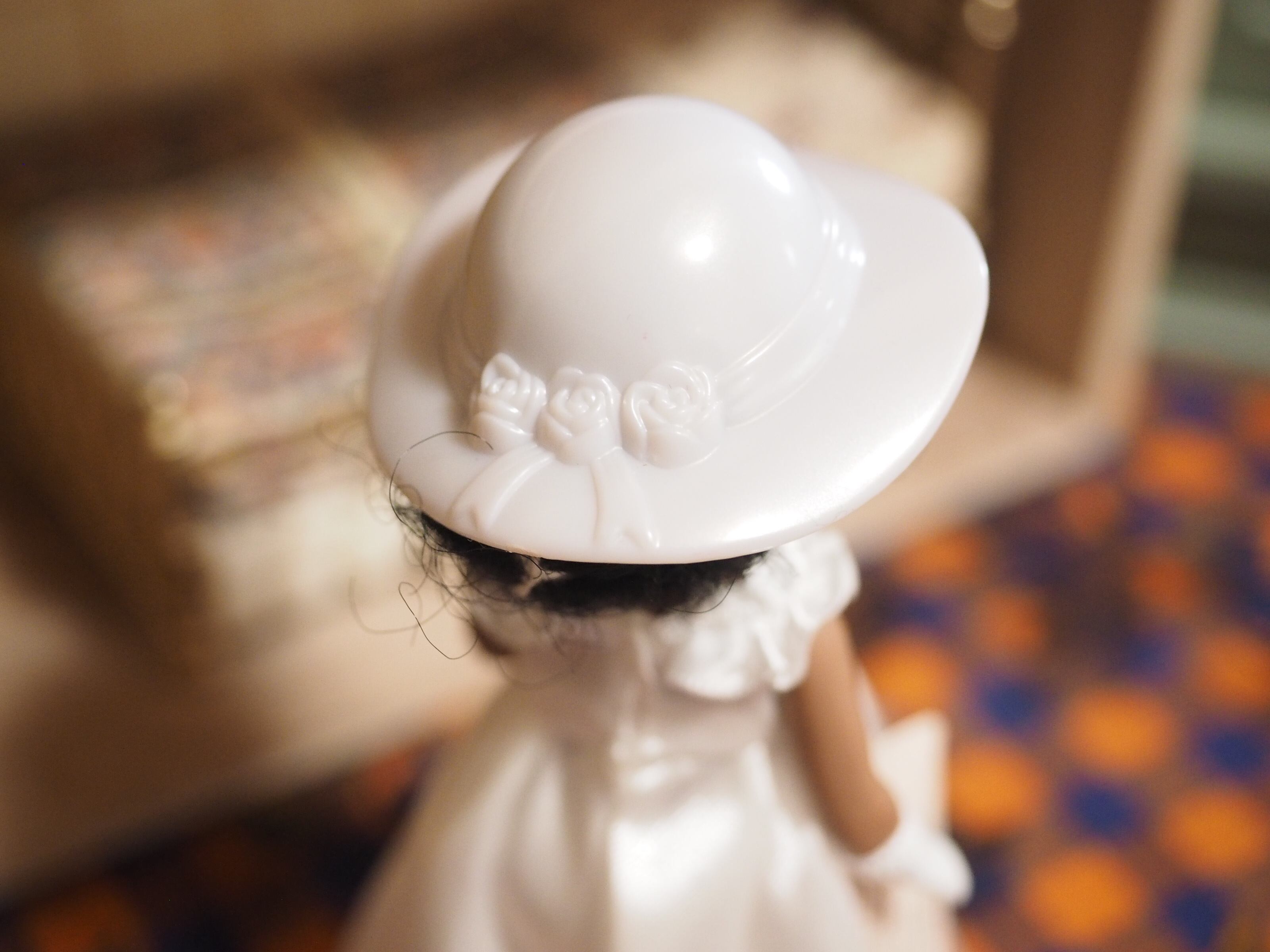 約13㎝の小さなサイズですが、ぽちっと小さな瞳が寝かせると閉じるスリープアイ仕様、首、腕付け根、脚付け根も可動します。座らせることも出来ます。(お洋服や帽子の付属品は取り外せません。)