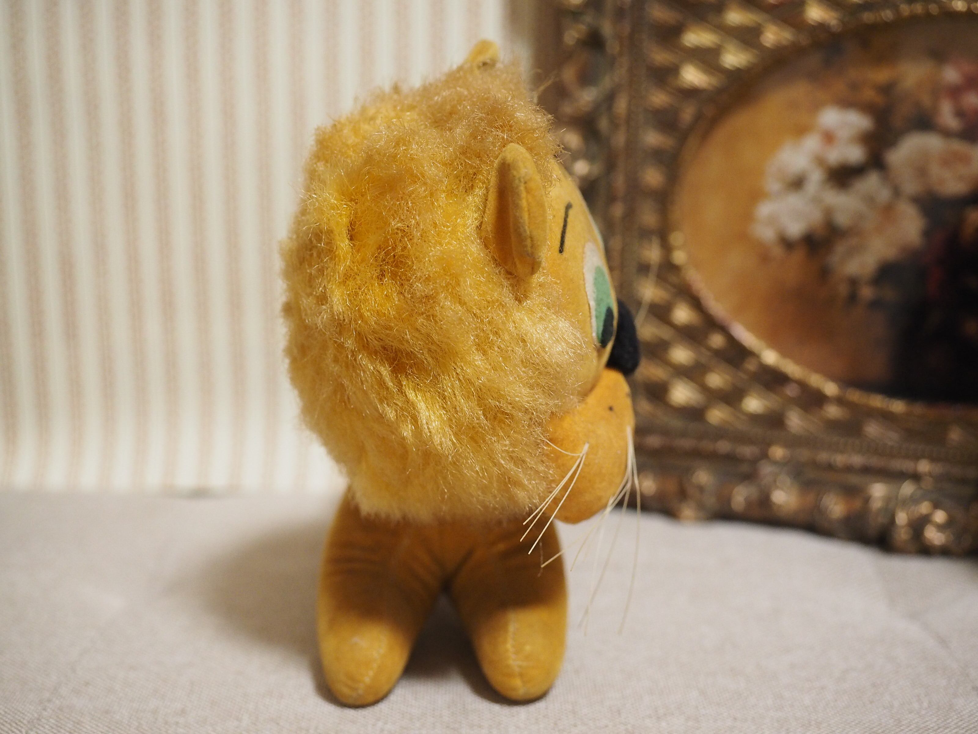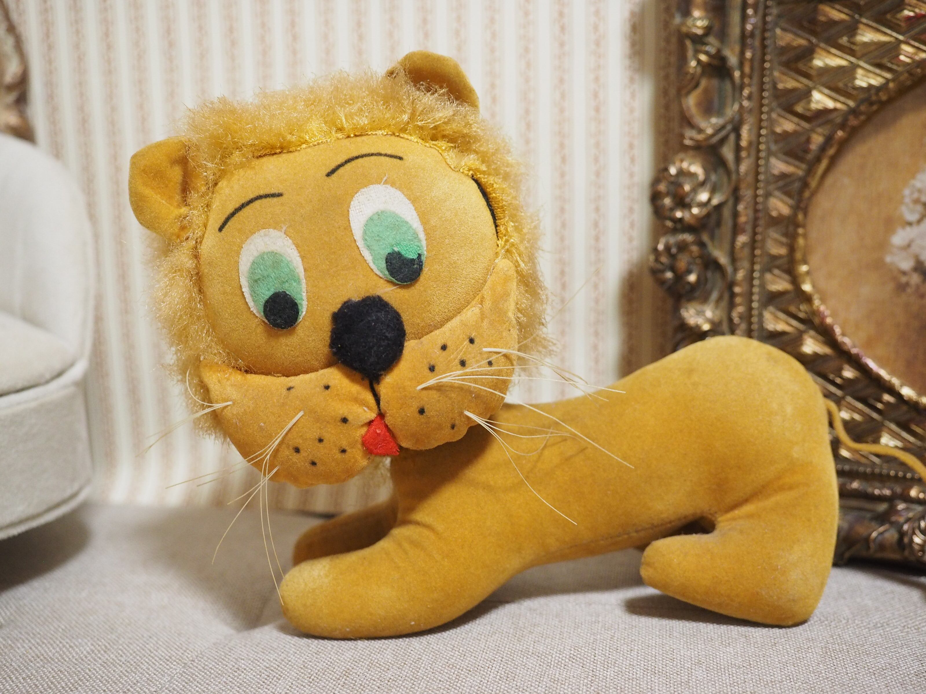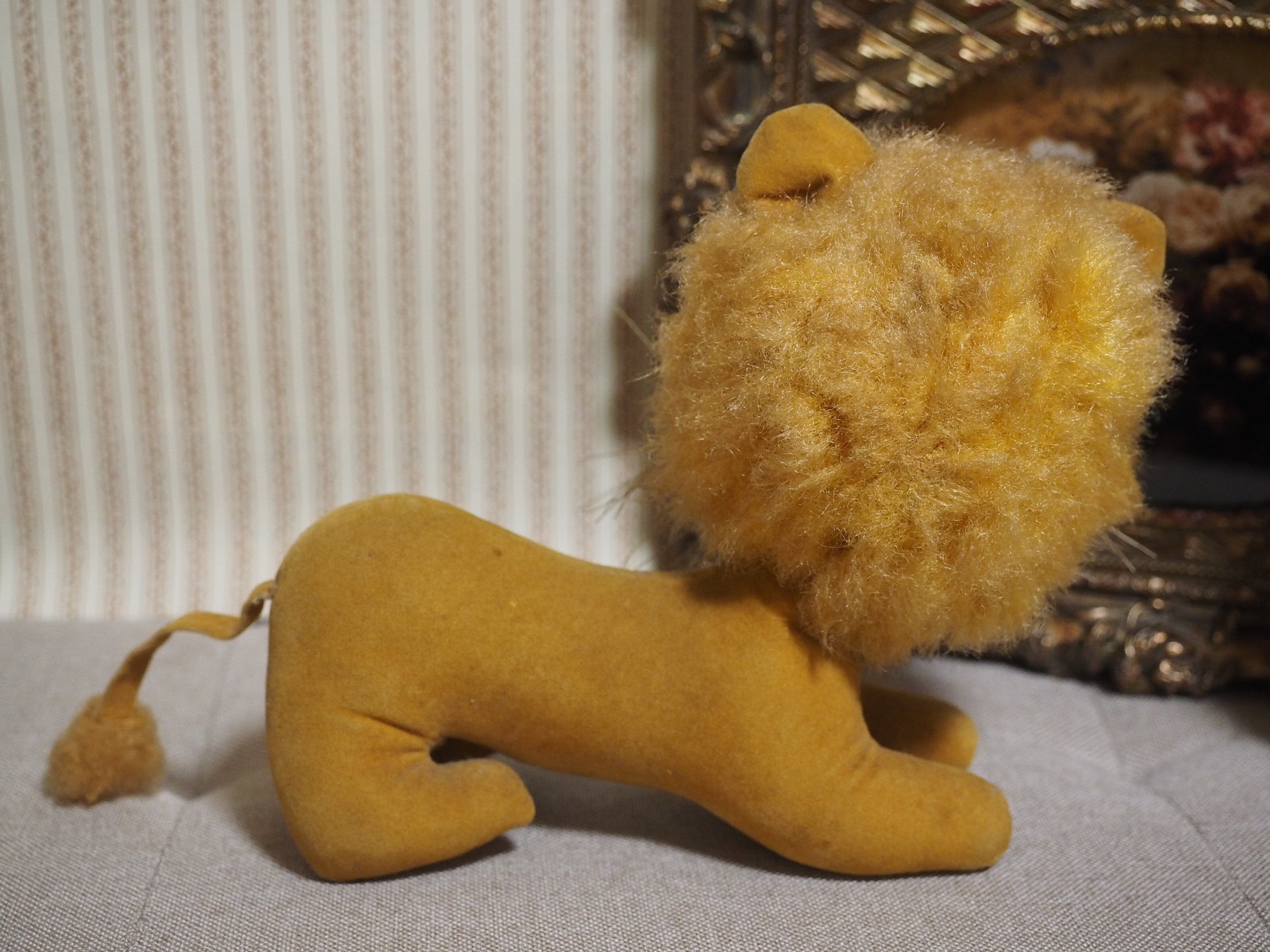 別珍素材にかっちり詰まったボディ、ふっくらした鼻下に描かれた点々とまゆげがチャーミングなライオンさん。