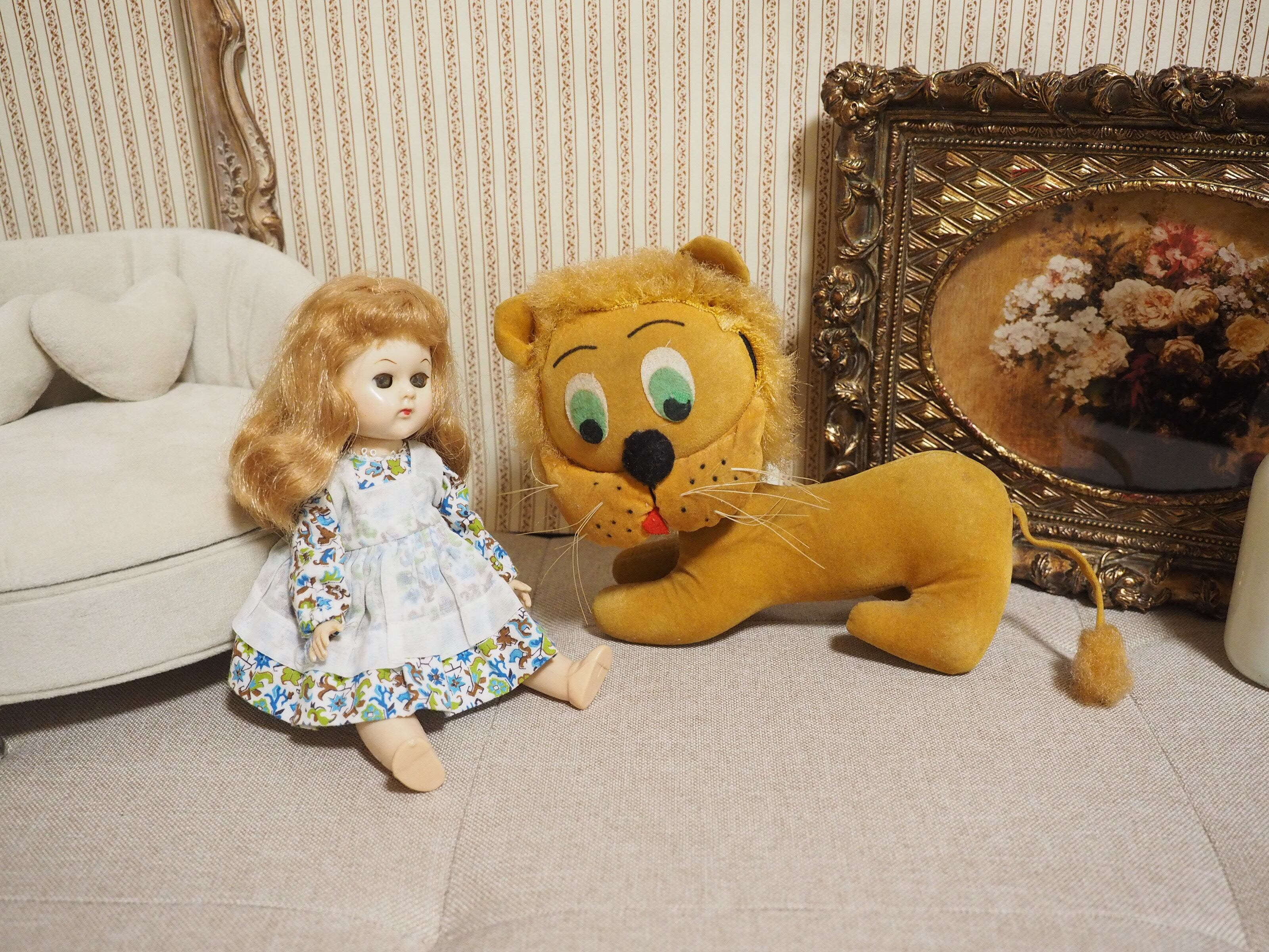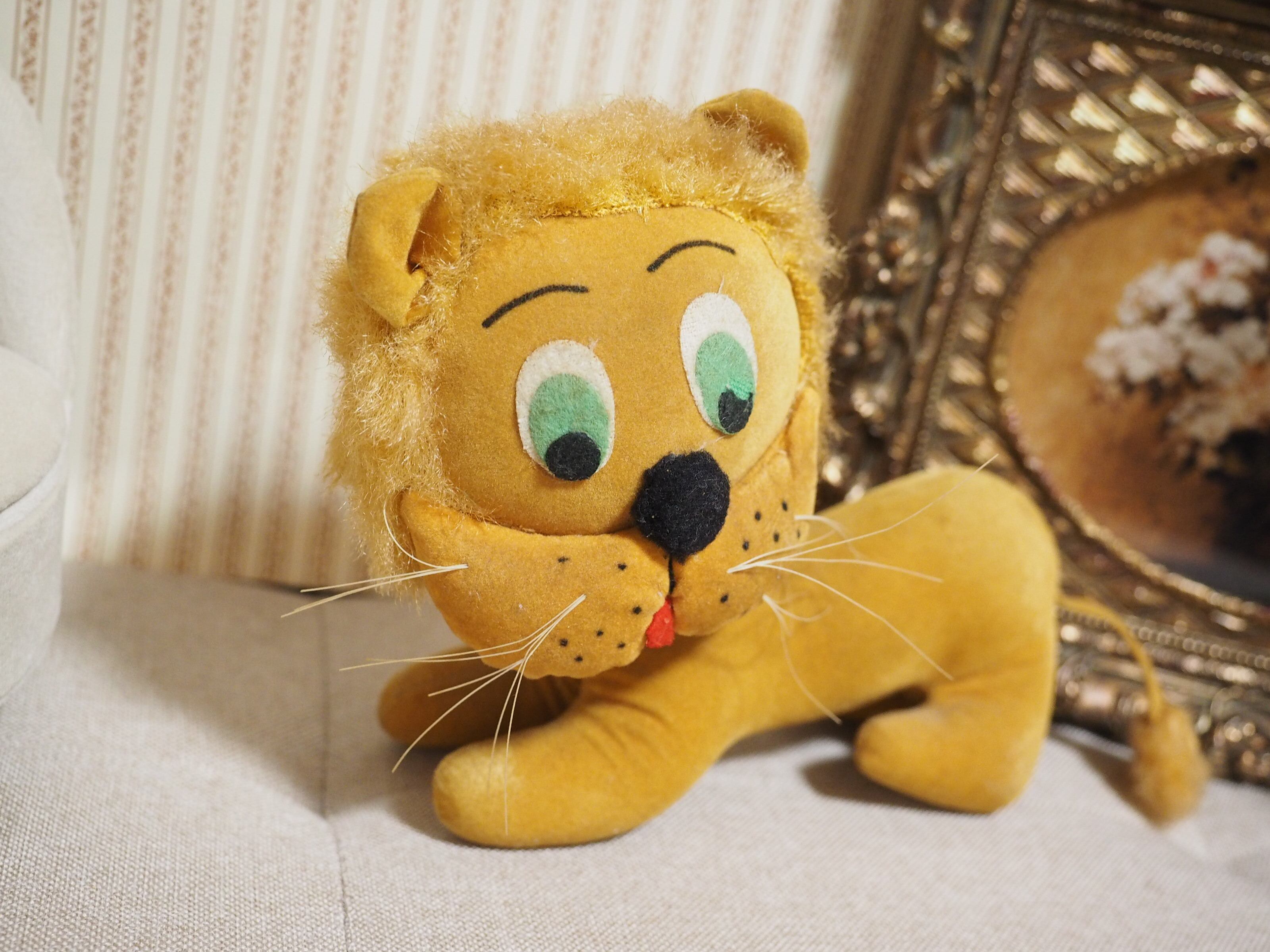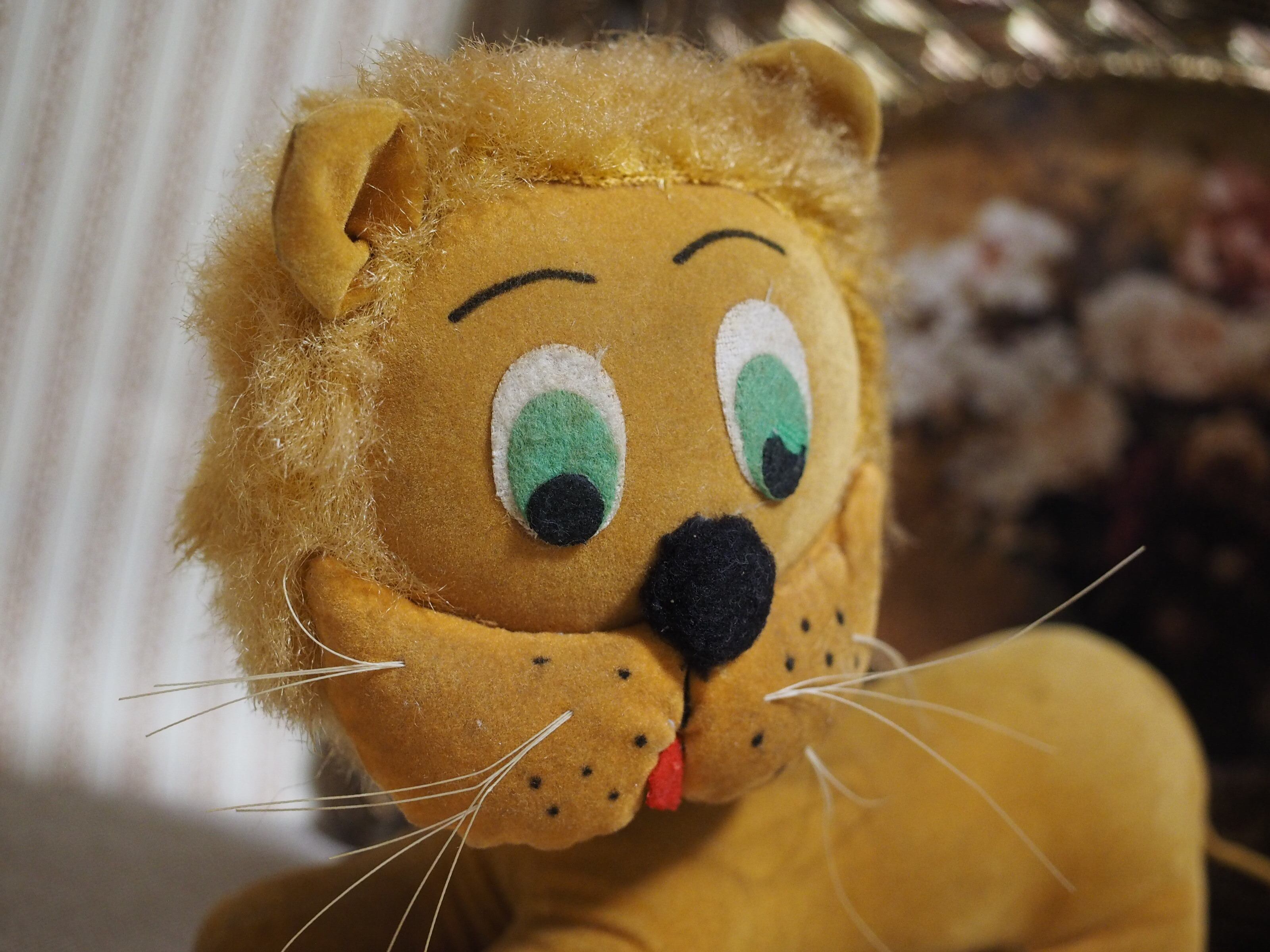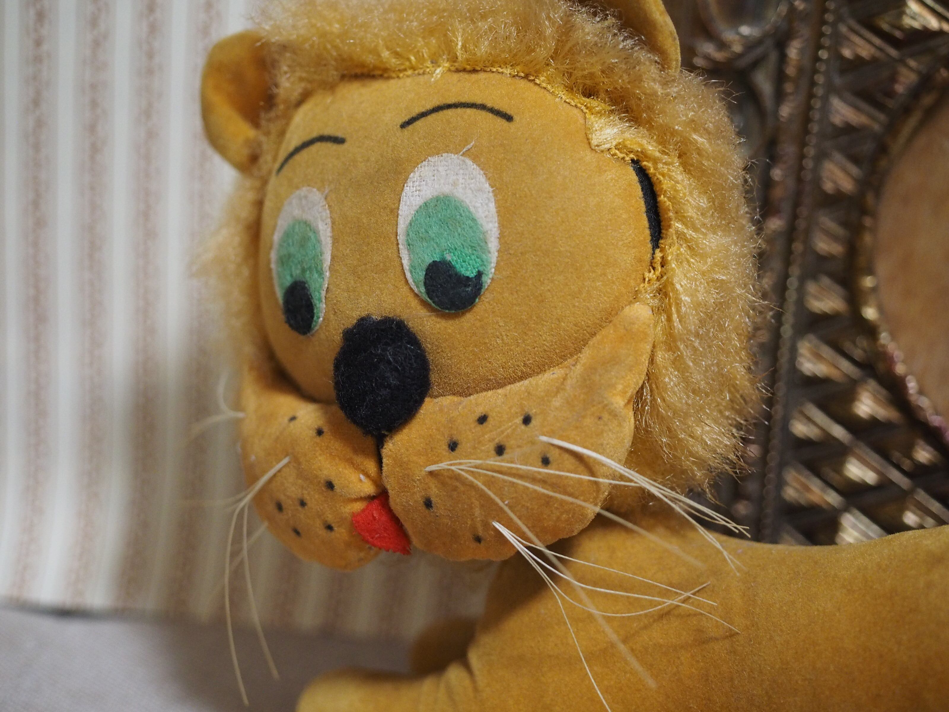 別珍素材にかっちり詰まったボディ、ふっくらした鼻下に描かれた点々とまゆげがチャーミングなライオンさん。