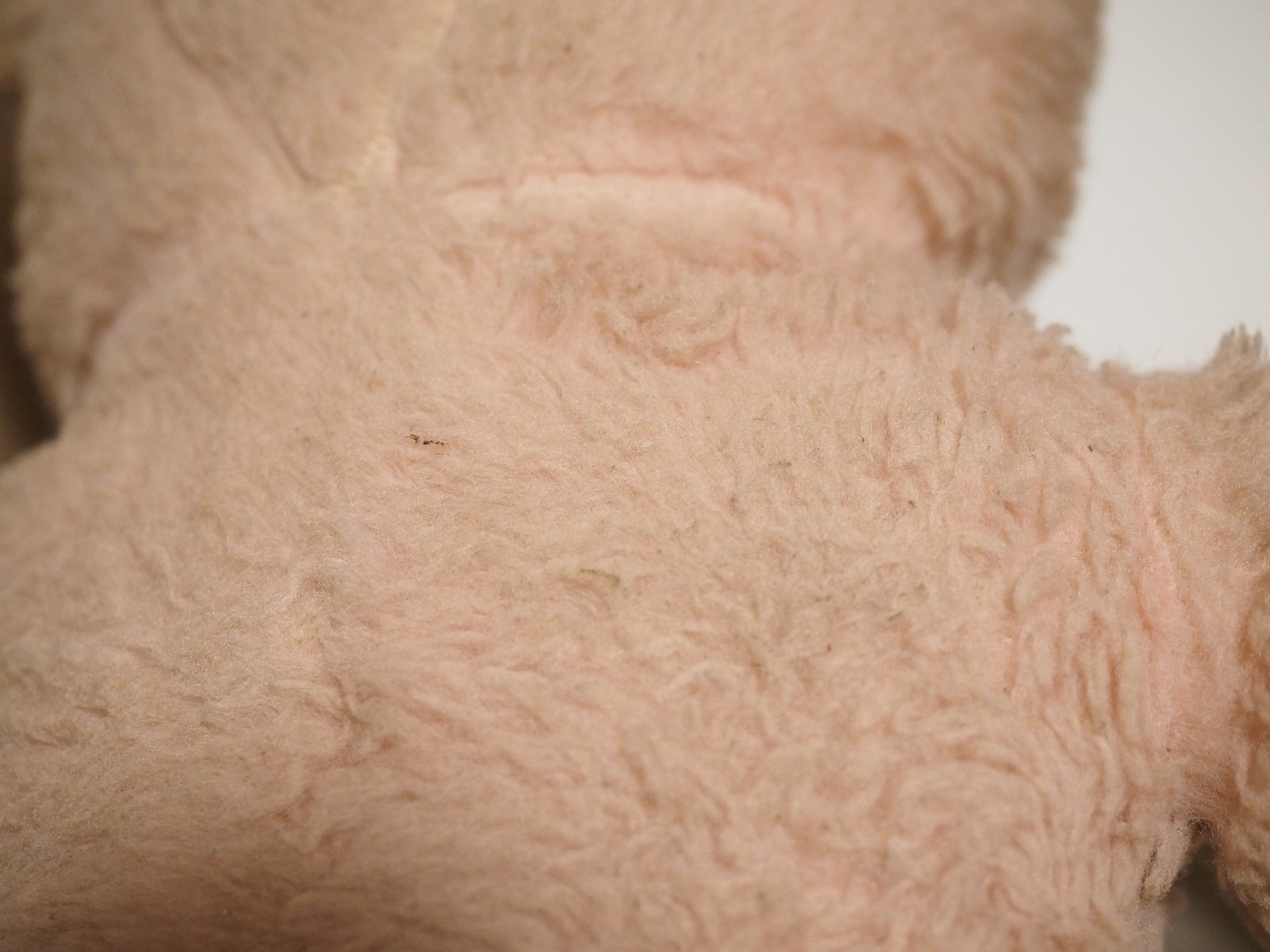 たくさん遊んで連れていってもらったのでしょうか、全体的にくすんで黒ずみ、鼻のまわりや足先、つなぎ目の毛が薄くなって地肌が見えています。