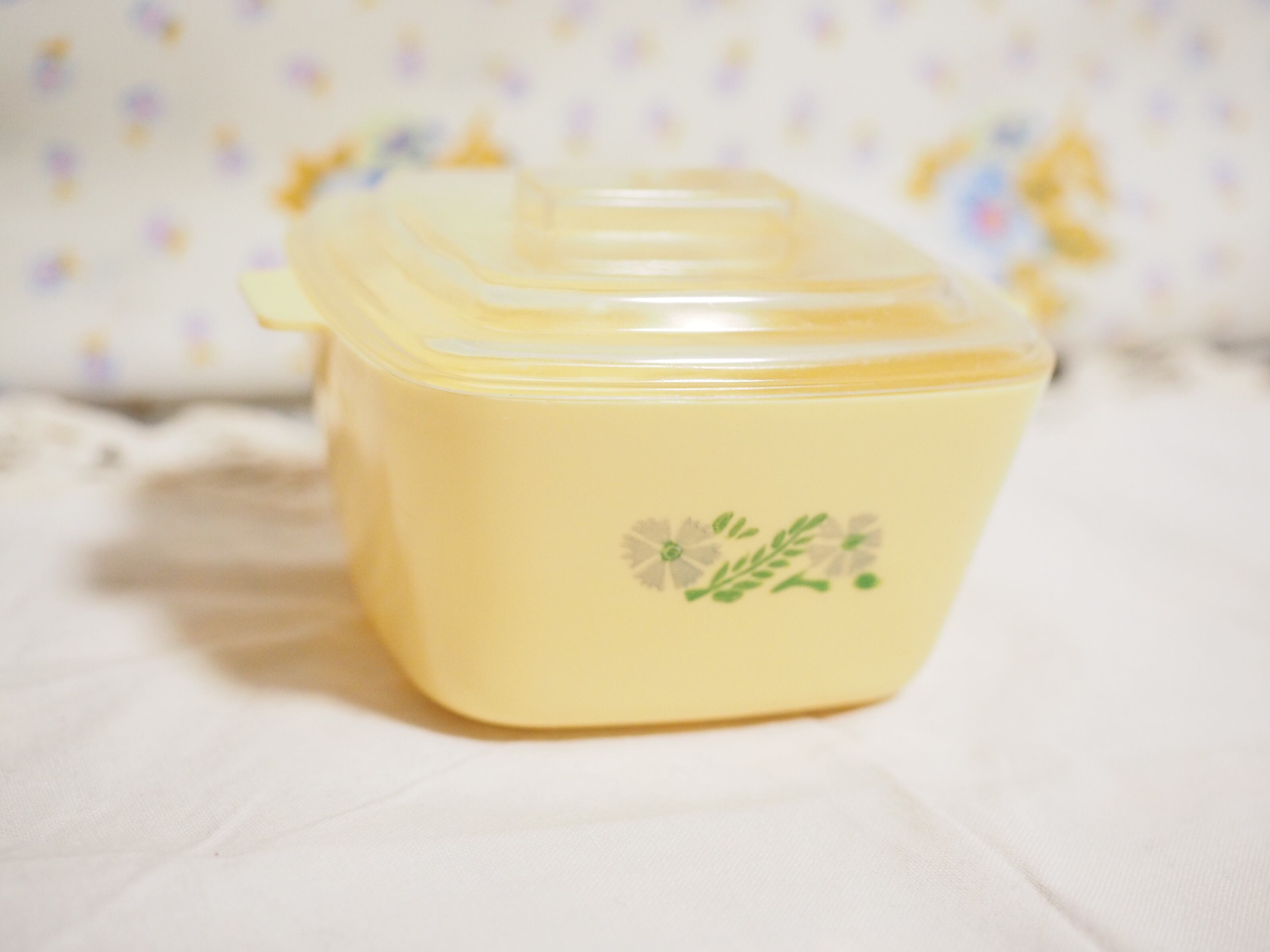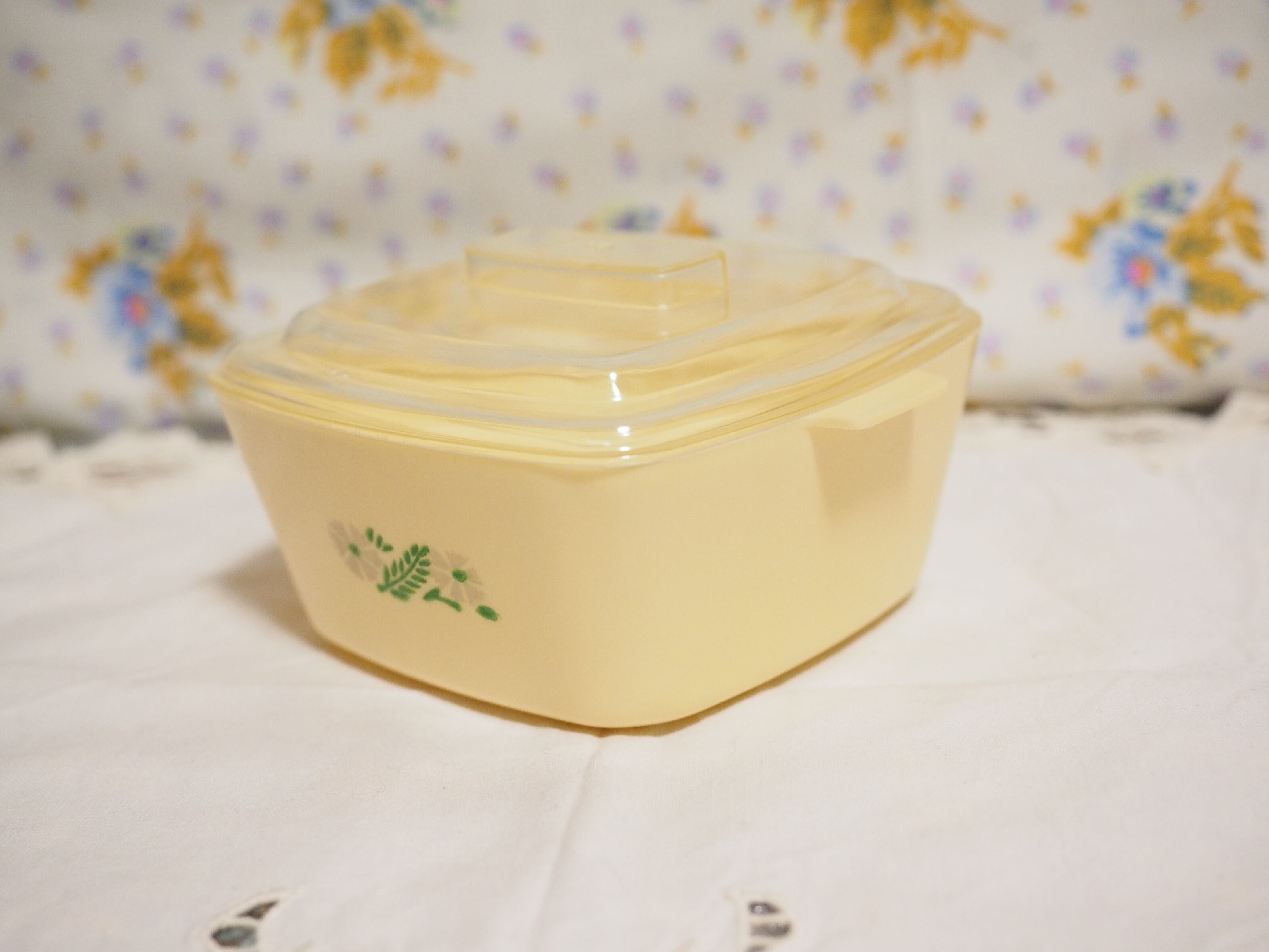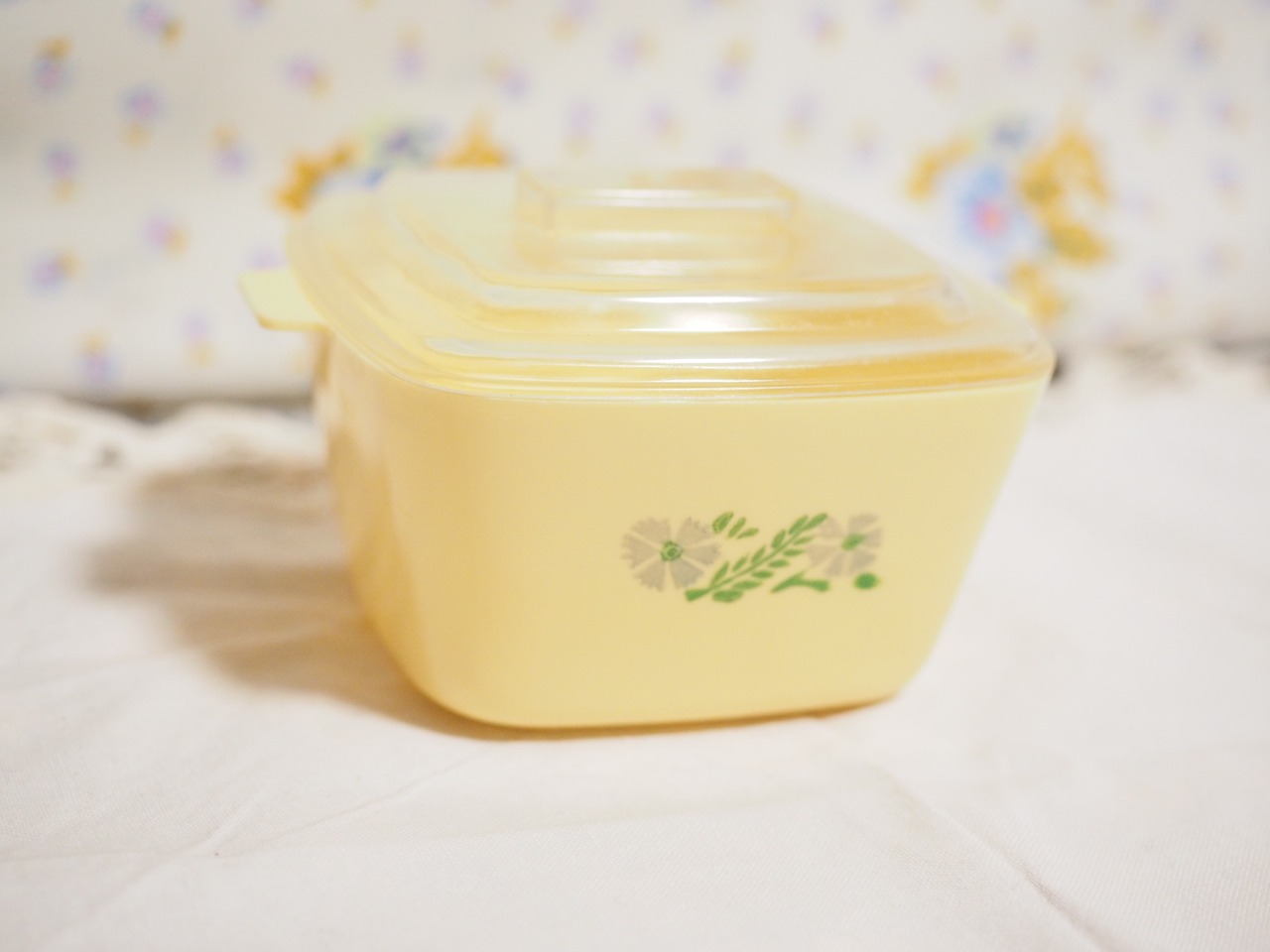 ビンテージな少し黄色がかったクリームカラーと、コスモスと思われるお花のプリントがかわいらしいプラスチック製おままごとです。