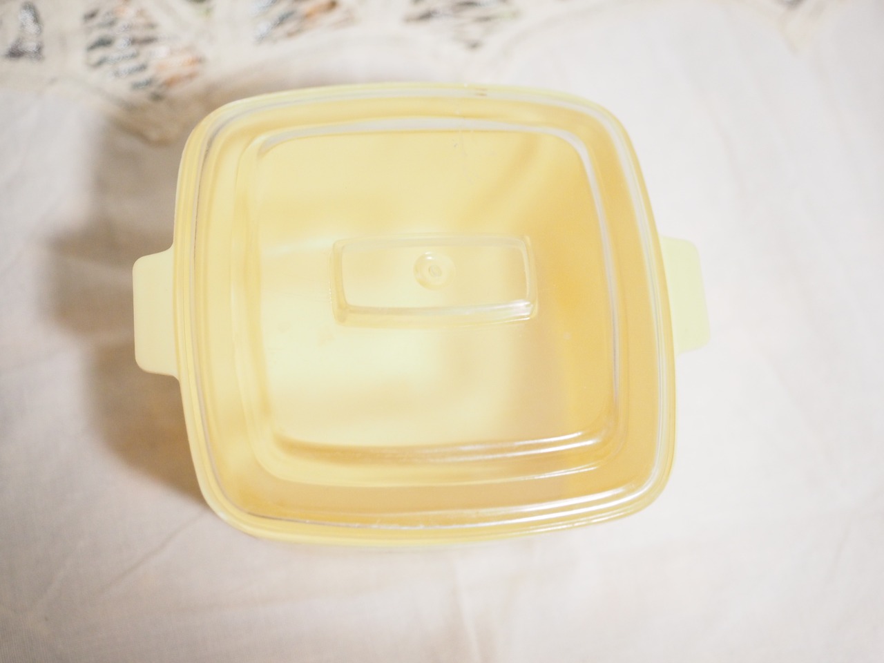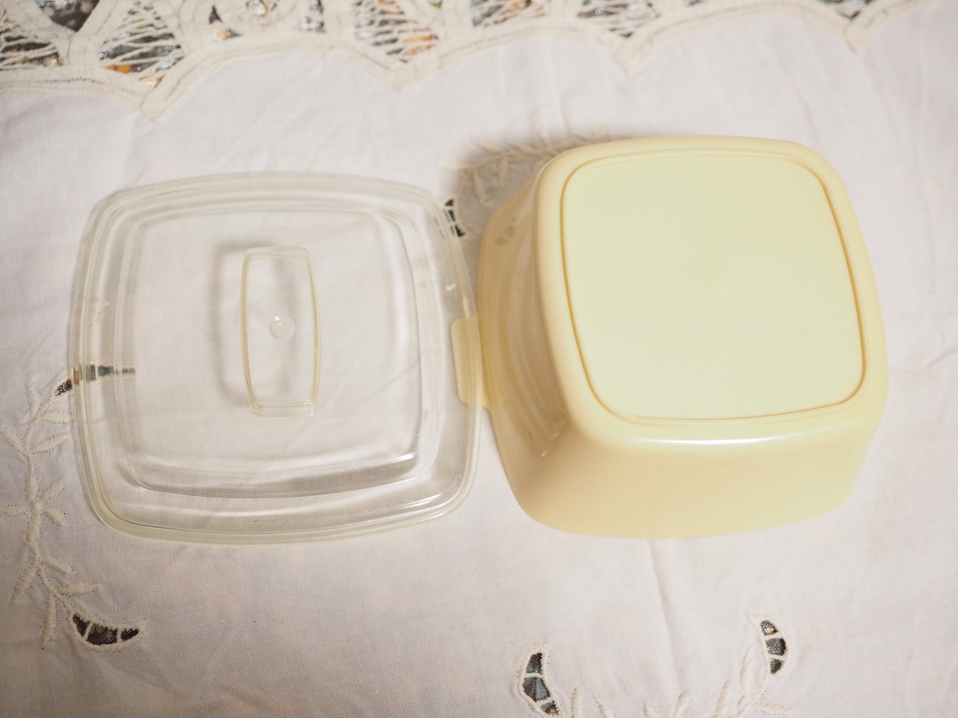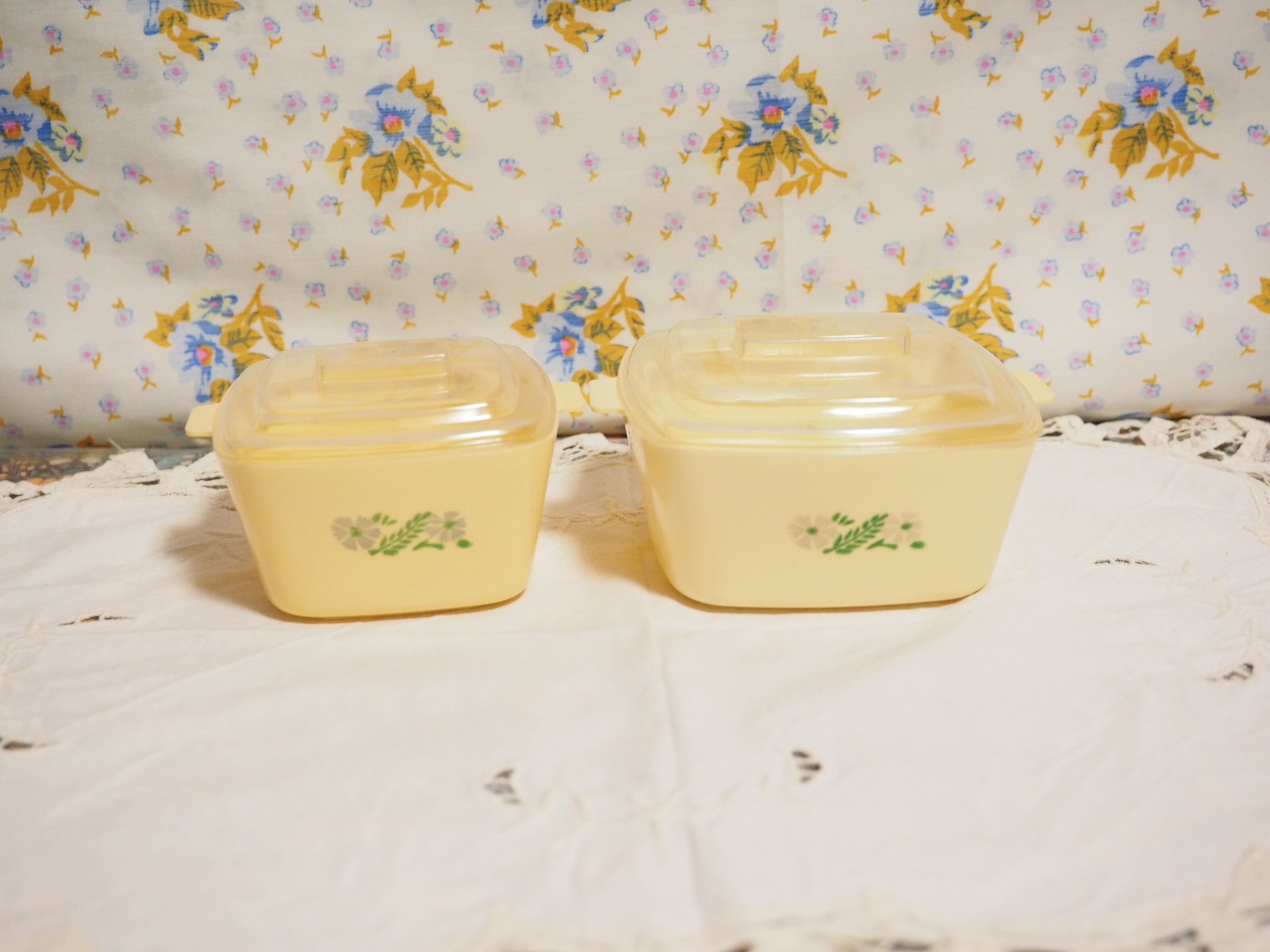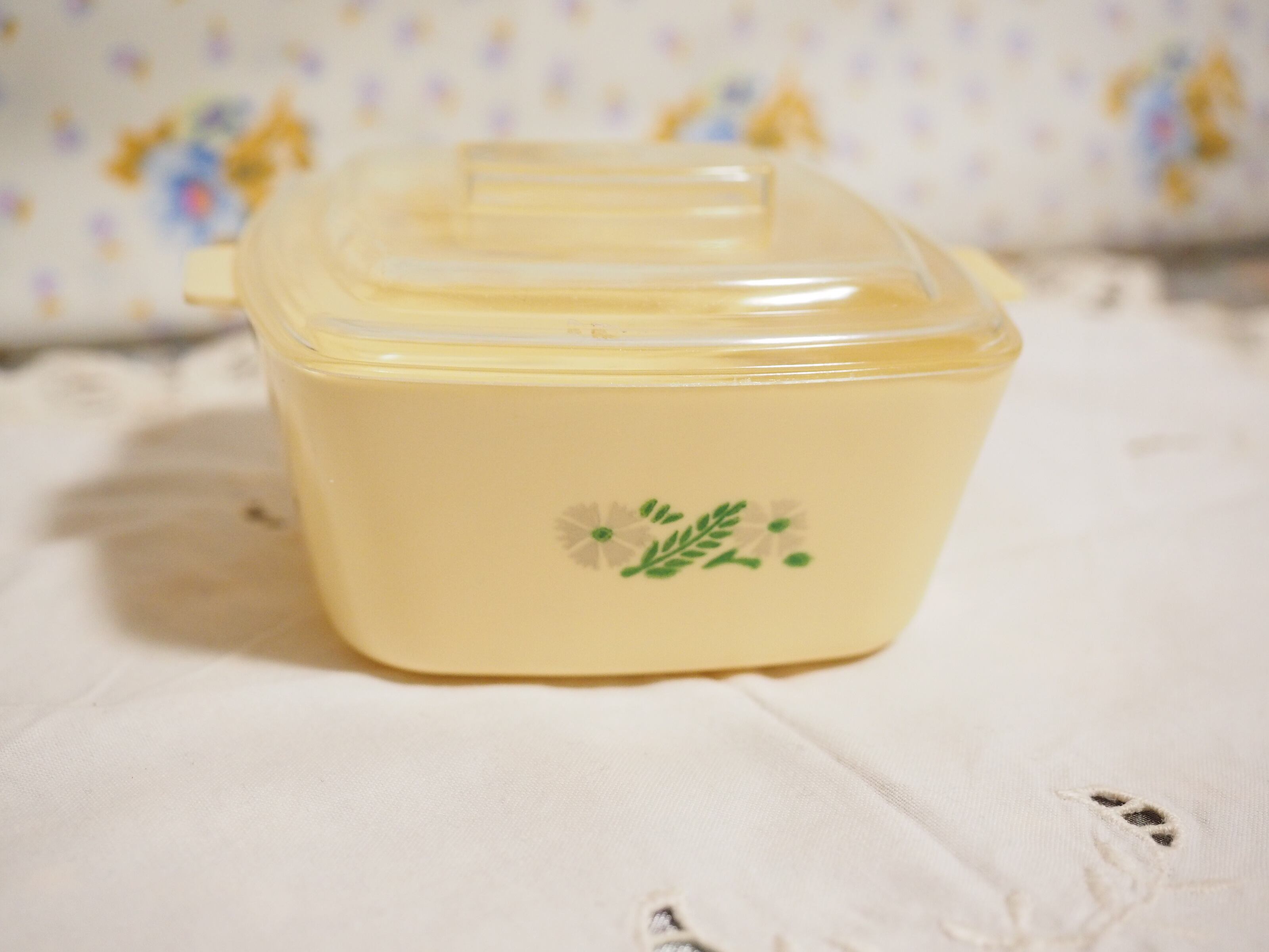 ビンテージな少し黄色がかったクリームカラーと、コスモスと思われるお花のプリントがかわいらしいプラスチック製おままごとです。