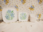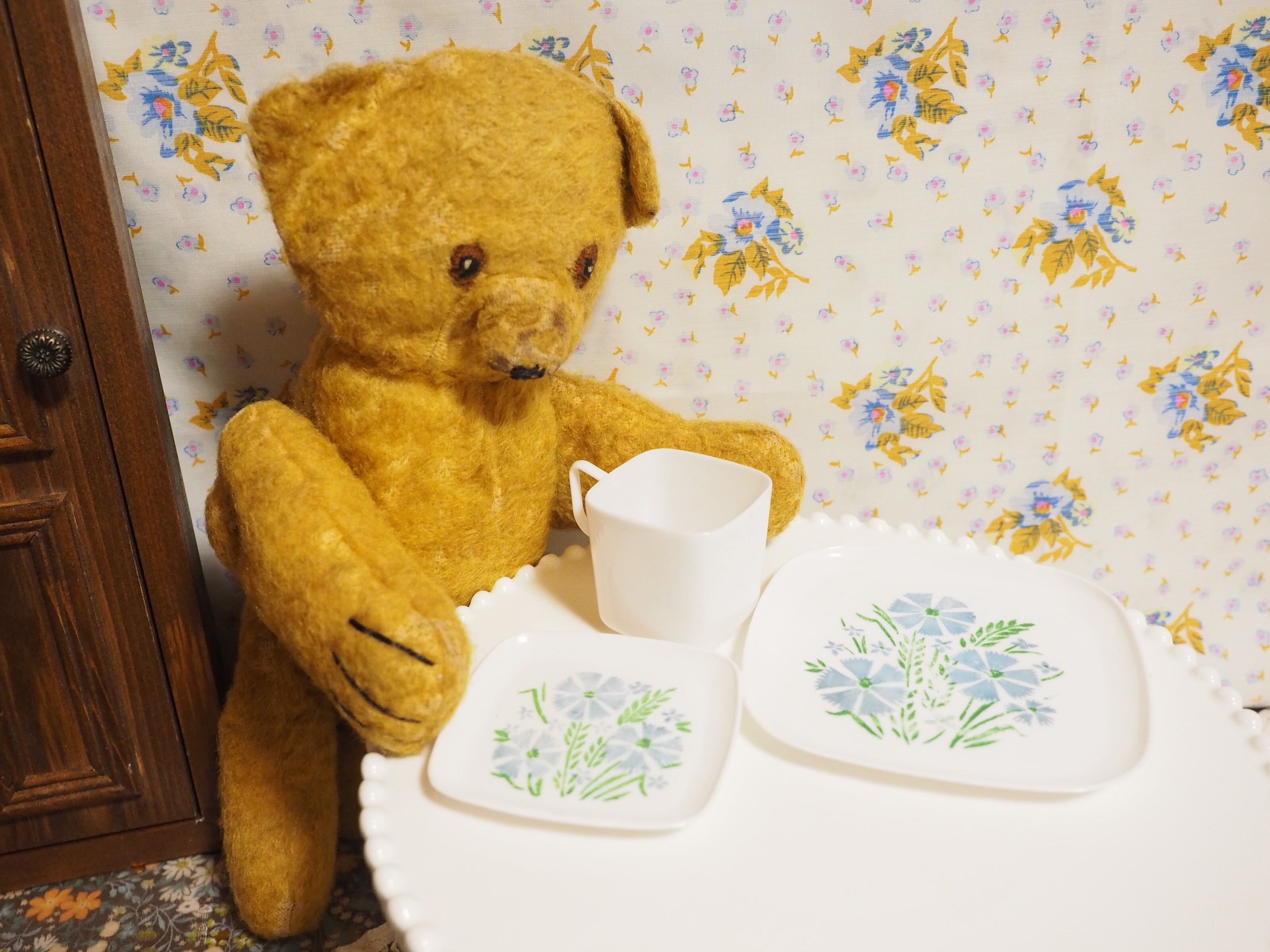 角ばったマグとお皿がおしゃれで、ノスタルジックな色合いや花柄がきゅんとなるおままごとセットです。