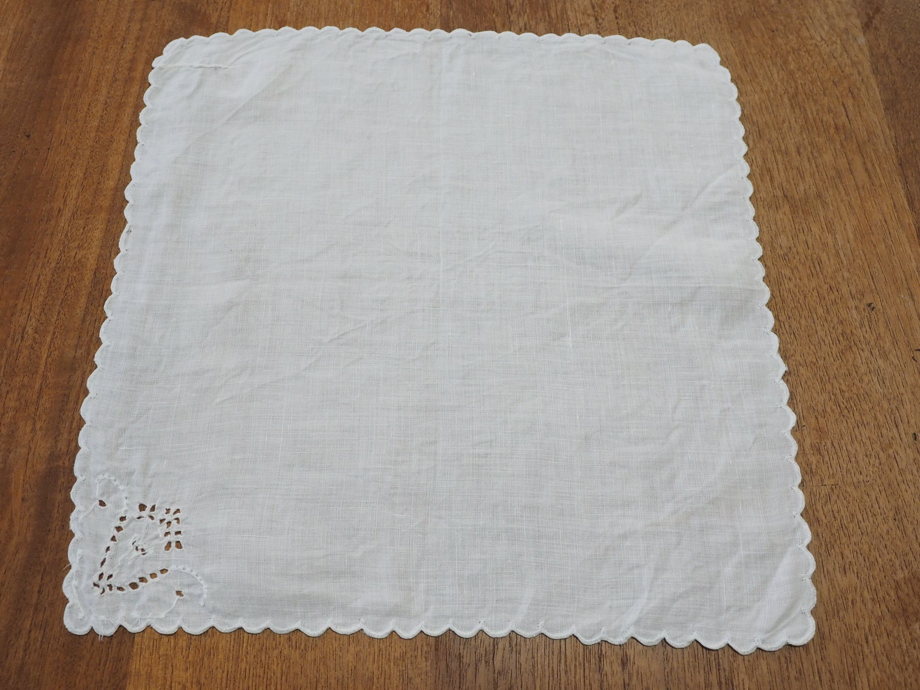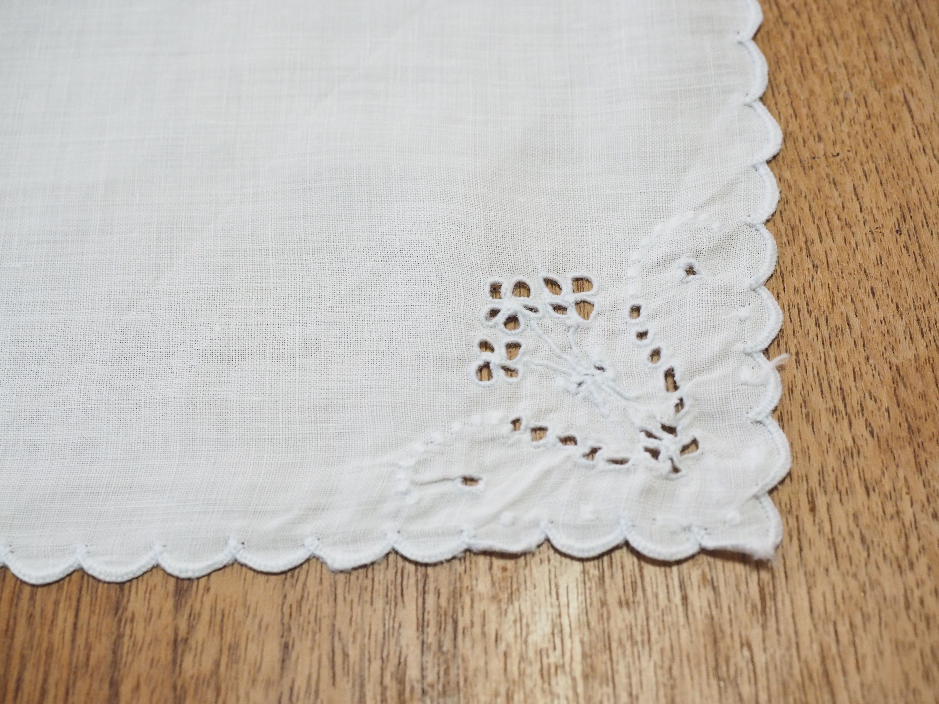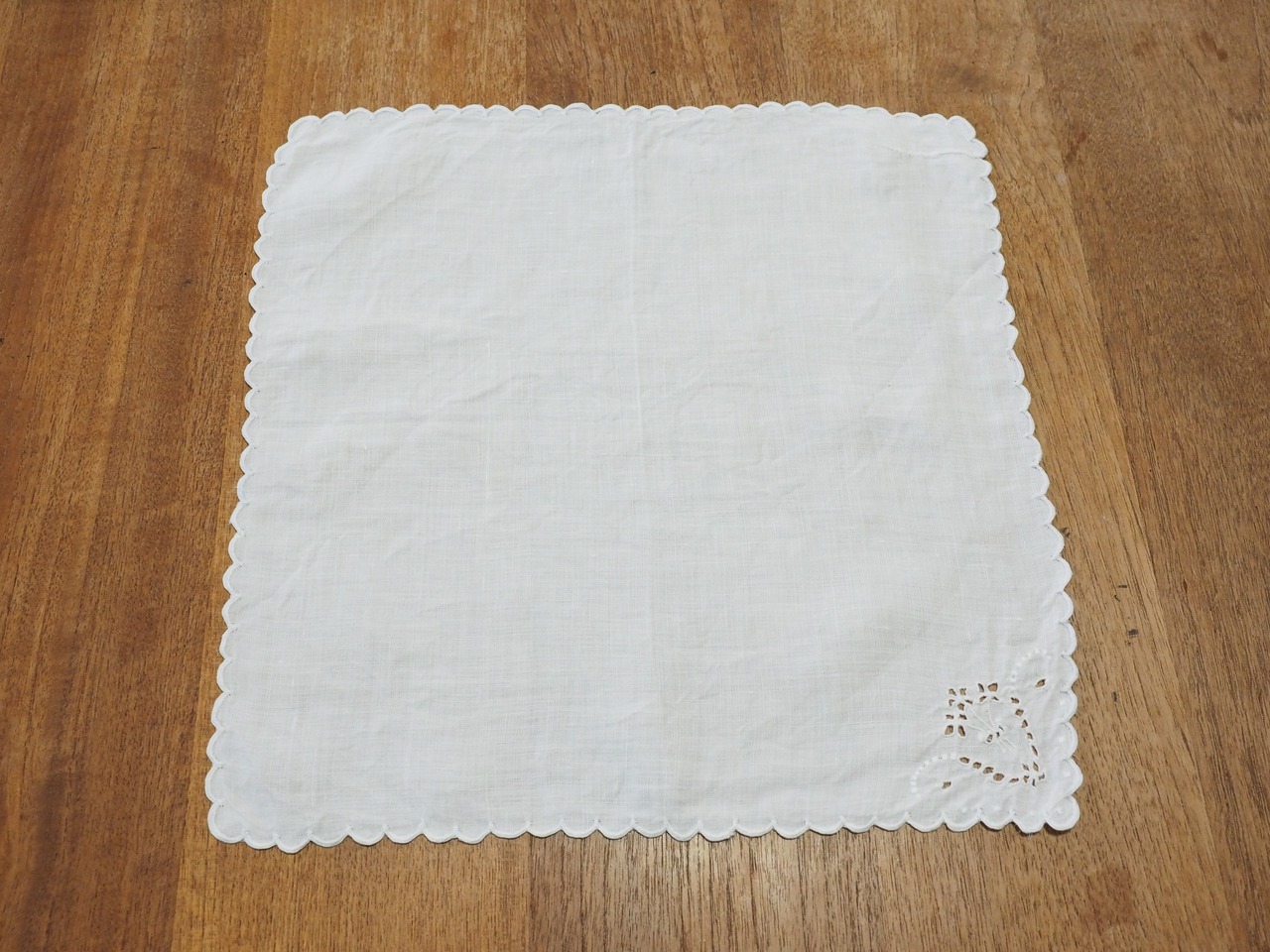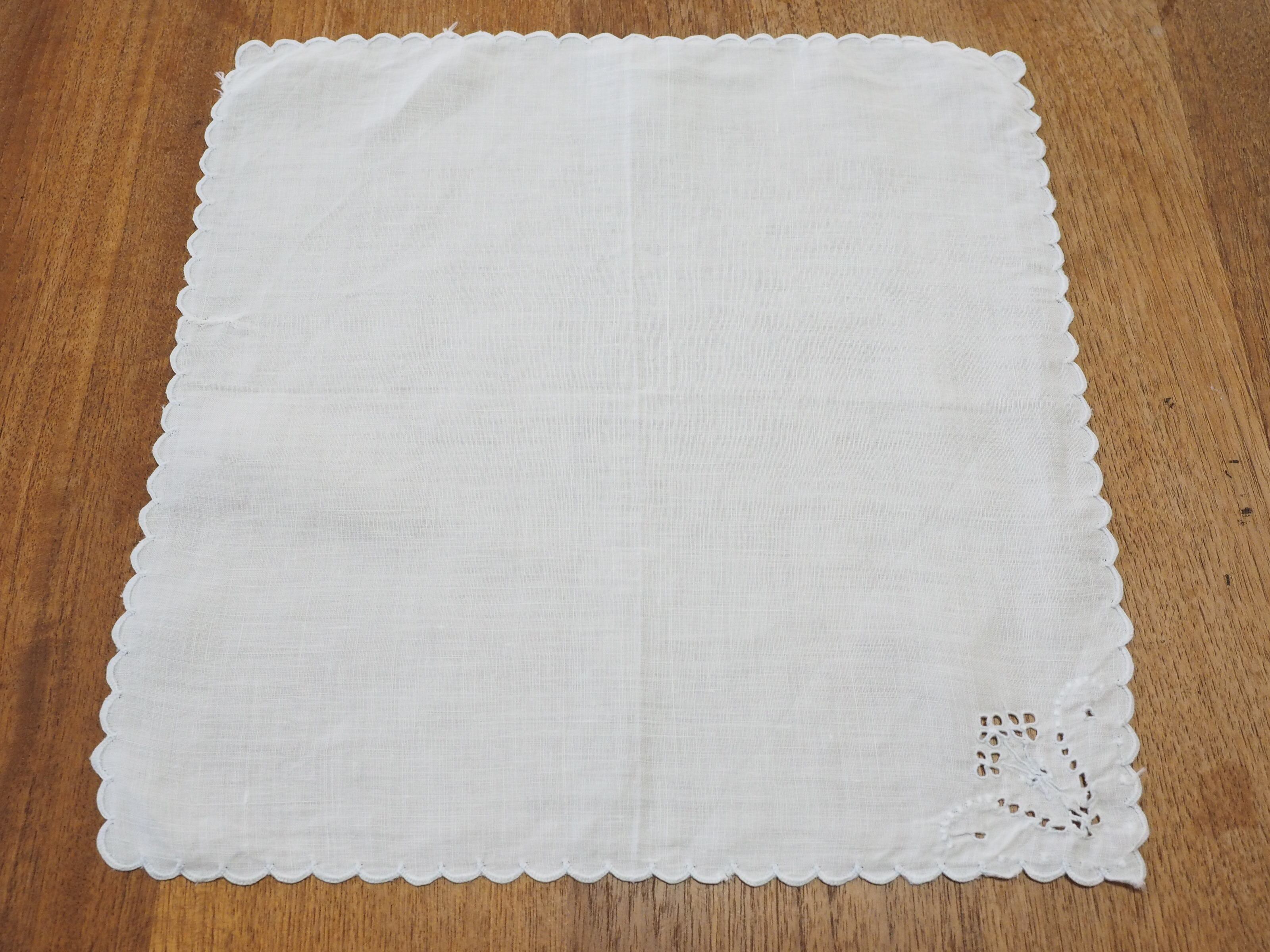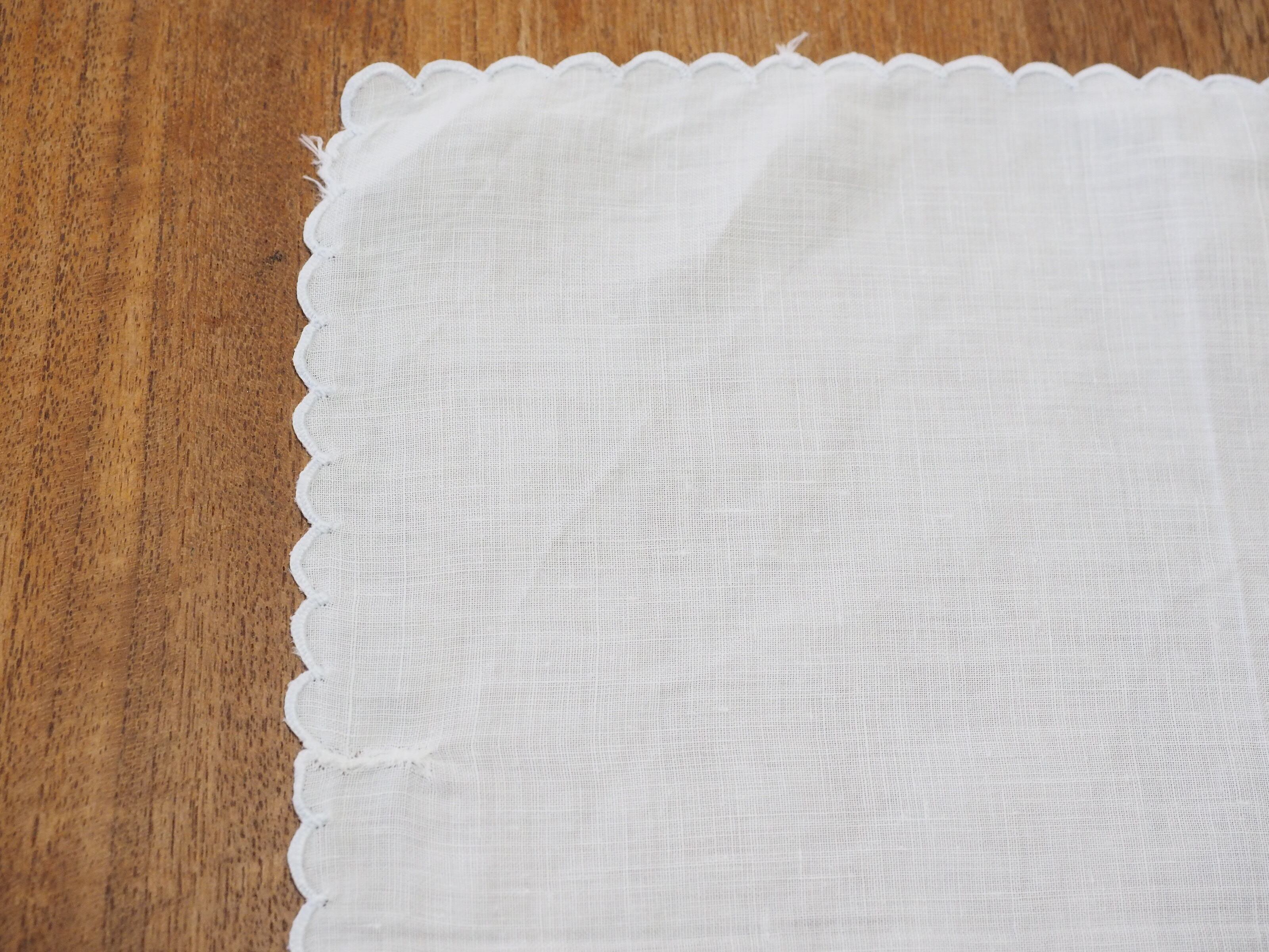 シンプルなコーナー刺繍のナプキンですが、ぐるっと縁に施されたスカラップもとても素敵です。