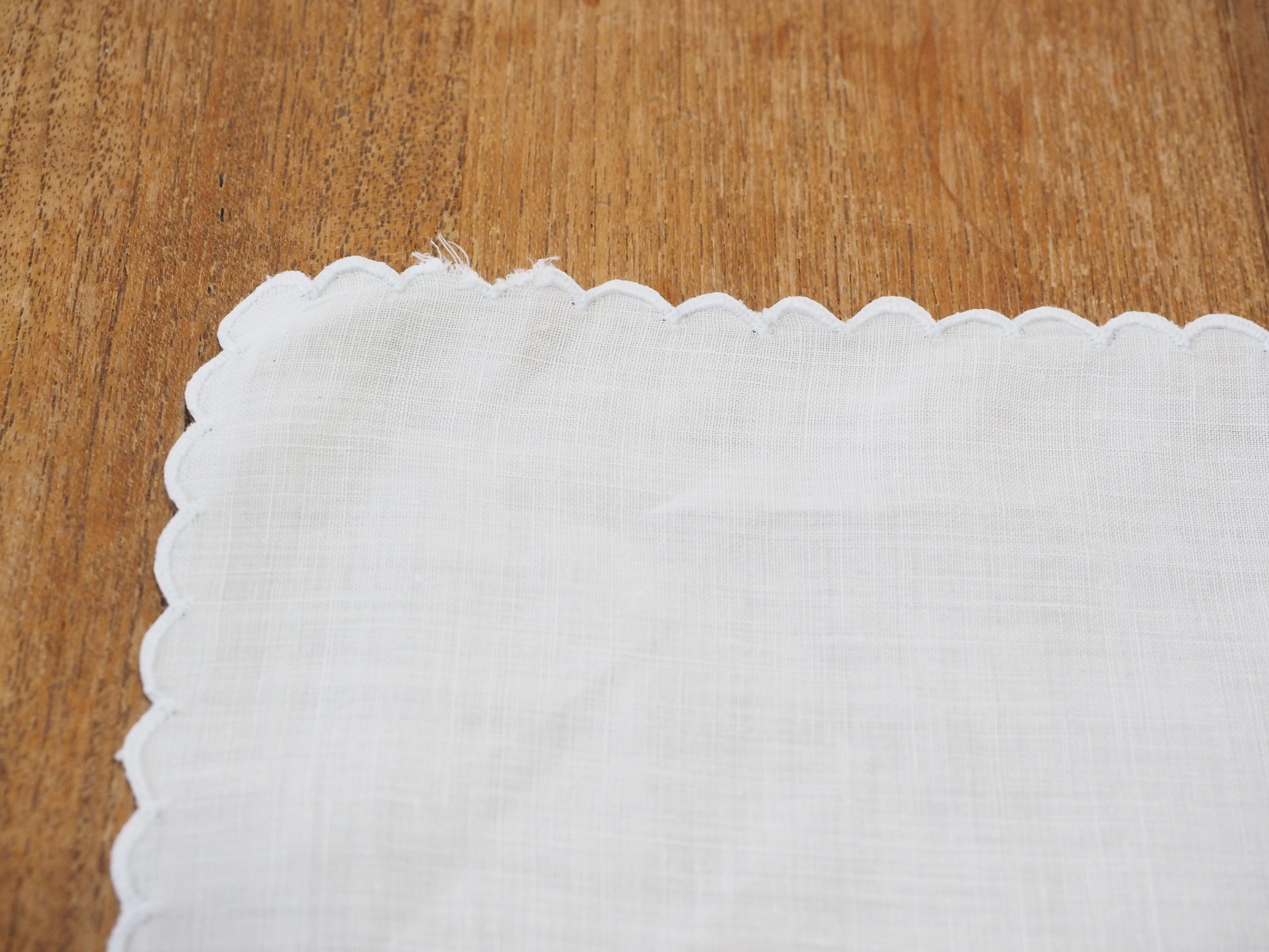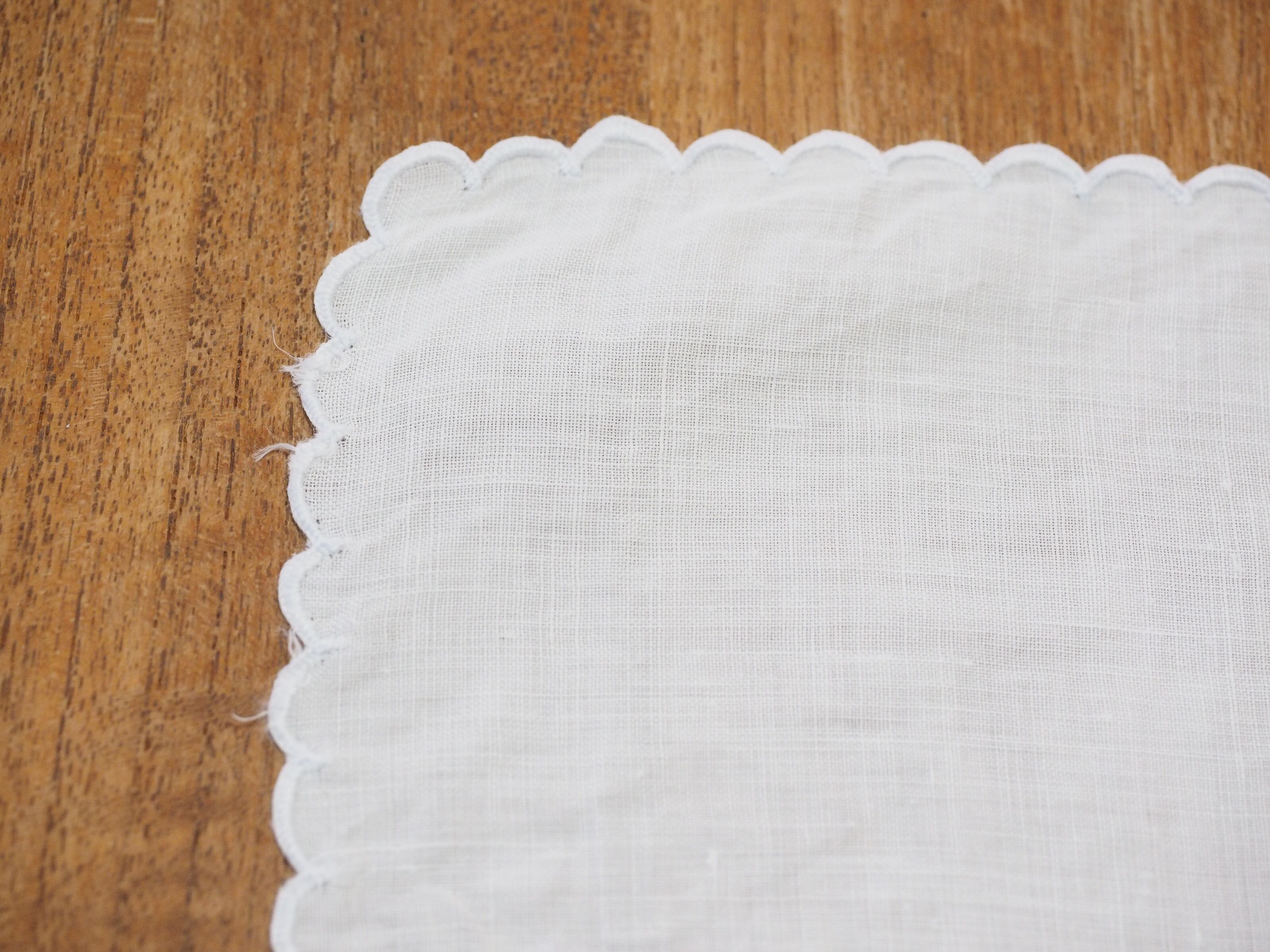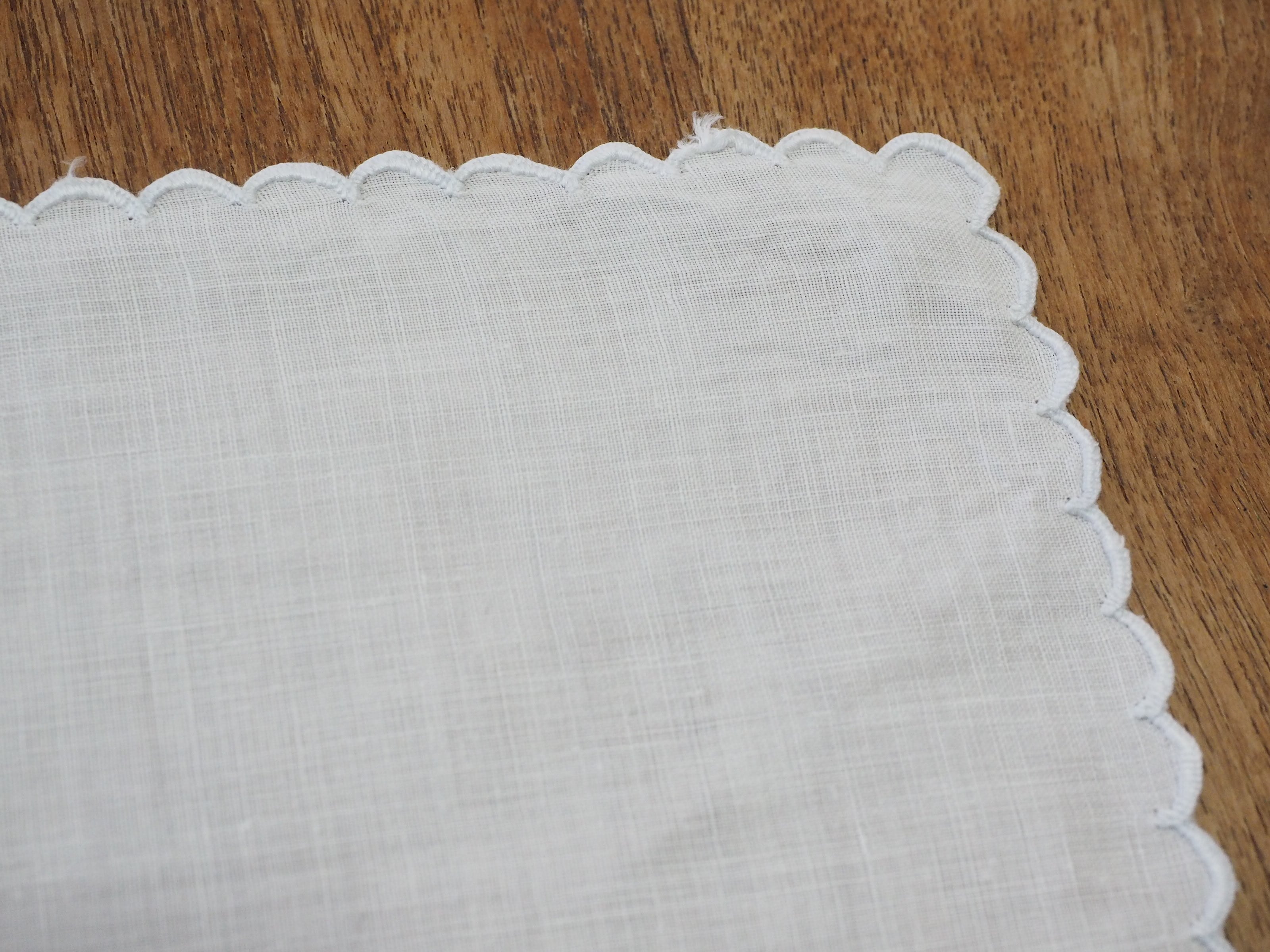 シンプルなコーナー刺繍のナプキンですが、ぐるっと縁に施されたスカラップもとても素敵です。
