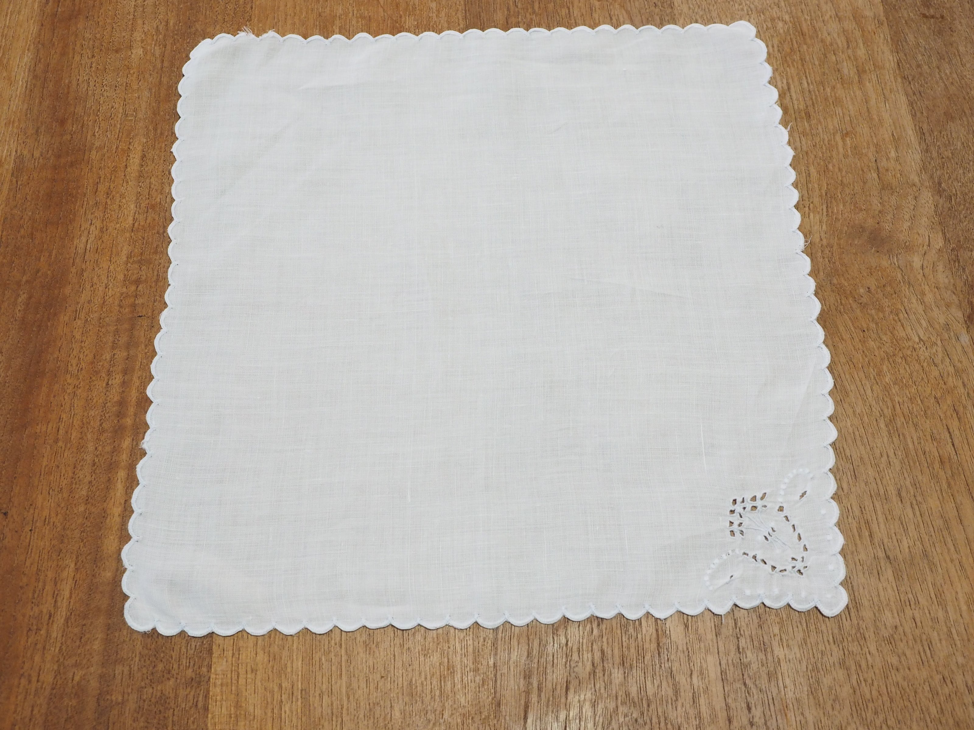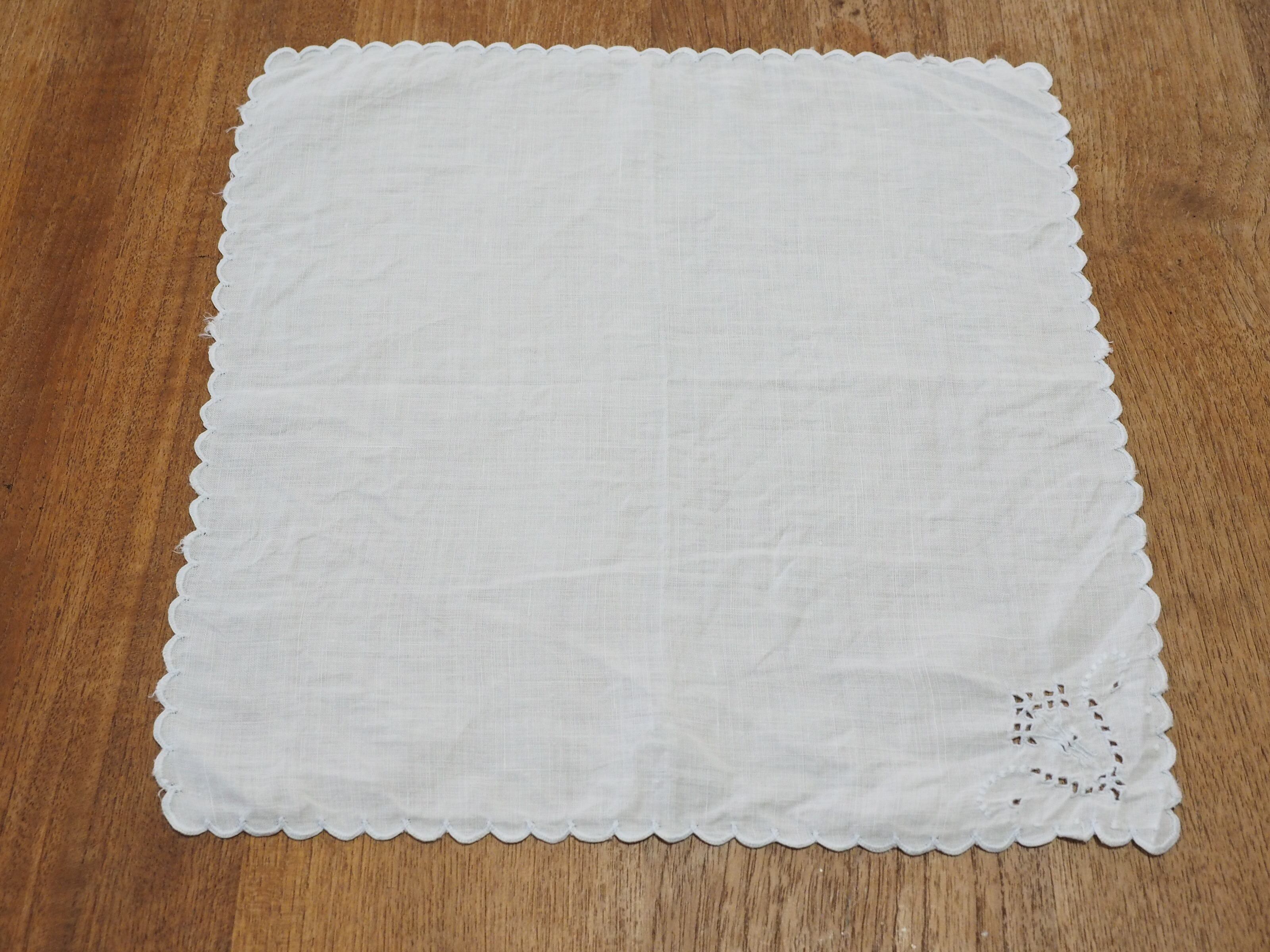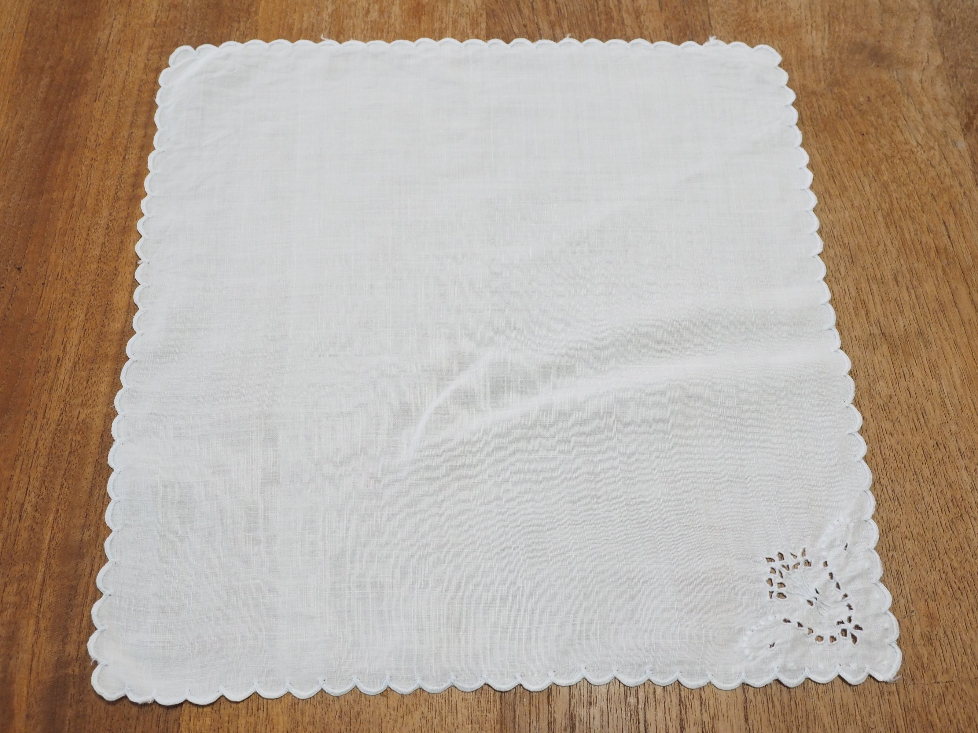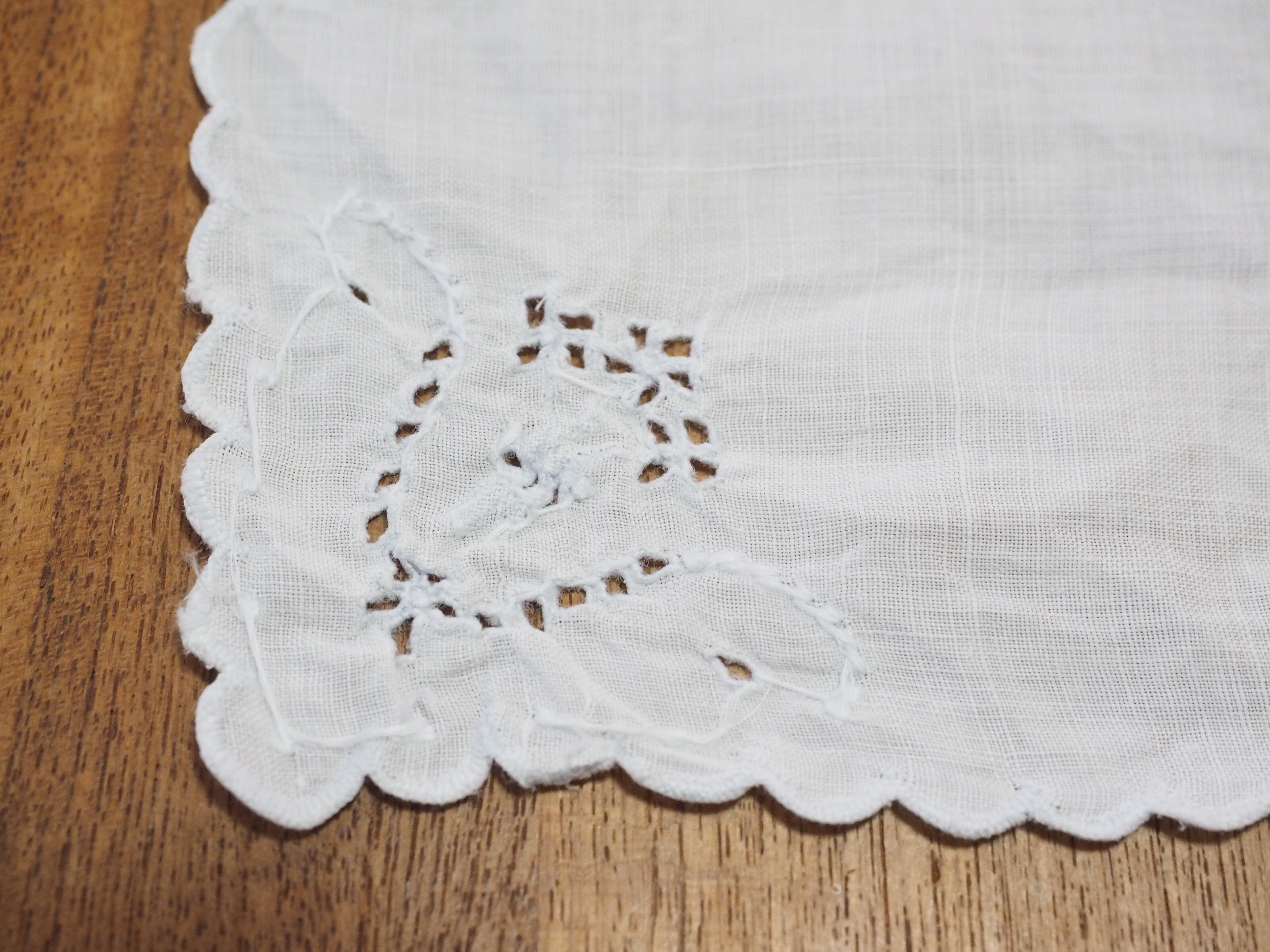 シンプルなコーナー刺繍のナプキンですが、ぐるっと縁に施されたスカラップもとても素敵です。