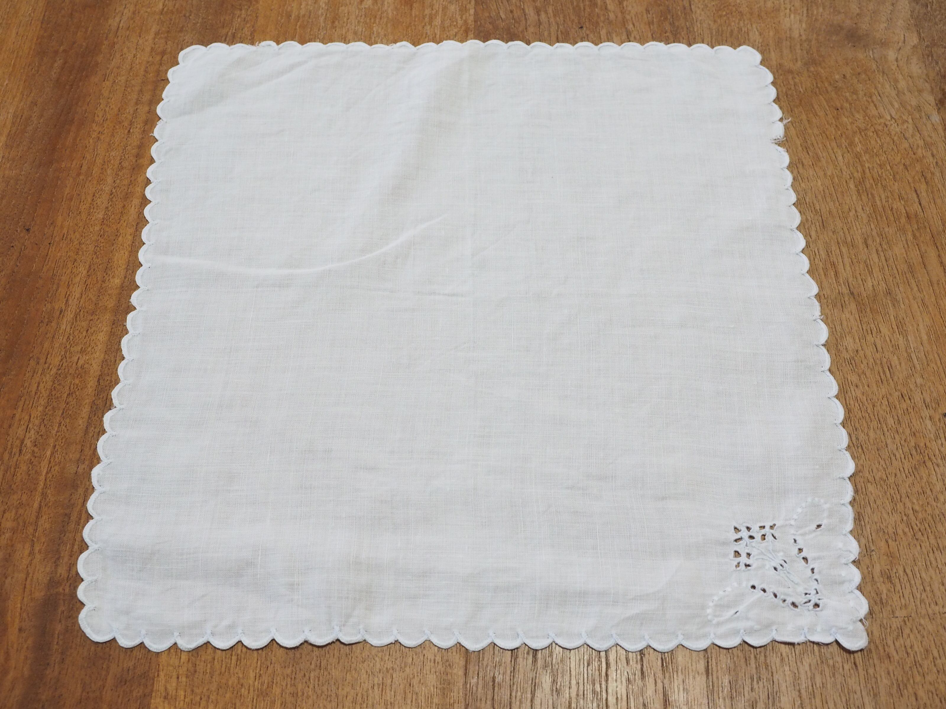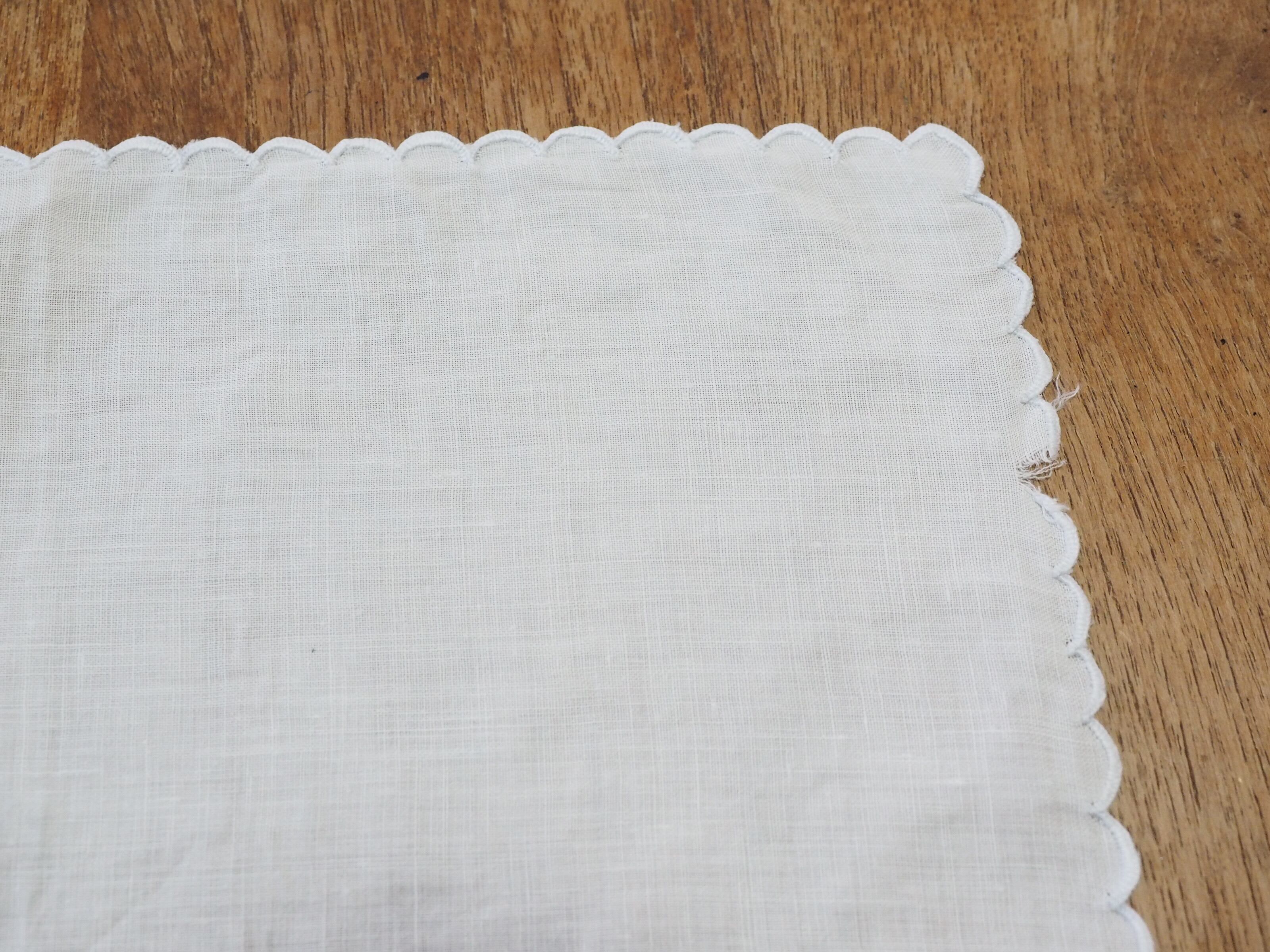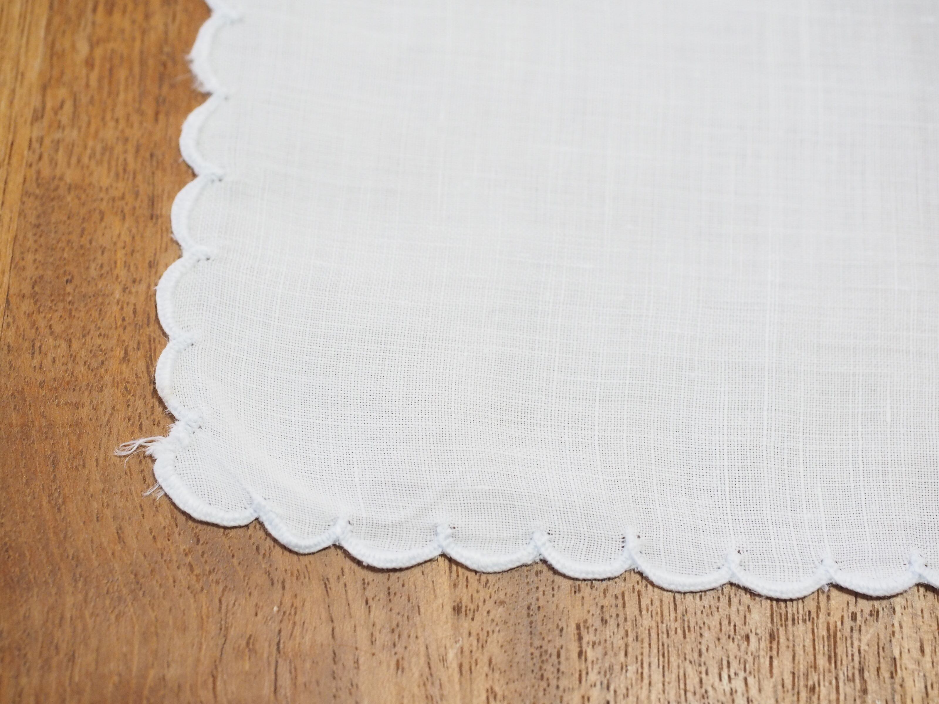 シンプルなコーナー刺繍のナプキンですが、ぐるっと縁に施されたスカラップもとても素敵です。