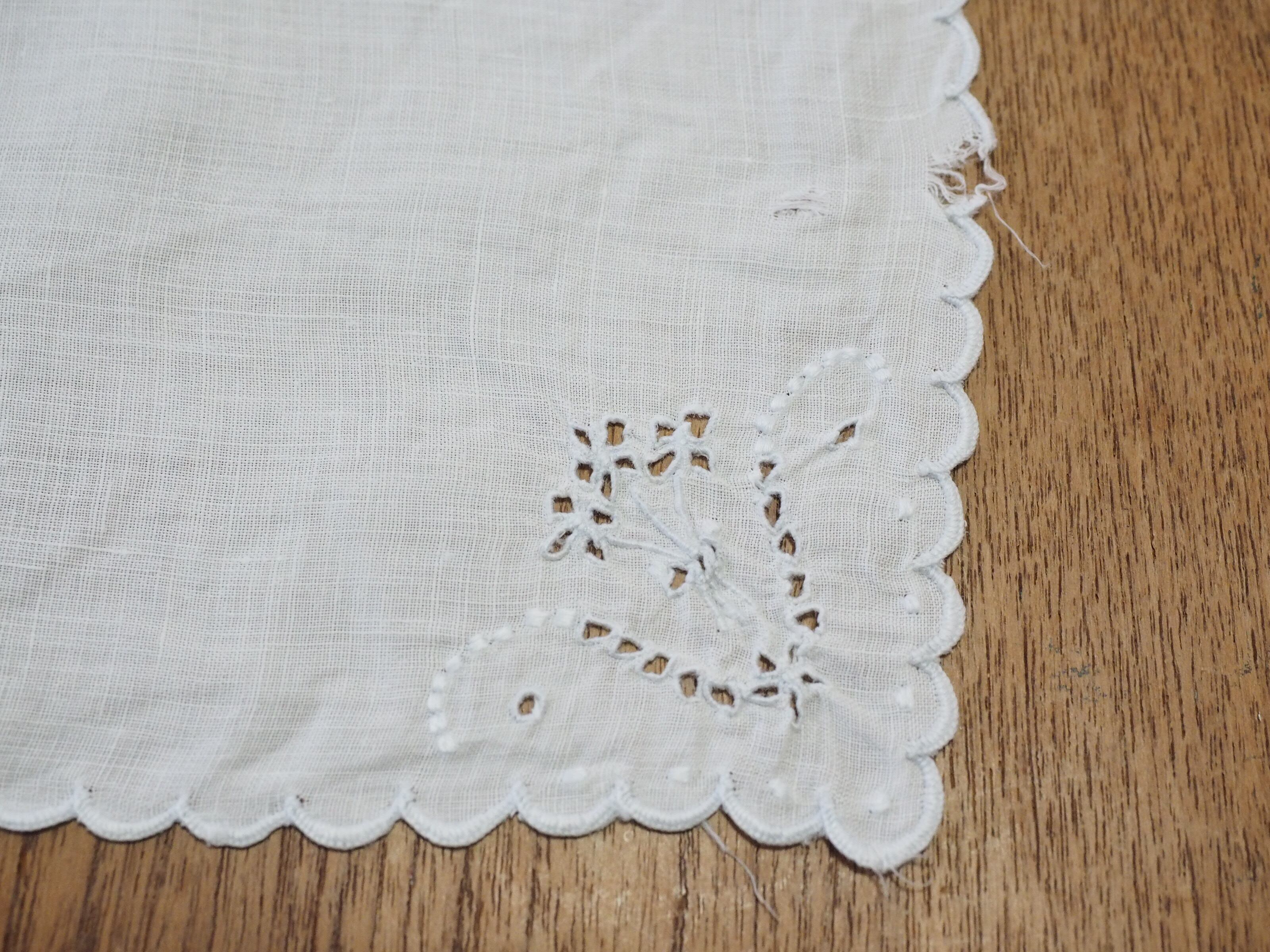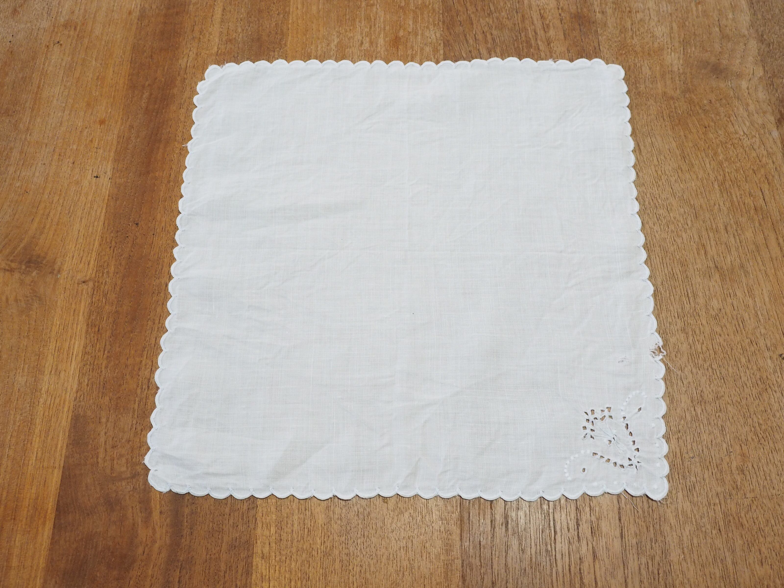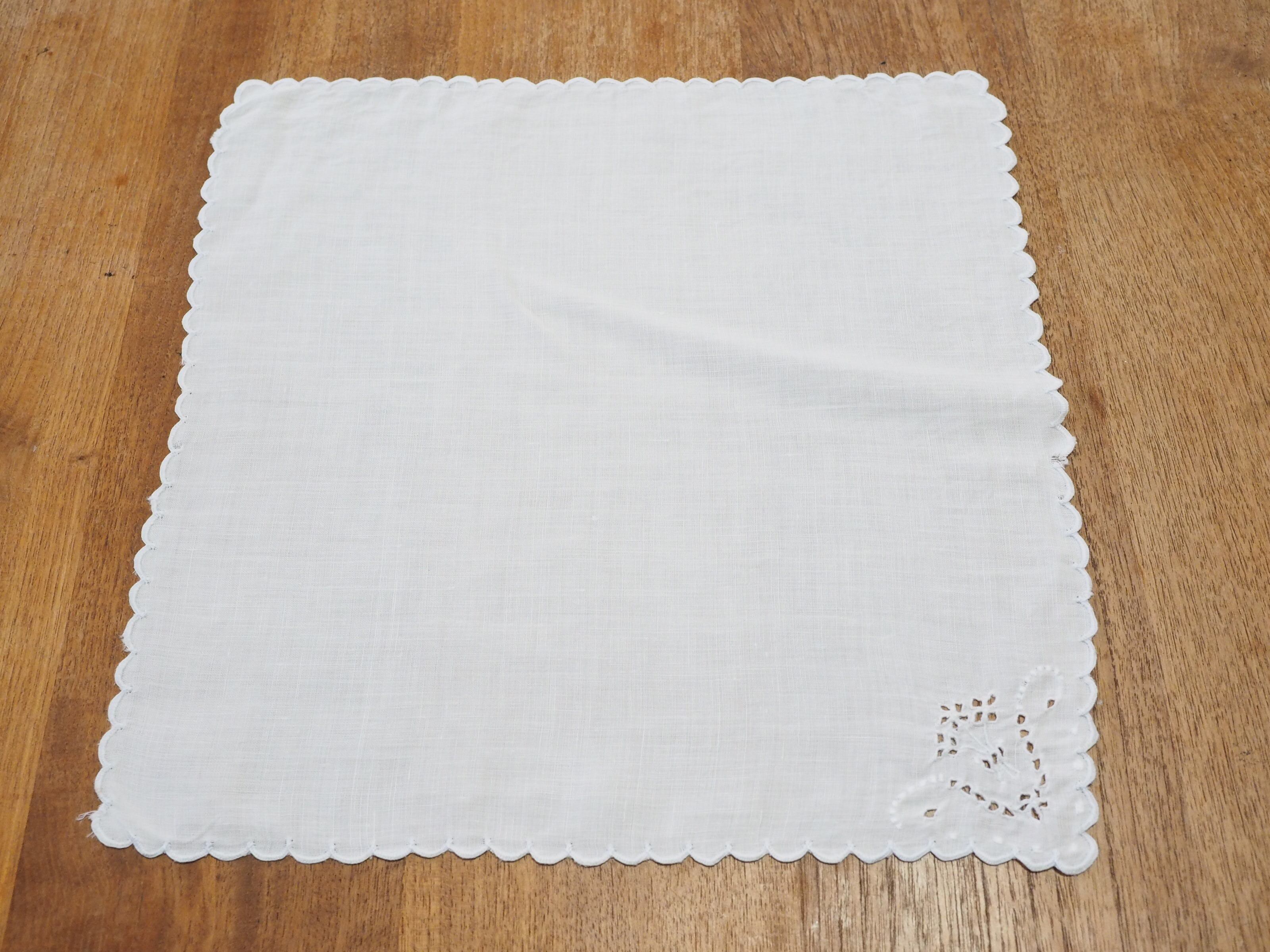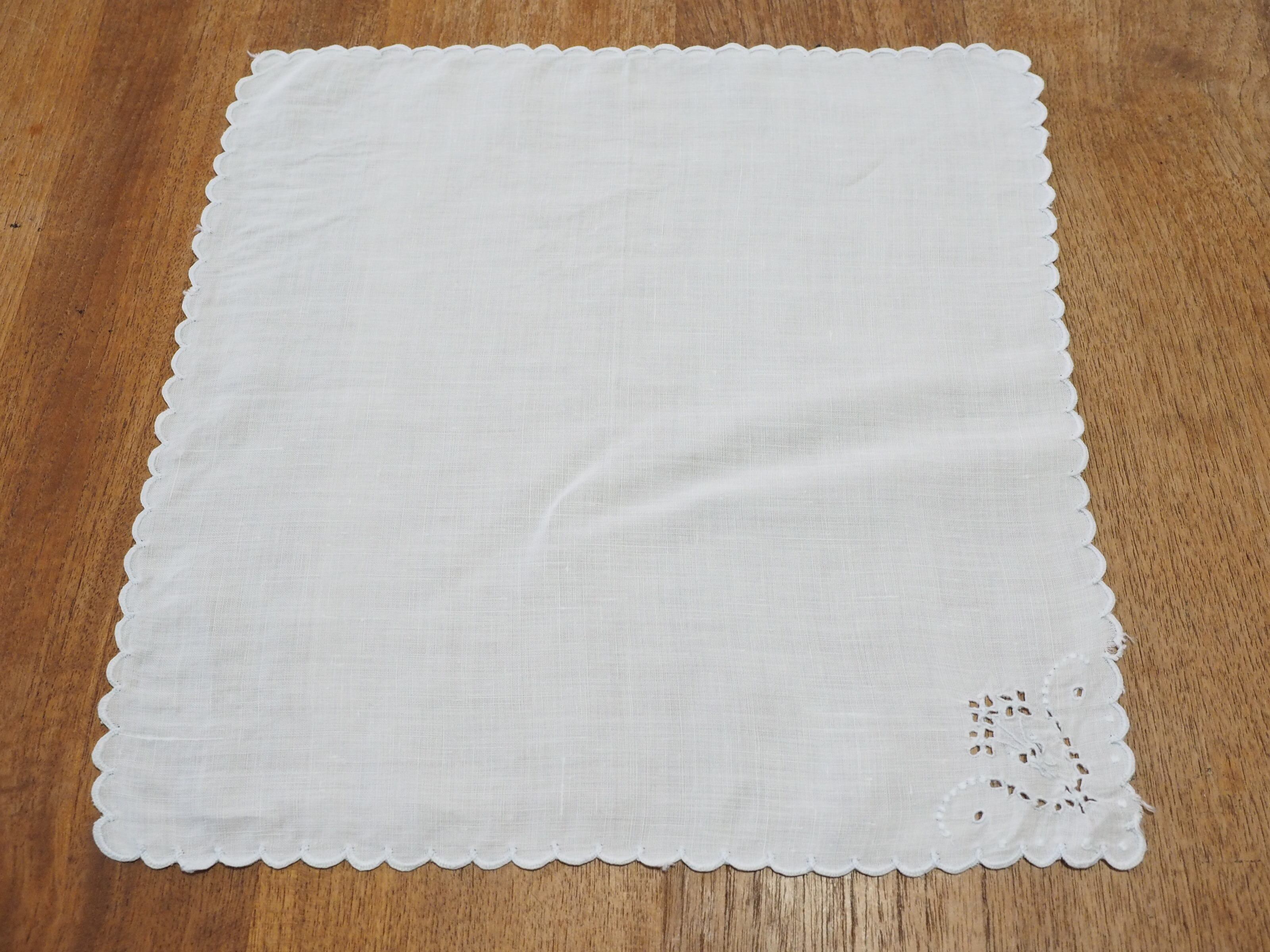 シンプルなコーナー刺繍のナプキンですが、ぐるっと縁に施されたスカラップもとても素敵です。