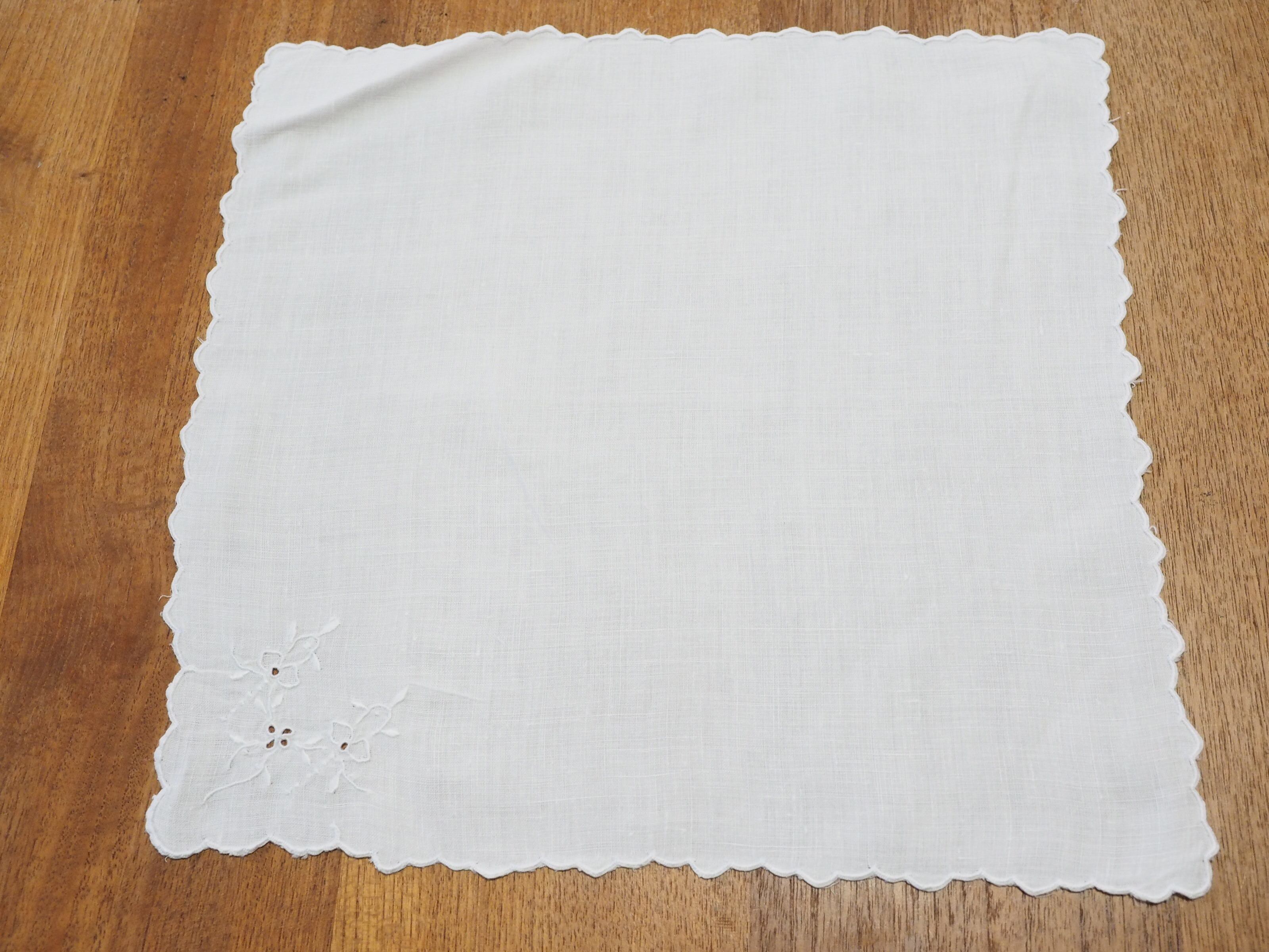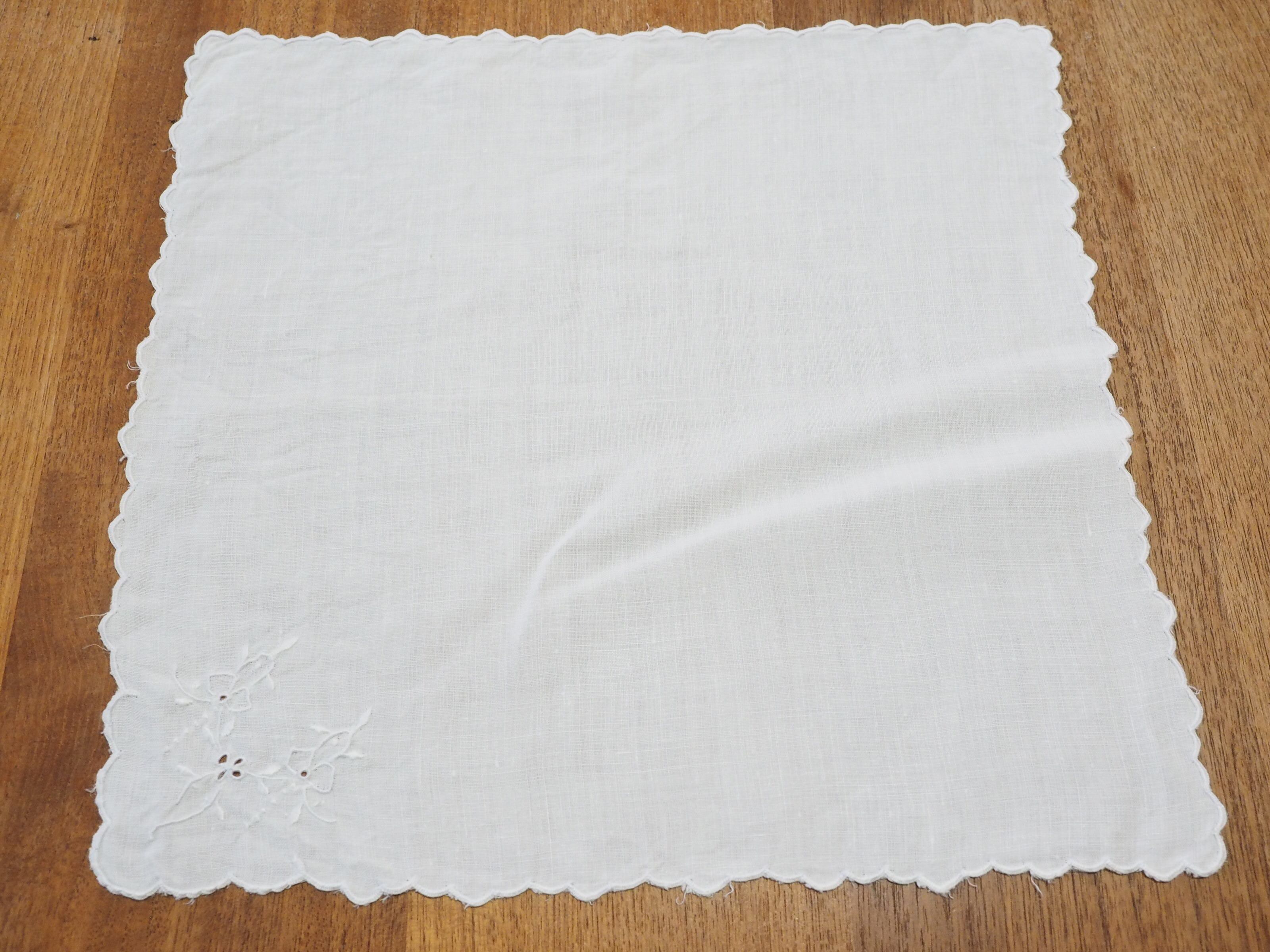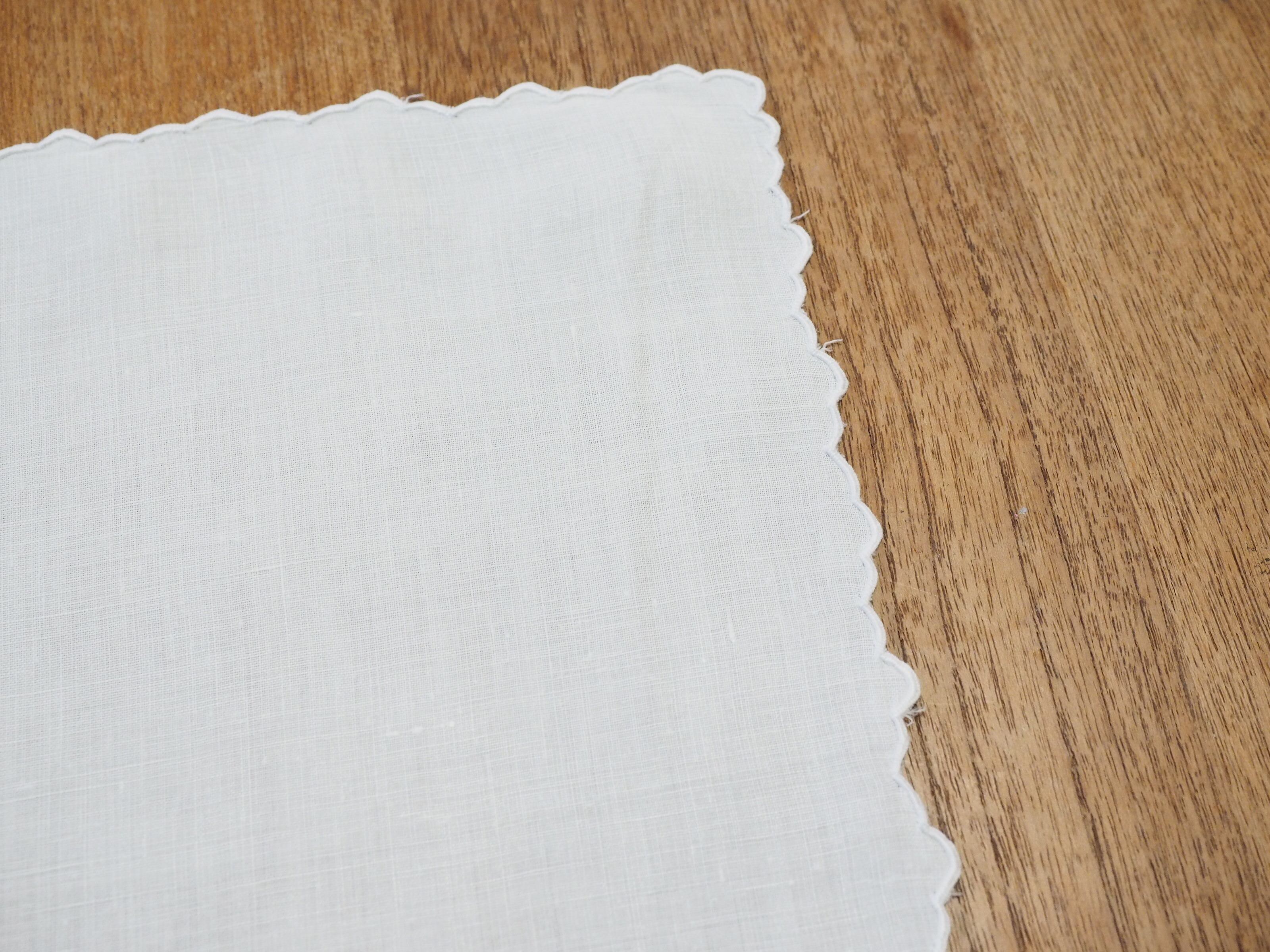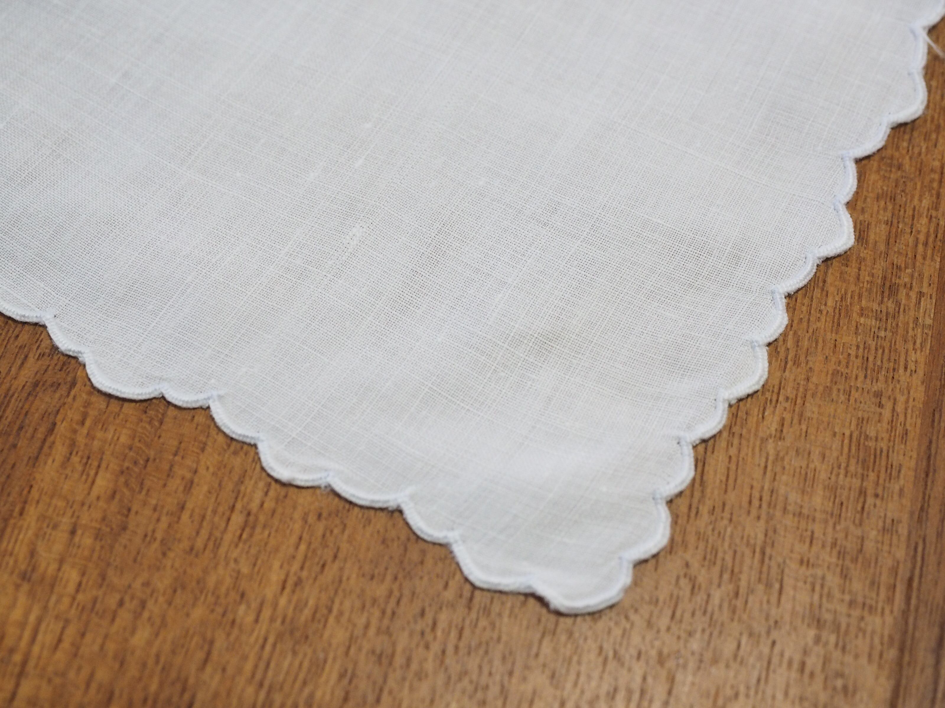 不規則な縁のスカラップがかわいらしく、刺繍のあるコーナー部分のみスカラップがとても細かくなっています。