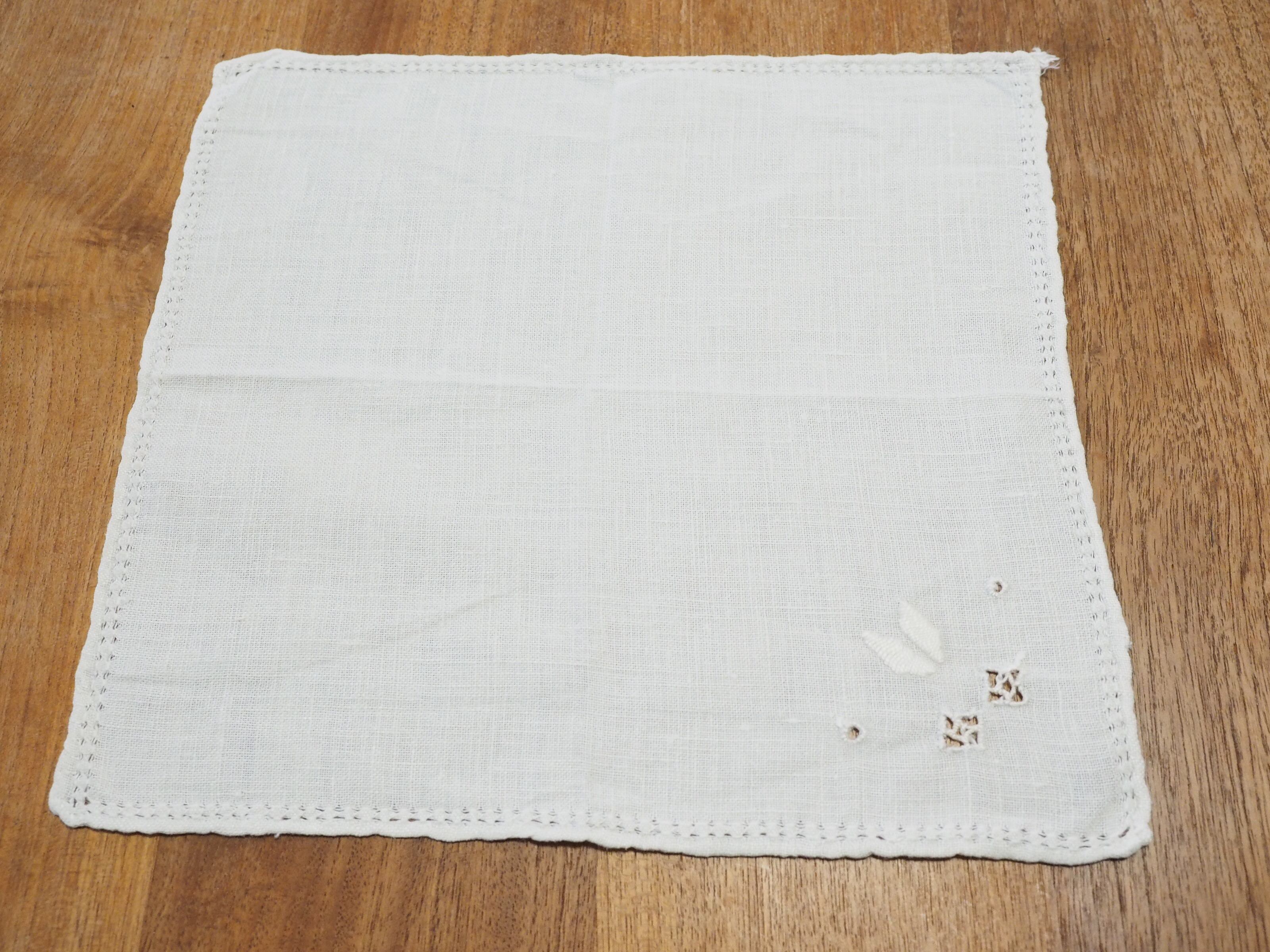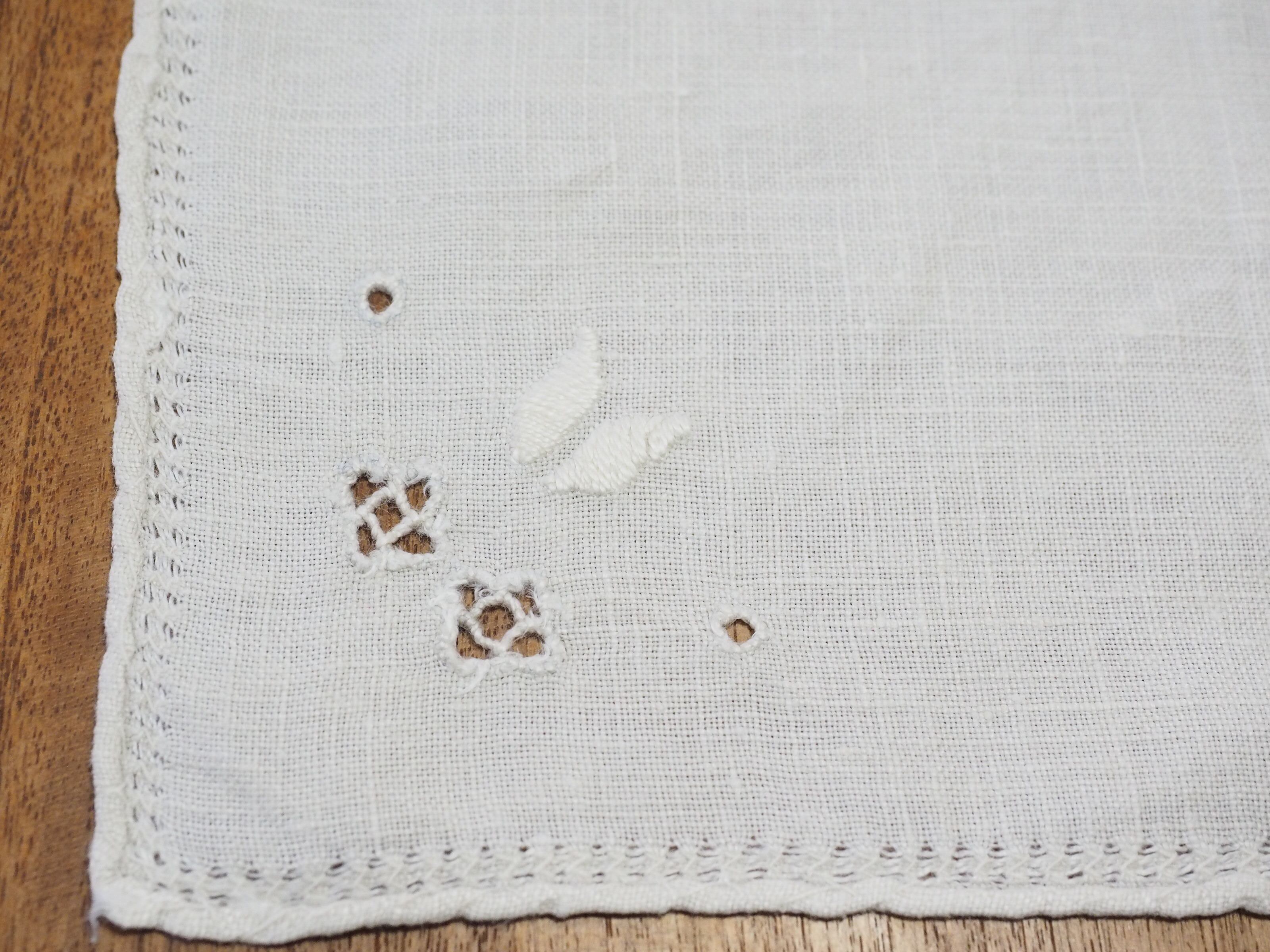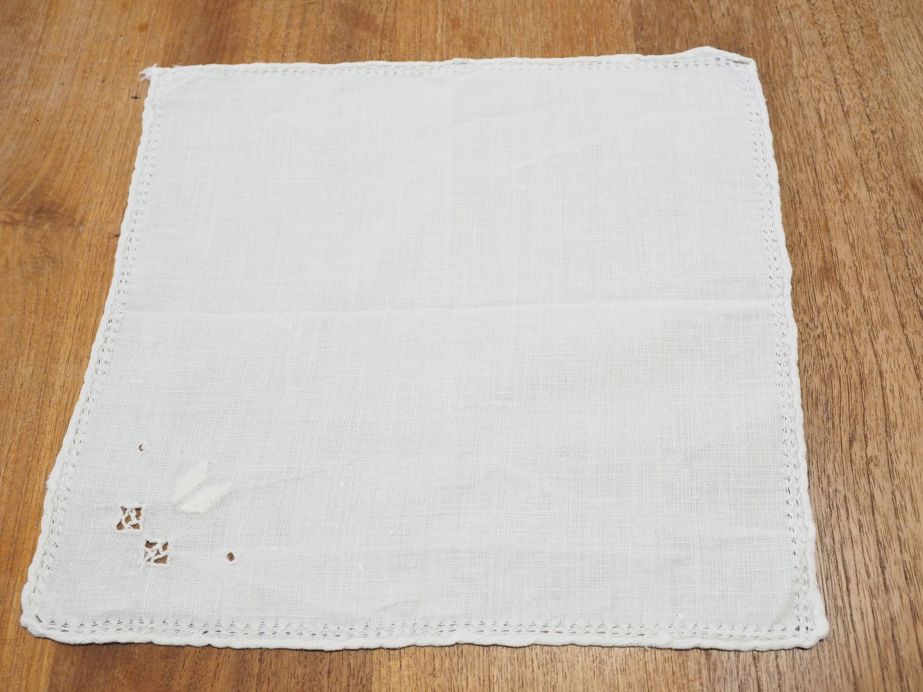 *まわりがガタガタしていたり、ほつれがあるもの、茶色がかったシミ、ドロンワークの糸切れがあり、ランダムでお送りいたします。